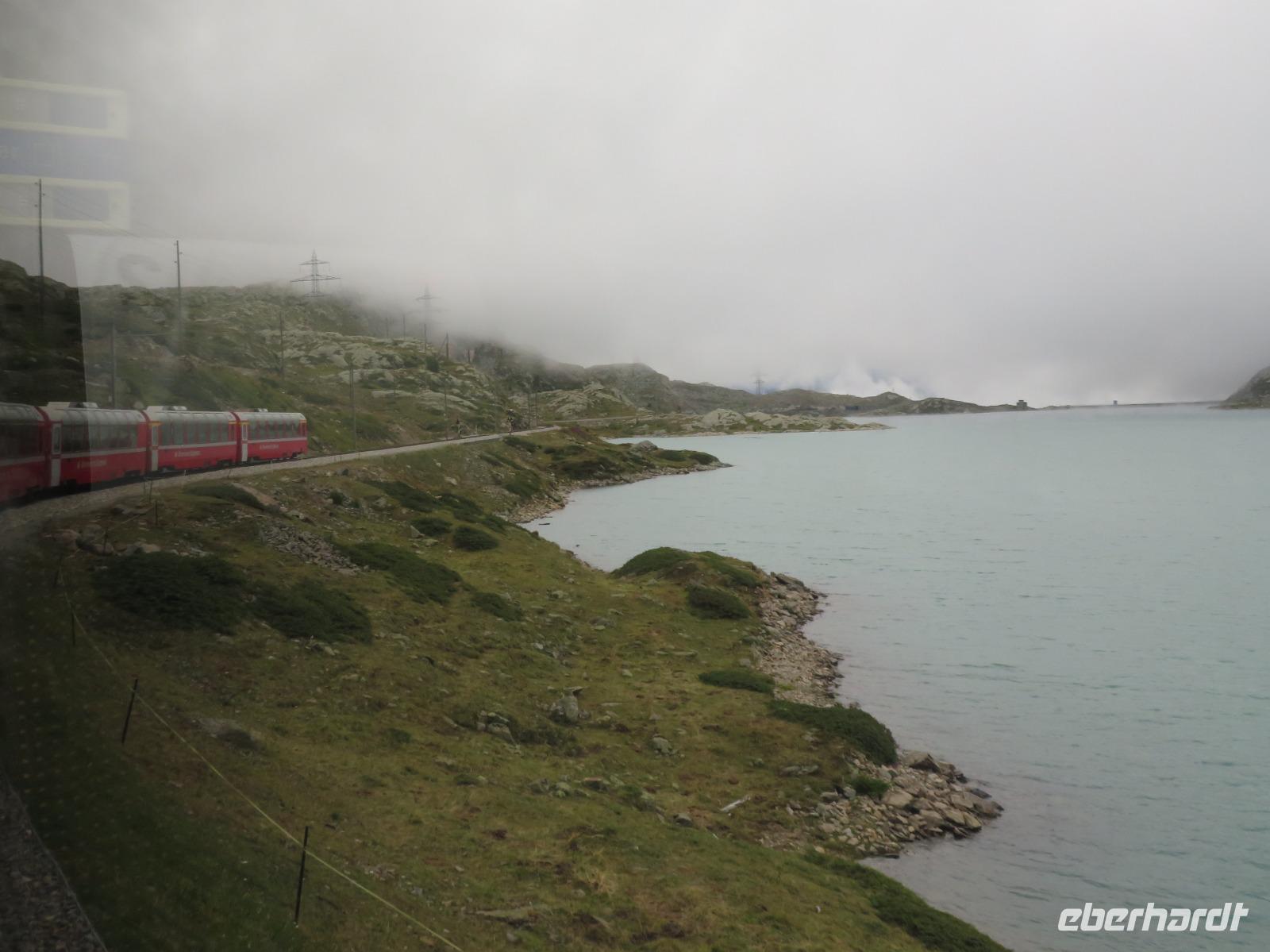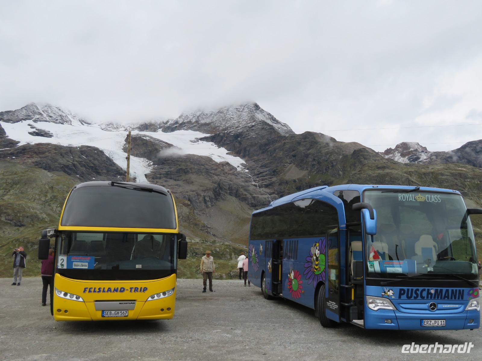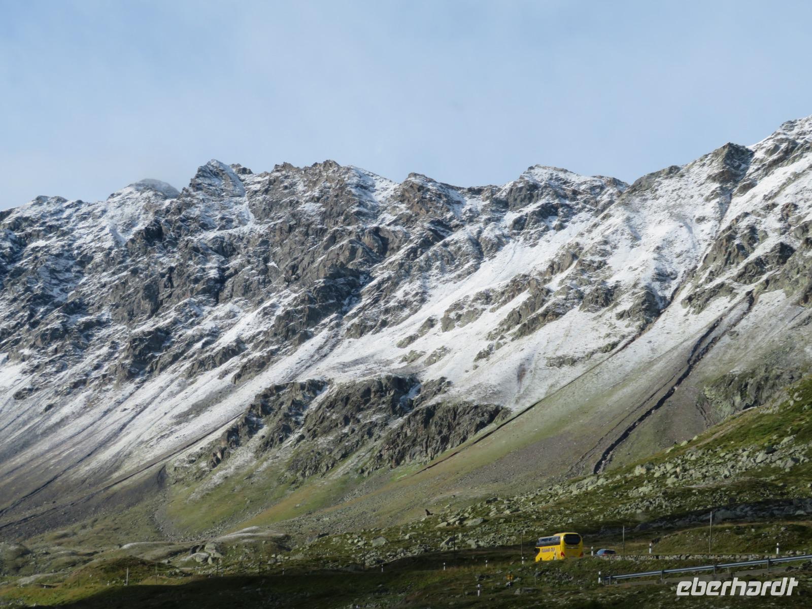Auch wenn Wetterbesserung versprochen wurde, an diesem Morgen geht erst einmal ein skeptischer Blick zum Fenster hinaus. Nun zeigt sich immer noch ein bedeckter Himmel, aber der Regen hat aufgehört, das lässt hoffen. Bald haben sich unsere beiden Gruppen eingefunden, die Chauffeure stehen mit den Bussen bereit, nun kann es losgehen. Wir durchfahren Davos und biegen bald auf die Straße ein die uns hinauf zum Flüela - Pass bringen wird. Wir gelangen über die Baumgrenze, etwas Schnee ist hier auch zu sehen, aber der Blick ist heute frei auf die Bergwelt Graubündens. Oben am Pass legen wir einen Fotostopp ein; kalte Luft empfängt uns, kein Wunder, wir befinden uns hier mehr als 2 000 Meter über dem Meer. Nachdem die Fotos geschossen geht es wieder bergab; bald begrüßt uns der Inn mit seinen stürmischen Fluten, seinem Lauf folgen wir aufwärts zunächst nach Pontresina.Über den Bernina - Pass gelangen wir hinunter ins Veltin; wir sind in Italien im beschaulichen Ort Tirano angekommen wo wir den Mittag verbringen werden. Die nötige Stärkung bekommen wir beim Italiener um die Ecke und gegen zwei haben sich die Gruppen wieder versammelt und gemeinsam gehen wir einem ersten Bahnerlebnis entgegen. Auf dem Gleis stehen die roten Wagen des Bernina - Express schon bereit, die Plätze sind reserviert und bald beginnt die romantische Fahrt. Zunächst aufwärts verlassen wir Italien wieder und sind fortan im Süden Graubündens unterwegs. Wir drehen uns einmal im Kreis am Viadukt von Brusio, fahren an den Ufern des pittoresken Poschiavo - Sees entlang um wenig später aufzusteigen zu den Höhen des Bernina - Passes. Kahl zeigt sich hier die Landschaft, die bei der Weiterfahrt aber schnell wieder vom gesunden Wald und seinem kräftigem Grün abgelöst wird.Links kommt bald die mächtige Zunge des Morteratsch - Gletschers in unser Blickfeld, ein weiteres schönes Motiv für die Kameras. Leider geht aber nun die Bahnfahrt ihrem Ende entgegen; in Pontresina erwarten uns schon die Busse und mit ihnen gelangen wir nach Davos zurück, einem leckeren Abendessen entgegen.
