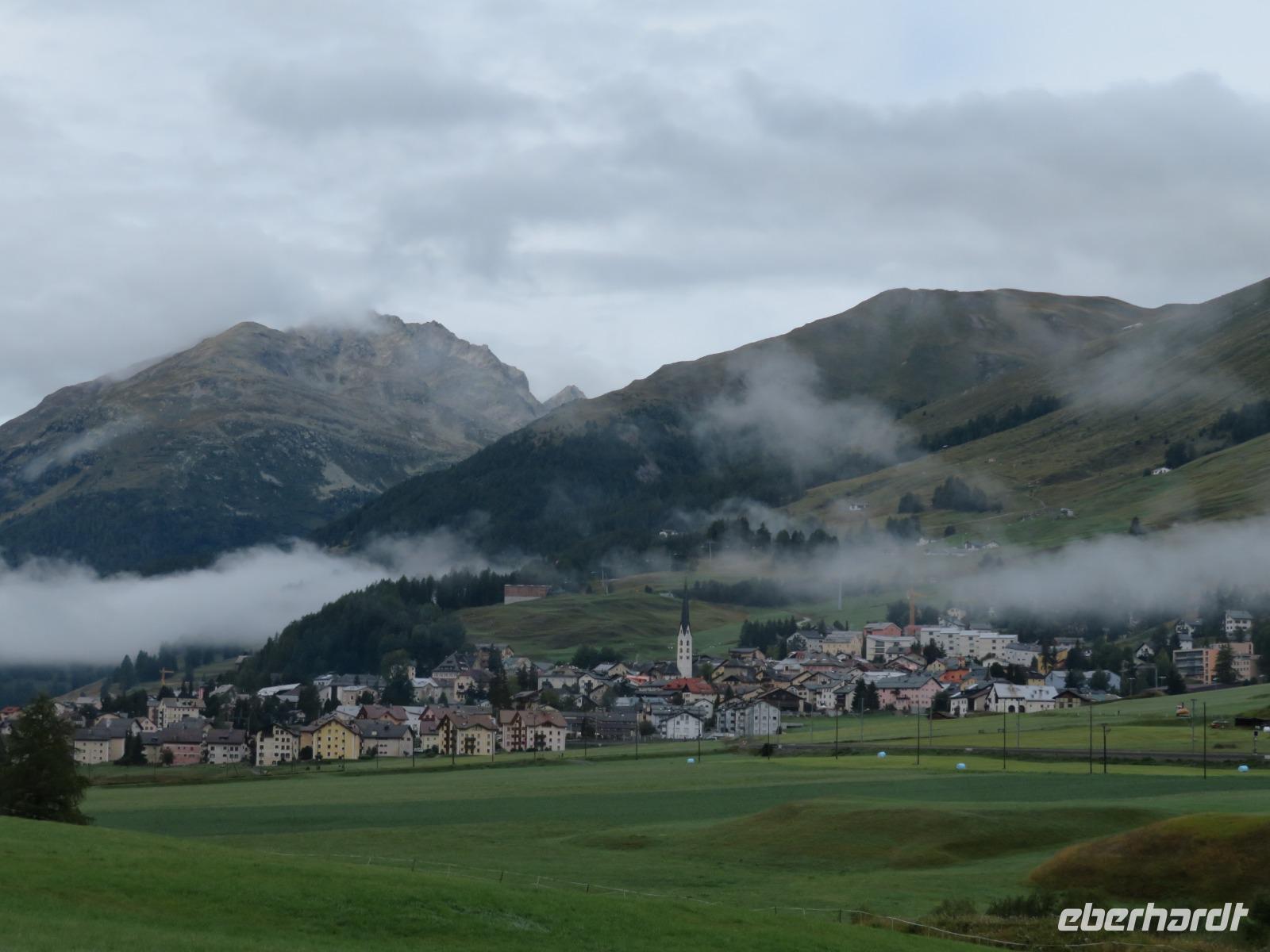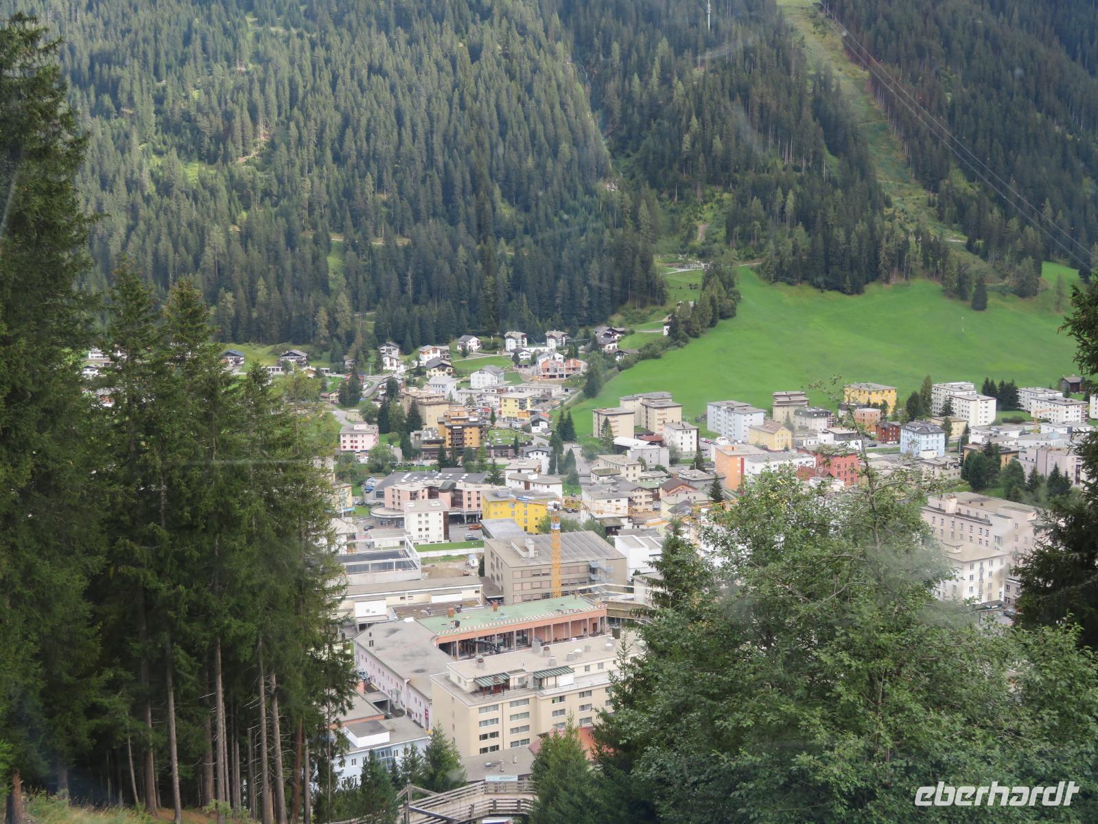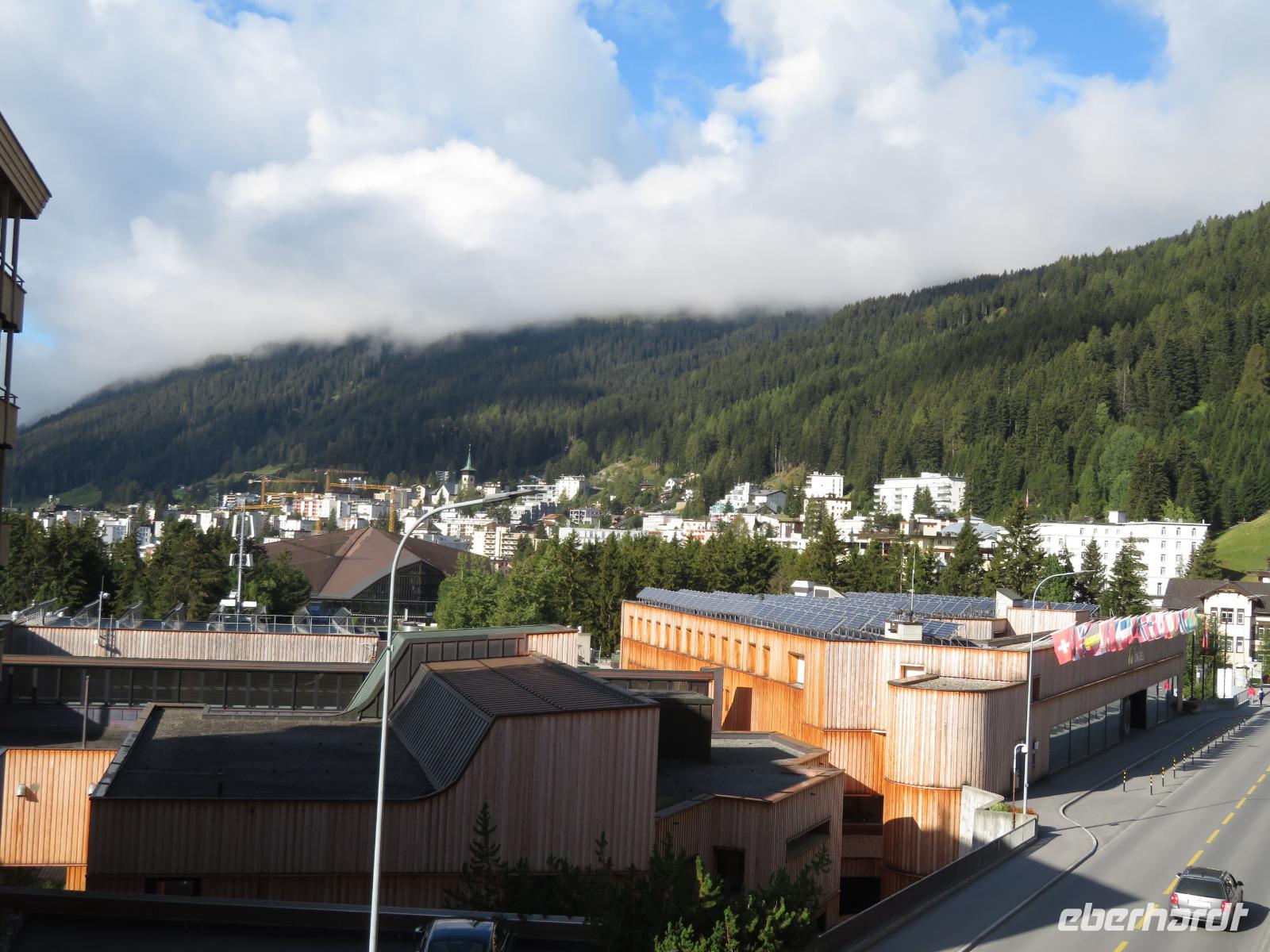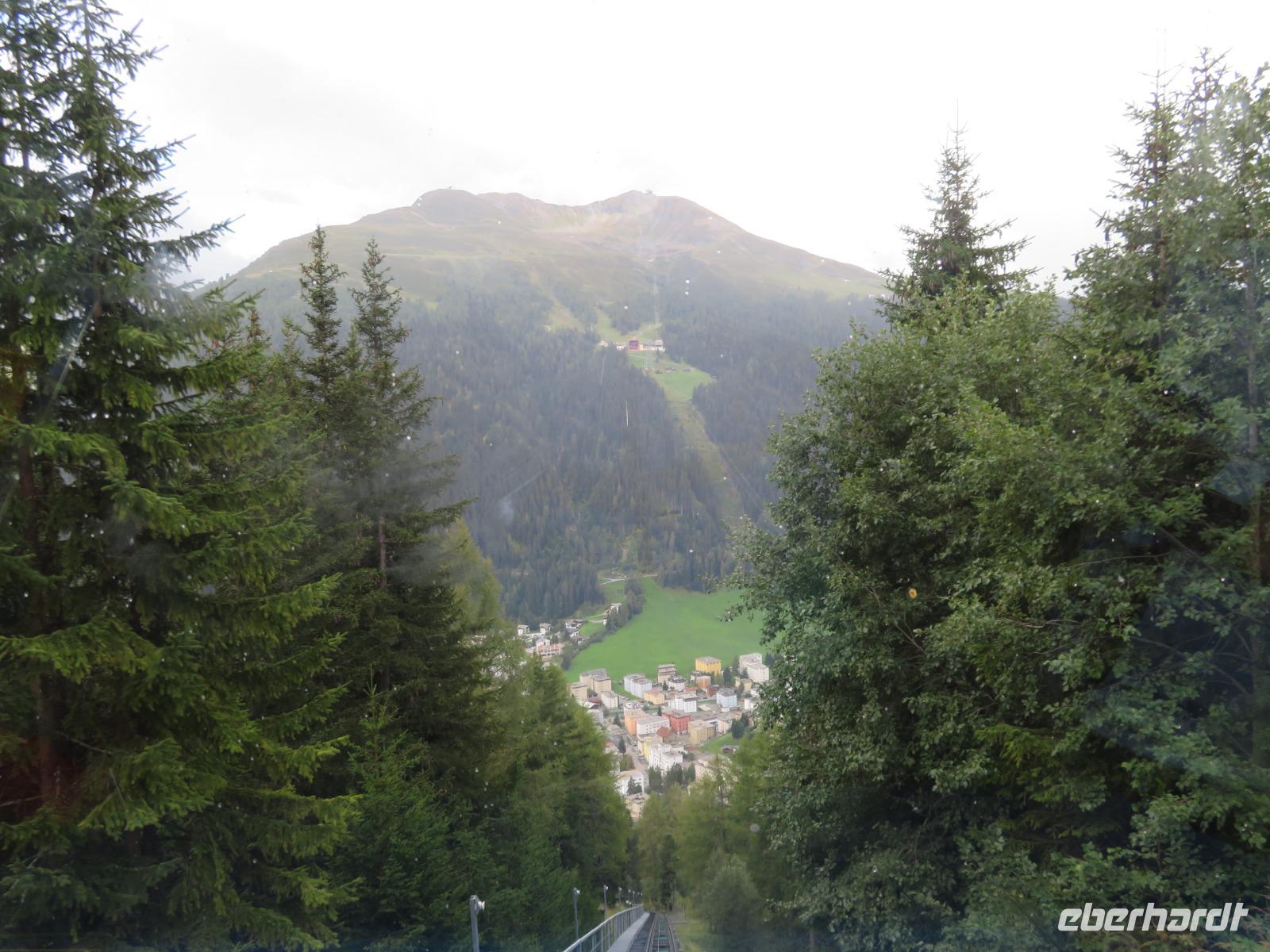 Als ich erwache und aus dem Fenster blicke - Regen. Nein, der Wetterbericht hat diesmal nicht gelogen, dicke Wolken haben sich vor die Berge, welche Davos umgeben, gehangen und in Sturzbächen kommt das Nass von oben, wie angekündigt. Doch zunächst lassen wir es uns beim Frühstück gut schmecken, dann wollen wir weiter sehen.Doch es regnet unentwegt; zahlreiche Finger wischen über die Displays der Smartphone und alle Wetter - Apps zeigen in ihren Piktogrammen eine dicke graue Wolke und fünf Regenstriche. Nun haben wir vom Hotel glücklicherweise die Davos - Card bekommen, mit dieser können wir hier und der Umgebung alle Verkehrsmittel kostenlos nutzen, davon machen wir an diesem Tag auch ausgiebig Gebrauch. Auf geht es mit dem Linienbus einmal durch den Ort, Blitz und Donner begleitet die Fahrt und die Vorortbahn bringt uns auch ein Stück durchs Gebiet und so erkunden wir, im Trockenen sitzend, dennoch diese schöne Ecke und drehen dem Wettergott damit eine Nase. Gegen drei hat er nun doch eingesehen uns mit seiner schlechten Laune nicht beeindrucken zu können und er lässt zur Abwechslung die Sonne etwas scheinen. Schon sieht der Ort ganz anders aus. Jetzt liegen die Wolken wie zarte Gespinste an den Bergen, die grünen Wiesen glitzern in der Nachmittagssonne und fast bis nach oben zieht sich der Wald hin, oben über der Baumgrenze ist alles kahl. Nun lohnt auch ein Spaziergang im Ort, die Sonne wärmt sogar etwas und solcherart versöhnt vergehen die Nachmittgasstunden im schönen Davos.