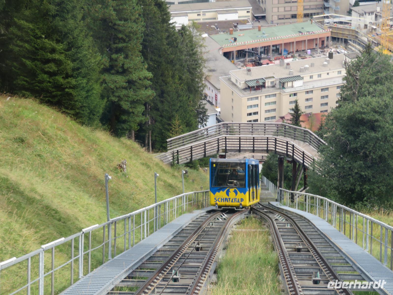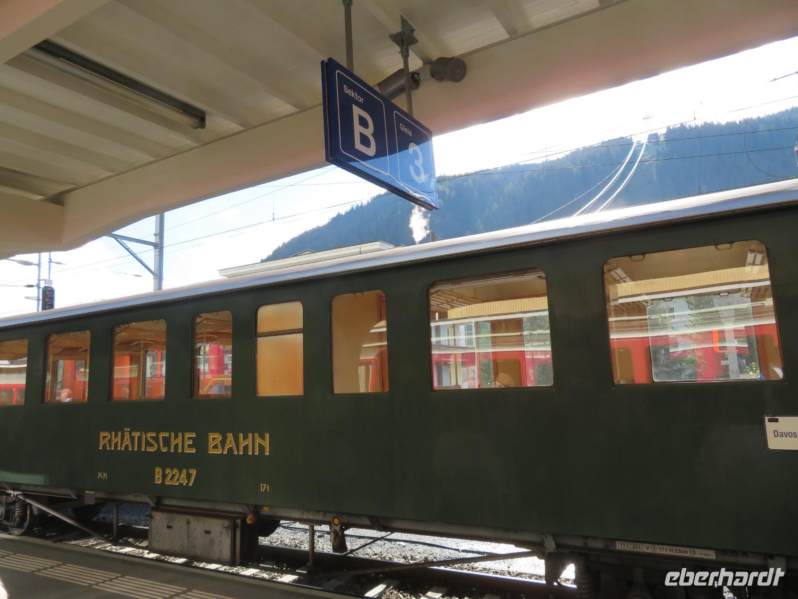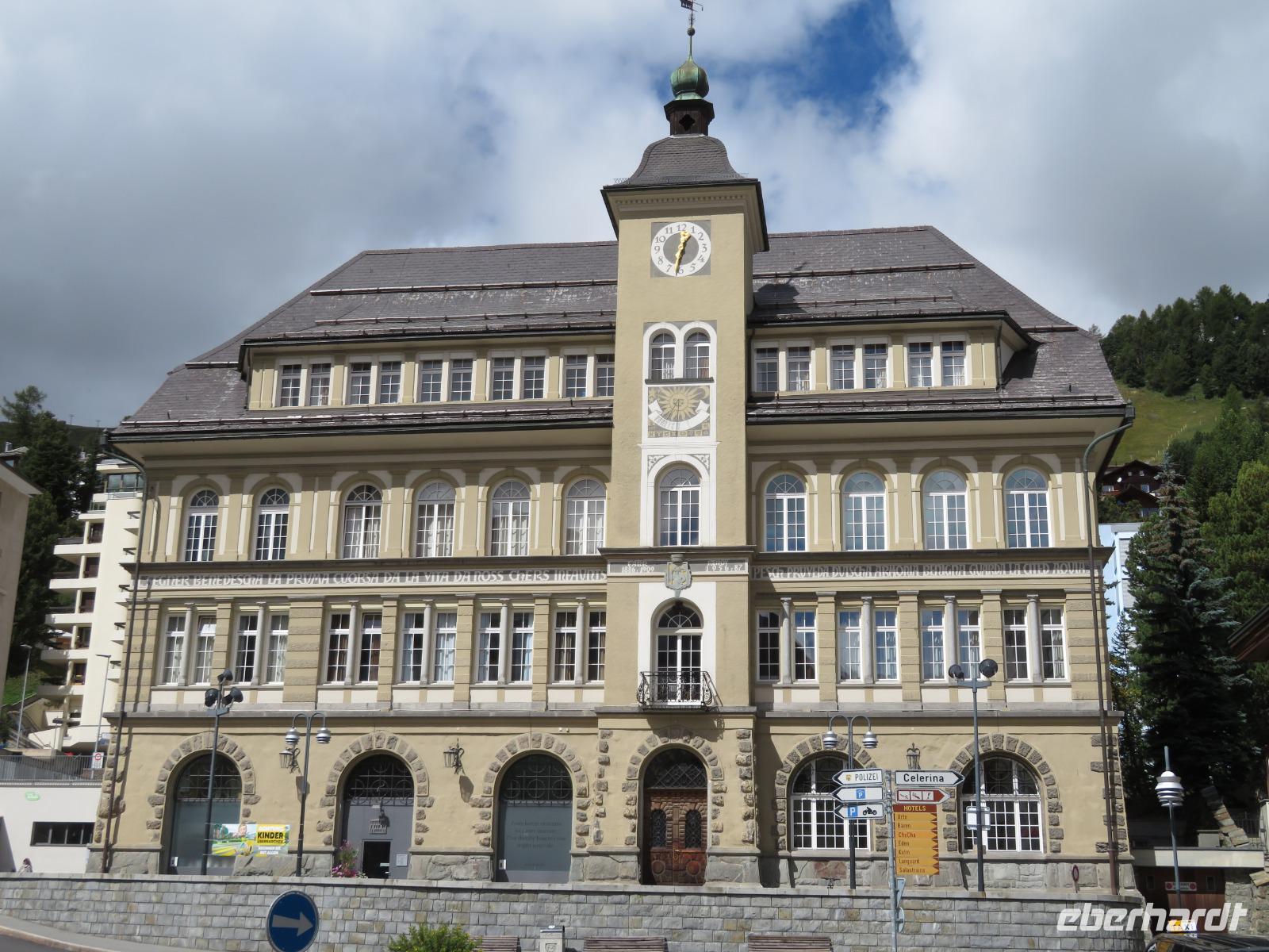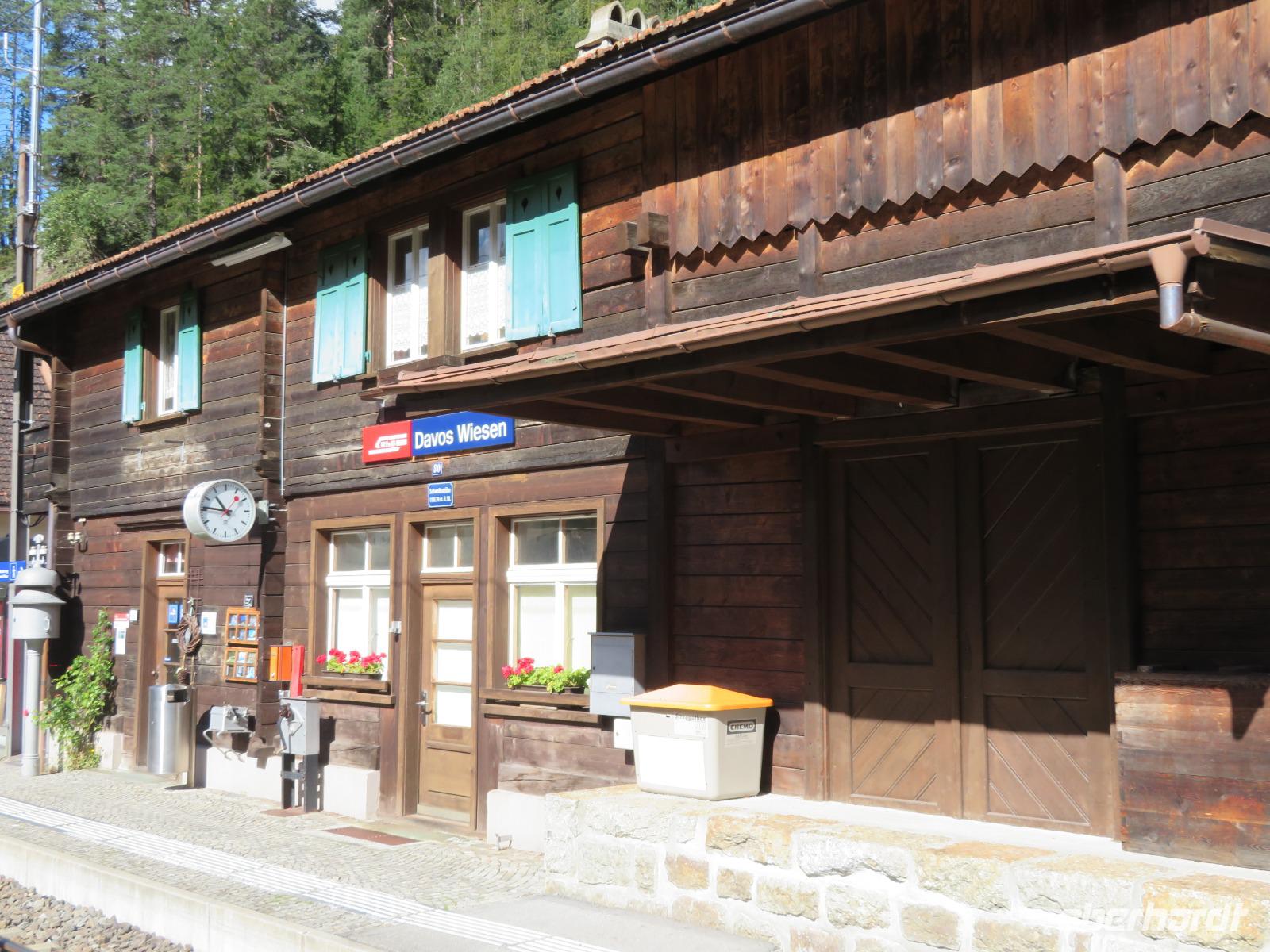 Als ich erwache und aus dem Fenster blicke - Regen. Nein, der Wetterbericht hat diesmal nicht gelogen, dicke Wolken haben sich vor die Berge, welche Davos umgeben, gehangen und in Sturzbächen kommt das Nass von oben, wie angekündigt. Doch zunächst lassen wir es uns beim Frühstück gut schmecken, dann wollen wir weiter sehen.Doch es regnet unentwegt; zahlreiche Finger wischen über die Displays der Smartphone und alle Wetter - Apps zeigen in ihren Piktogrammen eine dicke graue Wolke und fünf Regenstriche. Nun haben wir vom Hotel glücklicherweise die Davos - Card bekommen, mit dieser können wir hier und der Umgebung alle Verkehrsmittel kostenlos nutzen, davon machen wir an diesem Tag auch ausgiebig Gebrauch. Auf geht es mit dem Linienbus einmal durch den Ort, Blitz und Donner begleitet die Fahrt und die Vorortbahn bringt uns auch ein Stück durchs Gebiet und so erkunden wir, im Trockenen sitzend, dennoch diese schöne Ecke und drehen dem Wettergott damit eine Nase. Gegen drei hat er nun doch eingesehen uns mit seiner schlechten Laune nicht beeindrucken zu können und er lässt zur Abwechslung die Sonne etwas scheinen. Schon sieht der Ort ganz anders aus. Jetzt liegen die Wolken wie zarte Gespinste an den Bergen, die grünen Wiesen glitzern in der Nachmittagssonne und fast bis nach oben zieht sich der Wald hin, oben über der Baumgrenze ist alles kahl. Nun lohnt auch ein Spaziergang im Ort, die Sonne wärmt sogar etwas und solcherart versöhnt vergehen die Nachmittgasstunden im schönen Davos.
