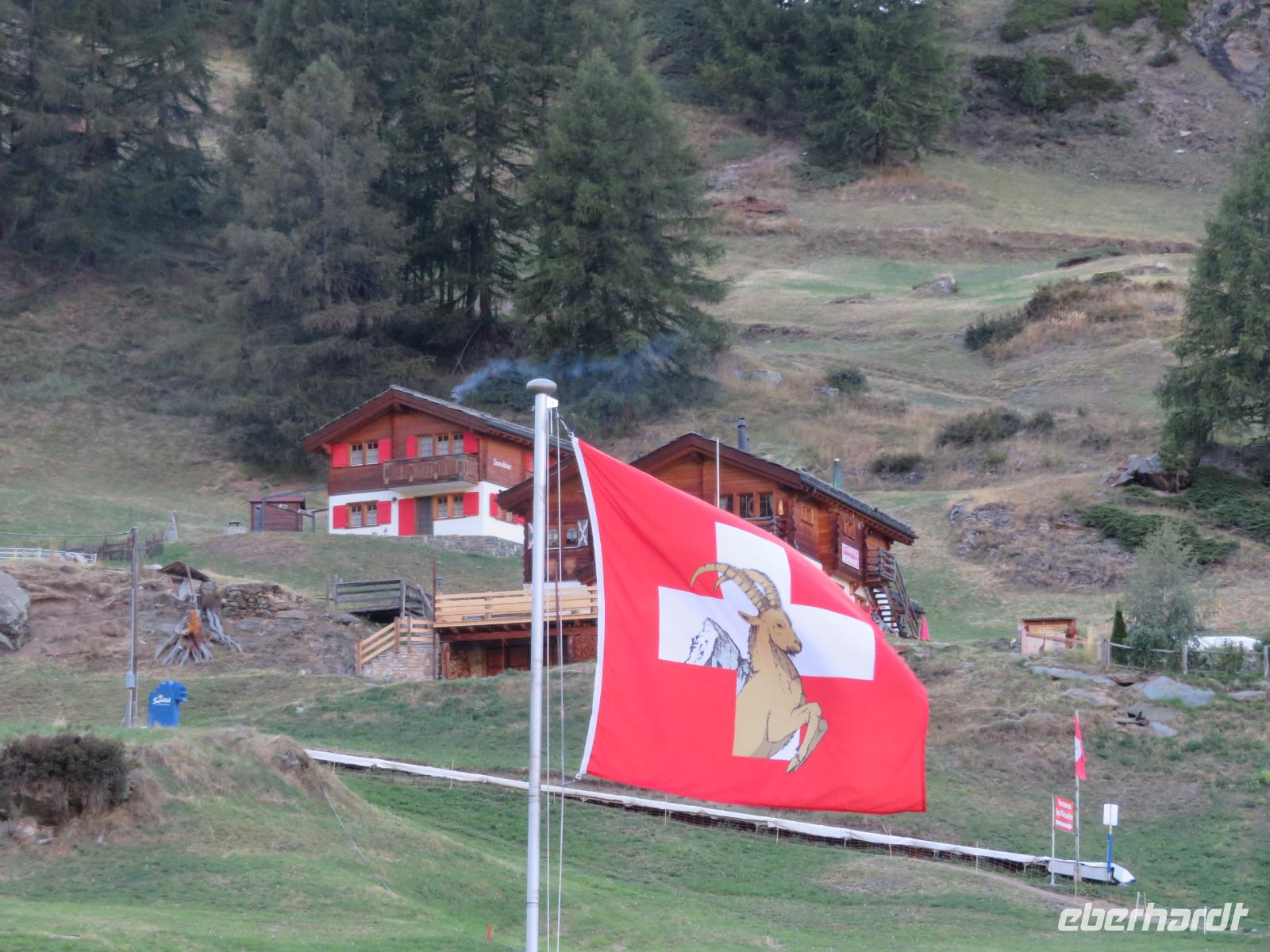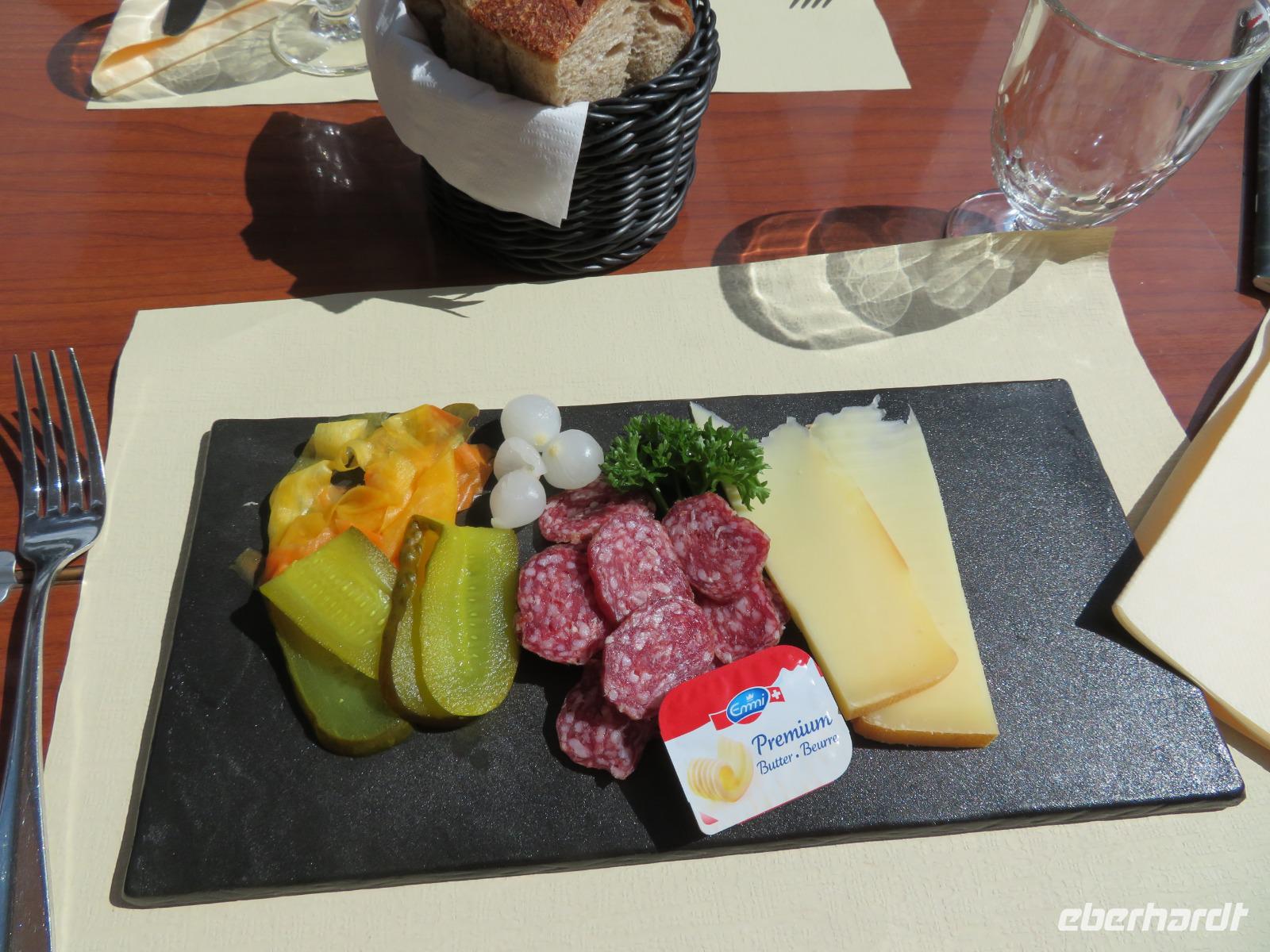 Unsere Reisegruppe hat sich versammelt um eine der Spezialitäten zu kosten für welche die Schweiz so bekannt ist - Käse. Käse findet in der Schweizer Küche verschieden Verwendung, an diesem Abend wollen wir kennenlernen wie ein Raclette schmeckt. Ein kleiner Fußmarsch bringt uns zur Seilbahn, mit einer Gondel gelangen wir noch einmal hinauf nach Furi. Hier oben ist es schon ganz still; die Dämmerung hat Einzug gehalten als wir auf der Terrasse des Berggasthofes Platz nehmen. Bei einem Glas Wein zur Begrüßung lauschen wir den Klängen eines Alphorns. Um uns die Berge, unten im Tal Zermatt - das ist Romantik pur! Dann laden uns die Wirtsleute in die Gaststube ein; der Geruch von würzigem Käse hat sich schon im Raum verteilt, das Essen beginnt. Zunächst eine kleine Vorspeise, ein Teller mit leckeren Trockenfleisch, einer Art Schinken, dann kommen die Teller mit dem Raclette auf den Tisch. Nun duftet es noch mehr; der geschmolzene Käse wird mit Kartoffeln und sauren Zwiebeln serviert - einfach lecker. Den Abschluss bildet ein Eisbecher, das hat dann doch allen gut gemundet. Es ist schon dunkel als wir nach Zermatt hinunterfahren; die Lichter der Häuser strahlen uns aus dem Tal entgegen und von oben blinken die Sterne. So geht dieser eindrucksvolle Tag ganz romantisch zu Ende.