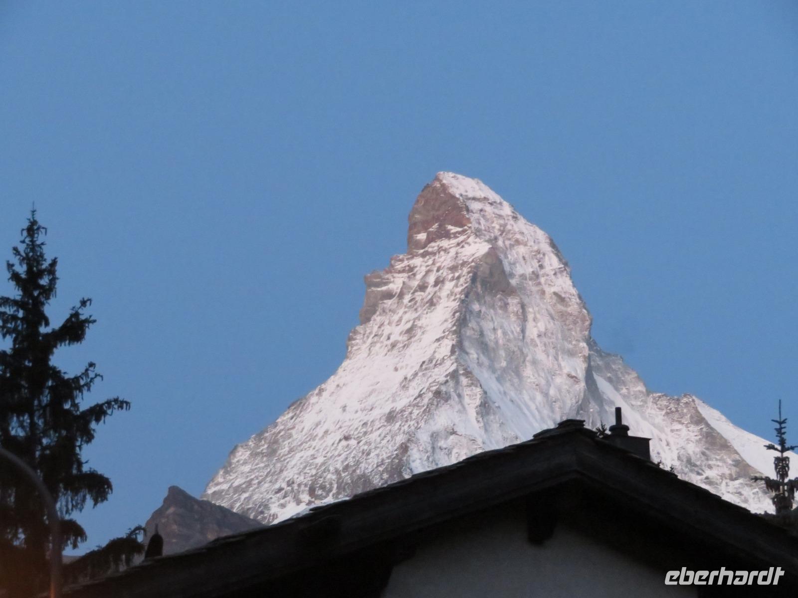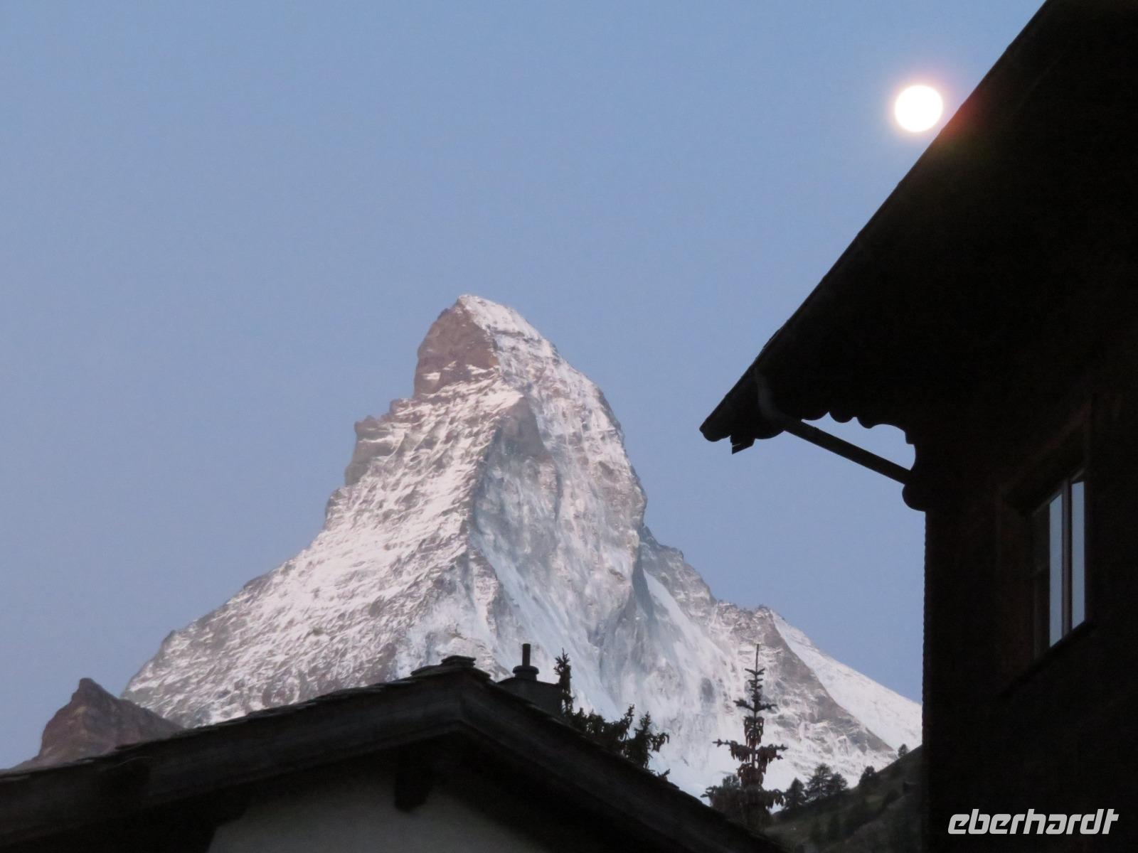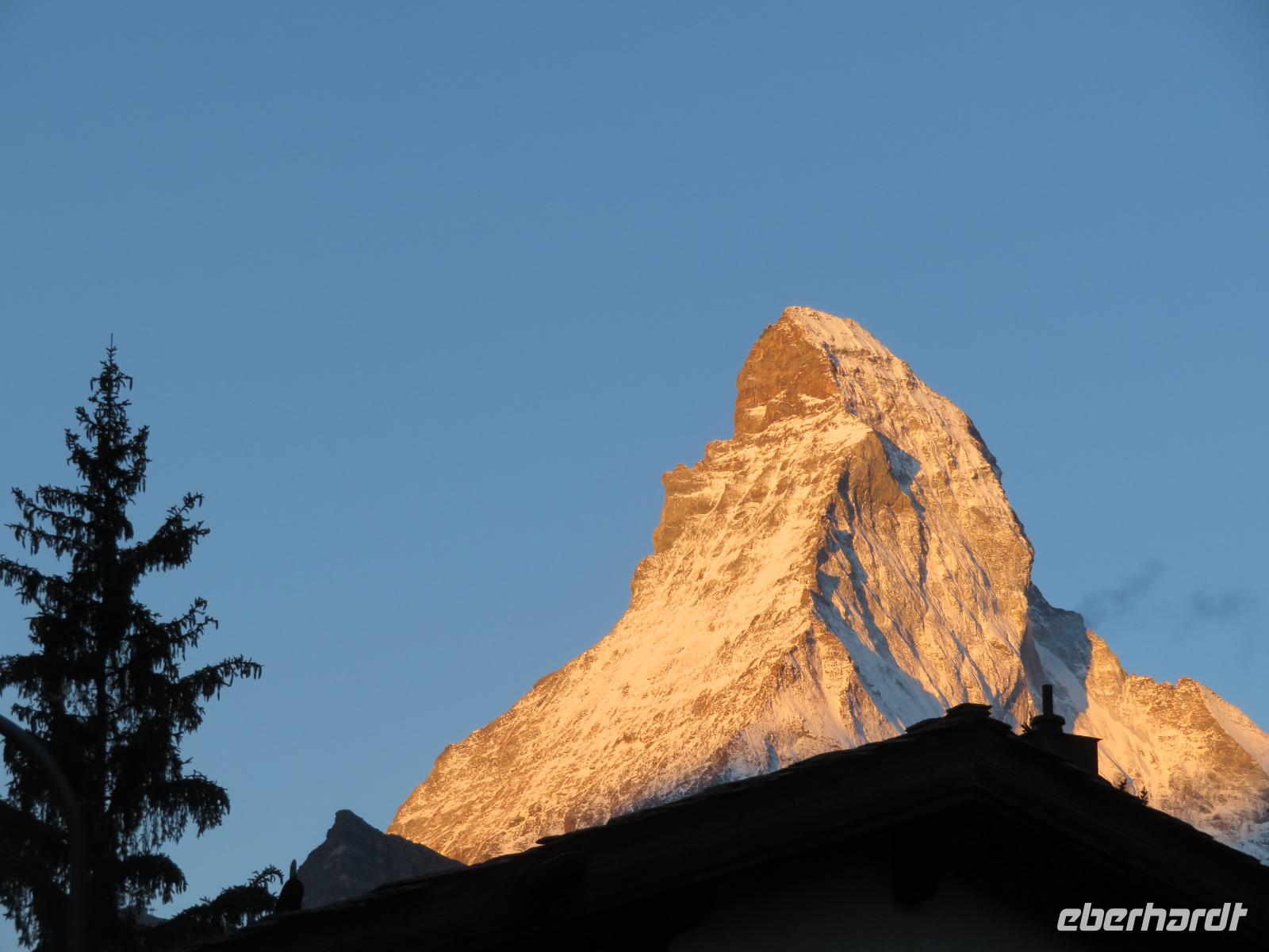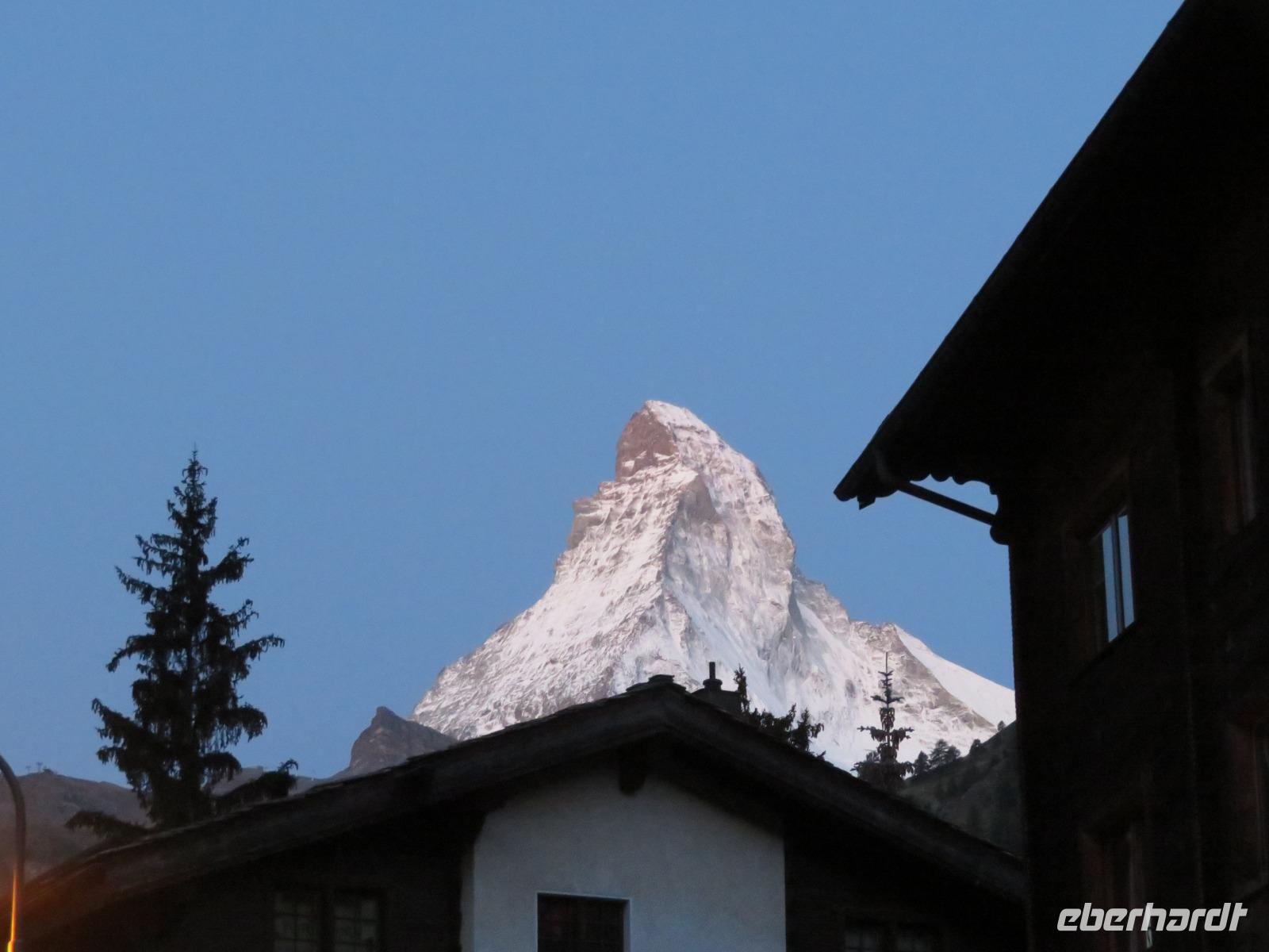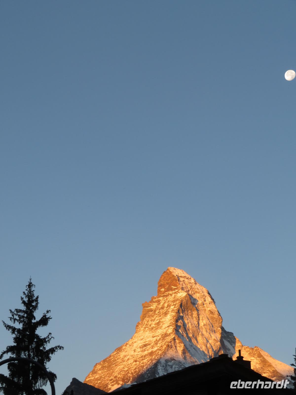 Im Tal ist es noch dunkel. Die typischen Elektrofahrzeuge Zermatts surren durch den kühlen Morgen; auf den Ladeflächen sitzen Bauarbeiter die ihrem Tagewerk entgegen fahren und noch etwas verschlafen in den Fahrtwind blinzeln. Ein Mann sammelt den Müll vom Straßenrand ein der achtlos weggeworfen wurde und sorgt dafür, dass die Besucher, wenn sie auf den Straßen und Plätzen erscheinen, ein sauberes Gebirgsdorf vorfinden. Fleißige Hände aus aller Herren Länder arbeiten, meist im Stillen, für unser Wohlbefinden, wir müssen darüber sehr dankbar sein!Den Touristen allerdings zieht es in dieser Frühe hinaus an die frische Luft um sich ein geniales Schauspiel nicht entgehen zu lassen: den Sonnenaufgang. Noch zeigt sich das Matterhorn in silbrigem Weiß, daneben steht der Mond im blauen Dämmerschein, doch wie von Geisterhand beginnt plötzlich die oberste Spitze des Berges kupferfarben zu schimmern. Wie ein leuchtender Brand setzt sich dieses eigentümliche Strahlen nach unten fort: Bald erglüht dieser Berg der Berge komplett im magischen Glanz und verrät uns damit den Sonnenaufgang, während es im Tal noch dunkel bleibt. Bald verliert sich die Kupferfarbe und macht einem strahlenden Weiß Platz, die Sonne hat nun das ganze Matterhorn in ihre Strahlkraft genommen. Der Tourist erfuhr vom Wetterbericht, dass der Anblick den ganzen Tag andauern wird, geht leicht fröstelnd zum Hotel zurück um sich am reichhaltigen Frühstücksbuffet die erste Stärkung des Tages zu holen. Leckerer Kaffeeduft und der Geruch von frischen Brötchen weckt seinen Appetit, dieser Tag beginnt richtig gut!
