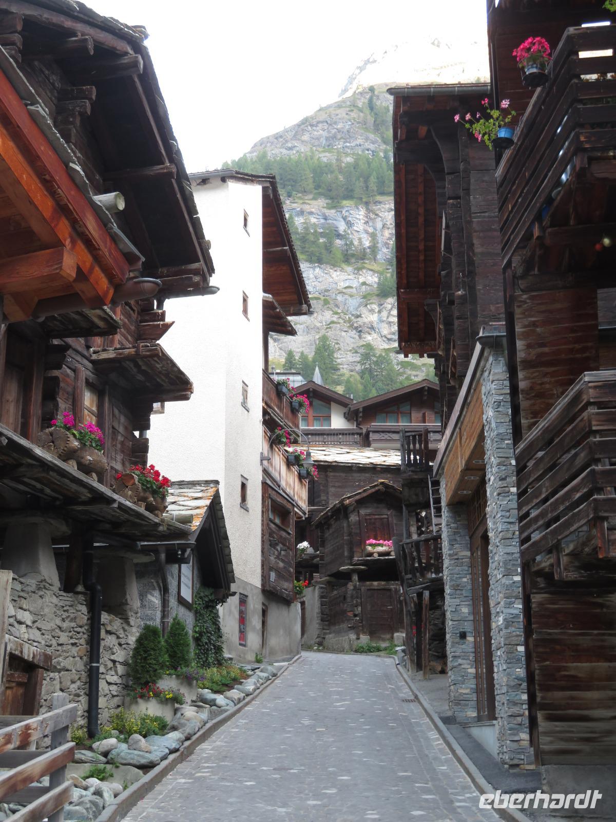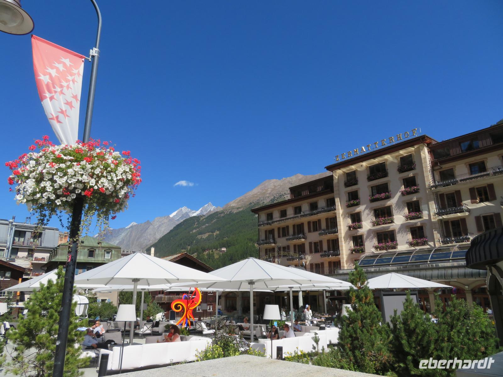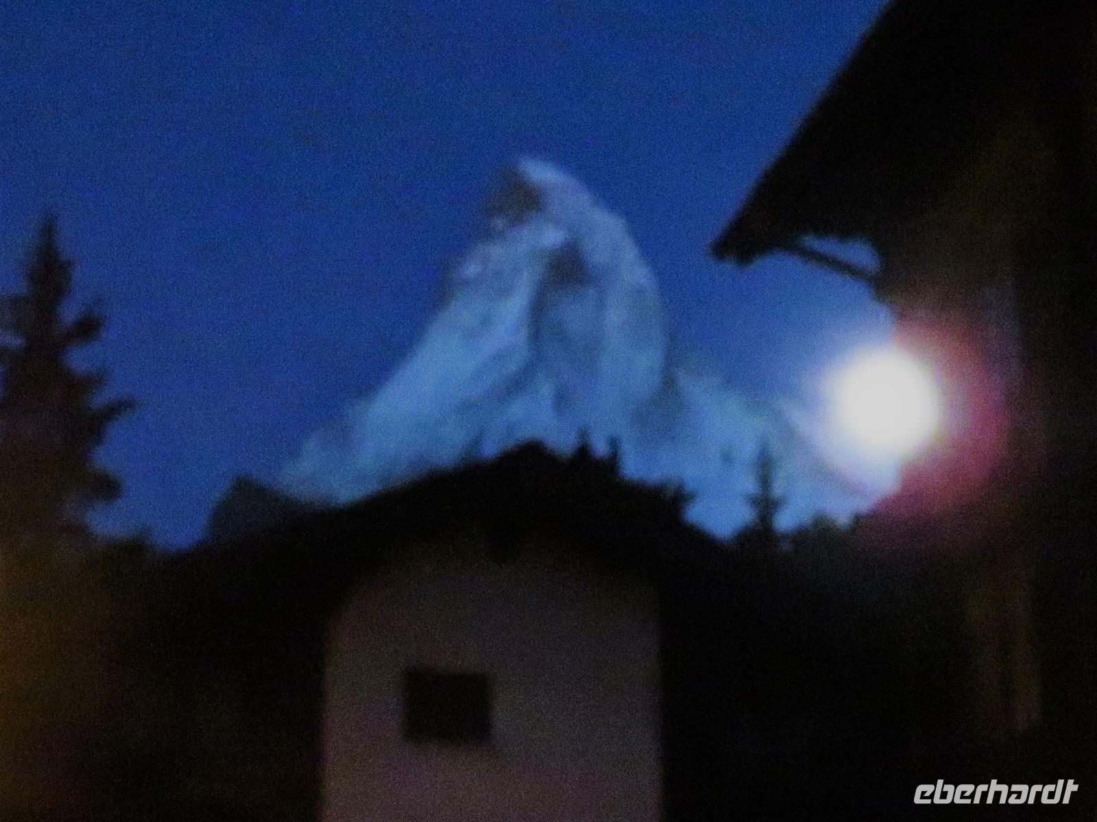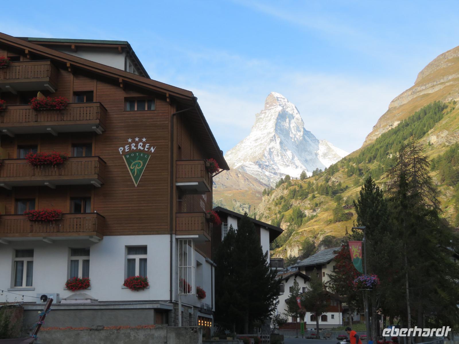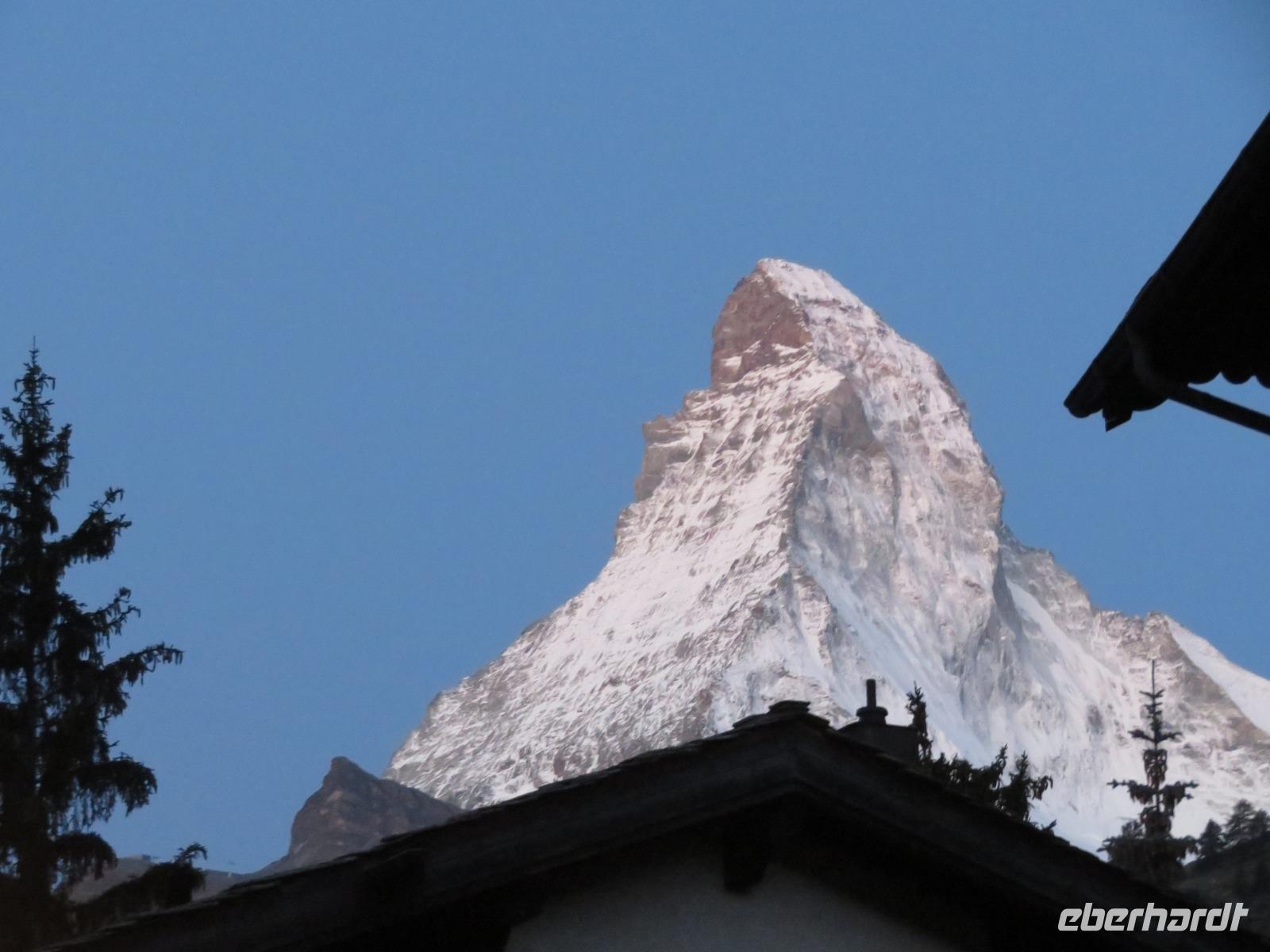 Im Tal ist es noch dunkel. Die typischen Elektrofahrzeuge Zermatts surren durch den kühlen Morgen; auf den Ladeflächen sitzen Bauarbeiter die ihrem Tagewerk entgegen fahren und noch etwas verschlafen in den Fahrtwind blinzeln. Ein Mann sammelt den Müll vom Straßenrand ein der achtlos weggeworfen wurde und sorgt dafür, dass die Besucher, wenn sie auf den Straßen und Plätzen erscheinen, ein sauberes Gebirgsdorf vorfinden. Fleißige Hände aus aller Herren Länder arbeiten, meist im Stillen, für unser Wohlbefinden, wir müssen darüber sehr dankbar sein!Den Touristen allerdings zieht es in dieser Frühe hinaus an die frische Luft um sich ein geniales Schauspiel nicht entgehen zu lassen: den Sonnenaufgang. Noch zeigt sich das Matterhorn in silbrigem Weiß, daneben steht der Mond im blauen Dämmerschein, doch wie von Geisterhand beginnt plötzlich die oberste Spitze des Berges kupferfarben zu schimmern. Wie ein leuchtender Brand setzt sich dieses eigentümliche Strahlen nach unten fort: Bald erglüht dieser Berg der Berge komplett im magischen Glanz und verrät uns damit den Sonnenaufgang, während es im Tal noch dunkel bleibt. Bald verliert sich die Kupferfarbe und macht einem strahlenden Weiß Platz, die Sonne hat nun das ganze Matterhorn in ihre Strahlkraft genommen. Der Tourist erfuhr vom Wetterbericht, dass der Anblick den ganzen Tag andauern wird, geht leicht fröstelnd zum Hotel zurück um sich am reichhaltigen Frühstücksbuffet die erste Stärkung des Tages zu holen. Leckerer Kaffeeduft und der Geruch von frischen Brötchen weckt seinen Appetit, dieser Tag beginnt richtig gut!