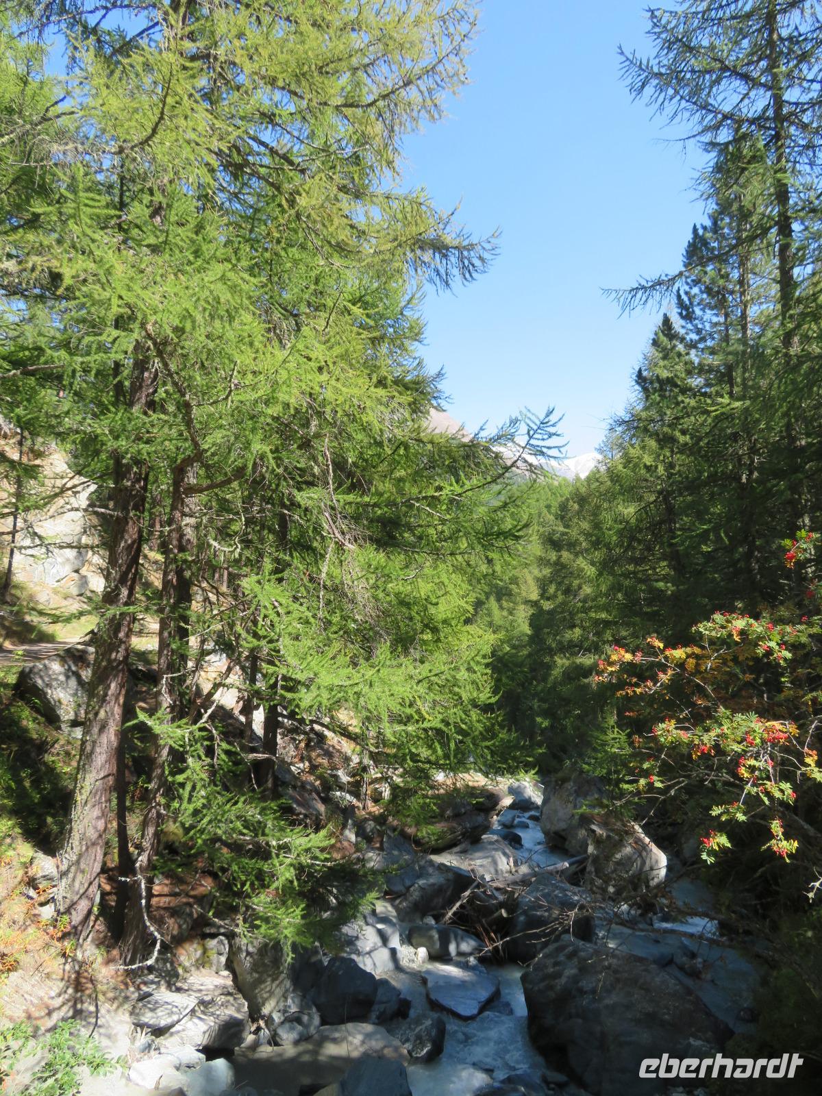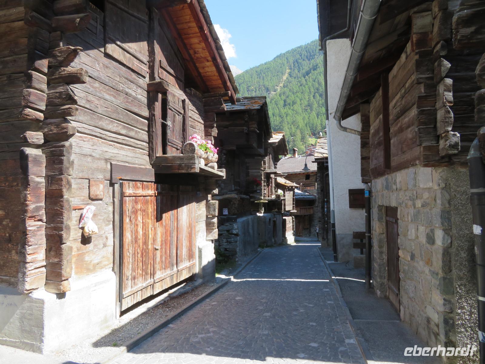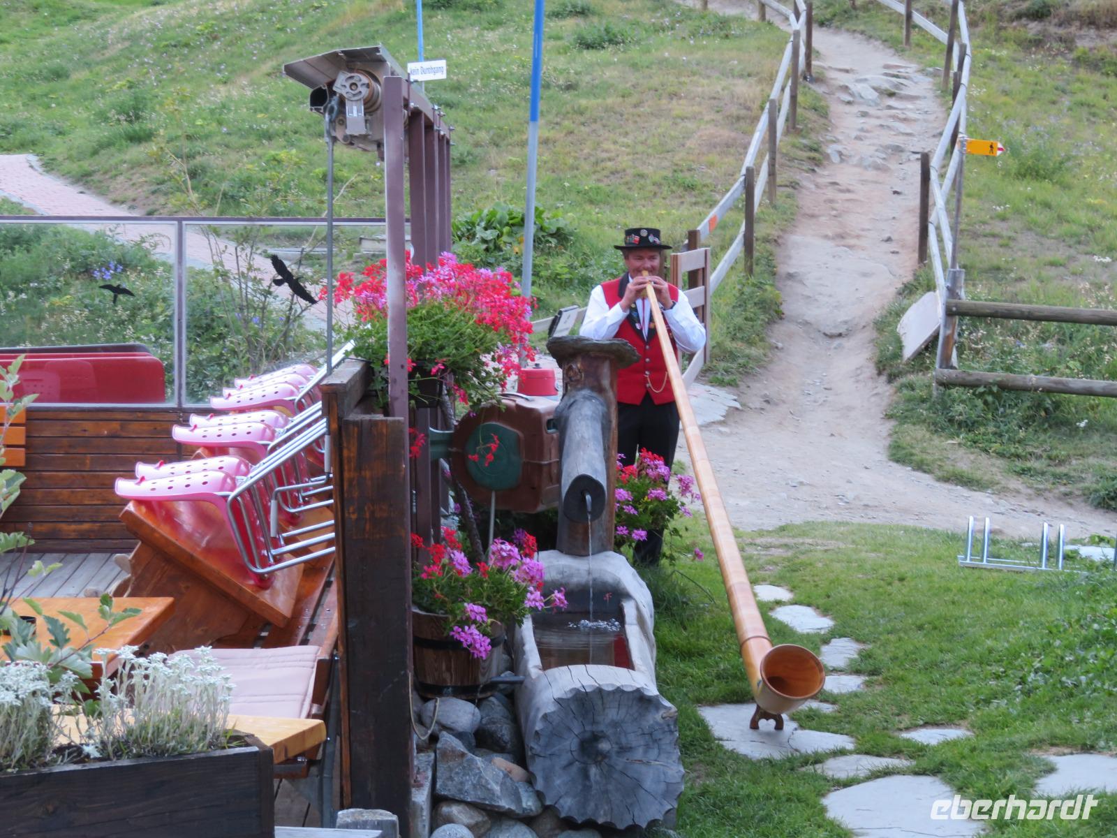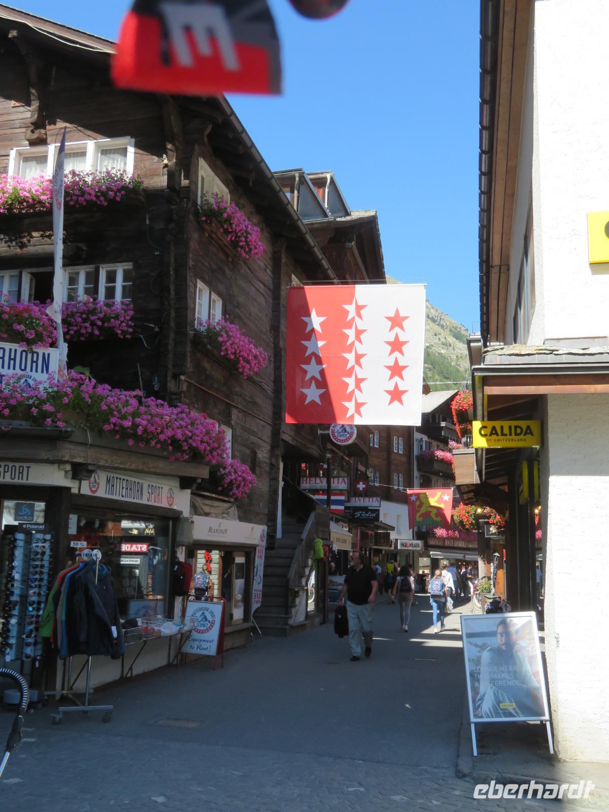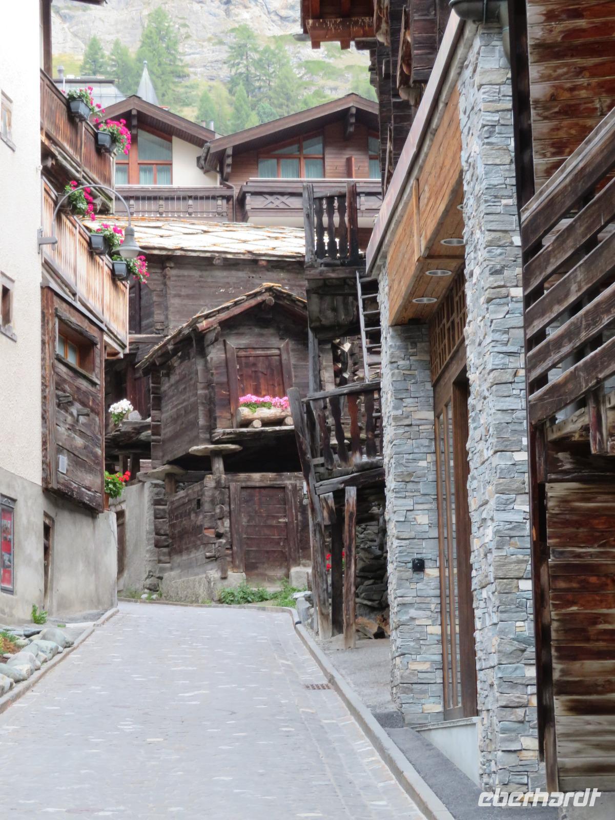 Im Tal ist es noch dunkel. Die typischen Elektrofahrzeuge Zermatts surren durch den kühlen Morgen; auf den Ladeflächen sitzen Bauarbeiter die ihrem Tagewerk entgegen fahren und noch etwas verschlafen in den Fahrtwind blinzeln. Ein Mann sammelt den Müll vom Straßenrand ein der achtlos weggeworfen wurde und sorgt dafür, dass die Besucher, wenn sie auf den Straßen und Plätzen erscheinen, ein sauberes Gebirgsdorf vorfinden. Fleißige Hände aus aller Herren Länder arbeiten, meist im Stillen, für unser Wohlbefinden, wir müssen darüber sehr dankbar sein!Den Touristen allerdings zieht es in dieser Frühe hinaus an die frische Luft um sich ein geniales Schauspiel nicht entgehen zu lassen: den Sonnenaufgang. Noch zeigt sich das Matterhorn in silbrigem Weiß, daneben steht der Mond im blauen Dämmerschein, doch wie von Geisterhand beginnt plötzlich die oberste Spitze des Berges kupferfarben zu schimmern. Wie ein leuchtender Brand setzt sich dieses eigentümliche Strahlen nach unten fort: Bald erglüht dieser Berg der Berge komplett im magischen Glanz und verrät uns damit den Sonnenaufgang, während es im Tal noch dunkel bleibt. Bald verliert sich die Kupferfarbe und macht einem strahlenden Weiß Platz, die Sonne hat nun das ganze Matterhorn in ihre Strahlkraft genommen. Der Tourist erfuhr vom Wetterbericht, dass der Anblick den ganzen Tag andauern wird, geht leicht fröstelnd zum Hotel zurück um sich am reichhaltigen Frühstücksbuffet die erste Stärkung des Tages zu holen. Leckerer Kaffeeduft und der Geruch von frischen Brötchen weckt seinen Appetit, dieser Tag beginnt richtig gut!