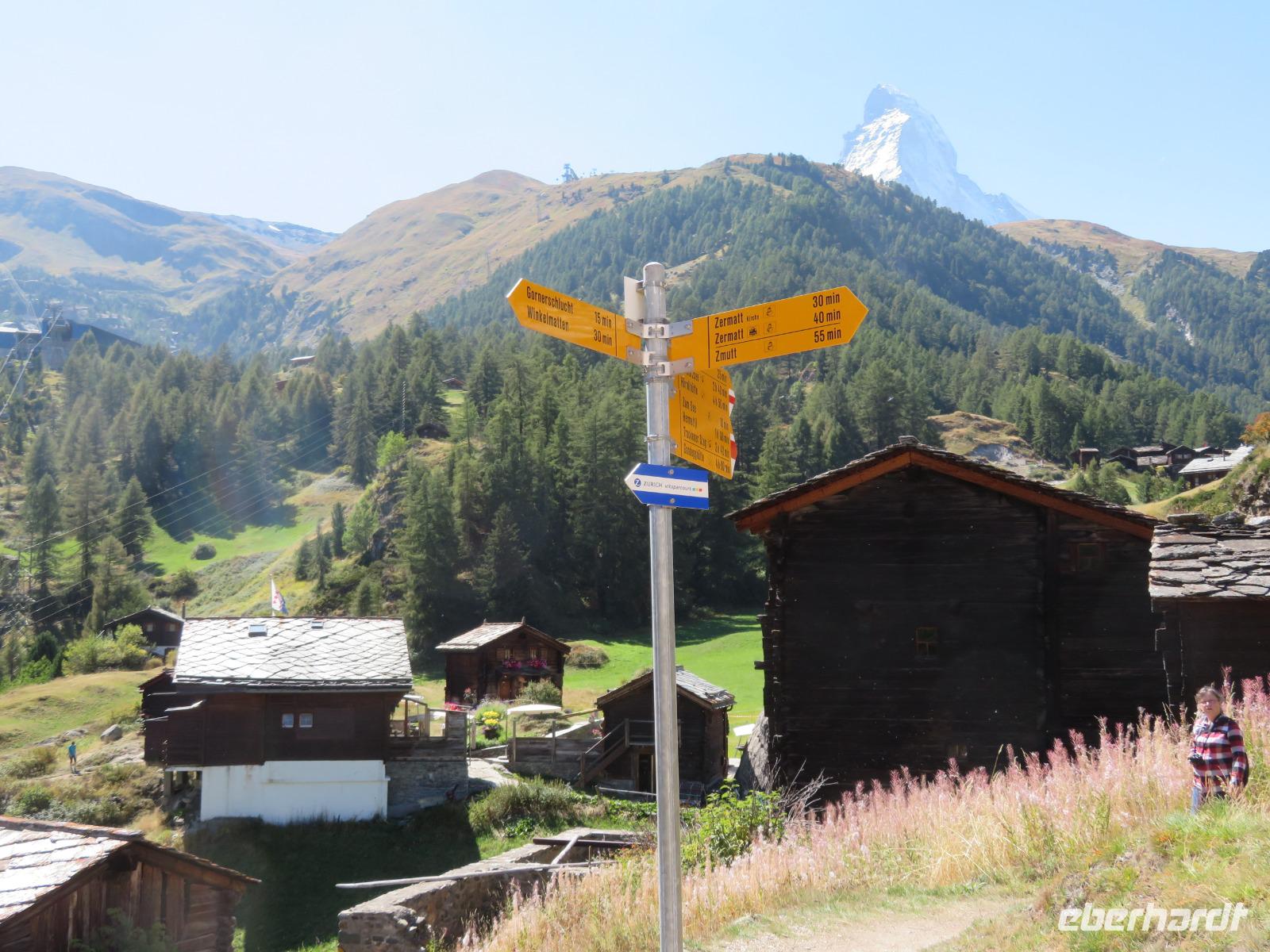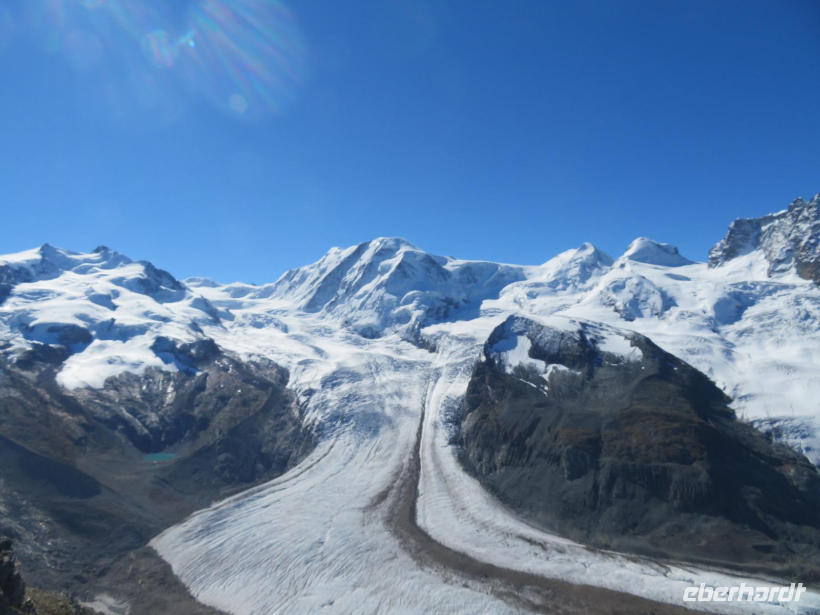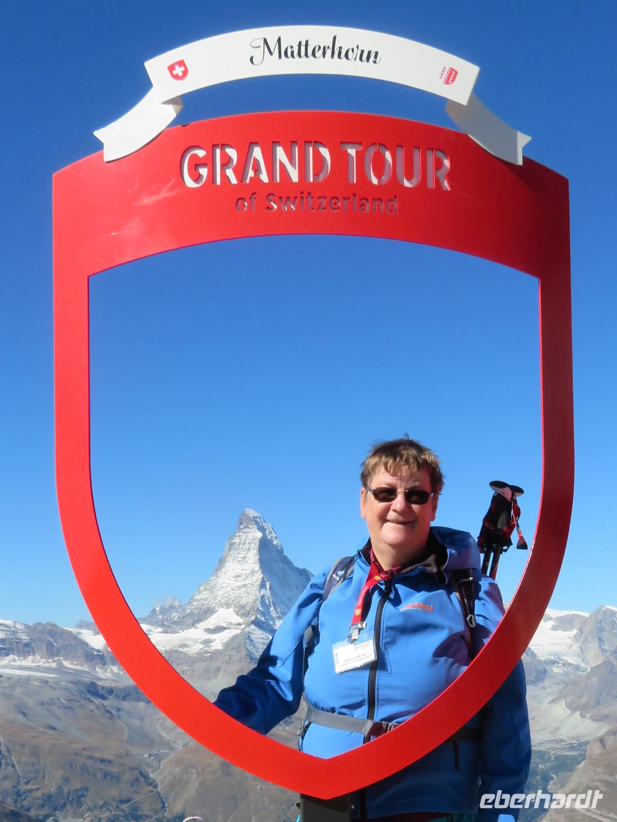 Kurz nach neun hat sich unsere Reisegruppe eingefunden um die Fahrt zu einem besonderen Gipfel zu beginnen: dem Gornergrat. Ein kurzer Spaziergang entlang des Bahndammes und wir sind an der Talstation angelangt. Hier sehen wir auch dass der Fremdenverkehr wieder eingesetzt hat. Mit etwas Geduld finden wir dann auch unsere Plätze, die Türen fahren automatisch zu, ein Ruck und die Fahrt nimmt ihren Lauf. Bald werden wir von strahlendem Sonnenschein übergossen; unser Blick geht immer wieder nach rechts zum Matterhorn. Langsam steigen wir an; ein Murmeltier rennt flink über die Wiese seinem Bau zu und wir überschreiten bald die Baumgrenze. Nach und nach erscheinen all die Prachtberge die vom ewigen Eis und Schnee gekrönt sind und in einem Weiß erstrahlen, welches es nur in diesen Bergen gibt. Endstation Gornegrat, ein kühles Lüftchen schlägt uns beim Aussteigen entgegen und wir kommen aus dem Staunen nicht mehr heraus. Überall wohin man blickt: Viertausender. Unten im steinigen Tal blinkt uns ein grünlicher See entgegen und fast auf der gesamten Talebene zieht der zerfurchte Eisstrom des Gornergletschers seine unmerkliche Bahn. Die Monterosa - Gruppe, Castor und Pollux, das Breithorn und schließlich das Matterhorn bilden wie ein riesiges Amphitheater die Kulisse vor welcher der Mensch zum Winzling wird. Ein Spazierging führt uns zu den verschiedenen Aussichtspunkten mit immer neuen und beeindruckenden Perspektiven und man mag den Blick davon gar nicht losreißen.Verbunden mit einer Wanderung erschließen wir uns weitere Schönheiten der Bergwelt. Die Zahnradbahn bringt einen Teil unserer Gruppe hinunter nach Rotenboden und ein Spaziergang führt uns zum Riffelsee. In Erstaunen setzt uns die wunderbare Spiegelung im See; viele Berge und selbstverständlich auch das Matterhorn, zeigen sich wie eine Fata Morgana. Der Mittag vergeht, der Nachmittag kommt näher und die Sonne lacht weiter von einem strahlend blauen Firmament herab welches mit dem Weiß des ewigen Schnees wunderbar kontrastiert.Am Nachmittag schauen wir uns bei einem Spaziergang Zermatt etwas näher an; wer möchte hat morgen einen ganzen Tag Zeit für diesen wunderbaren Ort im Gebirge. Ob die Bahnhofstraße, die Shoppingmeile mit den zahlreichen Geschäften, der Bergsteigerfriedhof, die schöne Mauritiuskirche oder das ganz alte Zermatt mit den uralten Speichern und Wohnhäusern, hier gibt es viel zu entdecken!