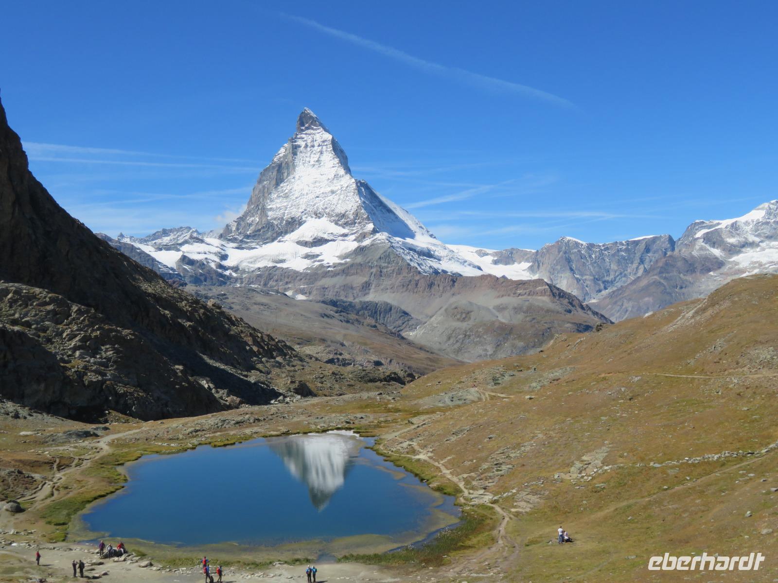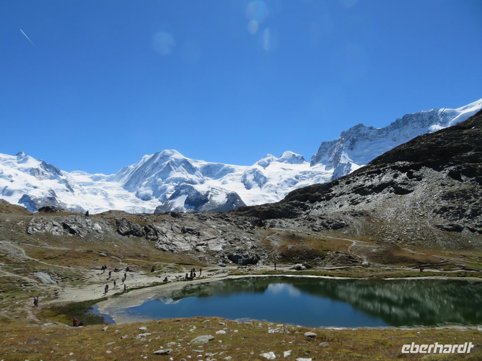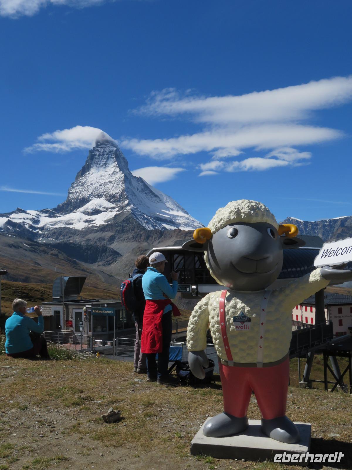 Kurz nach neun hat sich unsere Reisegruppe eingefunden um die Fahrt zu einem besonderen Gipfel zu beginnen: dem Gornergrat. Ein kurzer Spaziergang entlang des Bahndammes und wir sind an der Talstation angelangt. Hier sehen wir auch dass der Fremdenverkehr wieder eingesetzt hat. Mit etwas Geduld finden wir dann auch unsere Plätze, die Türen fahren automatisch zu, ein Ruck und die Fahrt nimmt ihren Lauf. Bald werden wir von strahlendem Sonnenschein übergossen; unser Blick geht immer wieder nach rechts zum Matterhorn. Langsam steigen wir an; ein Murmeltier rennt flink über die Wiese seinem Bau zu und wir überschreiten bald die Baumgrenze. Nach und nach erscheinen all die Prachtberge die vom ewigen Eis und Schnee gekrönt sind und in einem Weiß erstrahlen, welches es nur in diesen Bergen gibt. Endstation Gornegrat, ein kühles Lüftchen schlägt uns beim Aussteigen entgegen und wir kommen aus dem Staunen nicht mehr heraus. Überall wohin man blickt: Viertausender. Unten im steinigen Tal blinkt uns ein grünlicher See entgegen und fast auf der gesamten Talebene zieht der zerfurchte Eisstrom des Gornergletschers seine unmerkliche Bahn. Die Monterosa - Gruppe, Castor und Pollux, das Breithorn und schließlich das Matterhorn bilden wie ein riesiges Amphitheater die Kulisse vor welcher der Mensch zum Winzling wird. Ein Spazierging führt uns zu den verschiedenen Aussichtspunkten mit immer neuen und beeindruckenden Perspektiven und man mag den Blick davon gar nicht losreißen.Verbunden mit einer Wanderung erschließen wir uns weitere Schönheiten der Bergwelt. Die Zahnradbahn bringt einen Teil unserer Gruppe hinunter nach Rotenboden und ein Spaziergang führt uns zum Riffelsee. In Erstaunen setzt uns die wunderbare Spiegelung im See; viele Berge und selbstverständlich auch das Matterhorn, zeigen sich wie eine Fata Morgana. Der Mittag vergeht, der Nachmittag kommt näher und die Sonne lacht weiter von einem strahlend blauen Firmament herab welches mit dem Weiß des ewigen Schnees wunderbar kontrastiert.Am Nachmittag schauen wir uns bei einem Spaziergang Zermatt etwas näher an; wer möchte hat morgen einen ganzen Tag Zeit für diesen wunderbaren Ort im Gebirge. Ob die Bahnhofstraße, die Shoppingmeile mit den zahlreichen Geschäften, der Bergsteigerfriedhof, die schöne Mauritiuskirche oder das ganz alte Zermatt mit den uralten Speichern und Wohnhäusern, hier gibt es viel zu entdecken!