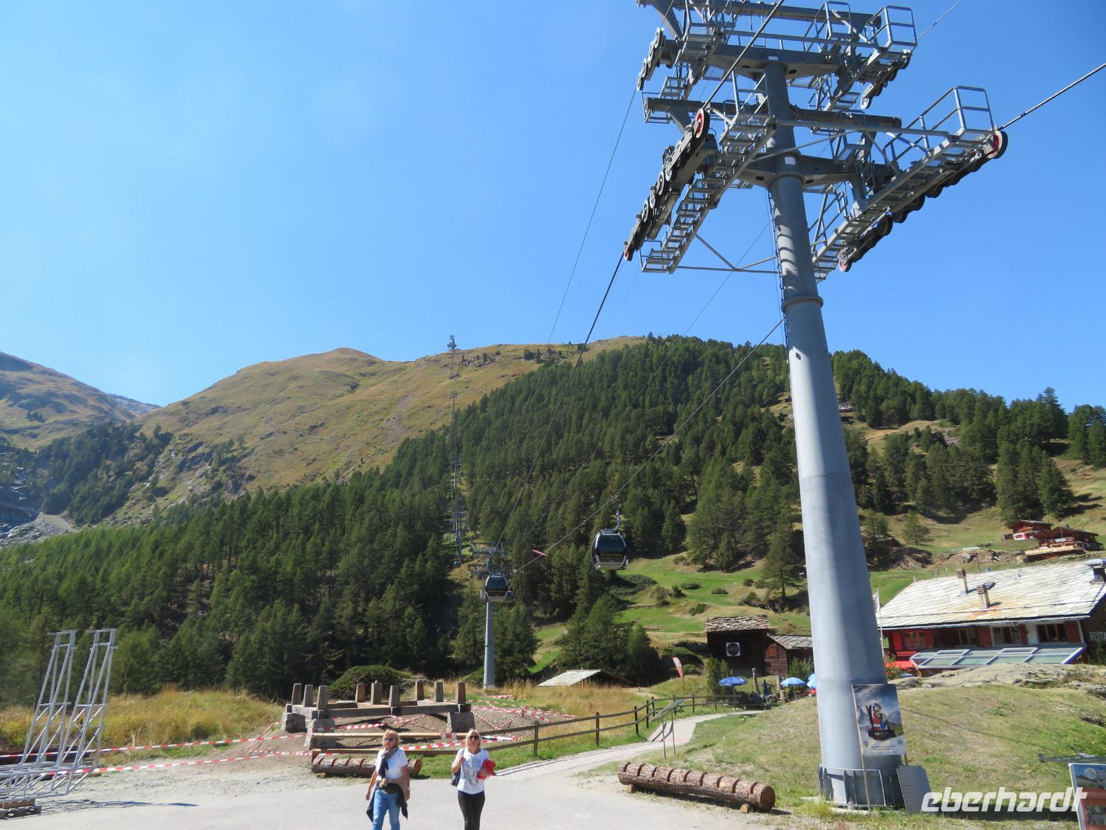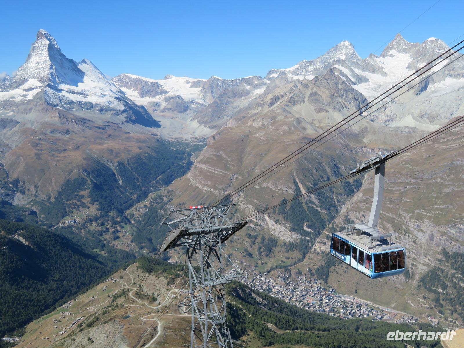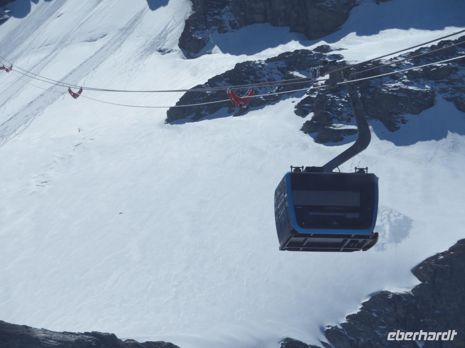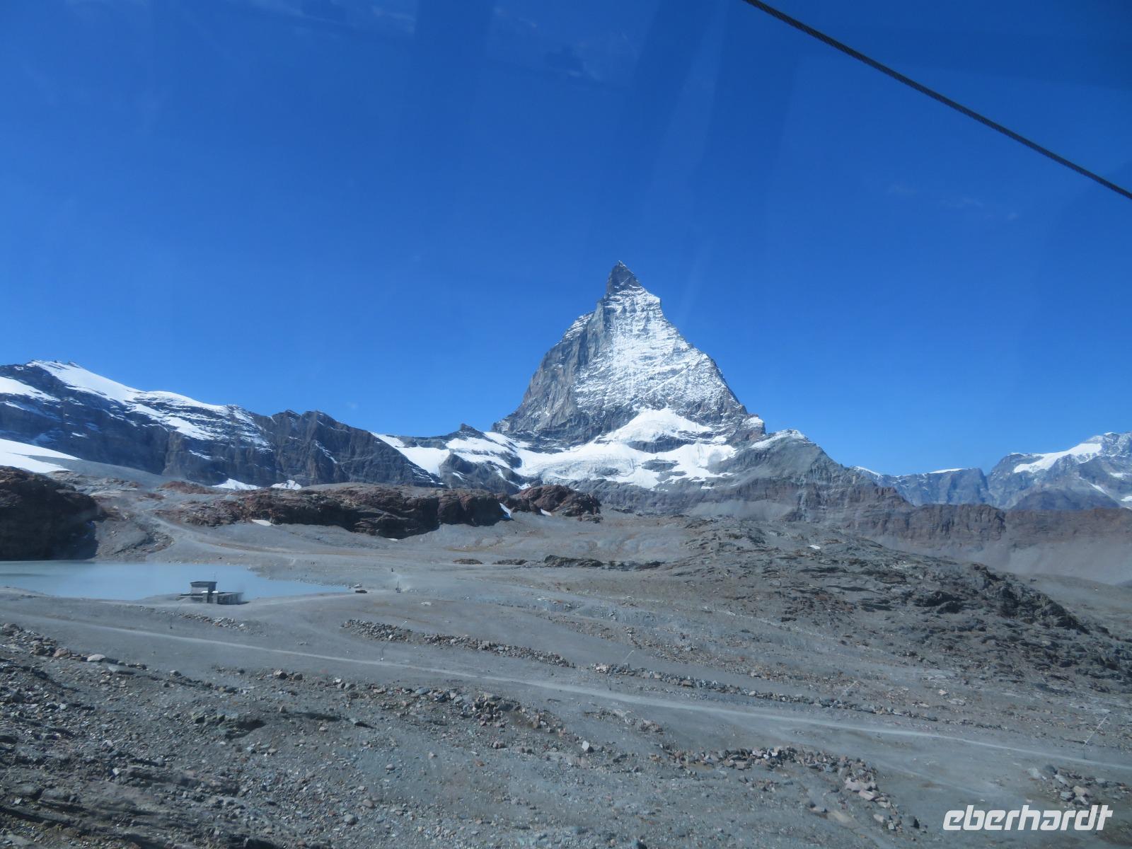 Wie am gestrigen Morgen erstrahlt das Matterhorn in seiner weißen Pracht, aber noch hat die Sonne ihren Weg nicht ins Tal gefunden als unsere Gruppen erwartungsvoll einem ganz großen Erlebnis entgegengehen. Voller Erwartung sehen wir die Kabinen der Seilbahn emporfahren und, nachdem die Tickets geholt wurden, kann es losgehen. Zunächst gelangen wir hinauf zum Schwarzsee welcher in einer kleinen Senke liegt. Ringsum können wir einmal mehr auf unserer Reise die wunderbare Bergkulisse bewundern, diesmal aus einer neuen Perspektive. Doch bald geht es weiter, wir wollen den Gipfel bezwingen. Bevor es aber soweit ist müssen wir noch einmal umsteigen. Trockener Steg heißt der letzte Ort von hier aus geht es nun endgültig hinauf zum Klein Matterhorn. In der modernen Gondel schweben wir über das ewige Eis des Gletschers; tiefe Furchen haben sich hier eingegraben und wir genießen die Stille die uns umgibt. Dann sind wir oben angelangt; über einen Tunnel gelangen wir direkt in den Schnee. Überall sind Skifahrer unterwegs und etwas abseits trainiert die Jugendmannschaft der Schweiz, hier sehen wir vielleicht einen Weltmeister von morgen? Am Breithorn bemerken wir ameisenklein die Bergsteiger welche diesen wichtigen Gipfel ersteigen, hier oben gibt es in allen Richtungen etwas zu sehen.Der Aufenthalt gestaltet sich sehr angenehm; allerdings müssen wir in dieser sehr dünnen Luft langsam gehen, aber ein Besuch in der Gletschergrotte muss sein, staunend stehen wir vor den Zeugnissen dieser Kunst, verewigt in Schnee und Eis.Auch für heute haben wir uns eine Wanderung vorgenommen. Die Nachmittgassonne sieht uns auf dem Weg von Furi, welches wir mit der Kabinenbahn erreicht haben, auf dem Weg ins Tal. Die Häuser von Zermatt erscheinen von hier aus wie im Spielzeugland; unten angelangt führt uns der Weg nun zum Hotel, einer kleinen Nachmittagsruhe entgegen.