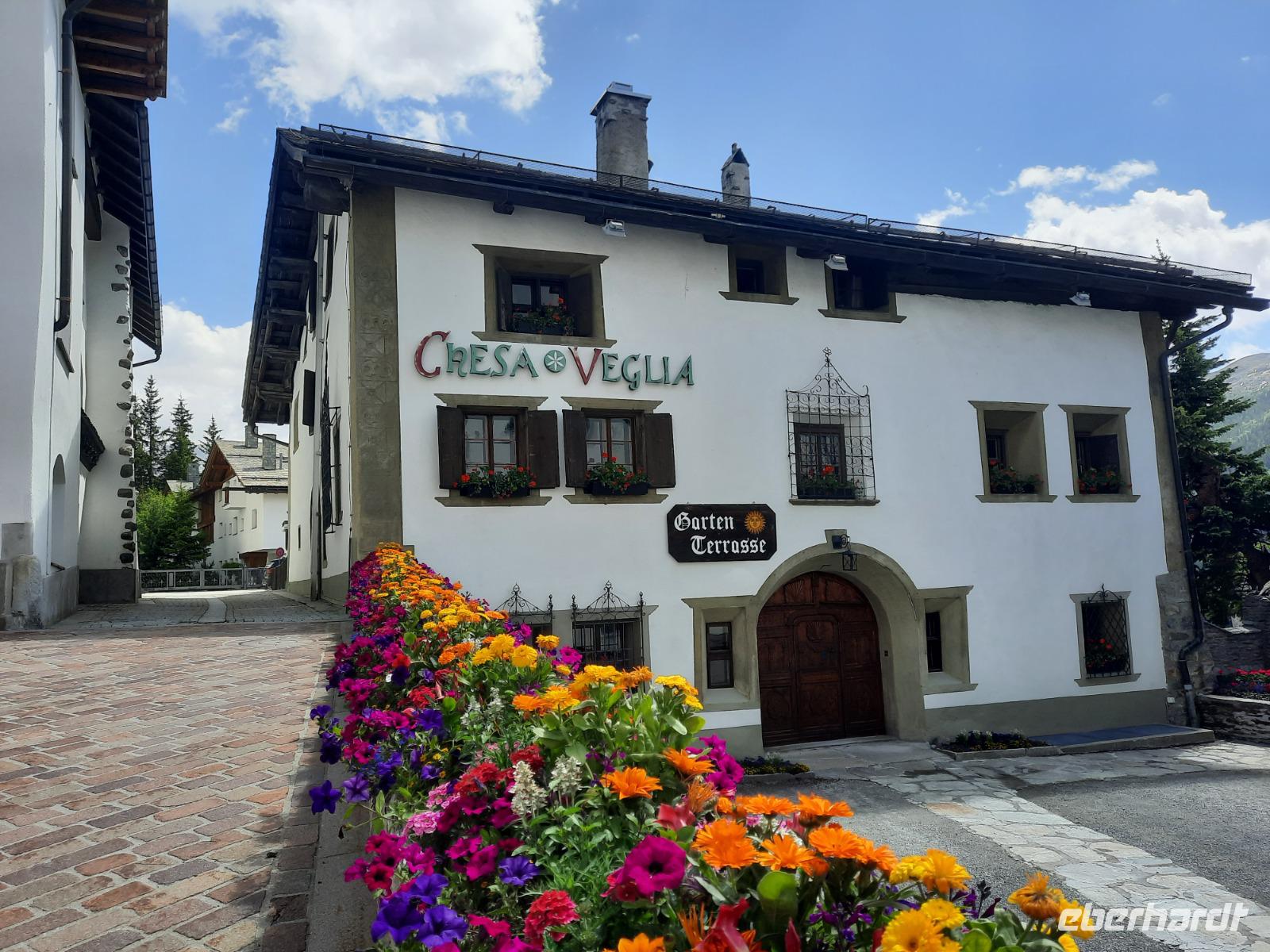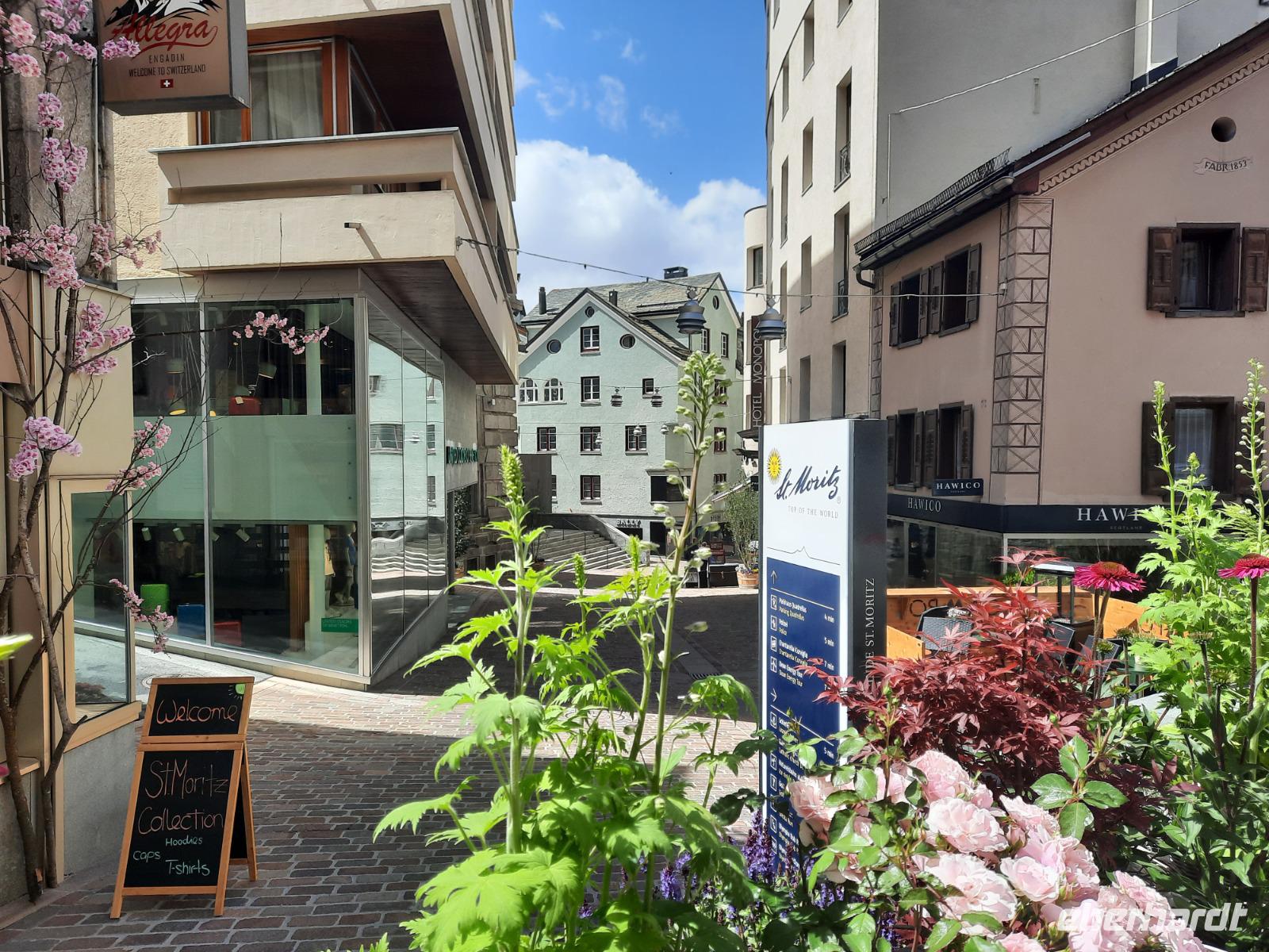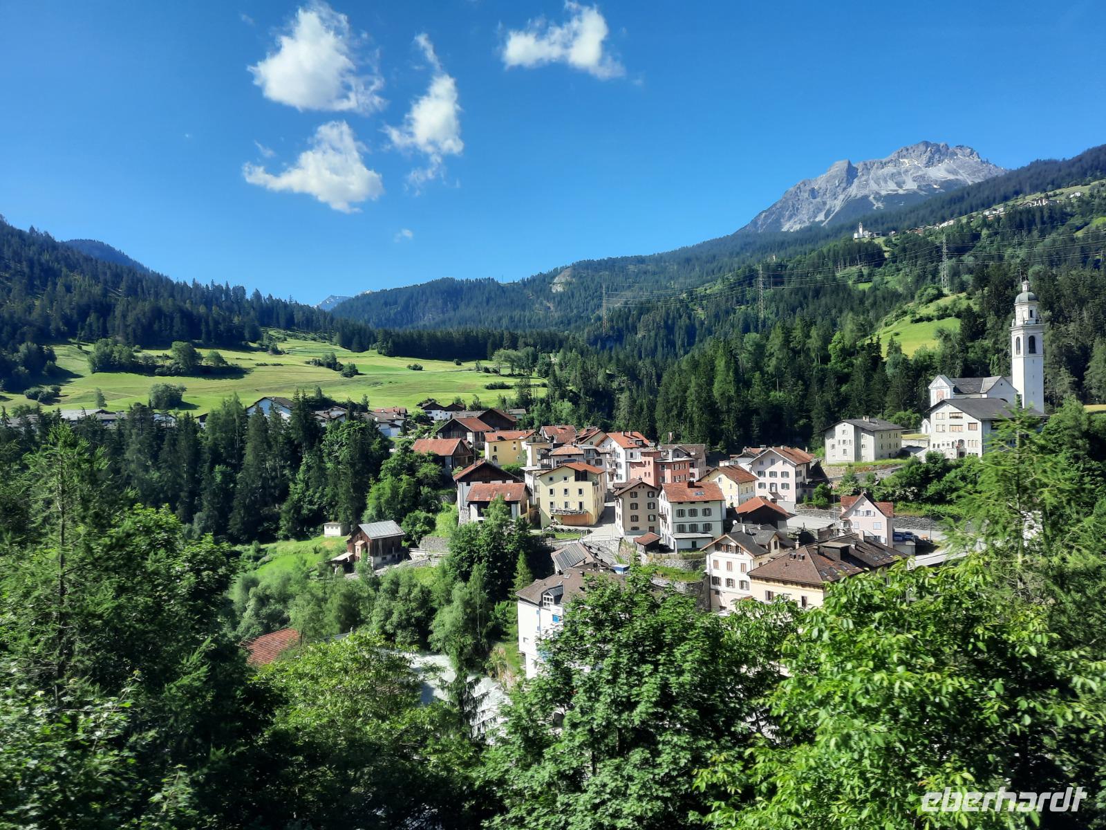 Nach einem ausgiebigen Frühstück begann unser Engadin-Ausflug. Mit dem "Engadin" ist übrigens das Bündner Inntal gemeint. Im Engadin spricht man Rätoromanisch und dort sagt man En, wenn man vom Inn spricht. Unsere heutige Fahrt führte uns wiederum über den Flüela-Pass vorerst ins Unterengadin und von Susch aus über Zernez, vorbei an Zuoz und Samedan nach St. Moritz. Zahlreiche Baustellen prägten das Ortsbild, aber das ist im Sommer durchaus normal. Die meisten Touristen besuchen St. Moritz nämlich im Winter. Das hatte natürlich auch einen Vorteil für uns, denn so konnten wir ganz in Ruhe flanieren. Zum Glück für die Männer, hatten auch noch einige der teuren Geschäfte geschlossen und so musste niemand seine Kreditkarte zücken. Ich führte unsere Gäste vorbei an den leider nur noch wenigen übrig gebliebenen typisch Engadiner Häusern bis zum sogenannten "Schiefen Turm", dem Rest einer alten Kirche aus dem Mittelalter. Dieser Turm ist übrigens eines der Wahrzeichen von St. Moritz, denn viele historische Bauten mussten Neubauten weichen. Für die meisten von uns ging es schließlich ganz einfach darum, St. Moritz zumindest mal gesehen zu haben, um mitreden zu können. Fast alle waren der Meinung, dass hier leider sehr viel von der Ursprünglichkeit verloren gegangen ist. Vorbei an den Oberengadiner Seen bzw. einer kleinen Mittagspause am Silvaplaner See ging es nunmehr zum Julierpass hinauf. Dieser Pass bildet den Übergang vom Engadin nach Tiefencastel bzw. ins Rheintal. Durch das Oberhalbstein-Gebiet gelangten wir nach Tiefencastel und legten abschließend einen Fotostopp am imposanten Landwasserviadukt bei Filisur ein, bevor es am Nachmittag durch das Landwassertal nach Davos zurück ging. Am späten Nachmittag nutzten dann die meisten unserer Gäste die Gelegenheit, mit der Schatzalpbahn in nur etwa vier Minuten zur 1.860 Meter hoch gelegenen Schatzalp zu fahren - von dort aus konnten wir einen fantastischen Blick auf die Landschaft Davos und die umliegenden Berge genießen. Schließlich waren wir im Besitz der Davoser Gästekarte und mit diesem speziellen Sommerangebot konnten wir zu einem stark reduzierten Preis hinauf- bzw. hinunterfahren.