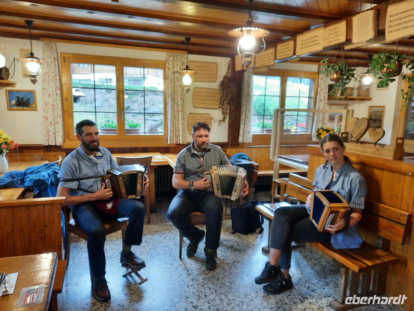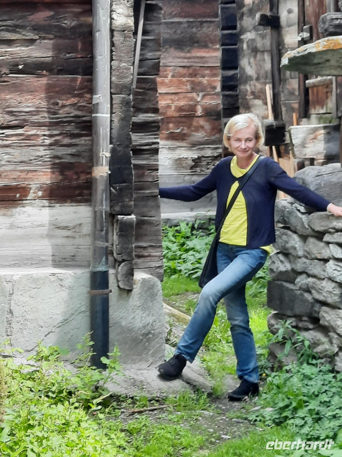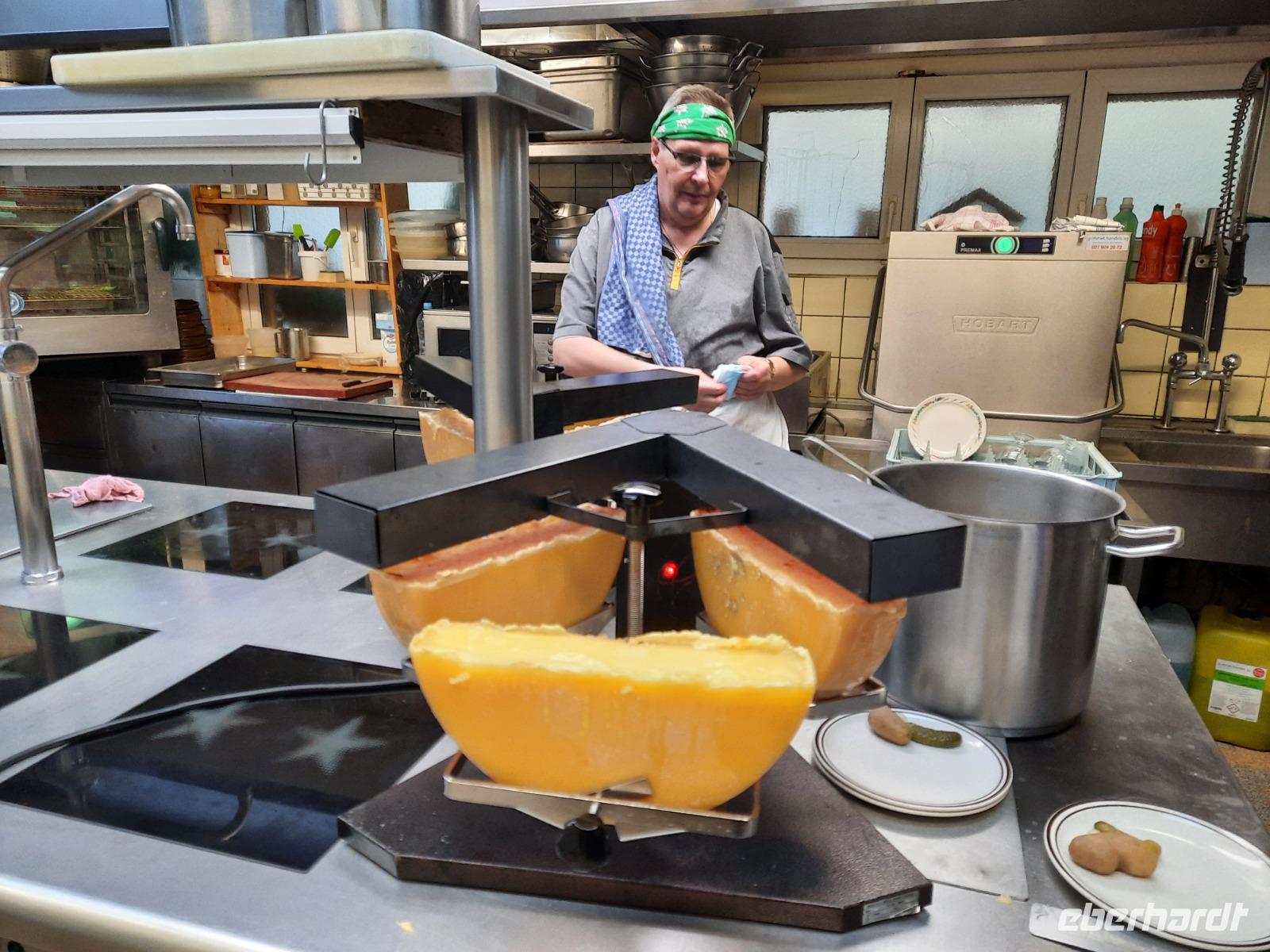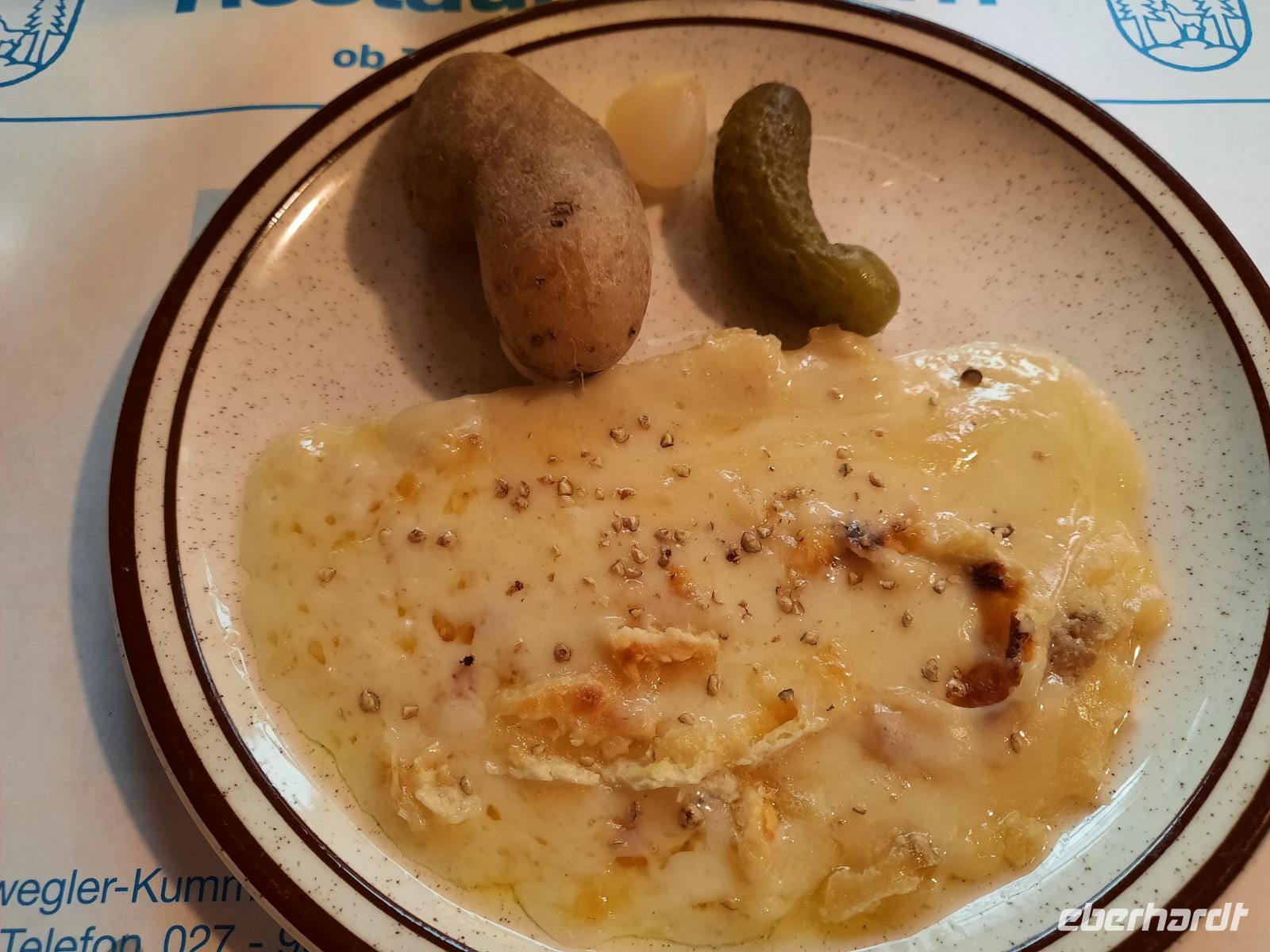 Der heutige Tag stand für Wanderungen in der Umgebung zur Verfügung. Auch für einen Spaziergang in Zermatt blieb ausreichend Zeit, denn hier gab es so einiges zu sehen. Besonders interessant ist immer wieder das alte Zermatt mit den typischen Walliser Holzhäusern. Diese Häuser stehen häufig auf sogenannten "Mäuseplatten" und dienten früher dazu, dass keine Mäuse an die Vorräte rankamen. So erlebte jeder diesen Tag nach seinen eigenen Vorstellungen. Unser Abendessen war heute übrigens nicht im Hotel geplant, sondern als Folklore- bzw. Spezialitätenabend im Bergrestaurant der knapp 2.000 Meter hoch gelegenen Station "Furi", einem Weiler oberhalb von Zermatt. Das Wetter machte uns zwar leider einen Strich durch die Rechnung, aber das tat der guten Stimmung keinen Abbruch. Jetzt durften wir ein typisch schweizerisches Essen erleben. Es gab Raclette - eine Käsespezialität mit Pellkartoffeln, grünen Gurken und Glaszwiebeln. Jeder konnte so viel essen, wie er wollte und wir hatten sogar die Gelegenheit bei der Zubereitung zuschauen. Um Raclette anzurichten, wird übrigens ein großer halbierter Käse an der Schnittfläche erhitzt und die geschmolzene Oberfläche jeweils abgeschabt. Für die meisten von uns war es das erste Raclette-Essen des Lebens. Die Schweizer lieben Käse und das merkt man natürlich auch, wenn es um hiesige kulinarische Spezialitäten geht. Für die passende musikalische Unterhaltung war ebenso gesorgt und so erlebten wir einen abwechslungsreichen und stimmungsvollen Abend in einem urigen rustikalen Bergrestaurant. Nachdem wir alle satt und zufrieden waren, ging es mit der Bahn nach Zermatt zurück.