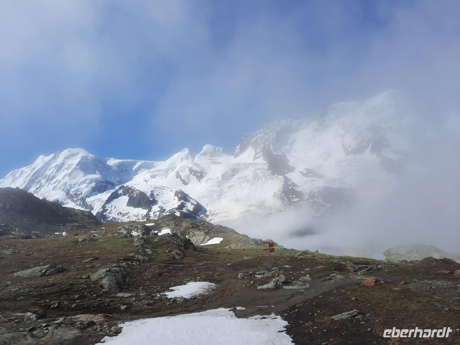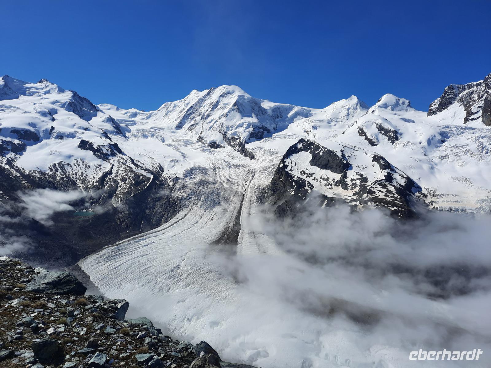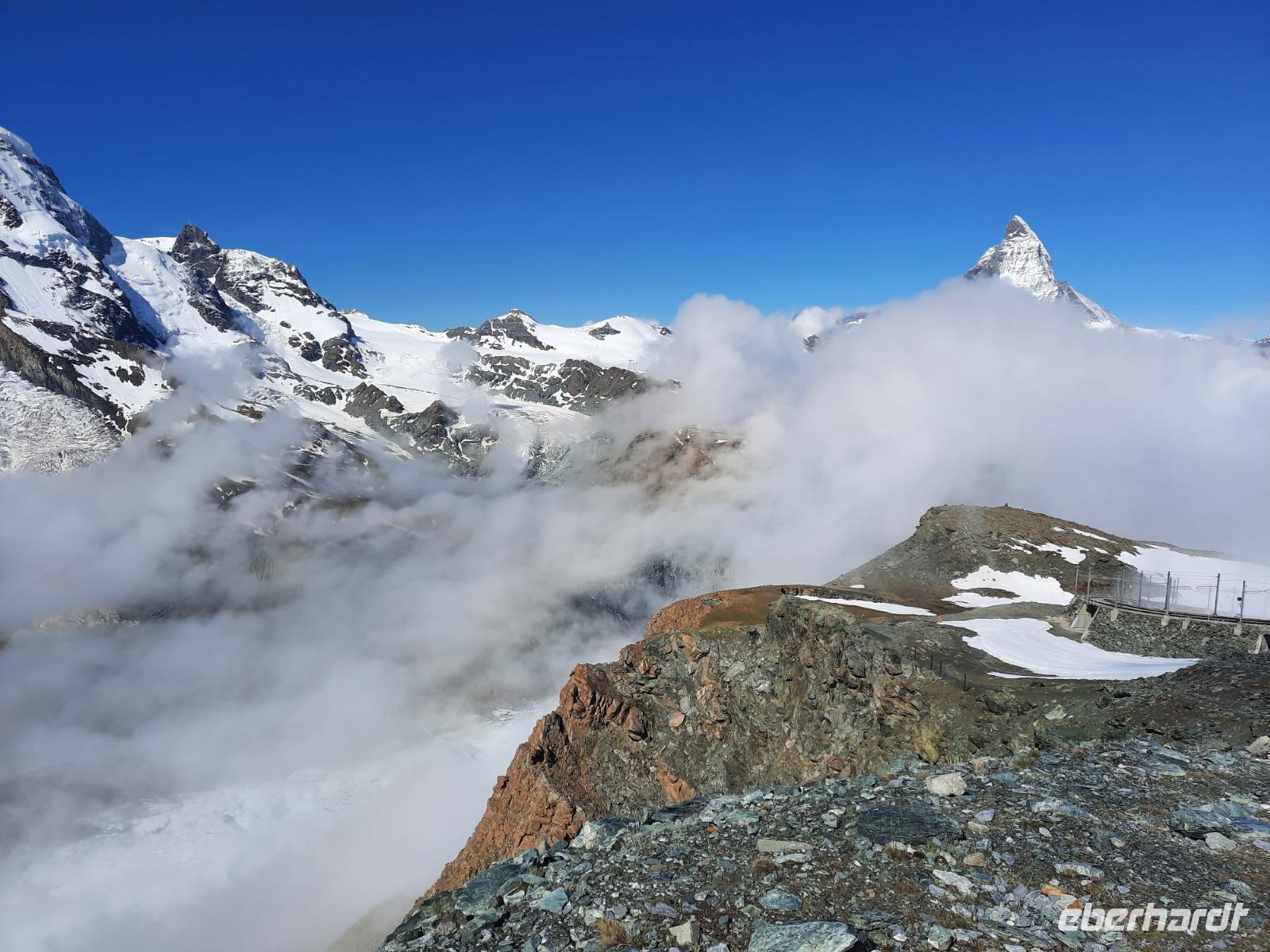 Am Morgen traf sich ein Teil der Gruppe, um die aktuelle Wetterlage zu präzisieren und zu entscheiden, ob eine Fahrt zum Kleinen Matterhorn sinnvoll ist. Wir entschieden uns für die Fahrt auf das 3.872 Meter hohe Kleine Matterhorn, obwohl der wolkenverhangene Himmel über Zermatt einige Zweifel aufkommen ließ. Die Prognose hieß allerdings, dass wir durch viele Wolken fahren würden und es auf über 3.000 Metern sehr schön wäre - genau so kam es dann übrigens auch... Doch zunächst spazierten wir entlang der Mattervispa, um die Talstation für den Besuch des Kleinen Matterhorns zu erreichen. Hier stiegen wir in den sogenannten "Matterhorn-Express", einer Umlaufbahn, die uns in etwa 25 Minuten zur Station "Trockener Steg" brachte. Jetzt war es nur noch ein Katzensprung bis zum Gipfel des Kleinen Matterhorns, den wir mit einer weiteren Bahn erreichten. Auf der Aussichtsplattform wurden wir dann mit herrlichen Panoramablicken auf die umliegenden Viertausender verwöhnt! Unsere Entscheidung am Morgen war demnach goldrichtig... Auch der Besuch des Gletscherpalastes auf dem Kleinen Matterhorn war einen Besuch wert; hier gelangten wir immerhin in eine Tiefe von 15 Meter unter die Eisoberfläche des Gletschers und ein märchenhafter Palast mitten im ewigen Eis verzauberte uns! Durch Eistunnels ging es durch den Gletscher und überall begeisterten uns funkelnde Eiskristalle und schillernde Eisskulpturen! Die Skulpturen werden übrigens regelmäßig erneuert und sind von Eiskünstlern gestaltet - wirklich sehenswert und kaum zu toppen! Am späten Nachmittag besuchten wir dann gemeinsam das Matterhorn Museum im Ortszentrum Zermatts. Unter dem Dorfplatz öffnet es seinen Besuchern mit der inszenierten Ausgrabungsstätte "Zermatlantis" eine bilderstarke Welt voller unglaublicher Geschichten. In unterirdischen Räumen wandelten wir während einer Führung durch ursprüngliche Berghütten und hörten den Wind am Berg toben - wir konnten regelrecht in die Abenteuer eintauchen, die sich am Matterhorn abgespielt haben. Des Weiteren wurde uns viel über die packende und wechselvolle Geschichte des weltberühmten Bergs, von seinem afrikanischen Ursprung über das Drama der Erstbesteigung bis heute erzählt. Danach war allen klar - das weltweit bekannte Wahrzeichen der Schweiz verdankt seinen Ruhm nicht einfach einer markanten Spitze. Vielmehr den Alpinisten, die entlang seiner Flanken stets neue Herausforderungen suchten. Unzählige von ihnen haben sich in den 149 Jahren, die seit Edward Whimpers Erstbesteigung ins Land gegangen sind, dem stolzen "Horu" gestellt. Den restlichen Nachmittag nutzten wir nochmals für individuelle Erkundungstouren in und um Zermatt.