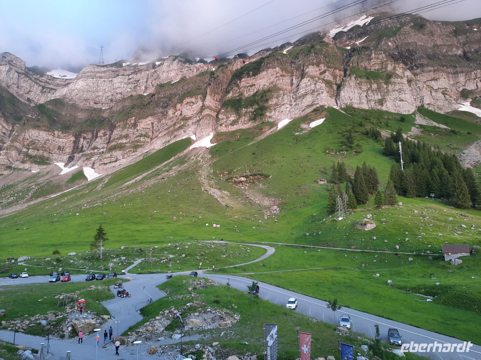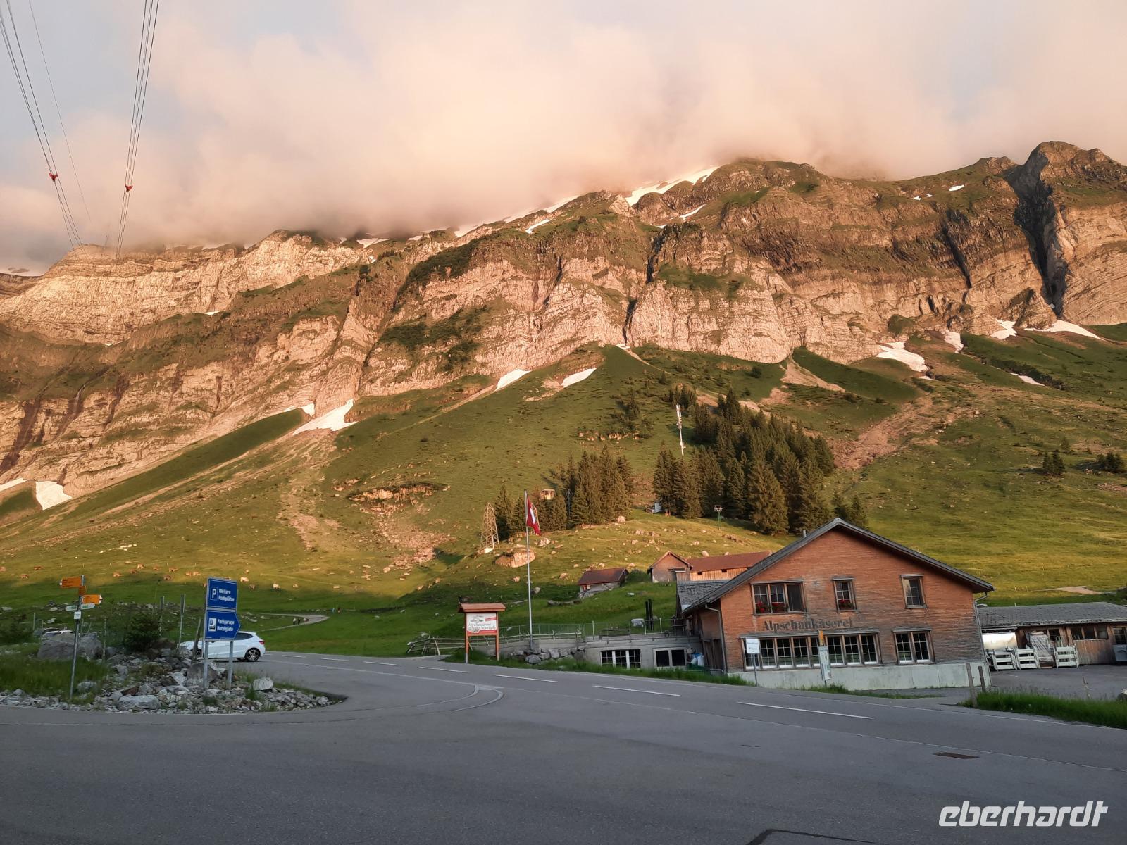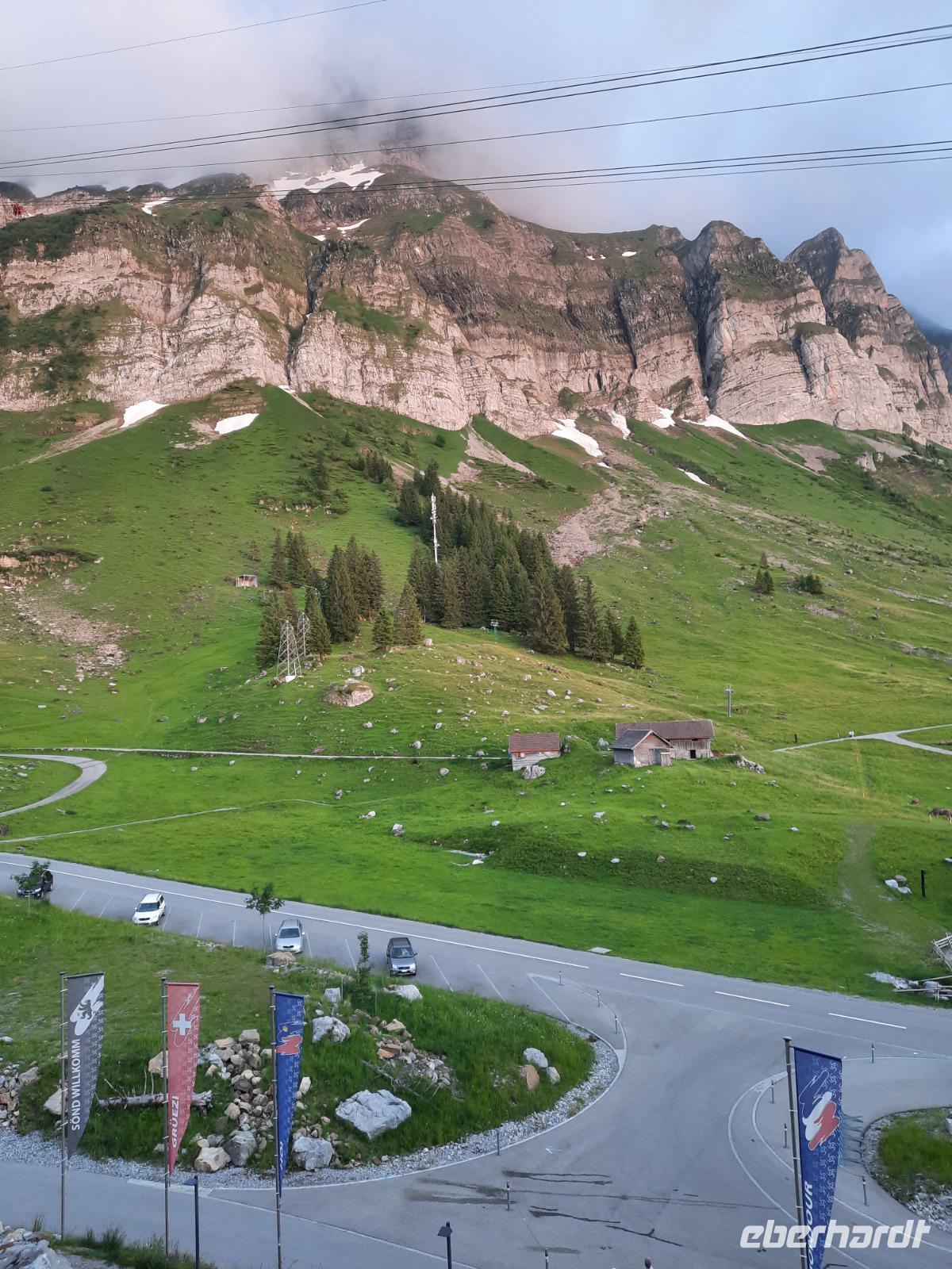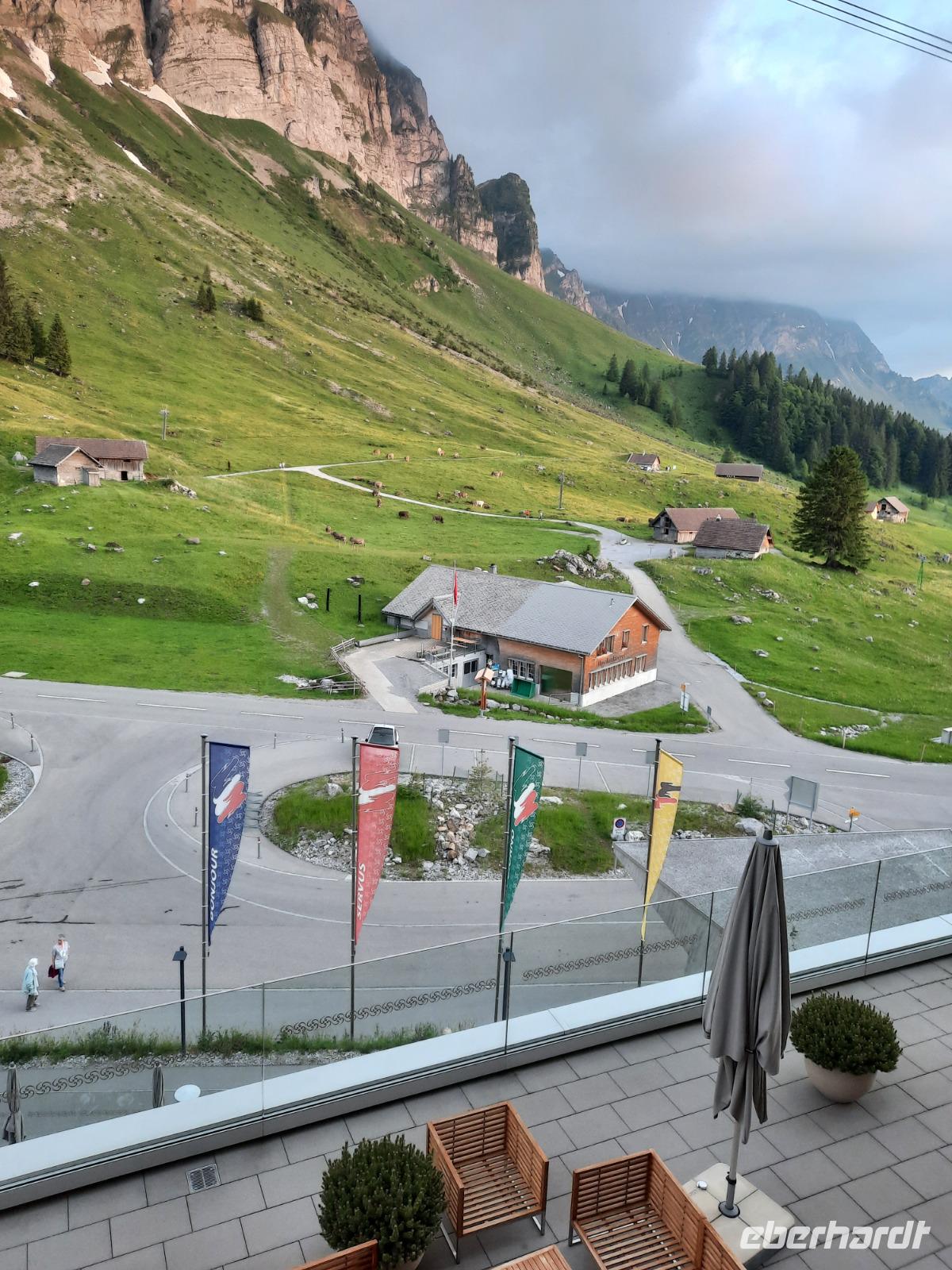 An diesem Morgen mussten wir dann leider auch schon wieder Abschied nehmen von dieser Region und ein letzter toller Blick auf das wolkenfreie Matterhorn läutete diesen Tag ein. Mit dem Pendelzug fuhren wir nach Täsch, denn dort, ca. 5 Kilometer nördlich von Zermatt, musste unser Bus parken, da Zermatt ein autofreier Ort ist. In Täsch angekommen, ging es dann schließlich mit dem Bus weiter. Der Gepäcktransport war übrigens bestens organisiert, niemand musste sich selbst darum kümmern. Unser Buschauffeur Steffen, das Hotel und letztendlich die Bahn organisierten, dass alle Koffer rechtzeitig im Bus waren. Nach einer etwa 2-stündigen Fahrt über Visp, Brig und das obere Rhonetal mit einem kurzen Aufenthalt an der Hängebrücke Fürgangen-Mühlebach erreichten wir den 2.165 Meter hohen Grimselpass. Auf der Passhöhe schauten sich die meisten von uns im Murmeltierpark um - wie niedlich! Mittlerweile war es Zeit für eine Mittagspause und ein Käsestand an der Grimselpass-Straße war ein willkommener Anlass für ein kleines Käse-Picknick zur Stärkung. Am Nachmittag erreichten wir dann schließlich Luzern mit der berühmten Kapellbrücke. So konnten wir immerhin behaupten, die zwei meistfotografierten Bildmotive der Schweiz wahrhaftig gesehen zu haben! Die Kapellbrücke wurde übrigens in der ersten Hälfte des 14. Jahrhunderts als Teil der Stadtbefestigung errichtet und hat ihren Namen von der benachbarten St.-Peters-Kapelle. Am Abend kamen wir an unserem letzten Übernachtungsort an - der etwa 1.300 Meter hoch gelegenen Schwägalp im Appenzeller Land. Dieser Ort war einfach himmlisch, nur die Glocken der Kühe waren zu hören und im modernen Berghotel Schwägalp konnten wir sämtliche Annehmlichkeiten und ein letztes schmackhaftes Abendessen genießen!