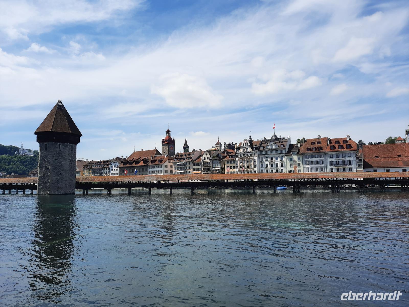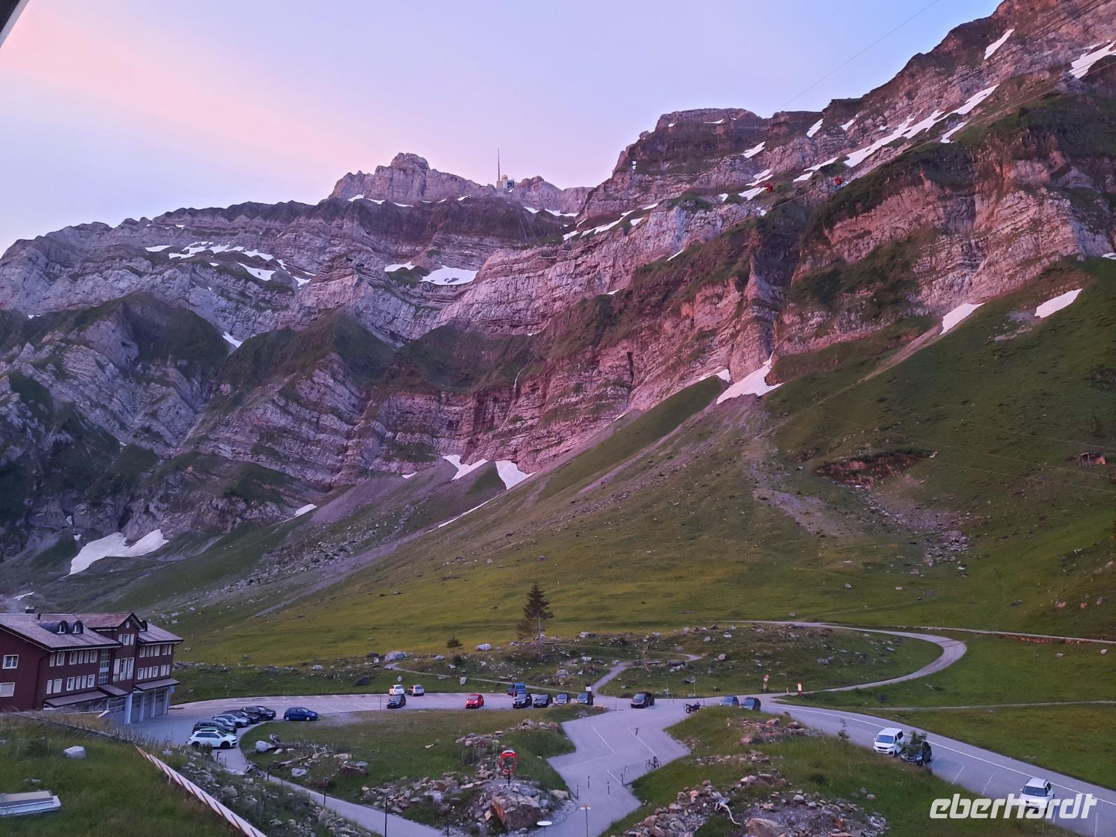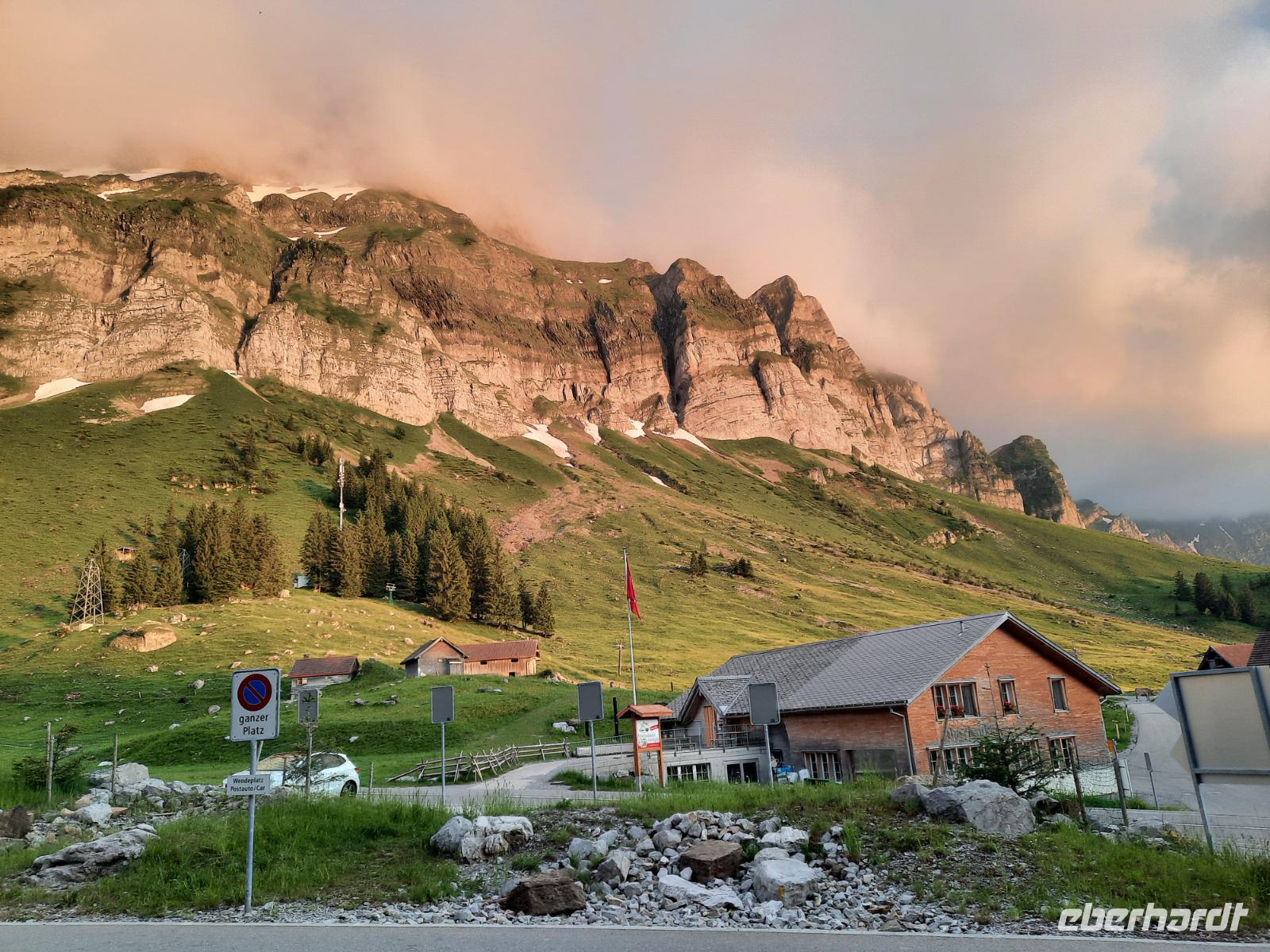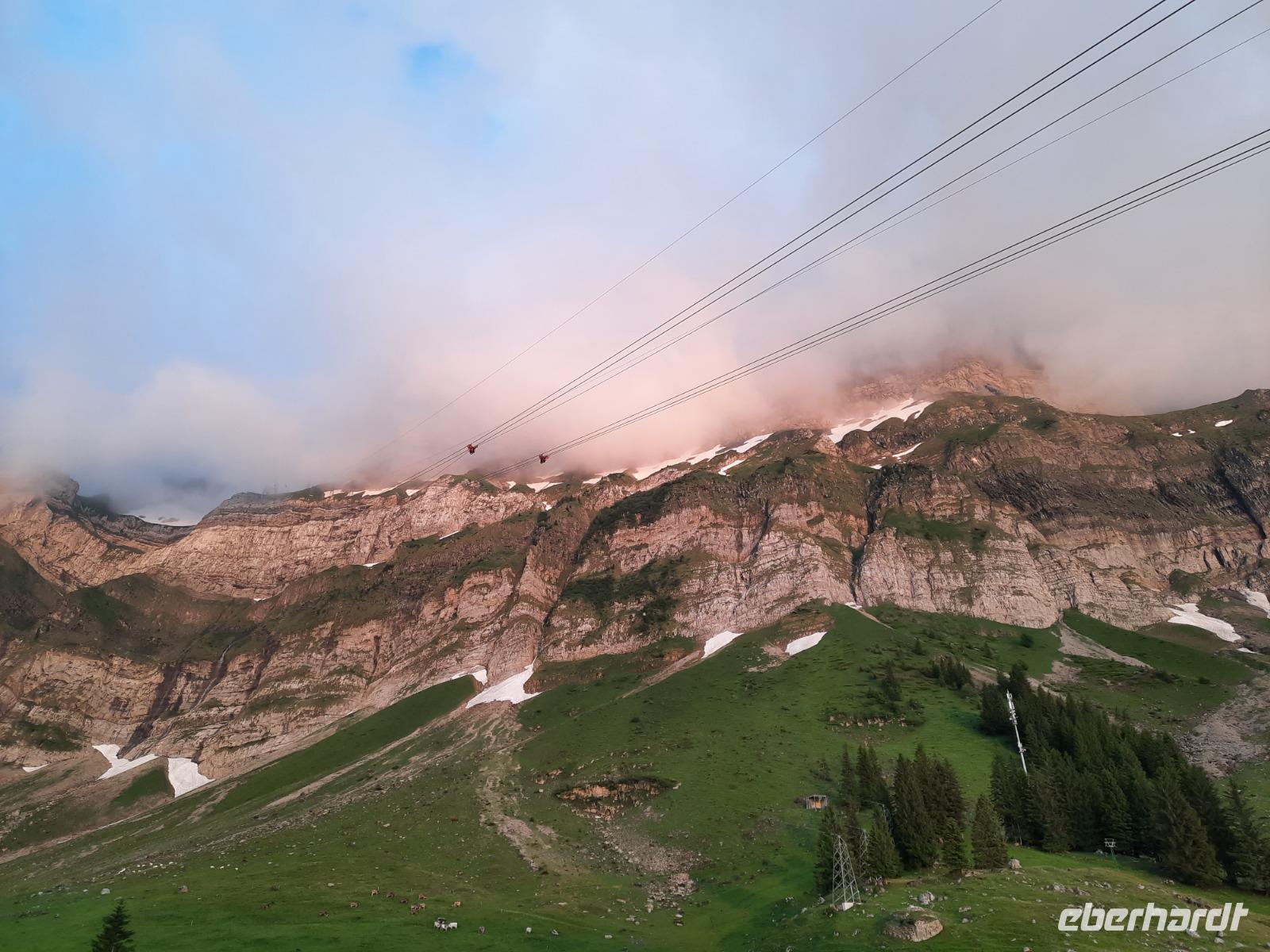 An diesem Morgen mussten wir dann leider auch schon wieder Abschied nehmen von dieser Region und ein letzter toller Blick auf das wolkenfreie Matterhorn läutete diesen Tag ein. Mit dem Pendelzug fuhren wir nach Täsch, denn dort, ca. 5 Kilometer nördlich von Zermatt, musste unser Bus parken, da Zermatt ein autofreier Ort ist. In Täsch angekommen, ging es dann schließlich mit dem Bus weiter. Der Gepäcktransport war übrigens bestens organisiert, niemand musste sich selbst darum kümmern. Unser Buschauffeur Steffen, das Hotel und letztendlich die Bahn organisierten, dass alle Koffer rechtzeitig im Bus waren. Nach einer etwa 2-stündigen Fahrt über Visp, Brig und das obere Rhonetal mit einem kurzen Aufenthalt an der Hängebrücke Fürgangen-Mühlebach erreichten wir den 2.165 Meter hohen Grimselpass. Auf der Passhöhe schauten sich die meisten von uns im Murmeltierpark um - wie niedlich! Mittlerweile war es Zeit für eine Mittagspause und ein Käsestand an der Grimselpass-Straße war ein willkommener Anlass für ein kleines Käse-Picknick zur Stärkung. Am Nachmittag erreichten wir dann schließlich Luzern mit der berühmten Kapellbrücke. So konnten wir immerhin behaupten, die zwei meistfotografierten Bildmotive der Schweiz wahrhaftig gesehen zu haben! Die Kapellbrücke wurde übrigens in der ersten Hälfte des 14. Jahrhunderts als Teil der Stadtbefestigung errichtet und hat ihren Namen von der benachbarten St.-Peters-Kapelle. Am Abend kamen wir an unserem letzten Übernachtungsort an - der etwa 1.300 Meter hoch gelegenen Schwägalp im Appenzeller Land. Dieser Ort war einfach himmlisch, nur die Glocken der Kühe waren zu hören und im modernen Berghotel Schwägalp konnten wir sämtliche Annehmlichkeiten und ein letztes schmackhaftes Abendessen genießen!