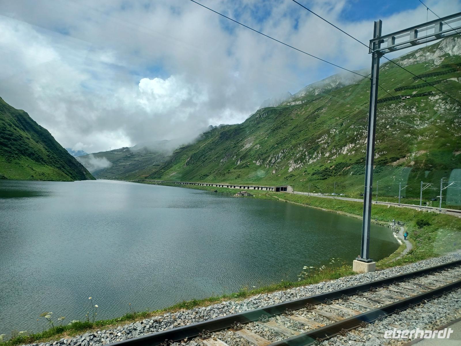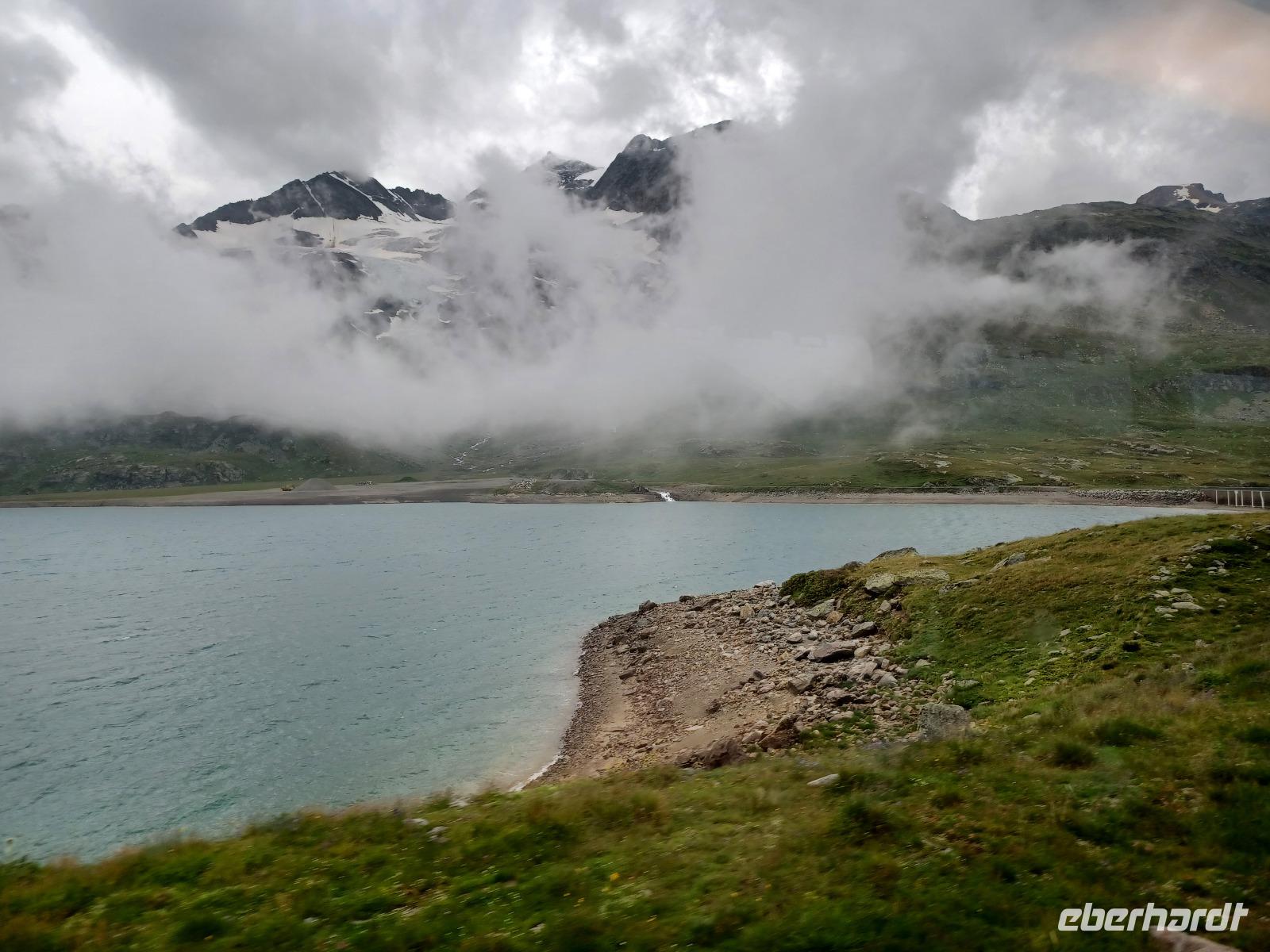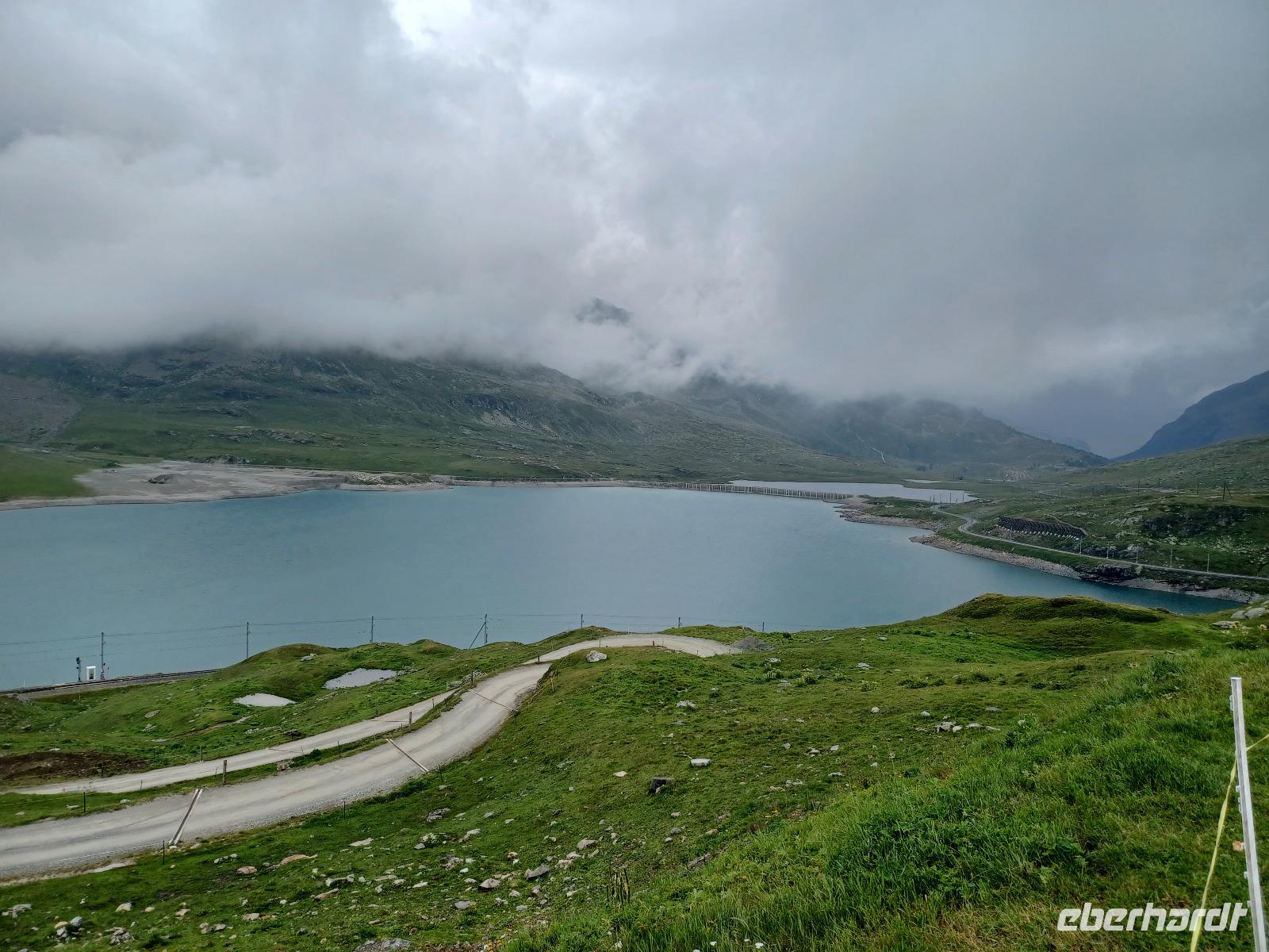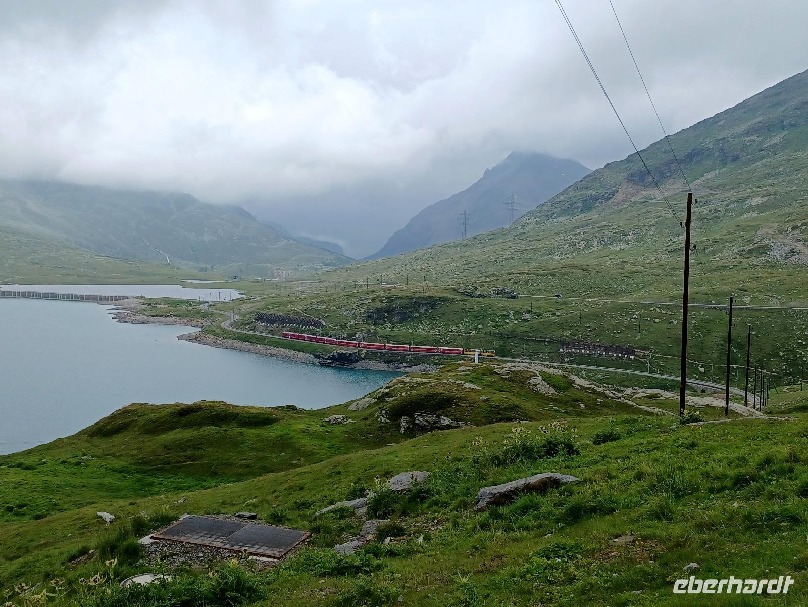 28.7.2021. Der Wetterbericht hat für den heutigen Tag etwas wechselhaftes Wetter vorhergesagt. Als wir uns das gute Frühstück schmecken lassen, nutzt die Sonne ihre Chance, zwischen einigen Wolken lässt sie sich hin und wieder blicken. Dann, gegen halb neun, geht es los. Gleich hinter Davos führt uns eine Gebirgsstraße hinauf zum Flüela - Pass. Wolken umwabern unsere Fahrt, auch als wir den Inn erreichen, es scheint als hätte die Sonne aufgegeben, schade. Doch frohen Mutes nehmen wir unsere Bahn. Nach dem Ort Pontresina steigt die Straße wieder rasch an. Bald kommt auf der rechten Seite die mächtige Eisfläche des Morteratsch - Gletschers ins Blickfeld, schnell einige Fotos, dann geht es weiter. Nun treten die Bäume zurück und machen Platz für eine alpine Flora. Am Bernina -Pass sind wir dann auf über Zweitausend Metern angelangt. Unter uns Seen, dahinter eine mächtige Bergkulisse - das ist Bergromantik pur! Doch unsere Fahrt muss weiter gehen; die Straße senkt sich ab und bald kommen wir von den alpinen Impressionen in das Mediterrane. Ein üppiges Grün empfängt uns im südlichen Teil von Graubünden; hier leben die italienischen Schweizer, auch die Ortsnamen klingen italienisch. In Campocologno endet zunächst die Fahrt mit dem Bus. Nach einer kleinen Stärkung erwarten wir den Bernina - Express. Leider haben sich nun auch die Wolken verdichtet; pünktlich kommt der Zug und wir können Platz nehmen, gerade zur rechten Zeit denn nun öffnet Petrus seine Schleusen. Interessant verläuft die Fahrt über das Kreisviadukt von Brusio und bald langen wir im Bahnhof von Poschiavo an. Die Pause dauert länger als geplant, was ist los?