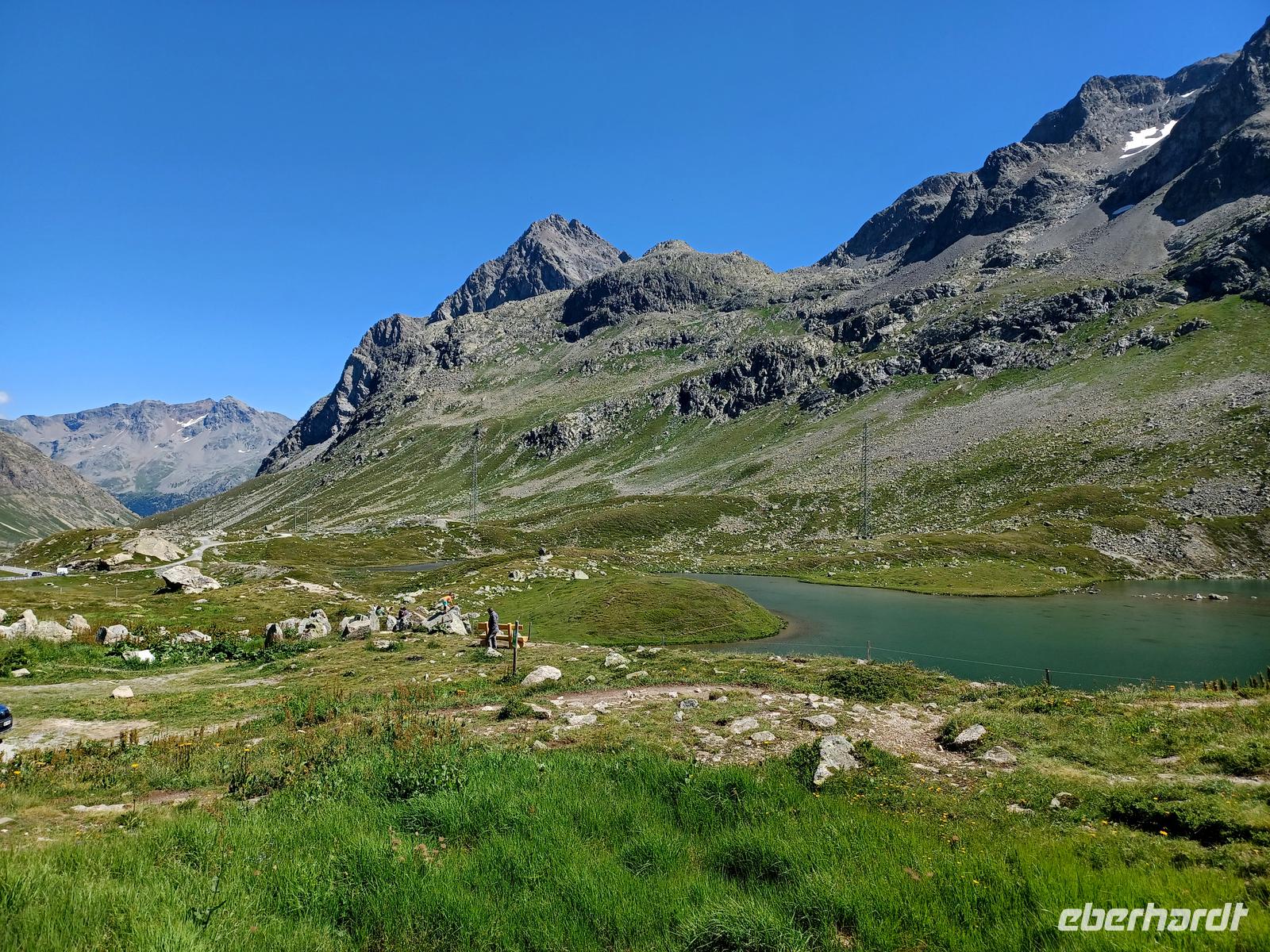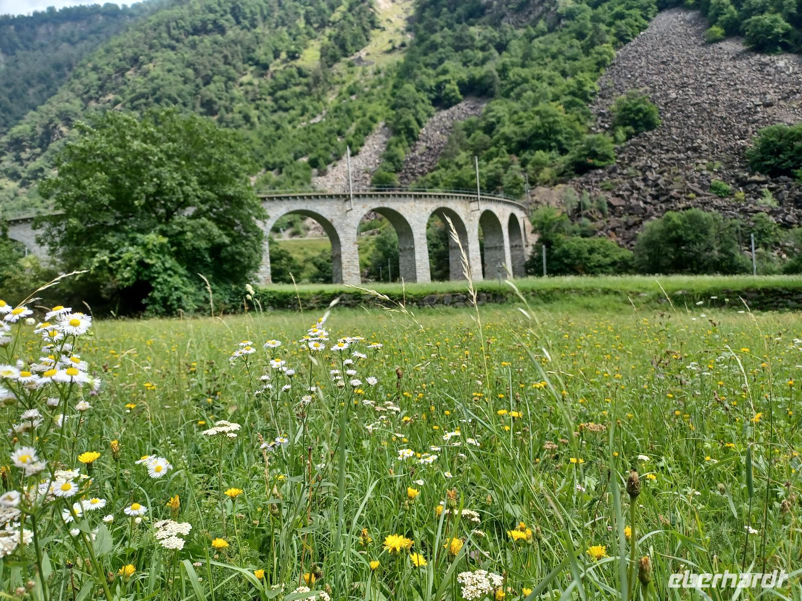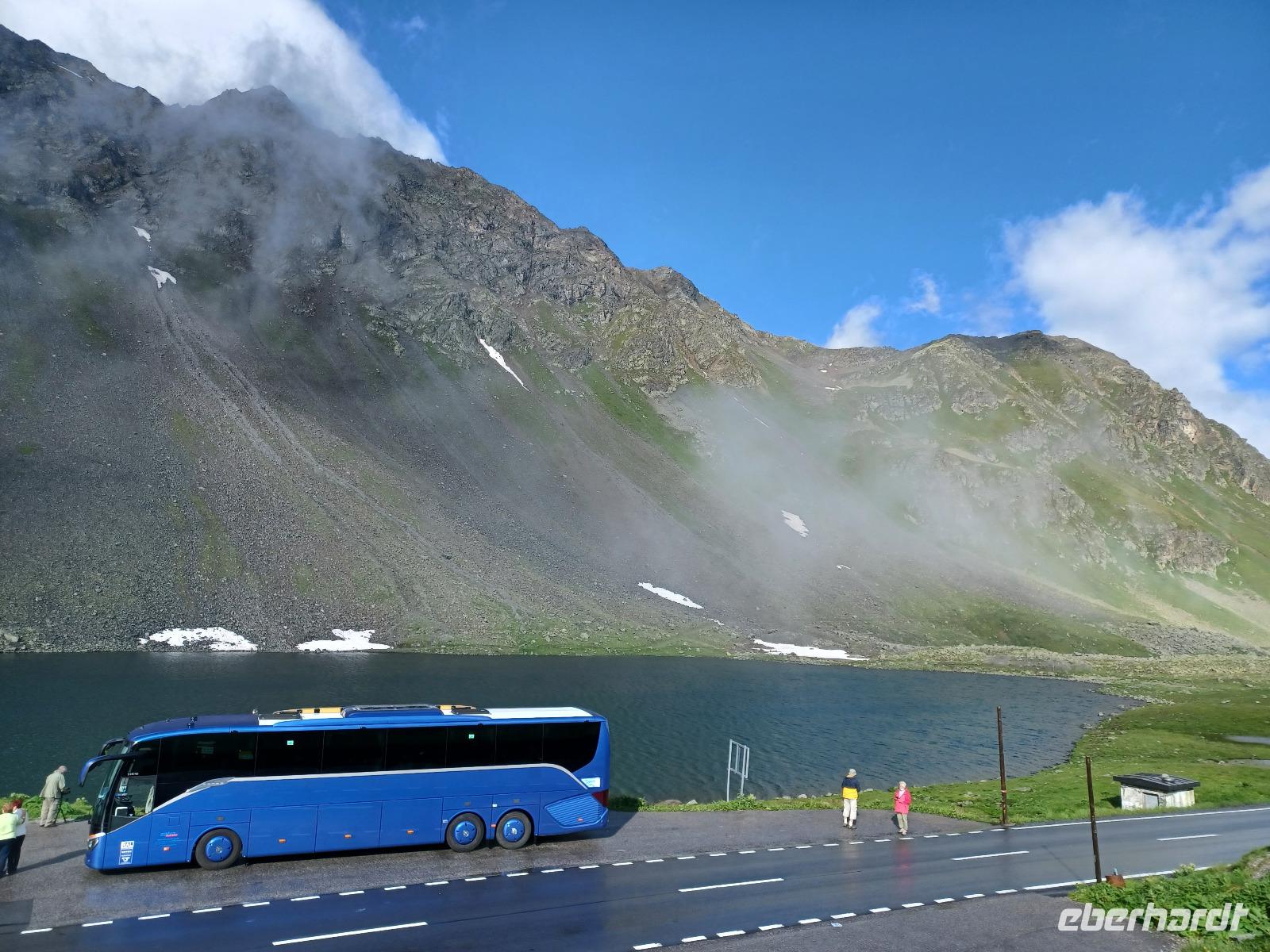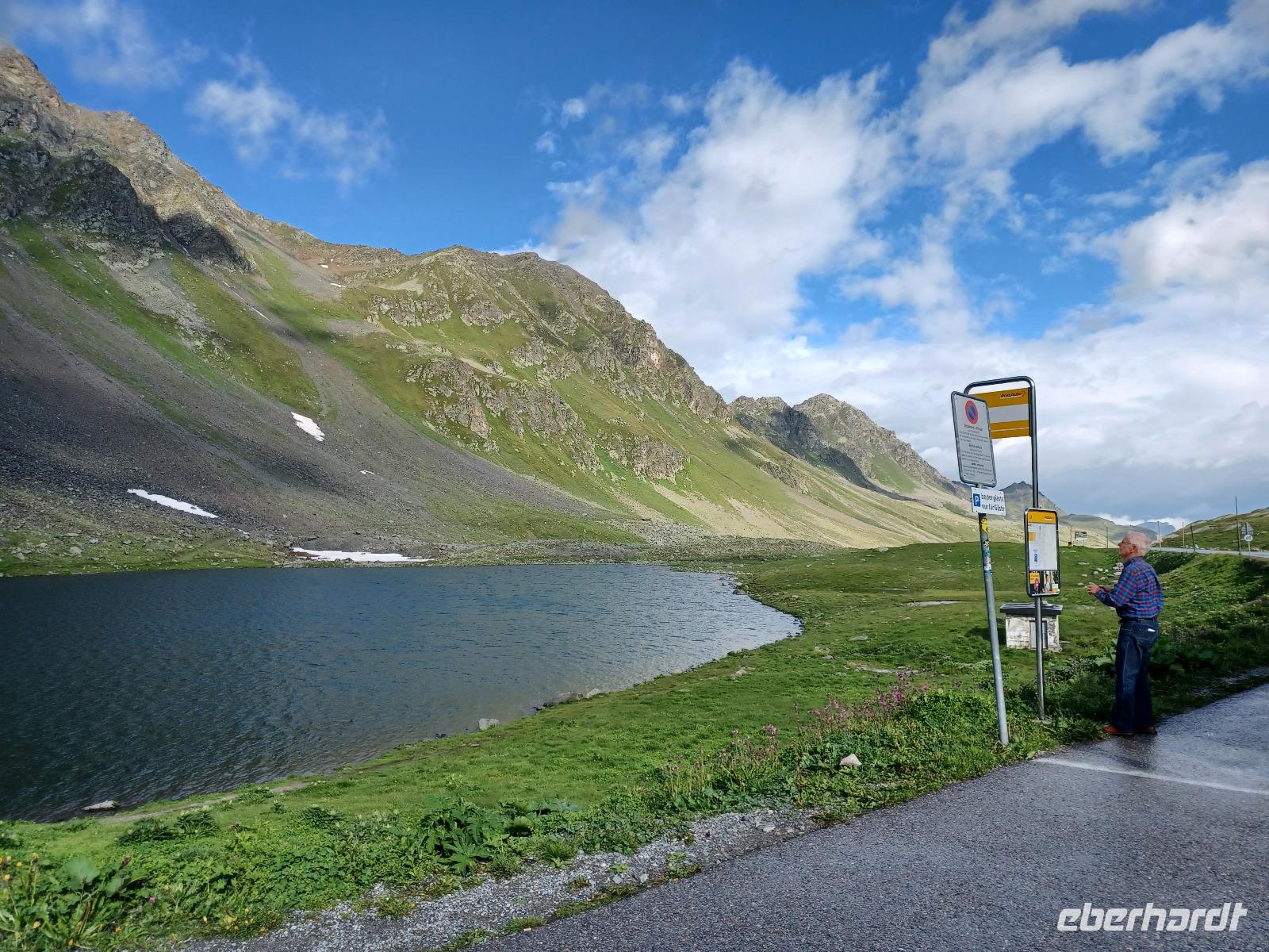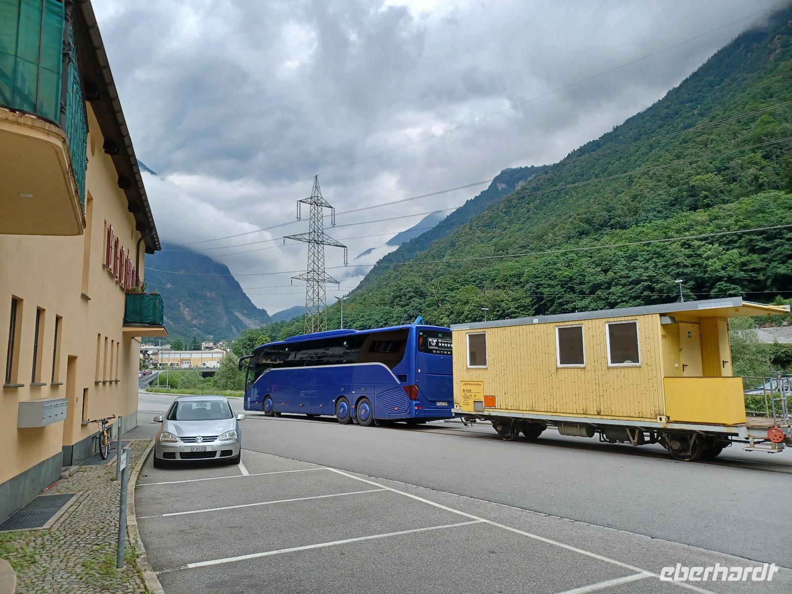 28.7.2021. Der Wetterbericht hat für den heutigen Tag etwas wechselhaftes Wetter vorhergesagt. Als wir uns das gute Frühstück schmecken lassen, nutzt die Sonne ihre Chance, zwischen einigen Wolken lässt sie sich hin und wieder blicken. Dann, gegen halb neun, geht es los. Gleich hinter Davos führt uns eine Gebirgsstraße hinauf zum Flüela - Pass. Wolken umwabern unsere Fahrt, auch als wir den Inn erreichen, es scheint als hätte die Sonne aufgegeben, schade. Doch frohen Mutes nehmen wir unsere Bahn. Nach dem Ort Pontresina steigt die Straße wieder rasch an. Bald kommt auf der rechten Seite die mächtige Eisfläche des Morteratsch - Gletschers ins Blickfeld, schnell einige Fotos, dann geht es weiter. Nun treten die Bäume zurück und machen Platz für eine alpine Flora. Am Bernina -Pass sind wir dann auf über Zweitausend Metern angelangt. Unter uns Seen, dahinter eine mächtige Bergkulisse - das ist Bergromantik pur! Doch unsere Fahrt muss weiter gehen; die Straße senkt sich ab und bald kommen wir von den alpinen Impressionen in das Mediterrane. Ein üppiges Grün empfängt uns im südlichen Teil von Graubünden; hier leben die italienischen Schweizer, auch die Ortsnamen klingen italienisch. In Campocologno endet zunächst die Fahrt mit dem Bus. Nach einer kleinen Stärkung erwarten wir den Bernina - Express. Leider haben sich nun auch die Wolken verdichtet; pünktlich kommt der Zug und wir können Platz nehmen, gerade zur rechten Zeit denn nun öffnet Petrus seine Schleusen. Interessant verläuft die Fahrt über das Kreisviadukt von Brusio und bald langen wir im Bahnhof von Poschiavo an. Die Pause dauert länger als geplant, was ist los?