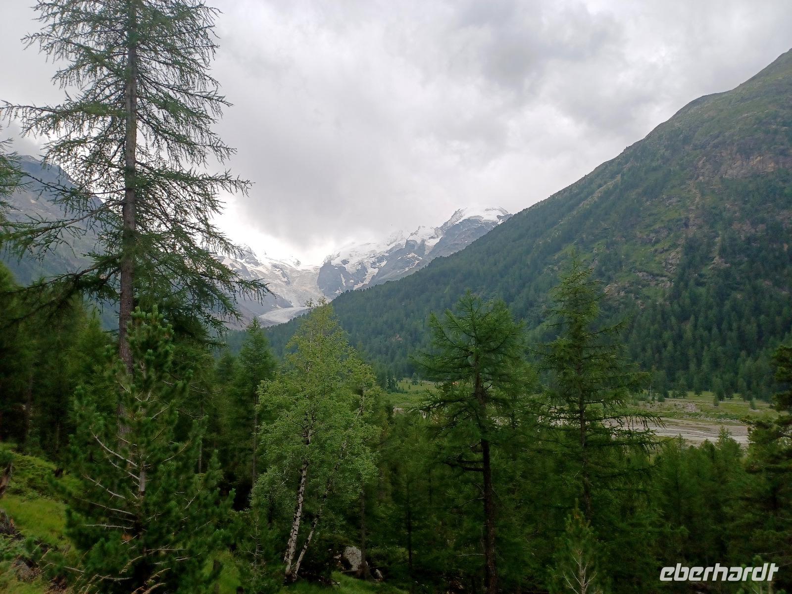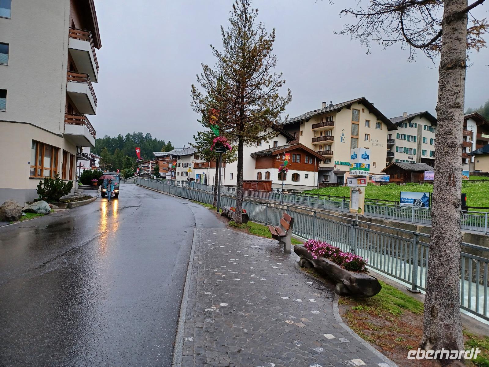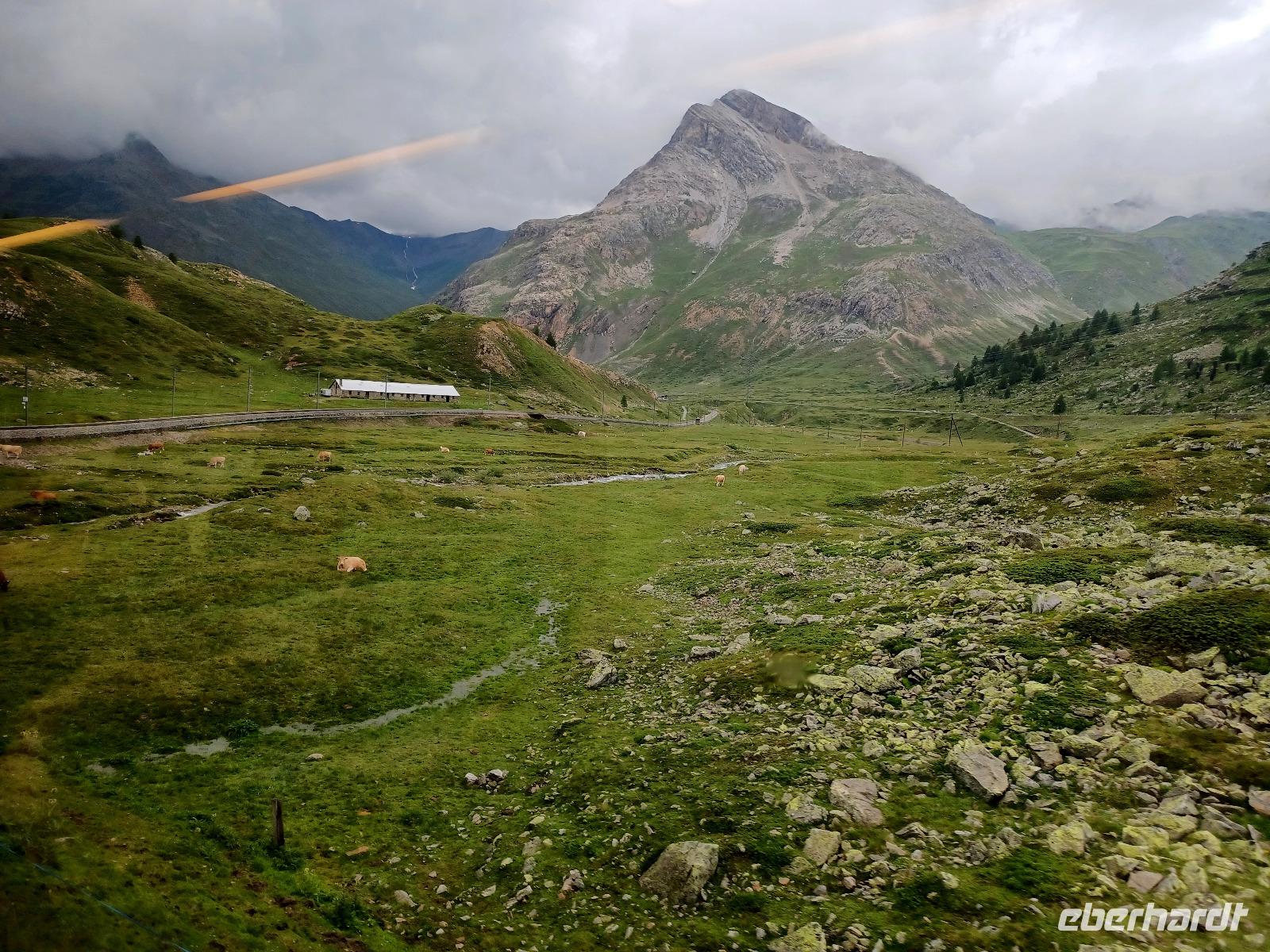 Der Zugbegleiter sucht mich auf und unterbreitet mir eine schlechte Nachricht: Es gibt ein technisches Problem, hier ist für uns zunächst Endstation. Da kann man nichts machen, aber schon eine gute halbe Stunde später können wir mit einem Ersatzzug unsere Fahrt fortsetzen. Leider hört der Regen nicht mehr auf, auch nicht am Bernina - Pass, auch nicht als wir den Morteratsch - Gletscher ein weiteres Mal sehen. Am Bahnhof von Pontresina wartet Jan schon mit dem Bus auf uns; trotz der Widrigkeiten sind wir uns, als wir unser Hotel in Davos erreichen, einig: Es war dennoch ein sehr erlebnisreicher Tag.