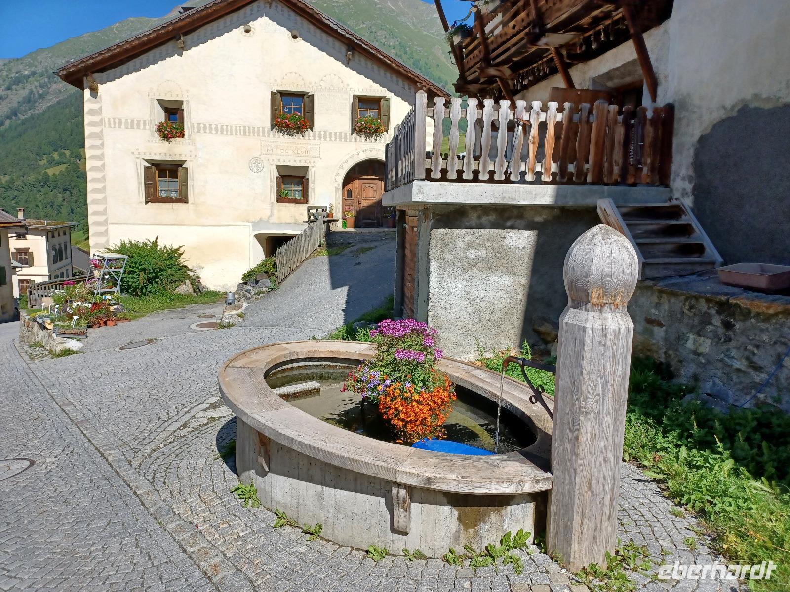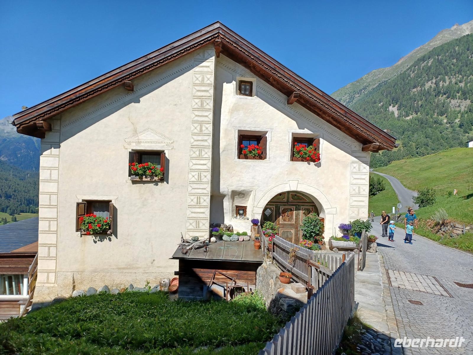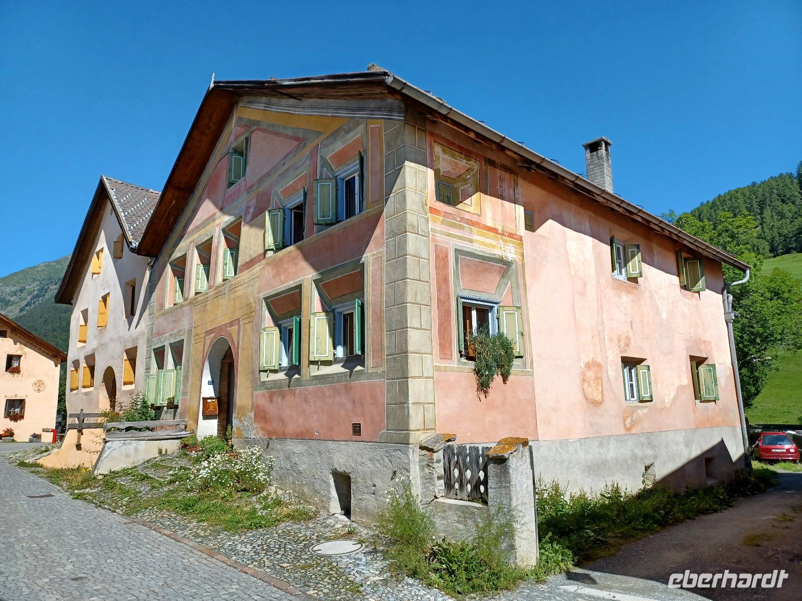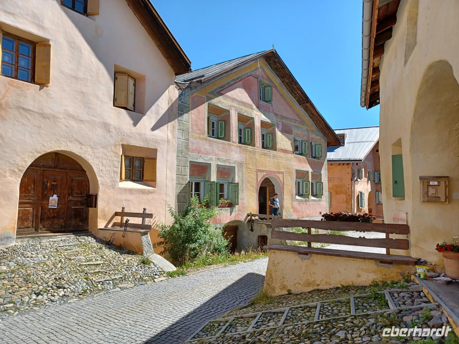 29.7.2021. Heute hat Petrus wieder gute Laune. Bevor die Sonne aufgeht wabert Nebel durchs Tal von Davos der aber bald blauem Himmel und Sonnenschein Platz machen muss. Voller Erwartung beginnen wir gegen neun die große Runde durch das Engadin. Schnell sind wir oben am Flüela - Pass; Schäfchenwolken dekorieren das Himmelblau mit weißen Tupfern die sich im kleinen Gebirgssee widerspiegeln. Dann sind wir wieder im Inntal angelangt; die hier lebenden Rätoromanen nennen diesen Teil das Engadin. Unser erstes Ziel am heutigen Tag heißt Guarda, es ist wohl der typischste Ort im Tal. Malerische alte Häuser, geschmückt mit schönem Kratzputz und verziert mit bunten Malereien, gibt es hier zu entdecken. Es ist eine Reise zurück in der Zeit.