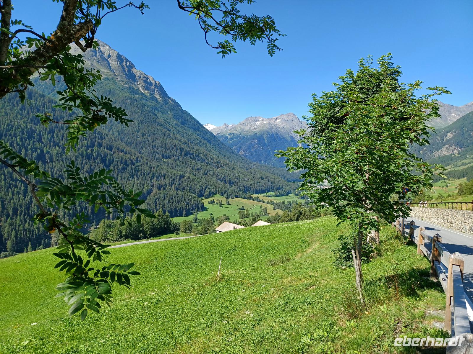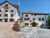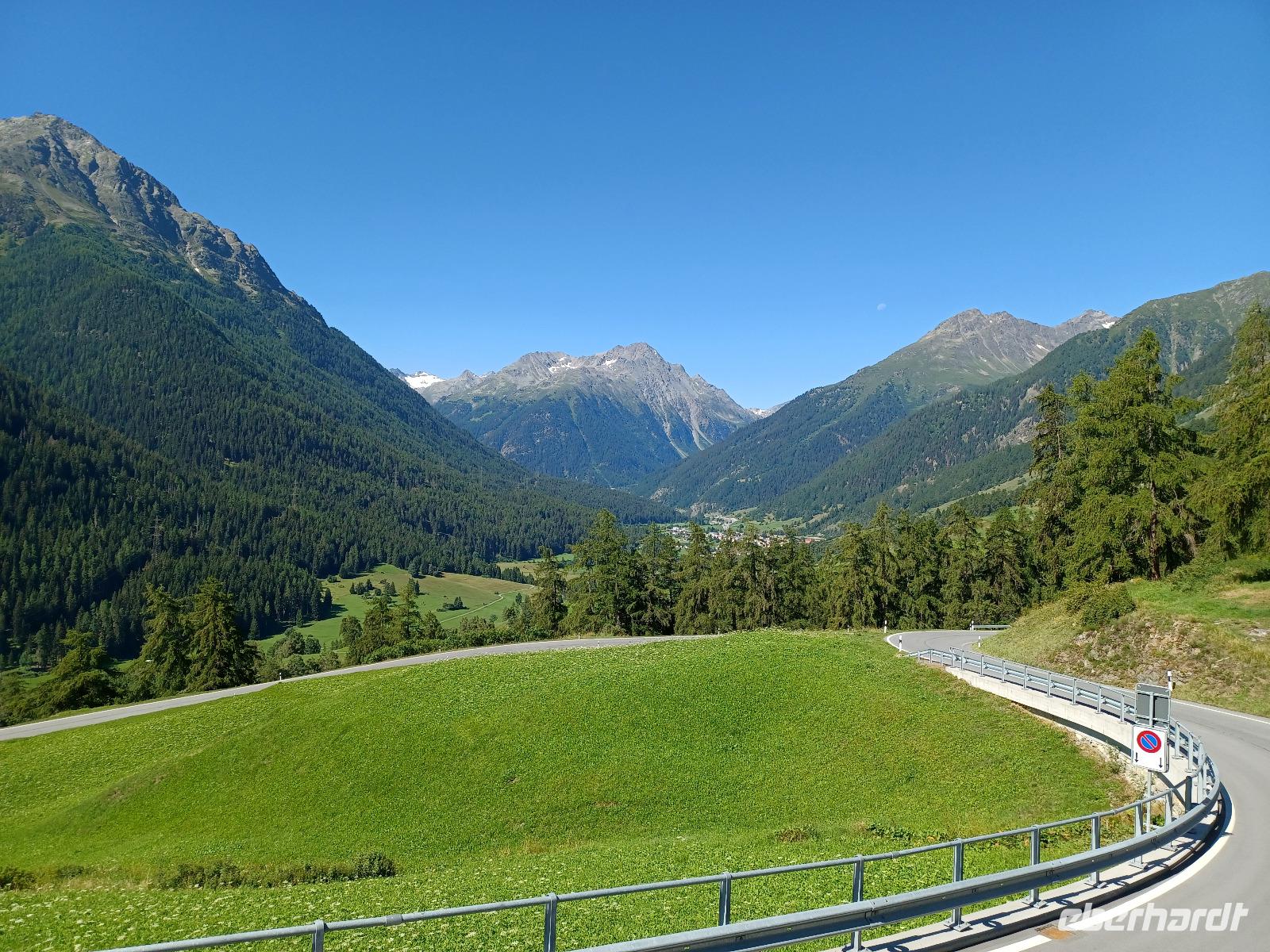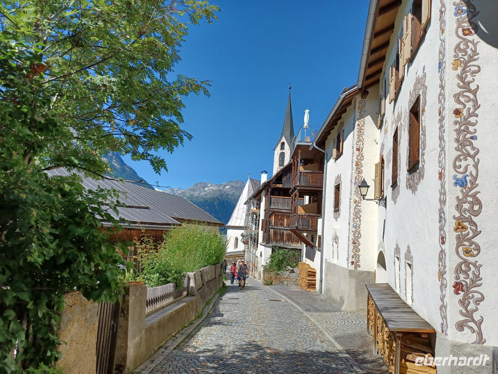 29.7.2021. Heute hat Petrus wieder gute Laune. Bevor die Sonne aufgeht wabert Nebel durchs Tal von Davos der aber bald blauem Himmel und Sonnenschein Platz machen muss. Voller Erwartung beginnen wir gegen neun die große Runde durch das Engadin. Schnell sind wir oben am Flüela - Pass; Schäfchenwolken dekorieren das Himmelblau mit weißen Tupfern die sich im kleinen Gebirgssee widerspiegeln. Dann sind wir wieder im Inntal angelangt; die hier lebenden Rätoromanen nennen diesen Teil das Engadin. Unser erstes Ziel am heutigen Tag heißt Guarda, es ist wohl der typischste Ort im Tal. Malerische alte Häuser, geschmückt mit schönem Kratzputz und verziert mit bunten Malereien, gibt es hier zu entdecken. Es ist eine Reise zurück in der Zeit.