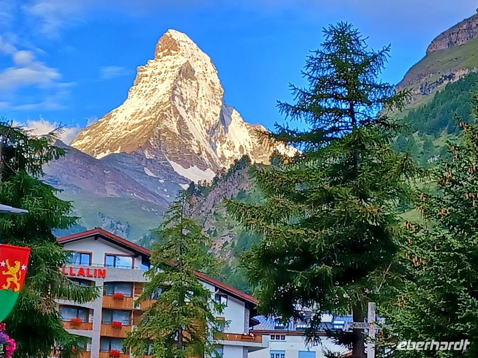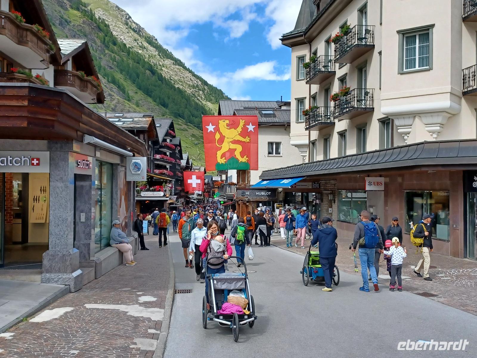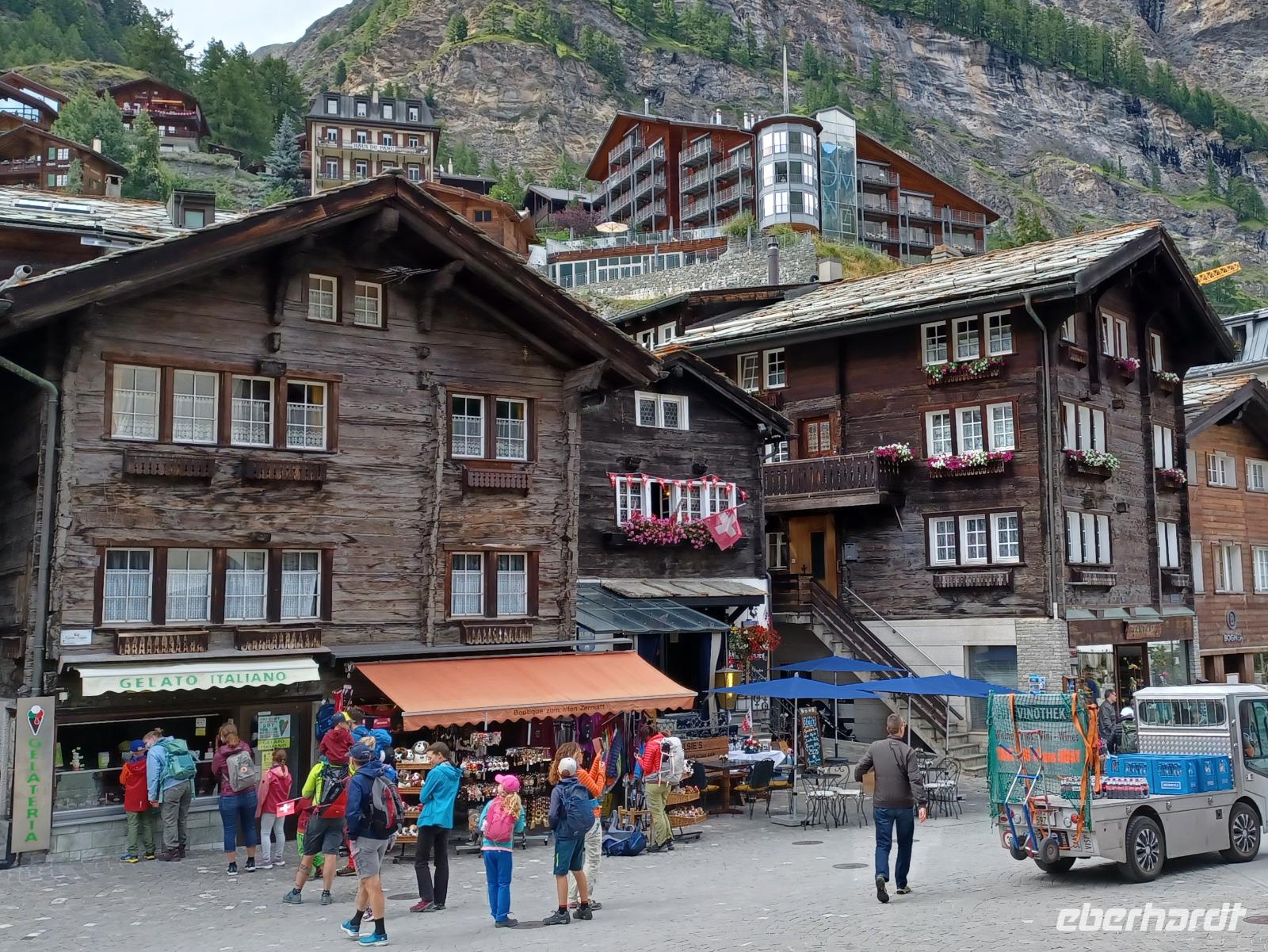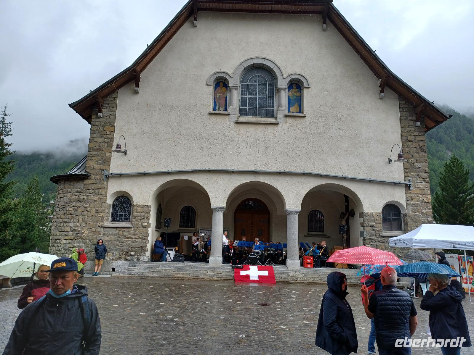 1.8.2021. Leider hat es die ganze Nacht geregnet; als wir beim Frühstück sitzen ist von der gigantischen Bergwelt die uns umgibt nichts zu sehen, auch das Matterhorn hat sich hinter dicken Wolken versteckt. Den geplanten Ausflug zum Gornergrat müssen wir daher auf morgen verschieben, schade. Aber das ist wiederum auch nicht ganz so schlimm; die Schweizer feiern heute ihren Nationalfeiertag und da ist überall etwas los; an vielen Stellen von Zermatt gibt es Veranstaltungen, Böller werden gezündet und am Abend ist ein zentrales Feuerwerk geplant. Doch zunächst ist an diesem Vormittag warme Bekleidung erforderlich; die Temperatur liegt im einstelligen Bereich und der Regenschirm wird unser ständiger Begleiter. Bis zur Bahnhofstraße, der Flaniermeile des Gebirgsortes, ist es vom Hotel nicht weit und von hier bis zum Kirchplatz nur ein Katzensprung. Auf diesem zentralen Platz gibt es an diesem Vormittag schon lustige Blasmusik, an einer anderen Stelle sind Alphörner zu hören und am Mittag hält der Pfarrer des Ortes eine Freiluftandacht. Deshalb vergeht der Tag auch rasch; manchmal lugt kurz die Sonne hervor, wenig später tröpfelt es wieder.