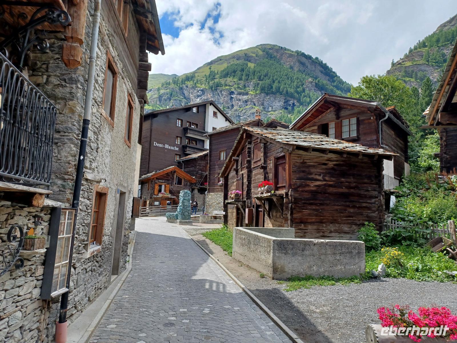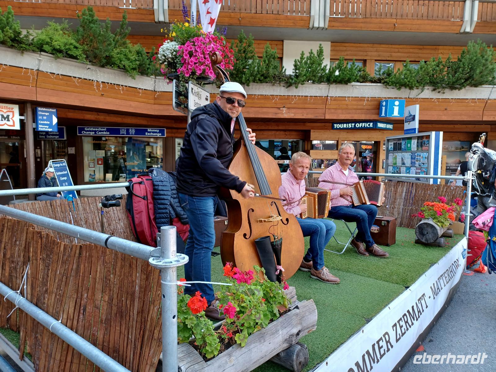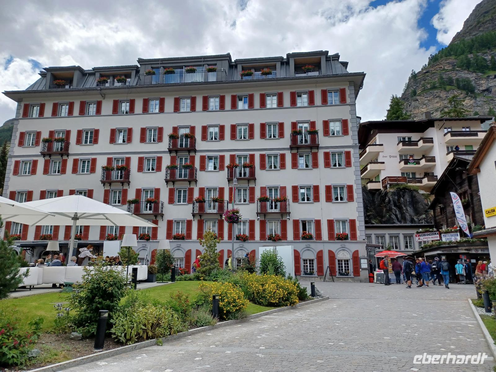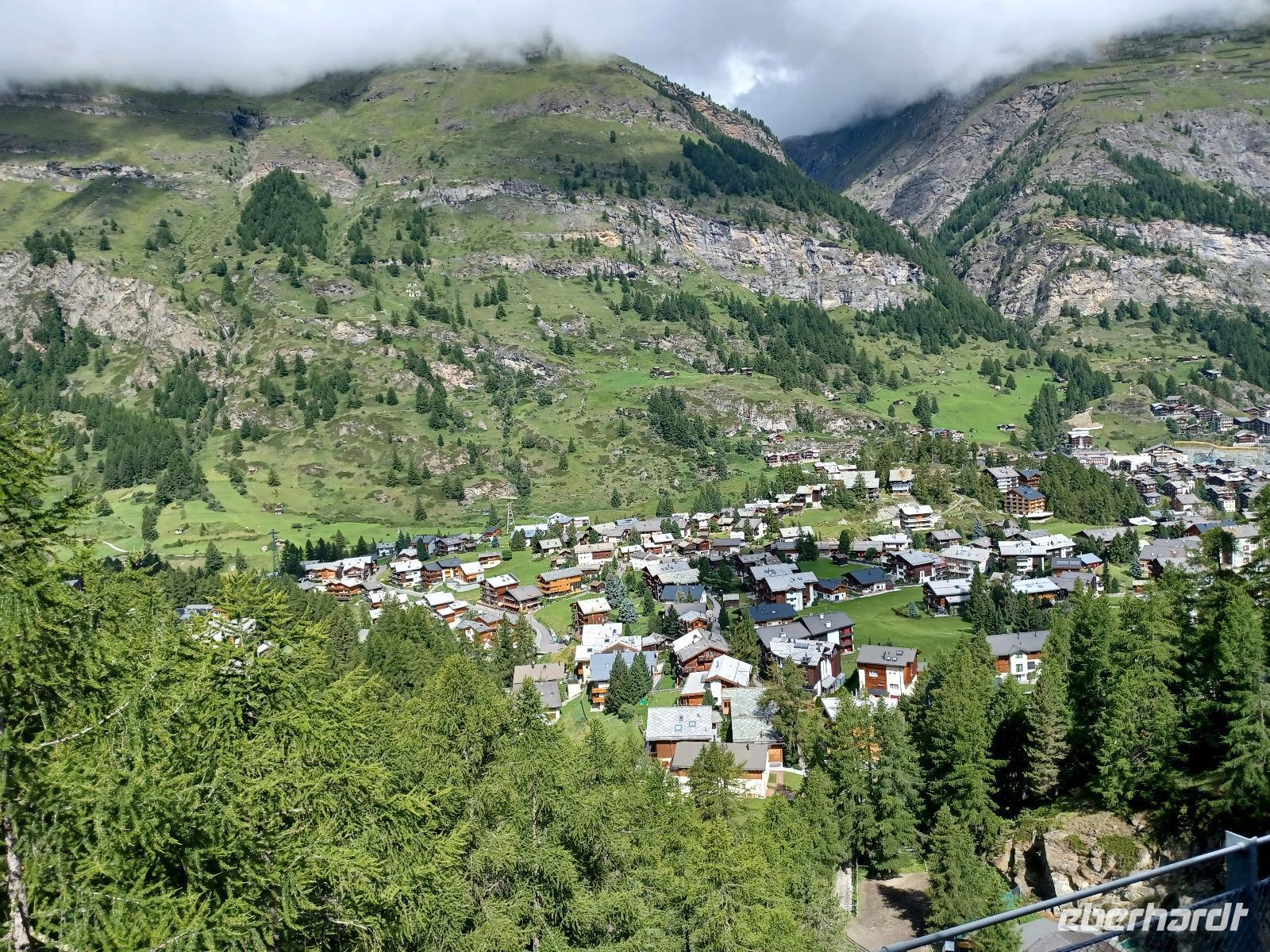 1.8.2021. Leider hat es die ganze Nacht geregnet; als wir beim Frühstück sitzen ist von der gigantischen Bergwelt die uns umgibt nichts zu sehen, auch das Matterhorn hat sich hinter dicken Wolken versteckt. Den geplanten Ausflug zum Gornergrat müssen wir daher auf morgen verschieben, schade. Aber das ist wiederum auch nicht ganz so schlimm; die Schweizer feiern heute ihren Nationalfeiertag und da ist überall etwas los; an vielen Stellen von Zermatt gibt es Veranstaltungen, Böller werden gezündet und am Abend ist ein zentrales Feuerwerk geplant. Doch zunächst ist an diesem Vormittag warme Bekleidung erforderlich; die Temperatur liegt im einstelligen Bereich und der Regenschirm wird unser ständiger Begleiter. Bis zur Bahnhofstraße, der Flaniermeile des Gebirgsortes, ist es vom Hotel nicht weit und von hier bis zum Kirchplatz nur ein Katzensprung. Auf diesem zentralen Platz gibt es an diesem Vormittag schon lustige Blasmusik, an einer anderen Stelle sind Alphörner zu hören und am Mittag hält der Pfarrer des Ortes eine Freiluftandacht. Deshalb vergeht der Tag auch rasch; manchmal lugt kurz die Sonne hervor, wenig später tröpfelt es wieder.