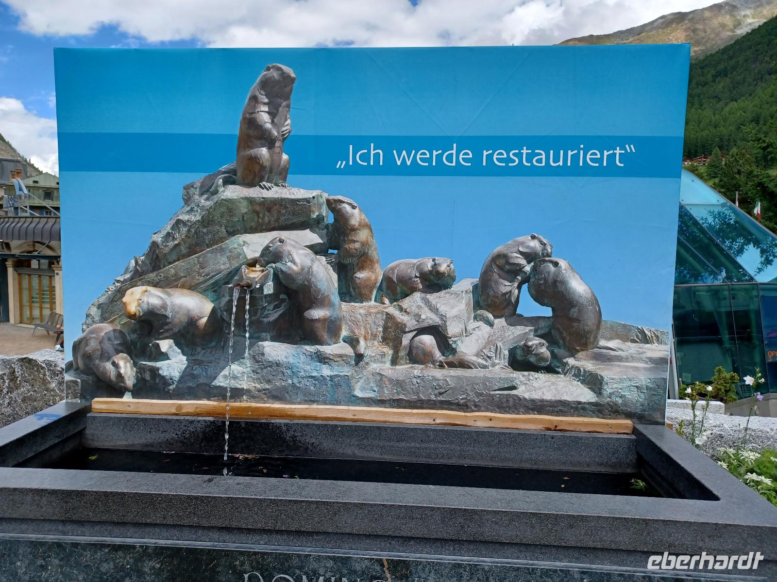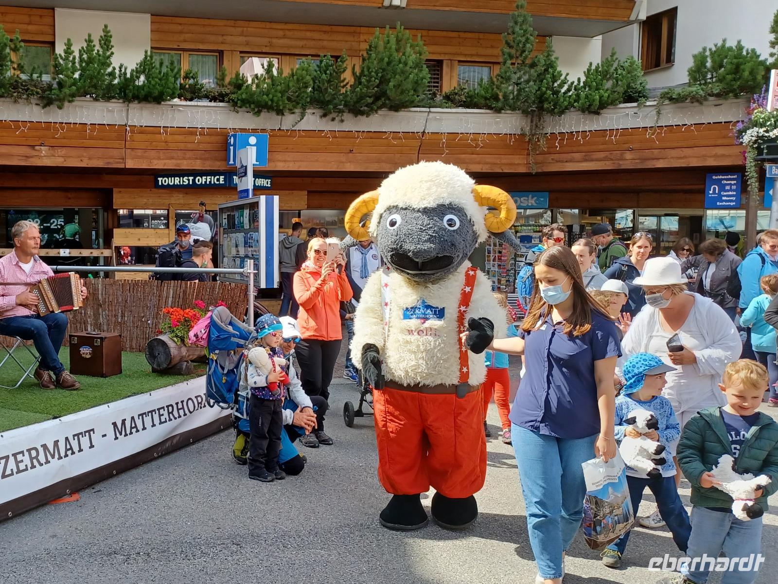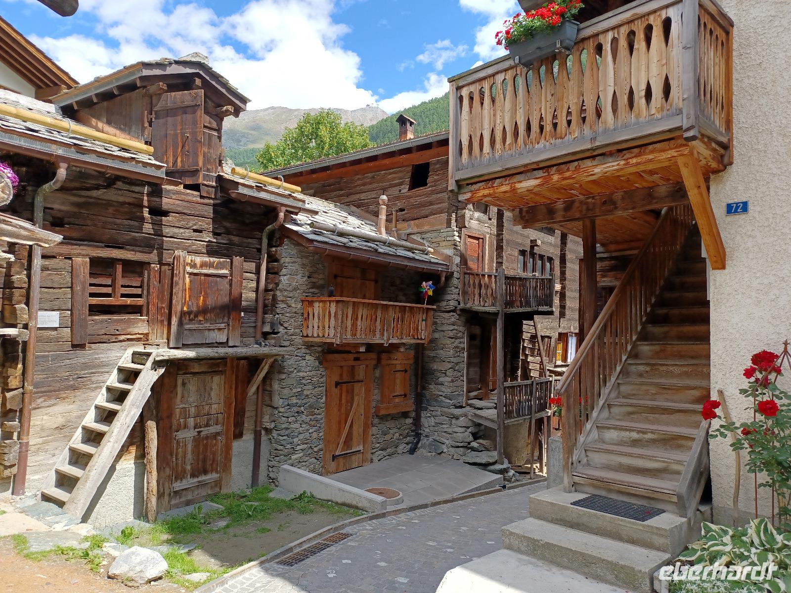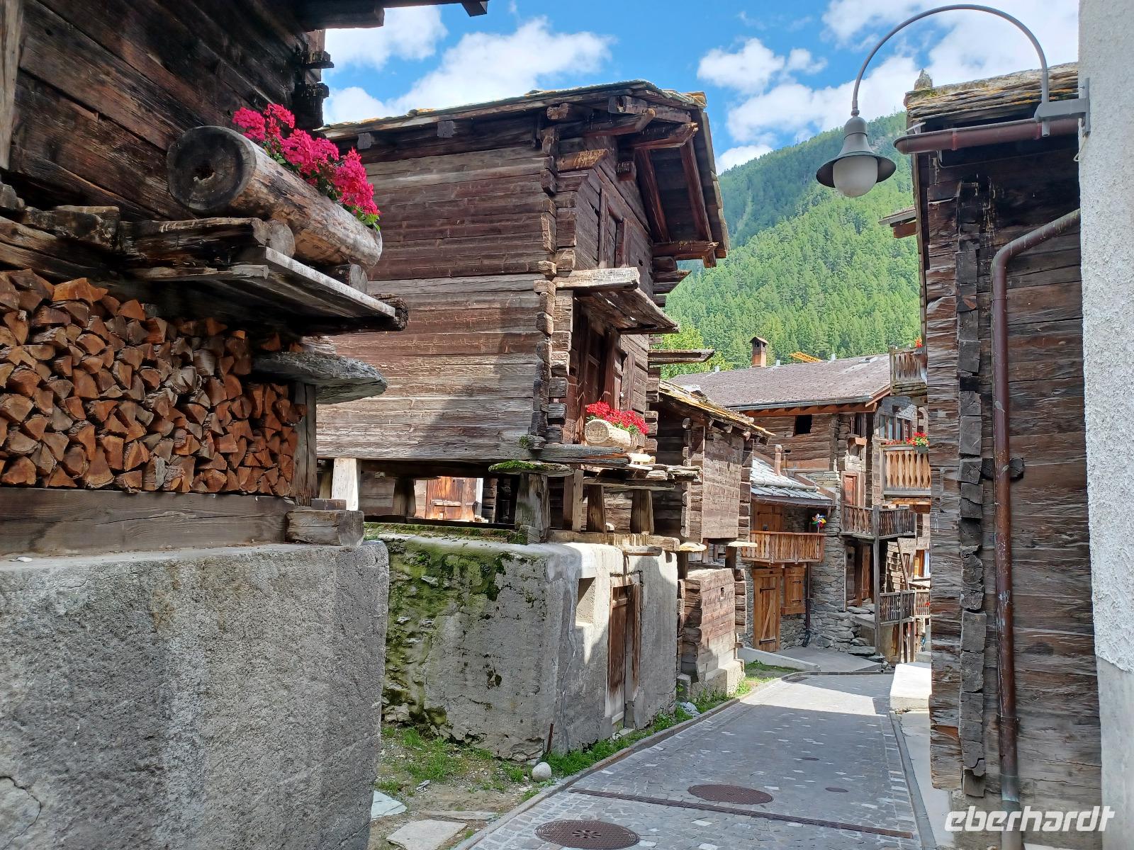 1.8.2021. Leider hat es die ganze Nacht geregnet; als wir beim Frühstück sitzen ist von der gigantischen Bergwelt die uns umgibt nichts zu sehen, auch das Matterhorn hat sich hinter dicken Wolken versteckt. Den geplanten Ausflug zum Gornergrat müssen wir daher auf morgen verschieben, schade. Aber das ist wiederum auch nicht ganz so schlimm; die Schweizer feiern heute ihren Nationalfeiertag und da ist überall etwas los; an vielen Stellen von Zermatt gibt es Veranstaltungen, Böller werden gezündet und am Abend ist ein zentrales Feuerwerk geplant. Doch zunächst ist an diesem Vormittag warme Bekleidung erforderlich; die Temperatur liegt im einstelligen Bereich und der Regenschirm wird unser ständiger Begleiter. Bis zur Bahnhofstraße, der Flaniermeile des Gebirgsortes, ist es vom Hotel nicht weit und von hier bis zum Kirchplatz nur ein Katzensprung. Auf diesem zentralen Platz gibt es an diesem Vormittag schon lustige Blasmusik, an einer anderen Stelle sind Alphörner zu hören und am Mittag hält der Pfarrer des Ortes eine Freiluftandacht. Deshalb vergeht der Tag auch rasch; manchmal lugt kurz die Sonne hervor, wenig später tröpfelt es wieder.