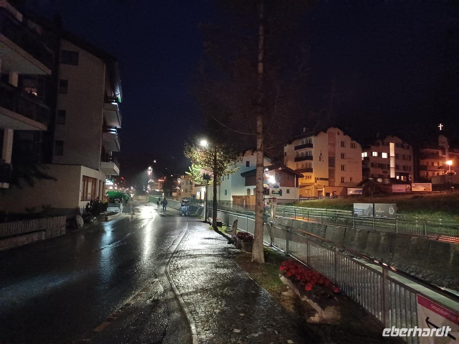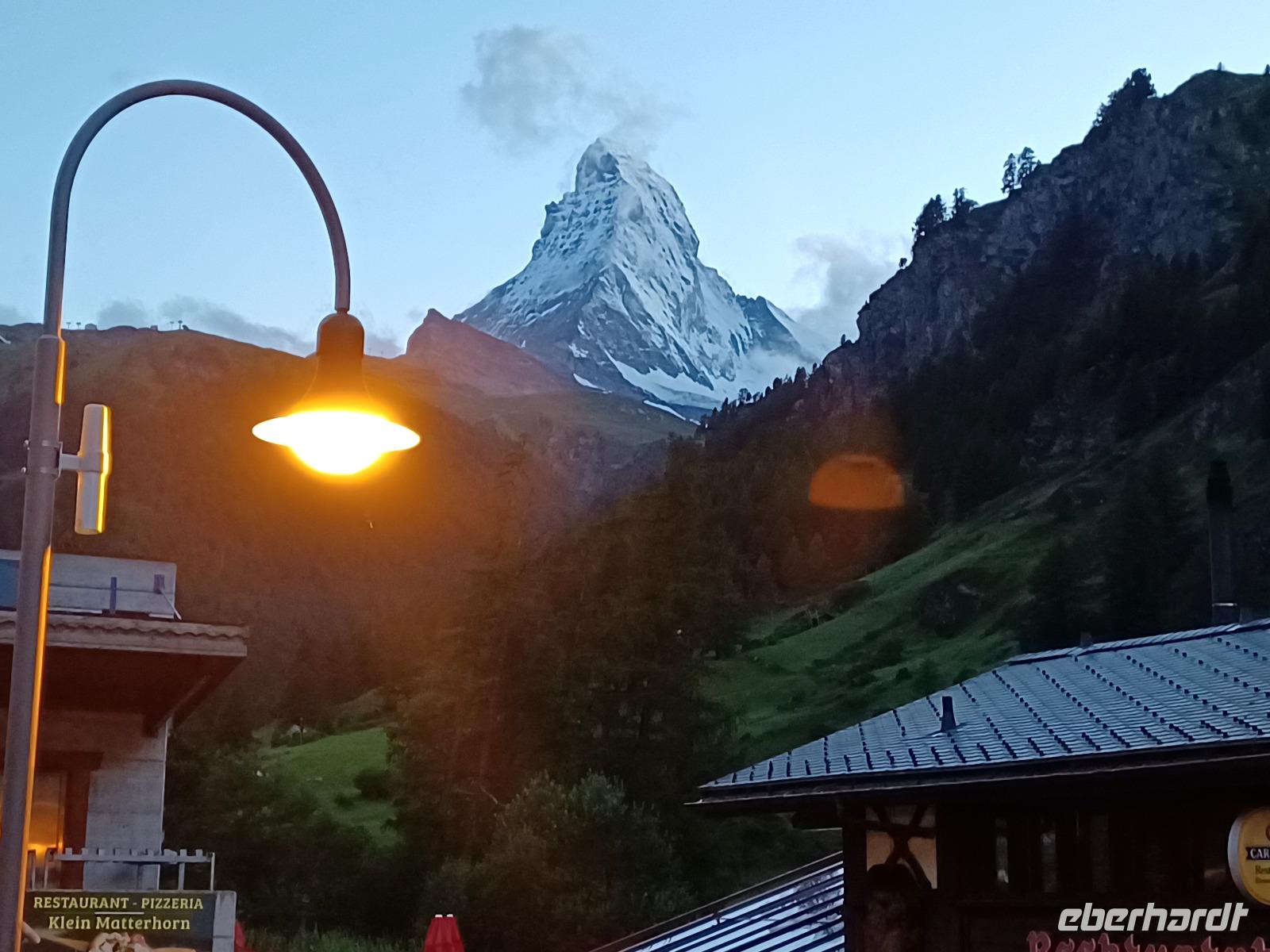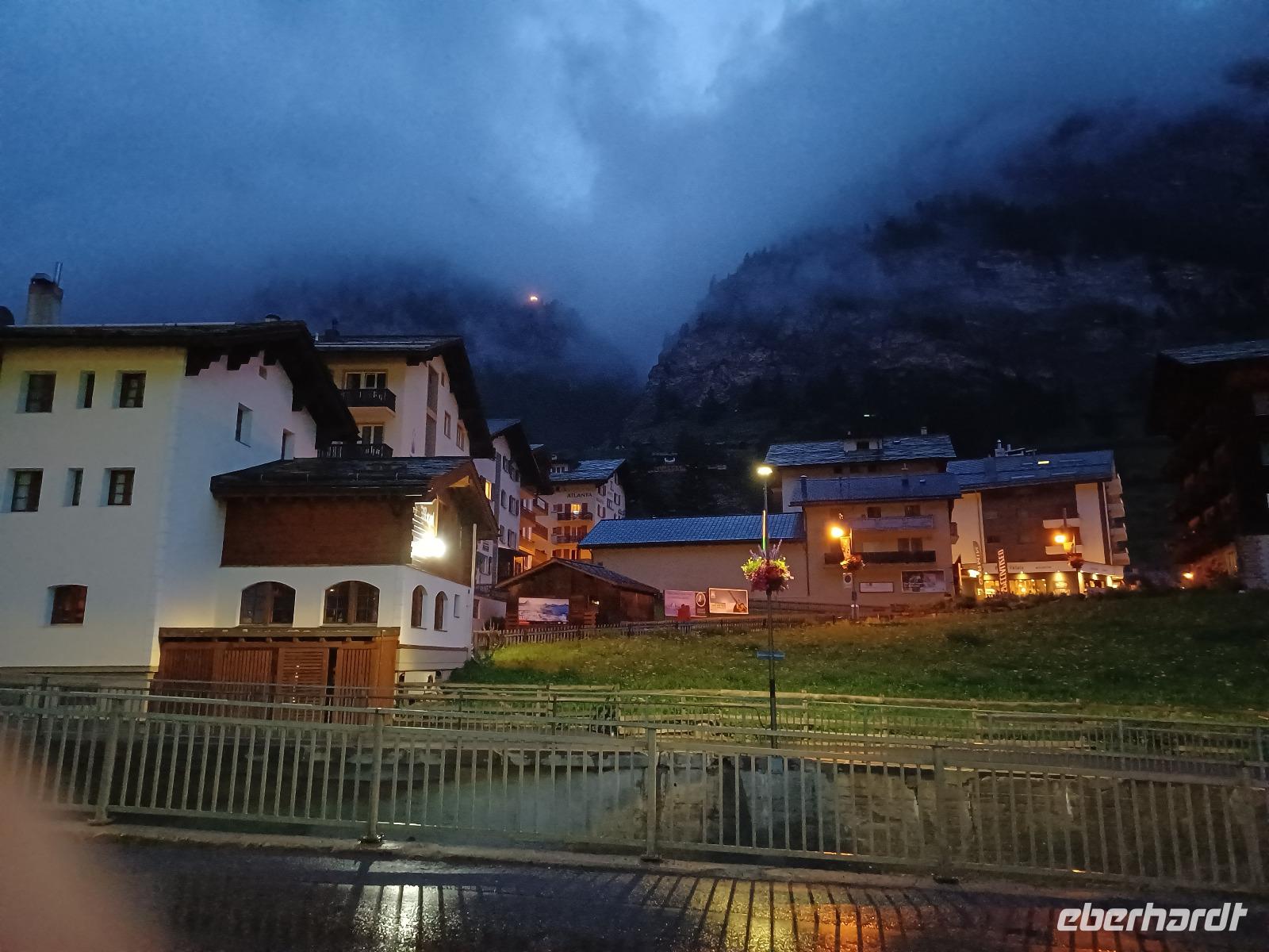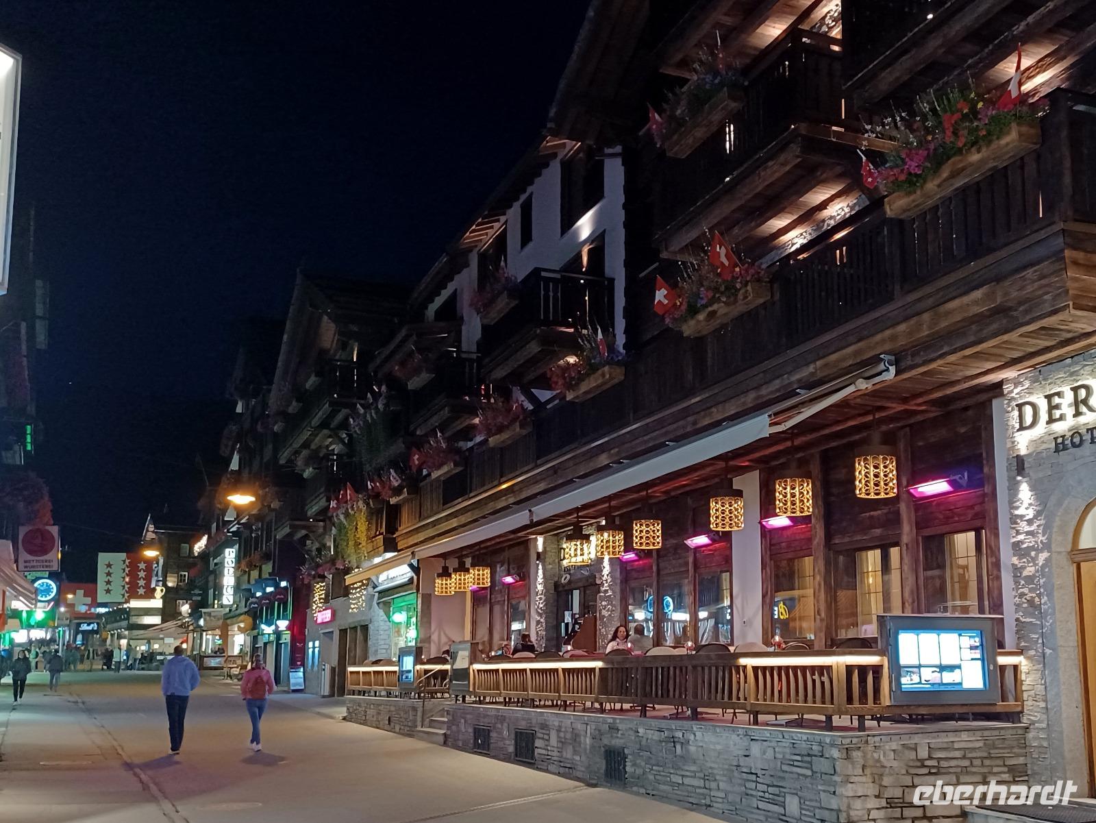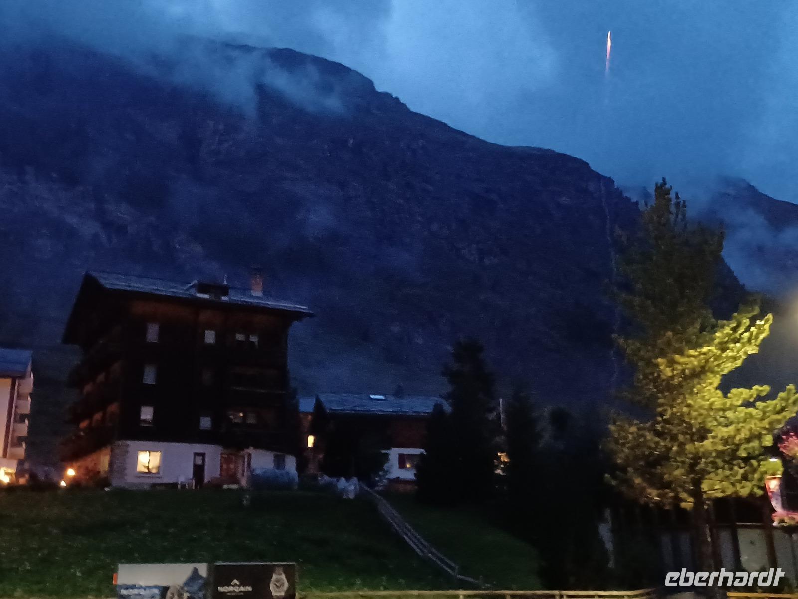 Solcherart geht die Zeit dahin und zum Einbruch der Nacht haben sich die Menschen auf den Straßen versammelt und erwarten das große Feuerwerk. Etwas später als geplant, aber dann mit voller Pracht, geht es los. Zunächst erglühen die Bergwände im bengalischen Feuer, dann zünden die Zermatter ein Feuerwerk das keine Wünsche offenlässt. Bunt schillernd schießen die Raketen in den Nachthimmel, Garben von Leuchtkugeln zerplatzen und der Donner der Explosionen hallt von den Bergwänden wider die den Ort umgeben. Einfach großartig!