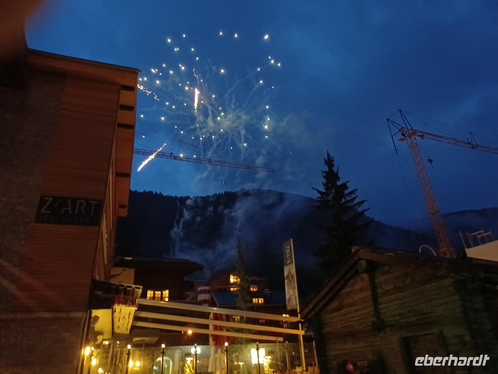 Noch lange nach dem großen Feuerwerk zünden weitere Raketen, erst nach Mitternacht legt sich langsam Ruhe über Zermatt.