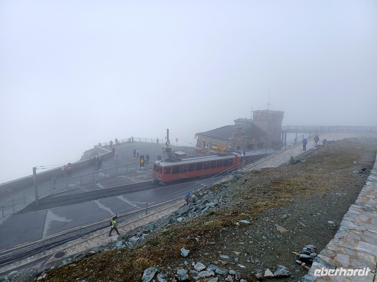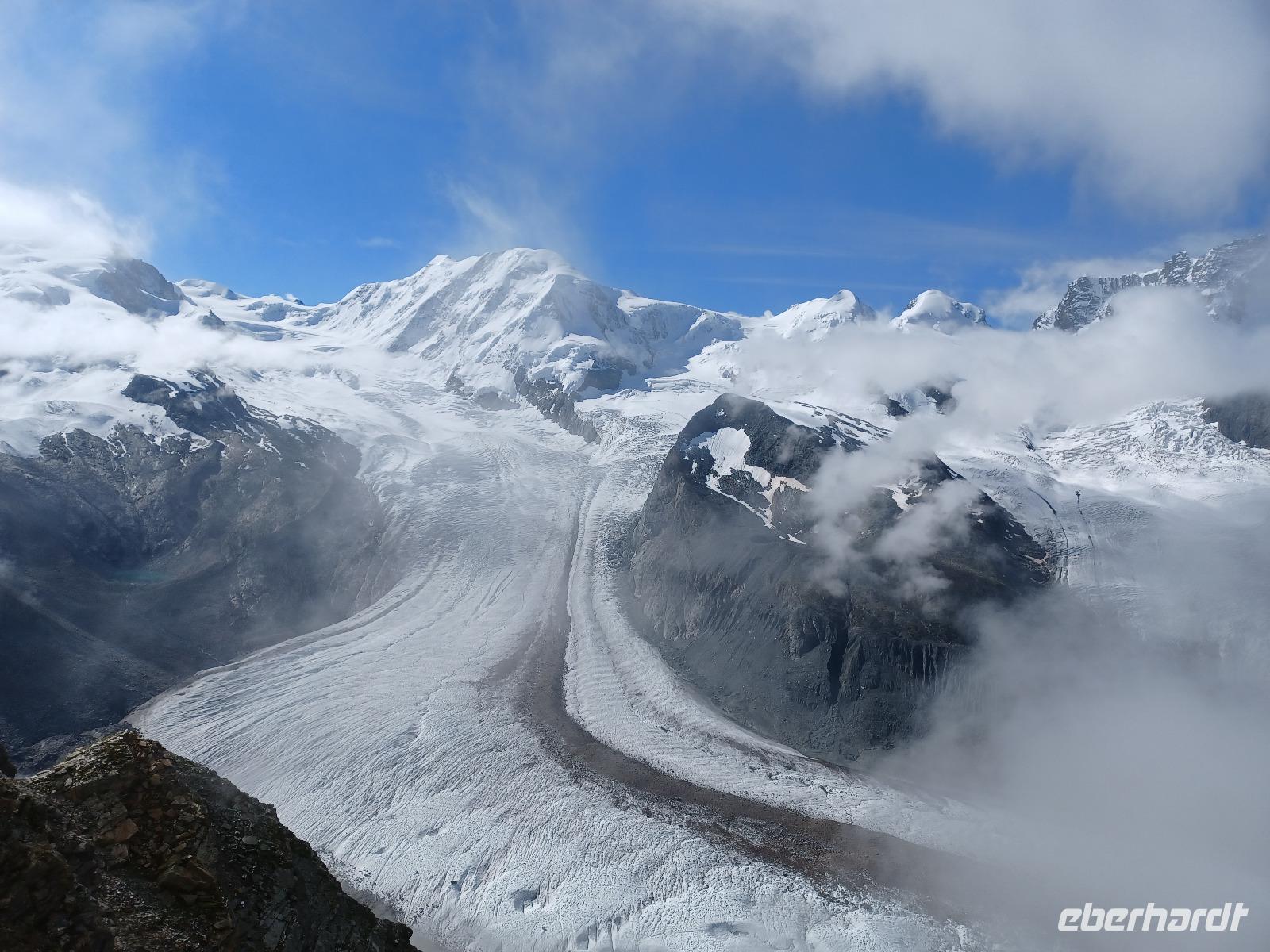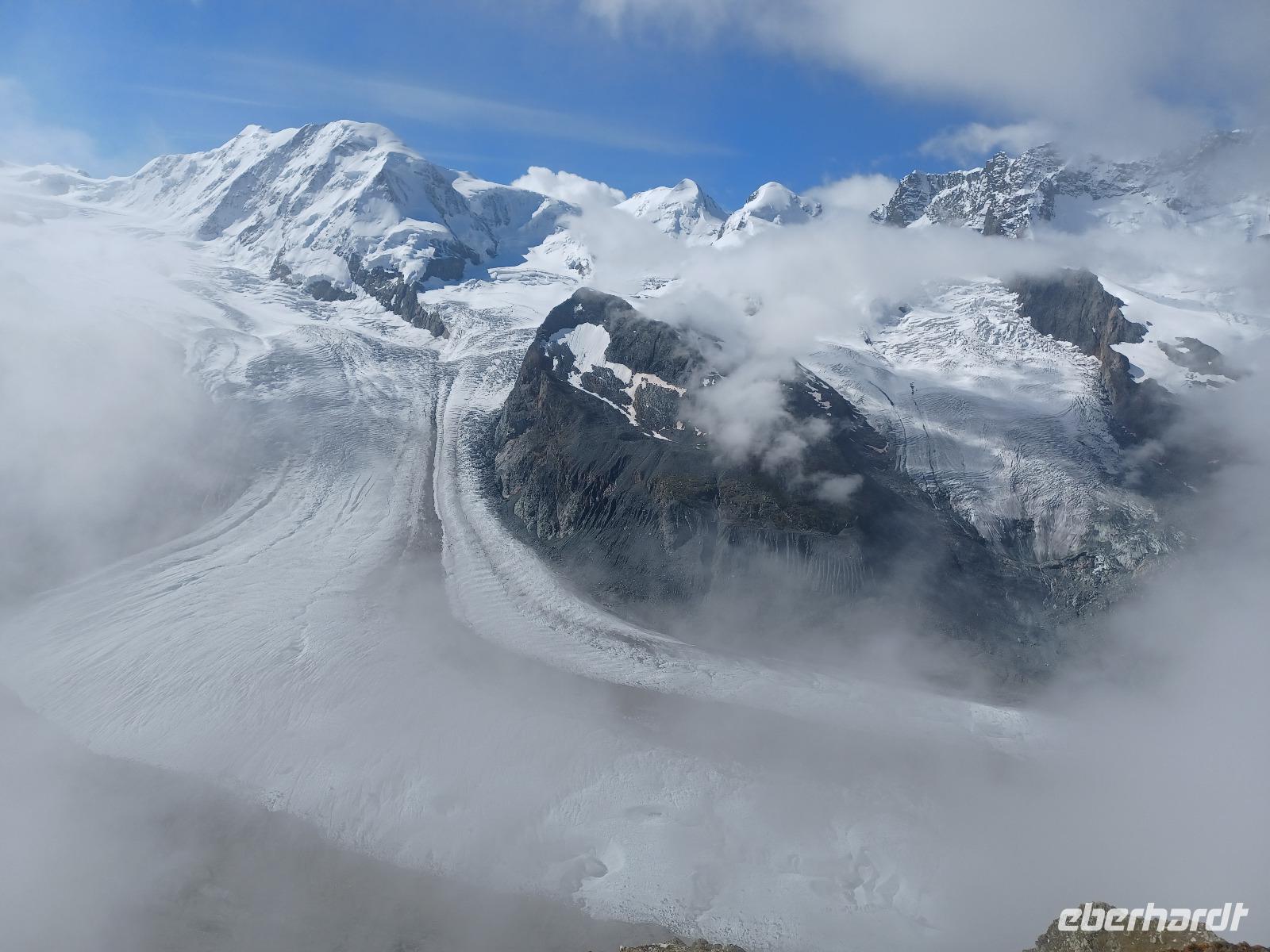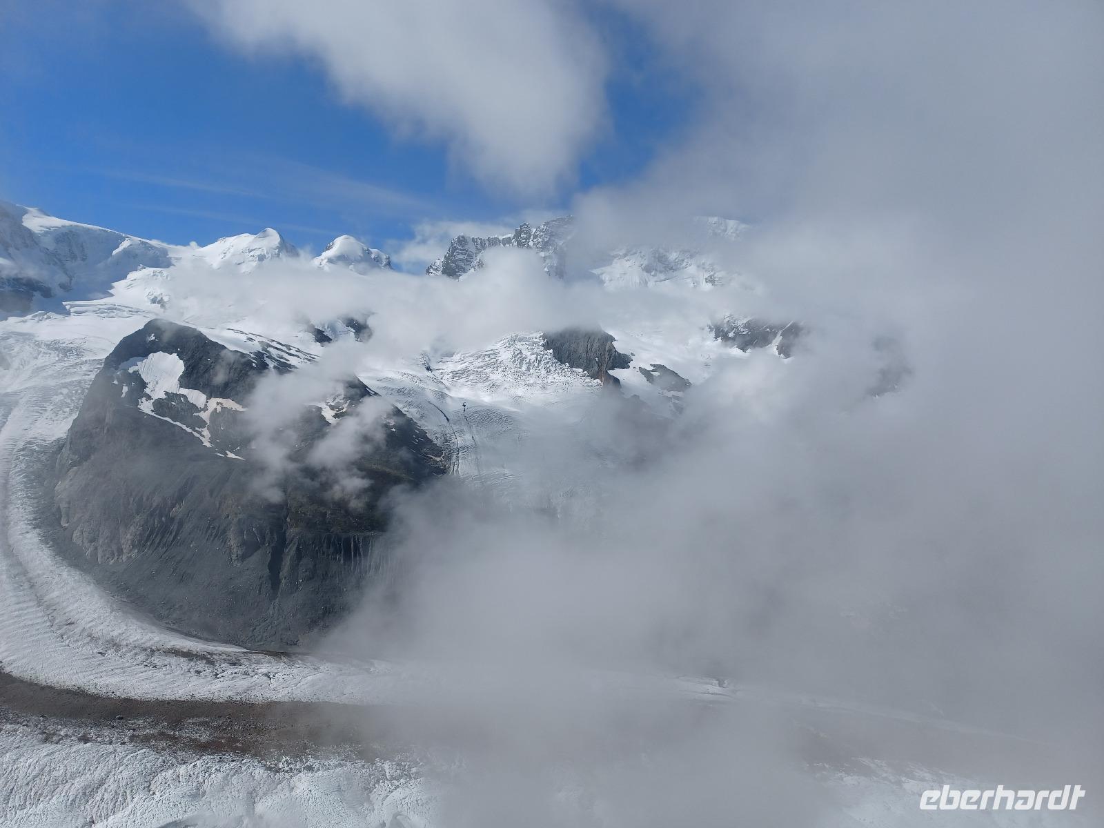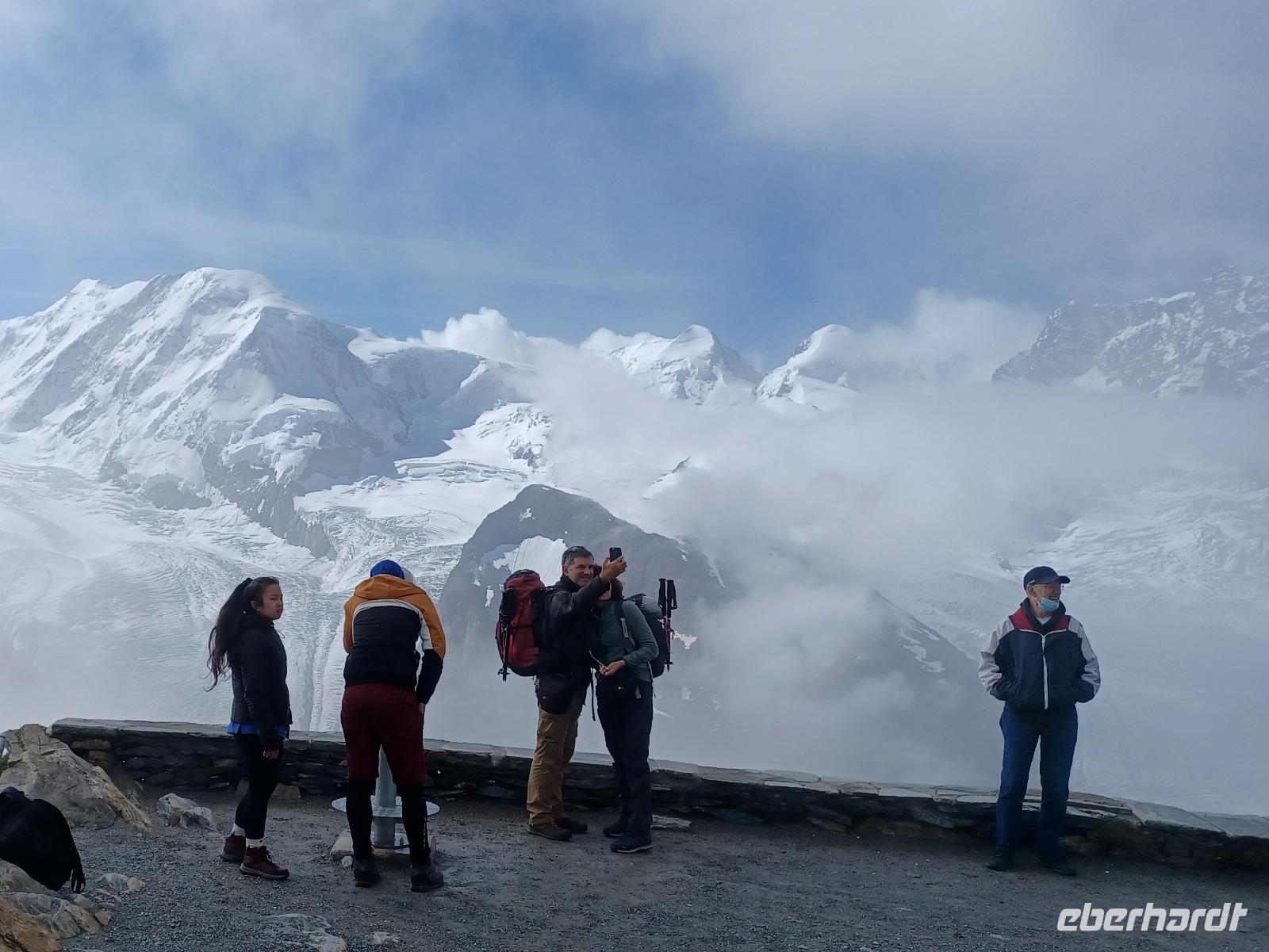 2.8.2021. Für heute hat der Wetterbericht Besserung vorhergesagt. Aber gegen acht ist im Tal noch alles in Wolken. Dennoch begibt sich unserer Reisgruppe voller Optimismus in Richtung Bahnhof; schnell sind die Tickets geholt und die Fahrt zum eindrucksvollen Gornergrat kann beginnen. Mithilfe der Zahnradtechnik geht es steil bergauf und wenige Zeit später sind wir schon im baumlosen Reich der Murmeltiere angelangt. Überall Wolkengebräu, aber zwischen allen Nebeln tauchen urplötzlich die sonnenbeschienen Berge auf. Das Panorama ist nicht komplett, aber die Spitzen im ewigen Eis, die Gletscher und Felswände werden kurz sichtbar um im nächsten Moment wieder hinter dem Wolkenvorhang zu verschwinden. Das sind ganz überwältigende Augenblicke; die Fotografen müssen schnell reagieren, sie können dennoch besonders schöne Impressionen für alle Zeit festhalten. Heute ist oben auf dem Berg etwas Geduld gefragt, die Sicht gegen Mittag ändert sich kaum, auch am zeitigen Nachmittag sind die Lücken rar. Aber es bleibt ein überwältigendes Erlebnis!