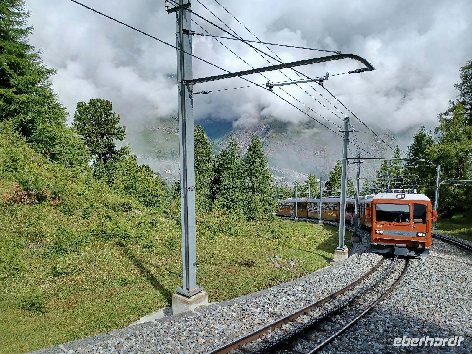 In Filisur müssen wir uns noch etwas gedulden; aber ganz pünktlich kommt der Express. In den geräumigen Panoramawagen haben wir schnell Platz gefunden - nun beginnt das große Bahnabenteuer. Zunächst sind wir noch in Graubünden unterwegs; über abenteuerliche Viadukte und durch dunkle Tunnel führt unsere Fahrt, eine unbeschreiblich schöne Landschaft zieht dabei an den Fenstern vorbei. In Chur wird die Lok umgespannt, nun geht es in anderer Richtung durch die schroffe Landschaft der Rheinschlucht bis nach Disentis. Von einer Anhöhe grüßt das mächtige Kloster St. Martin, aber auch hier geht es bald weiter. Mithilfe der Zahnradlok erklimmen wir die Höhen des Oberalppasses, fahren nach Andermatt zu Tal und sind bald nach dem Passieren des Furkabasistunnels in unserem Zielkanton Wallis angelangt. Hier lässt sich auch hie und da die Sonne sehen; wir folgen nun dem Flusslauf der jungen Rhone und hinter Visp biegen wir schließlich in das Mattertal ein. Fortan geht es bergauf; die Felswände treten an die Bahnstrecke heran und unser Ziel ist nun nicht mehr weit. Aber, die Wolken haben sich verdichtet als wir in Zermatt anlangen und den kleinen Spaziergang bis zum Hotel unternehmen. Hier werden wir schon freundlich in Empfang genommen und, nachdem die Zimmer bezogen wurden, gönnen wir uns noch einen kleinen Bummel bis zum Abendessen durch Zermatt.