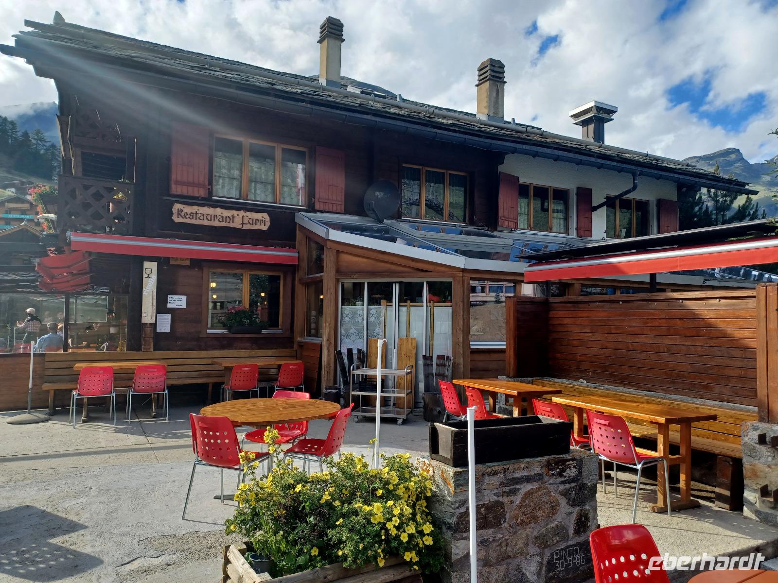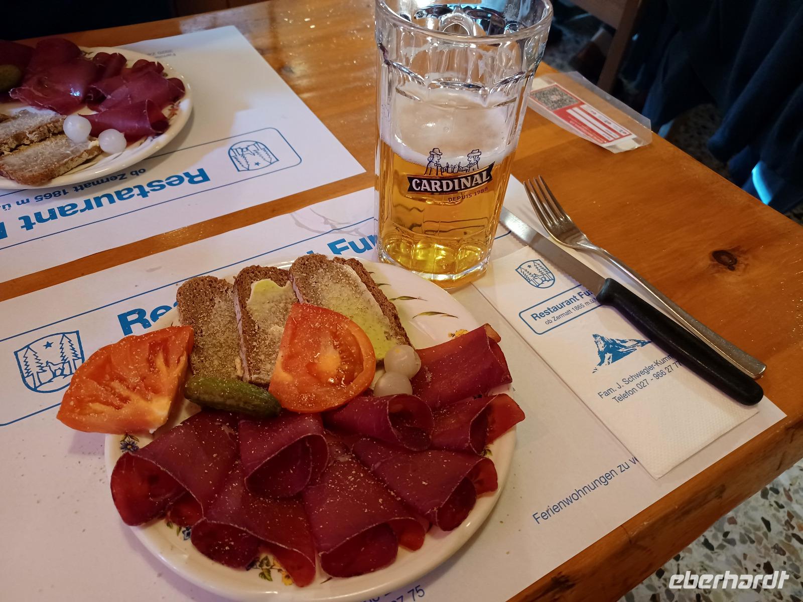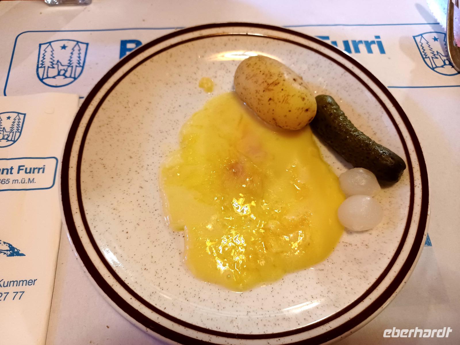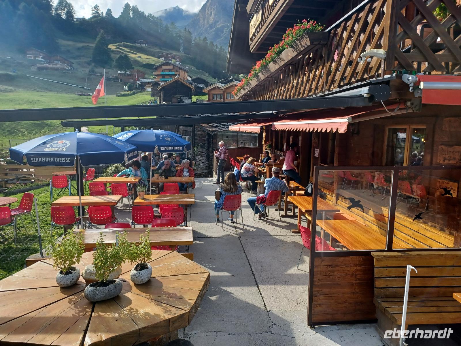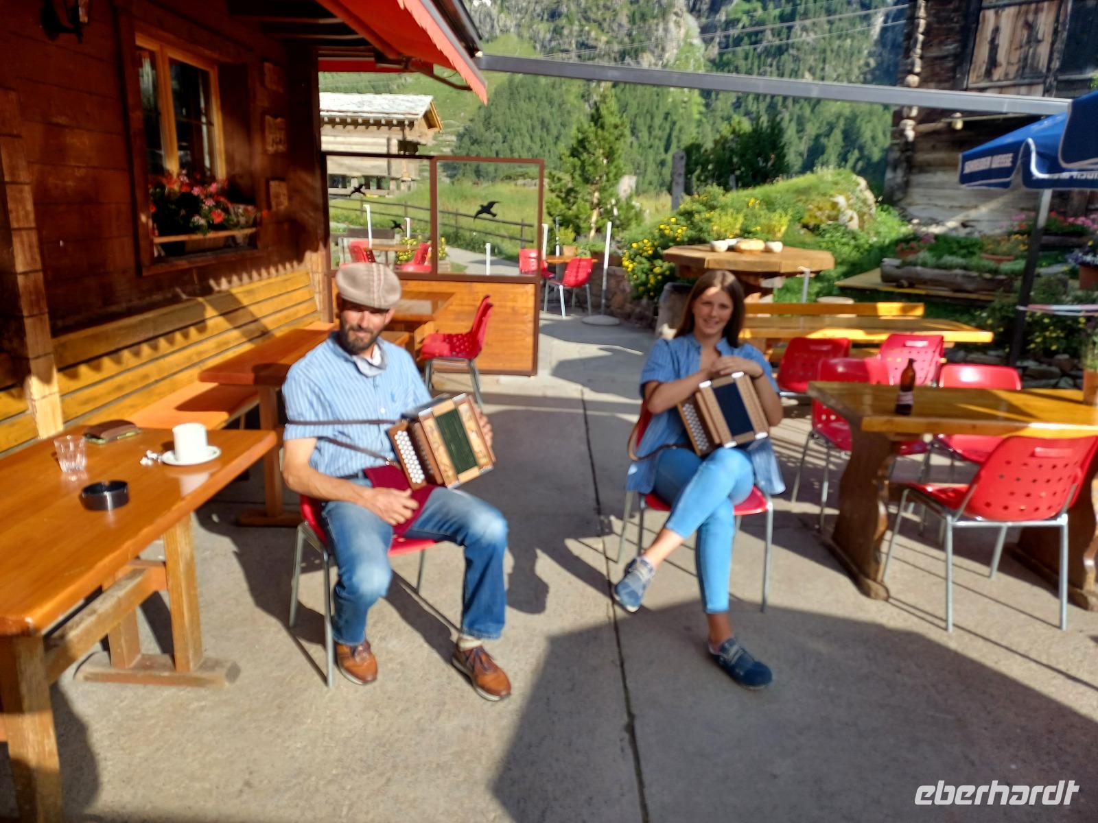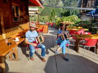 Aber unser Augenmerk liegt nun auf der kurzen Auffahrt nach Furi, die Sonne begleitet uns. Sie scheint auch auf die wunderschön gelegene Terrasse unseres Restaurants; hier wird uns ein Apéro serviert und bald erklingen uralte Schweizer Weisen aus zwei Harmonikas. Die zwei Musiker, Vater und Tochter, begleiten uns den ganzen schönen Abend und sorgen für eine besondere Stimmung. Zunächst gibt es einen Vorspeisenteller mit Walliser Trockenfleisch, dann erfüllt der würzige Duft geschmolzenen Käses den Raum. Die Musik, der Blick auf die uns umgebende Bergwelt und das leckere Essen - es ist einfach ein unbeschreiblicher Abend den wir nur ungern beenden.