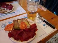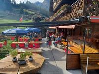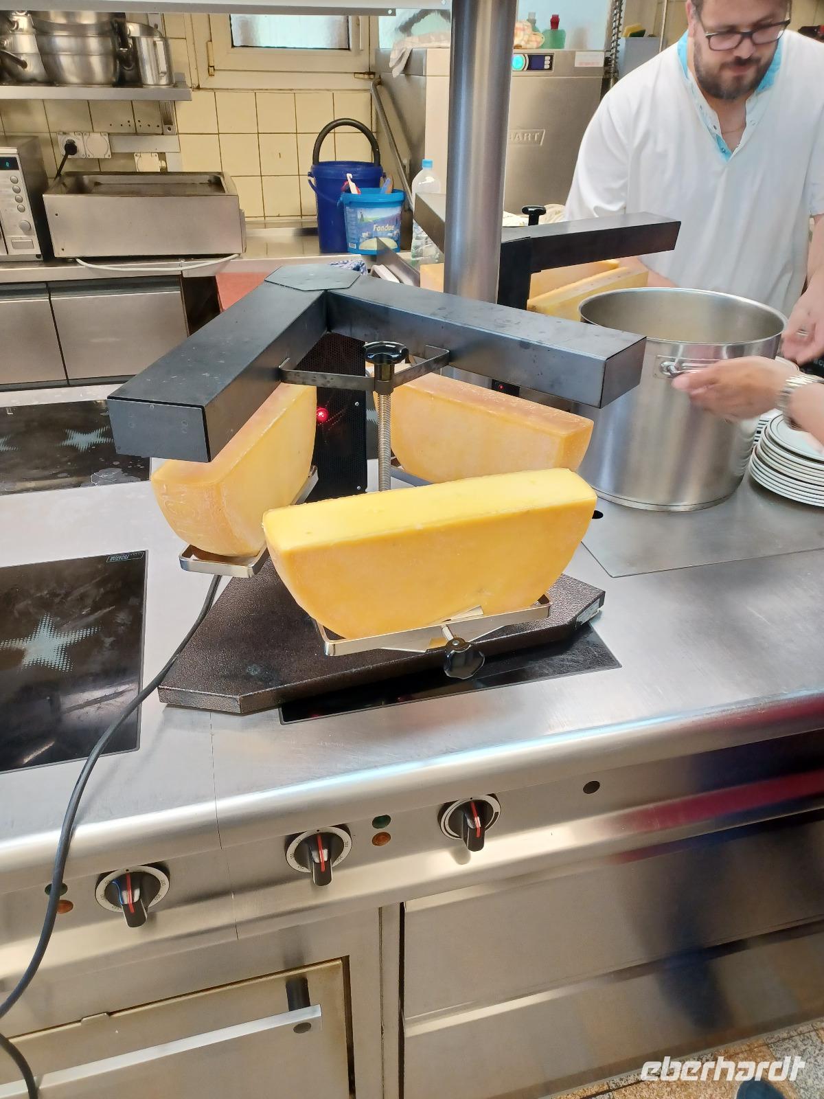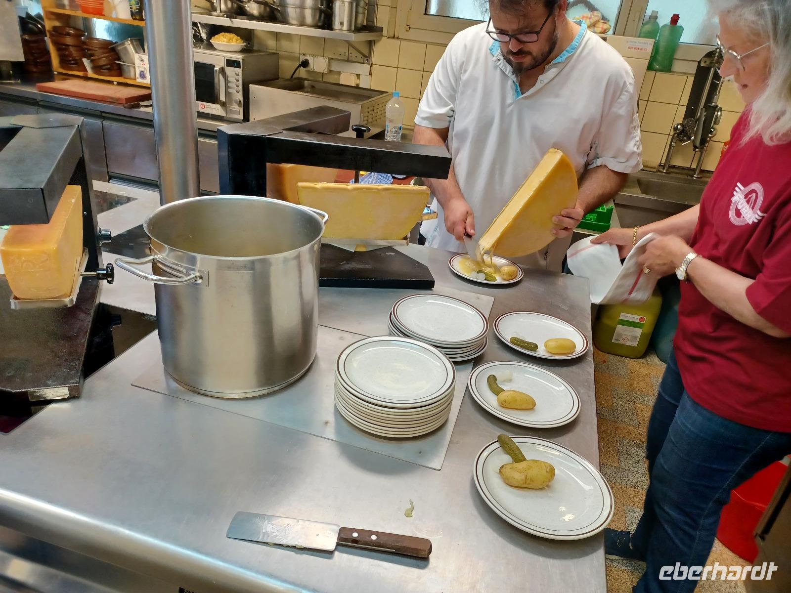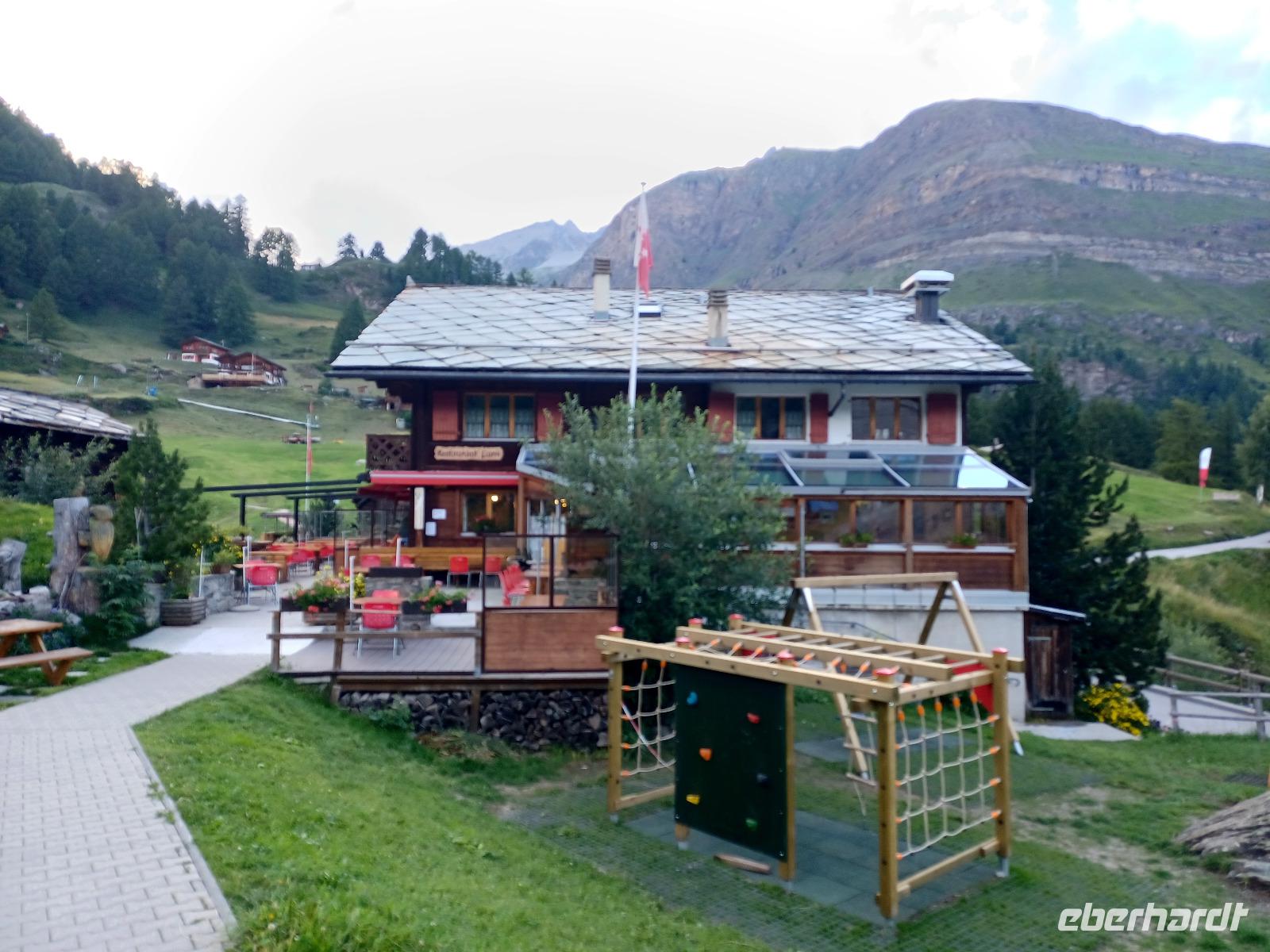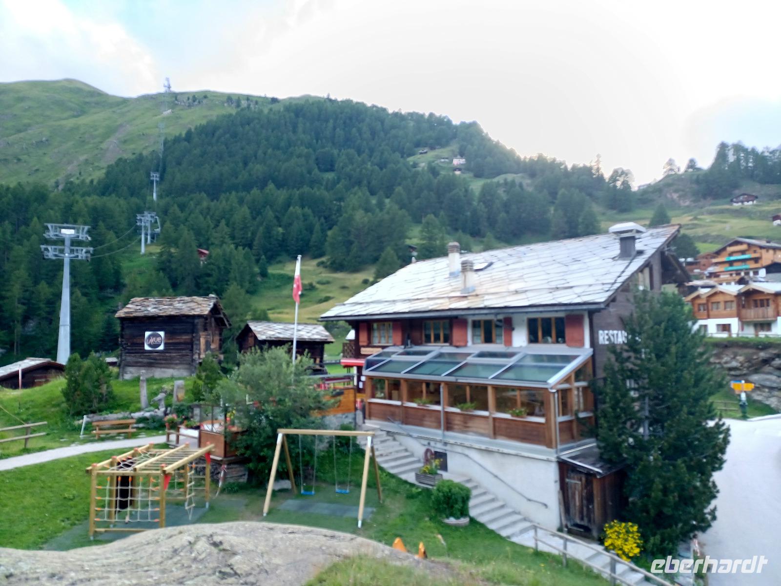 Aber unser Augenmerk liegt nun auf der kurzen Auffahrt nach Furi, die Sonne begleitet uns. Sie scheint auch auf die wunderschön gelegene Terrasse unseres Restaurants; hier wird uns ein Apéro serviert und bald erklingen uralte Schweizer Weisen aus zwei Harmonikas. Die zwei Musiker, Vater und Tochter, begleiten uns den ganzen schönen Abend und sorgen für eine besondere Stimmung. Zunächst gibt es einen Vorspeisenteller mit Walliser Trockenfleisch, dann erfüllt der würzige Duft geschmolzenen Käses den Raum. Die Musik, der Blick auf die uns umgebende Bergwelt und das leckere Essen - es ist einfach ein unbeschreiblicher Abend den wir nur ungern beenden.