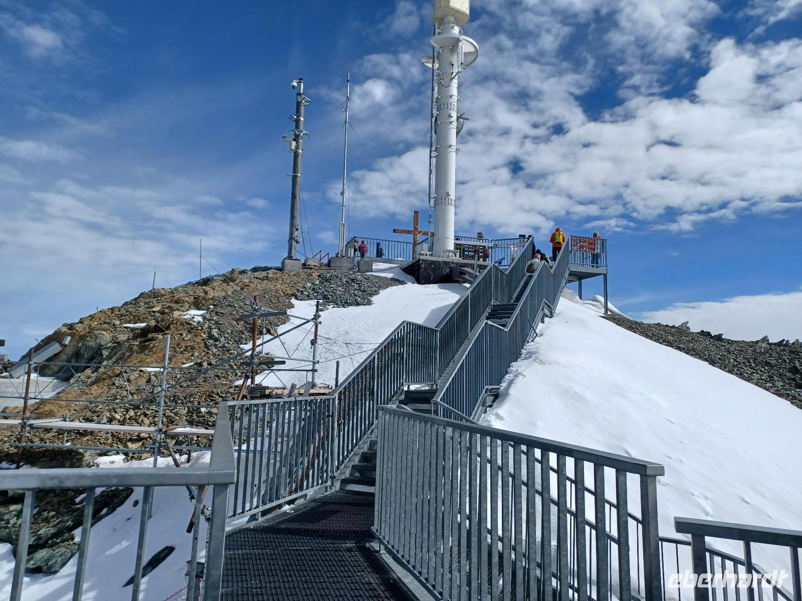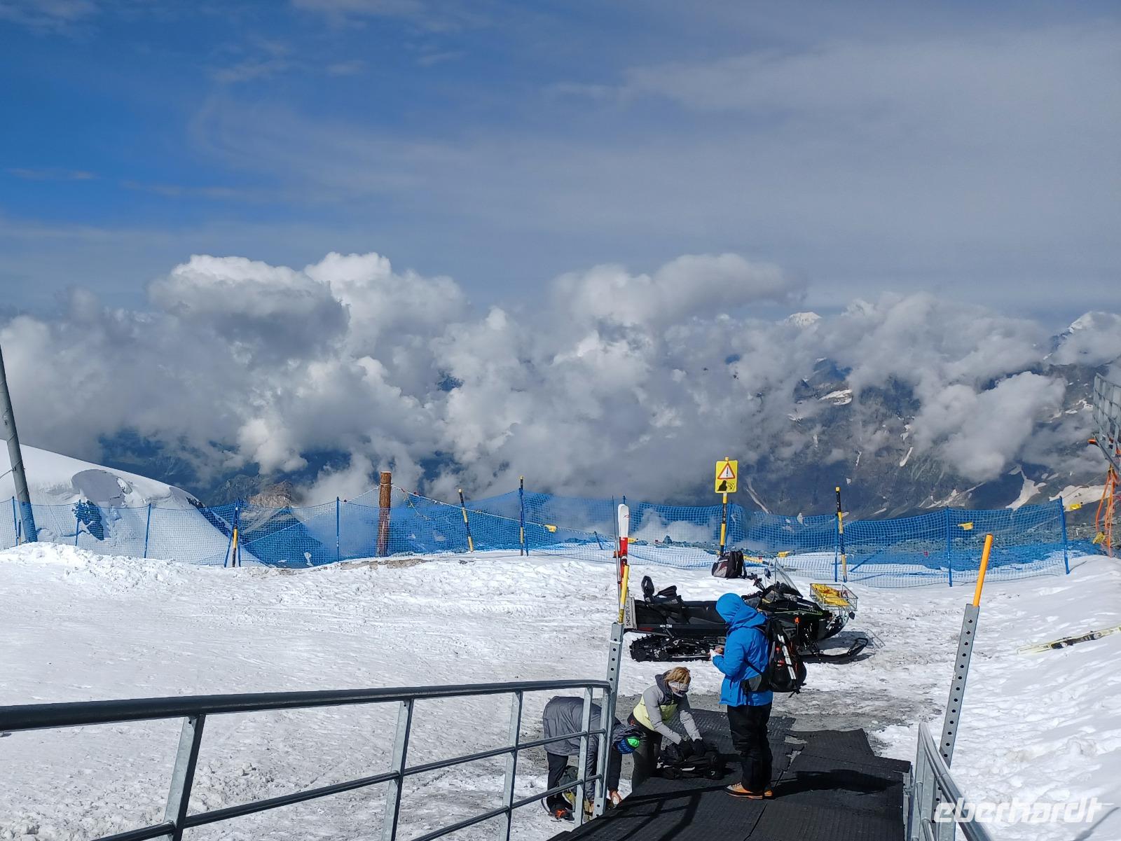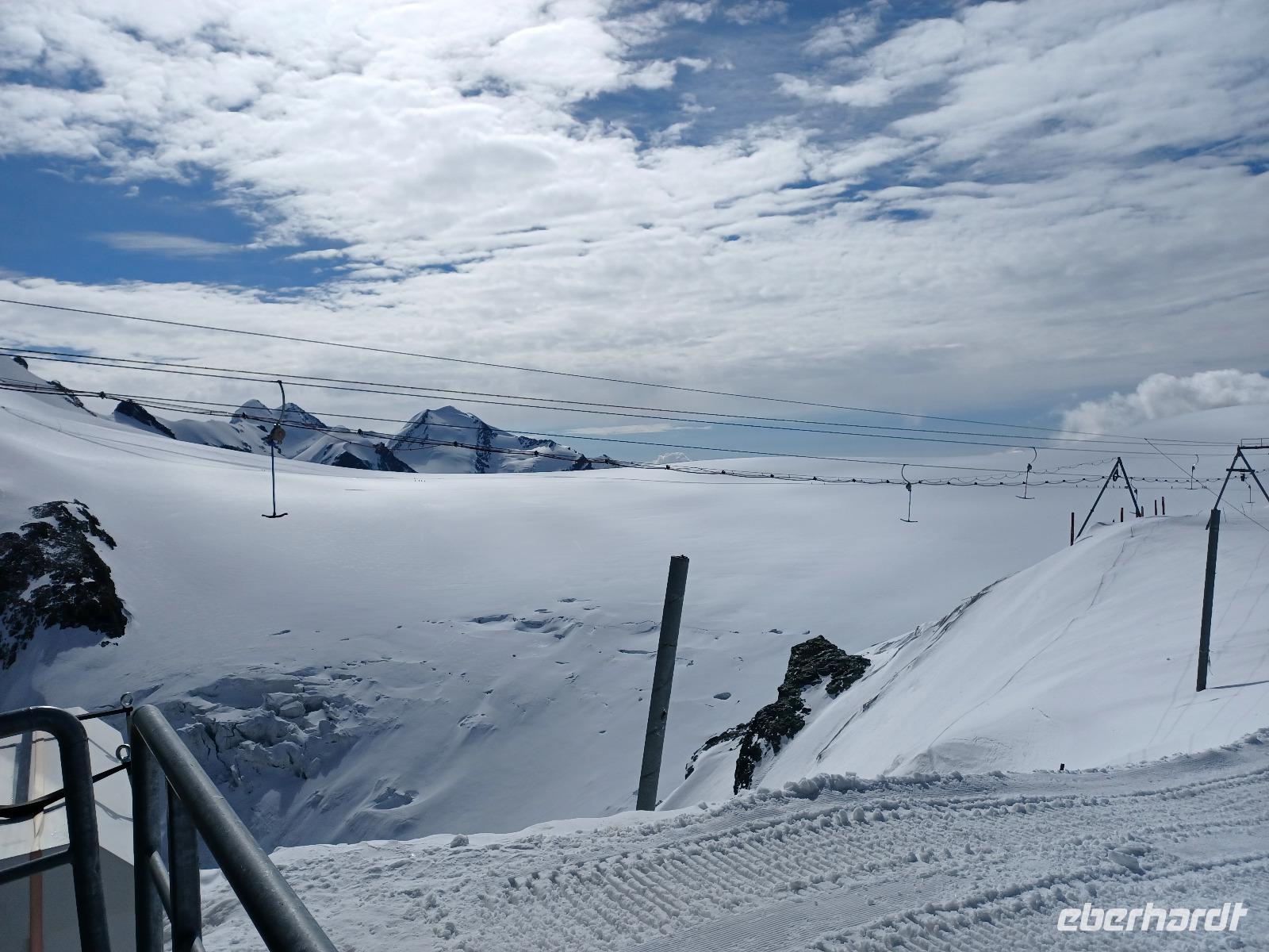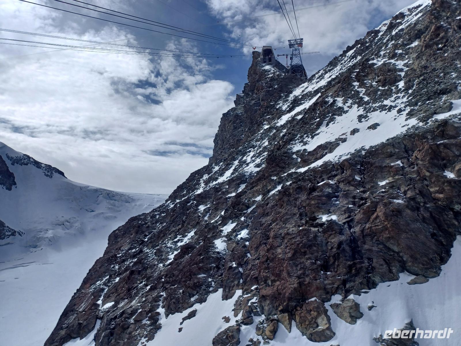 3.8.2021. Der Morgen zeigt sich uns mit schönem und sonnigen Wetter. Da zögern wir keinen Augenblick und nehmen uns eine letzte, spektakuläre Bergbahnfahrt in Zermatt vor. Die Sonne ist unsere Begleiterin als wir zur Talstation der Klein - Matterhorn - Bahn gehen. Dort angelangt besteigen wir die Gondeln und ab geht die Fahrt durch die spektakuläre Bergewelt. Die Bäume treten zurück, der Schwarzsee bleibt zu unserer Rechten und bald gleiten wir mit unserer Kabine über die mächtigen Geröllfelder die unseren Weg kreuzen. Dann der Umstieg. Schon hier bläst uns frostige Luft ins Gesicht, in einer knappen Viertelstunde werden wir oben sein. Nun schweben wir über das ewige Eis, unter uns ein Gletscherstrom und die Sonne lacht! Bald sind wir auf dem Klein - Matterhorn angelangt. Ein Lift bringt uns hinauf auf 4 000 Meter, ein eisiger Wind bläst uns entgegen. Aber das Panorama ist überwältigend. Umgeben von anderen schneebedeckten 4 000ern kann sich das Auge an all dieser Pracht kaum satt sehen.