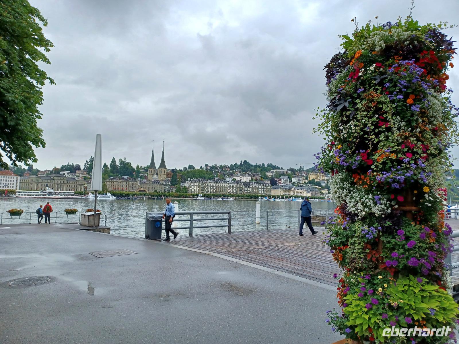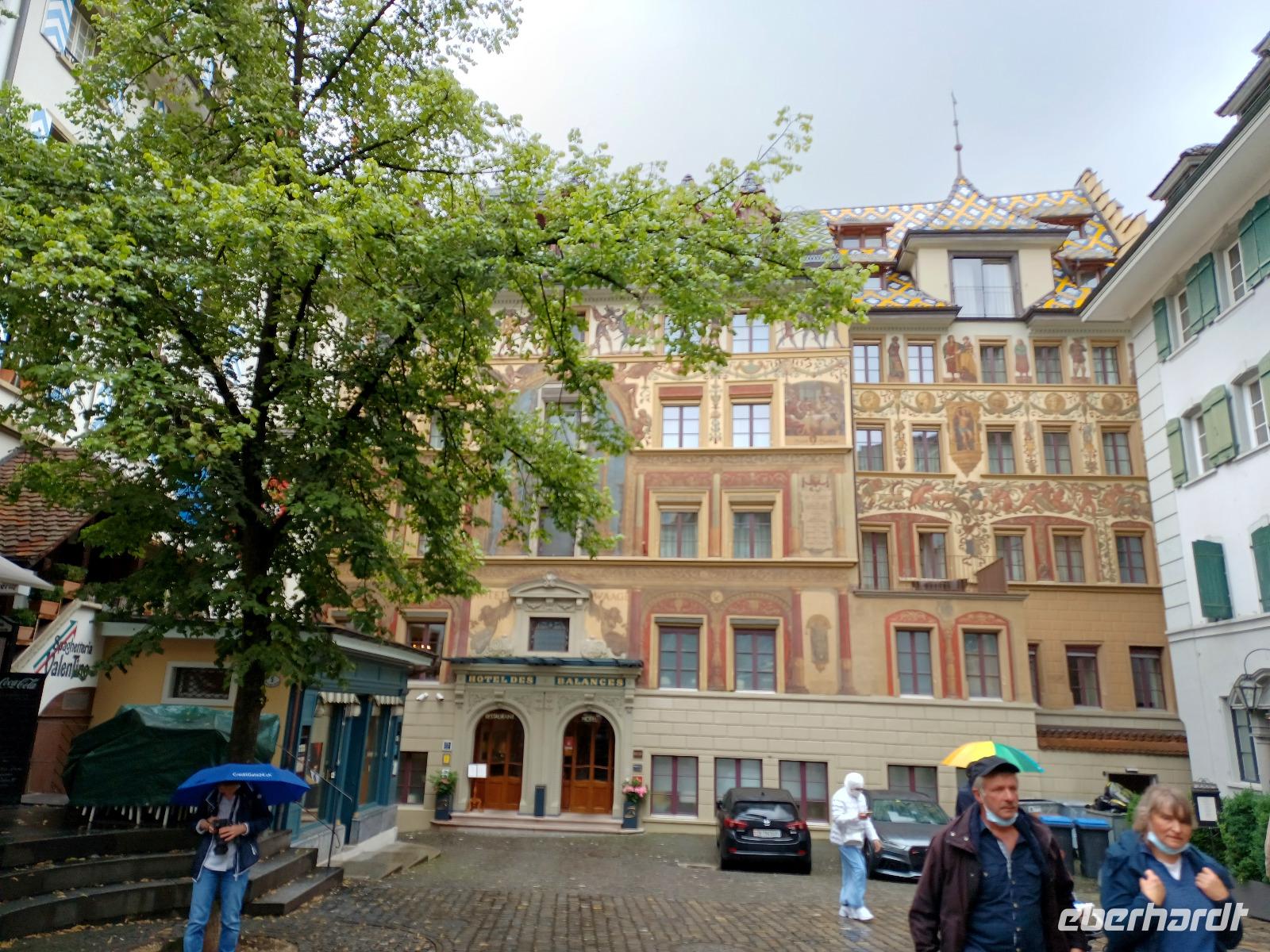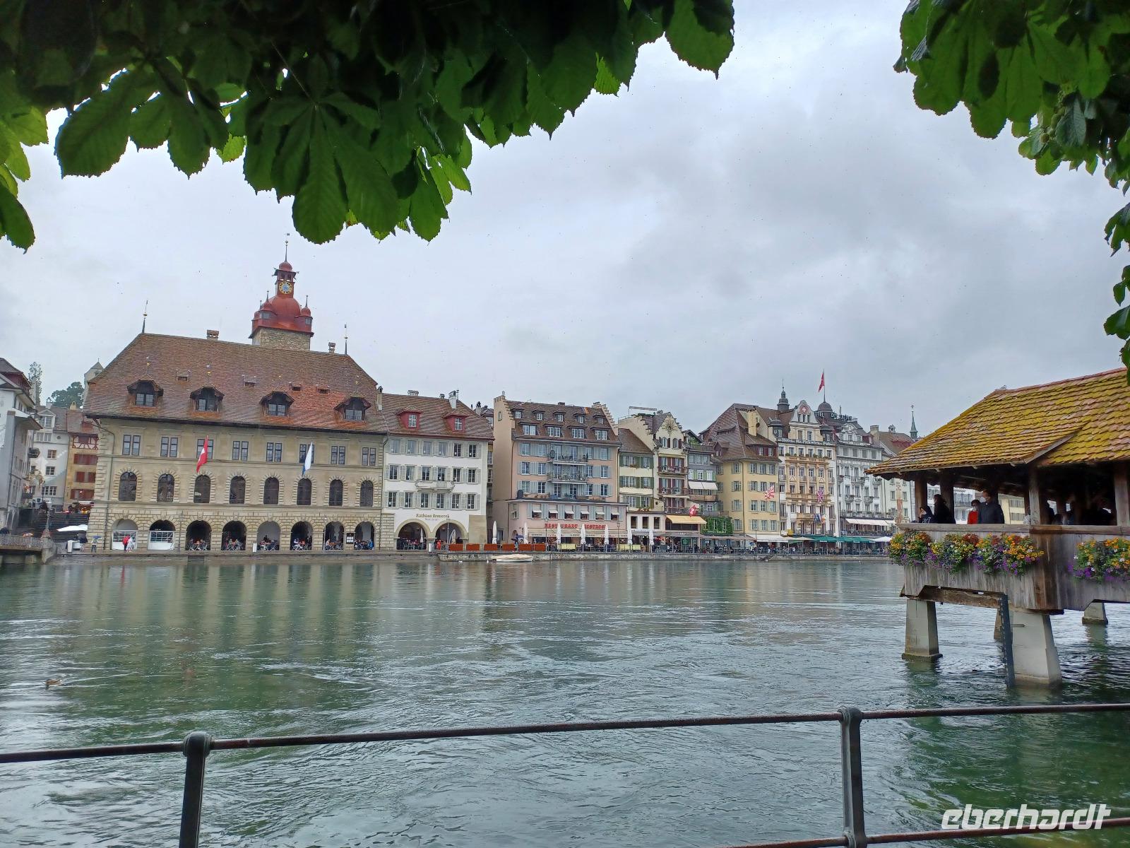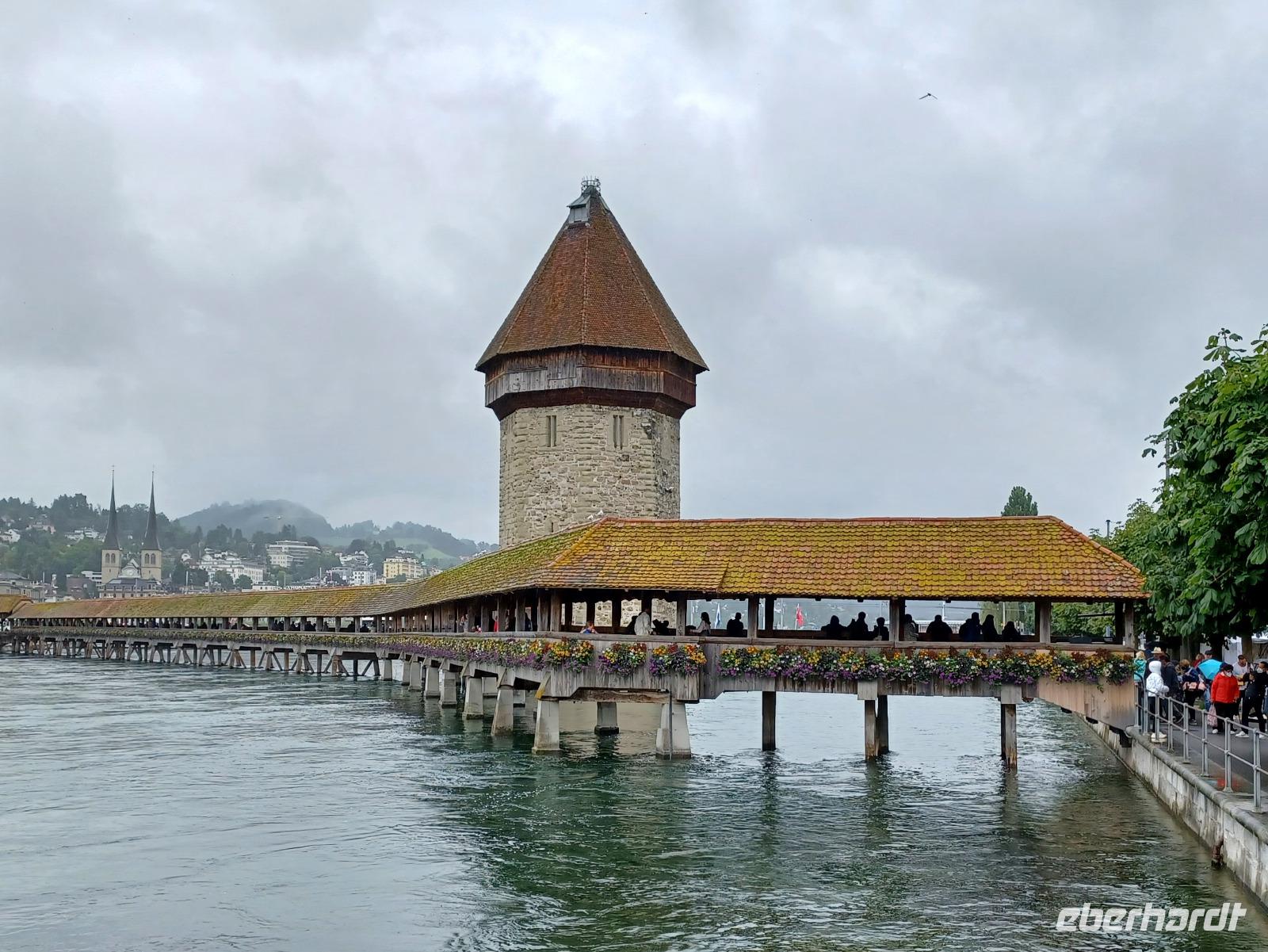 4.8.2021. Leider gibt es für den heutigen Tag wieder keine gute Wetterprognose. Kurz vor neun geht unser Pendelzug nach Täsch, auf dem Weg zum Bahnhof zeigt sich Petrus allerdings noch einmal von seiner angenehmeren Seite, das Matterhorn hat er aber wieder in Wolken gehüllt. Dann gelangen wir mit dem Pendelzug hinunter nach Täsch; Jan startet den Bus und ab geht es, hinunter ins Rhonetal. Dabei werden die Wolken immer dicker; es dauert auch nicht lange und die Schleusen des Himmels öffnen sich, wenn auch nur gering. Noch einmal, am Grimselpass, geht es über die 2 000 Meter hinaus, dann gelangen wir in das Berner Oberland, begleitet vom grünen Wasser der Aare. Unser Weg führt uns nun in die Zentralschweiz, vom Tal grüßen uns mehrere Seen und am größten, dem Vierwaldstätter See, legen wir für die nächsten gut eineinhalb Stunden eine Pause ein. Aber nicht irgendwo; es ist im Ort Luzern, einem der schönsten und Geschichtsträchtigsten der Schweiz. Blumengeschmückt zeigt sich uns die Kapellbrücke, einstiger Teil der Stadtbefestigung und quer über die Reuss führend, zeigt sie uns in ihrem Dachstuhl Bilder aus der Stadtgeschichte. Ein Blick hinein in die Altstadt lässt uns gleich um Jahrhunderte in der Zeit zurückgehen, schon die Augen Goethes und Wagners weilten auf diesem schönen Stadtbild.