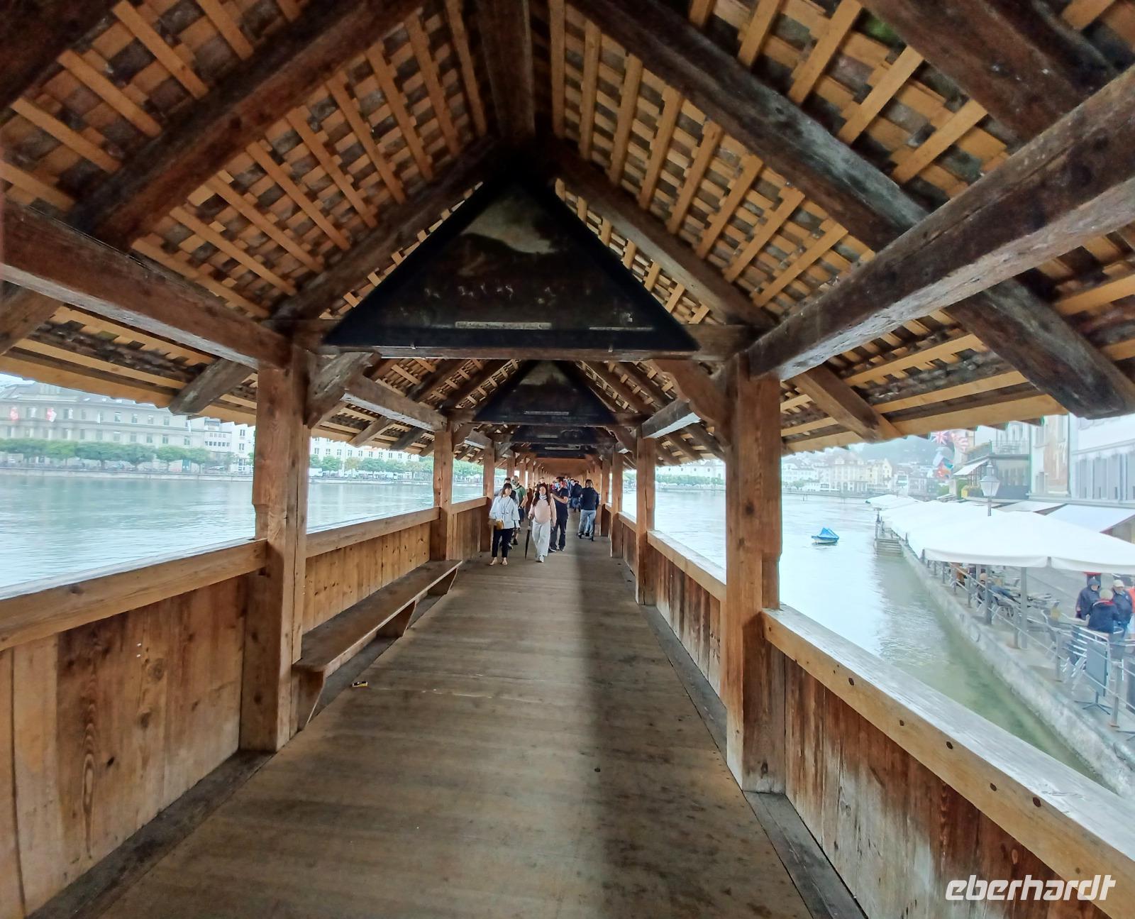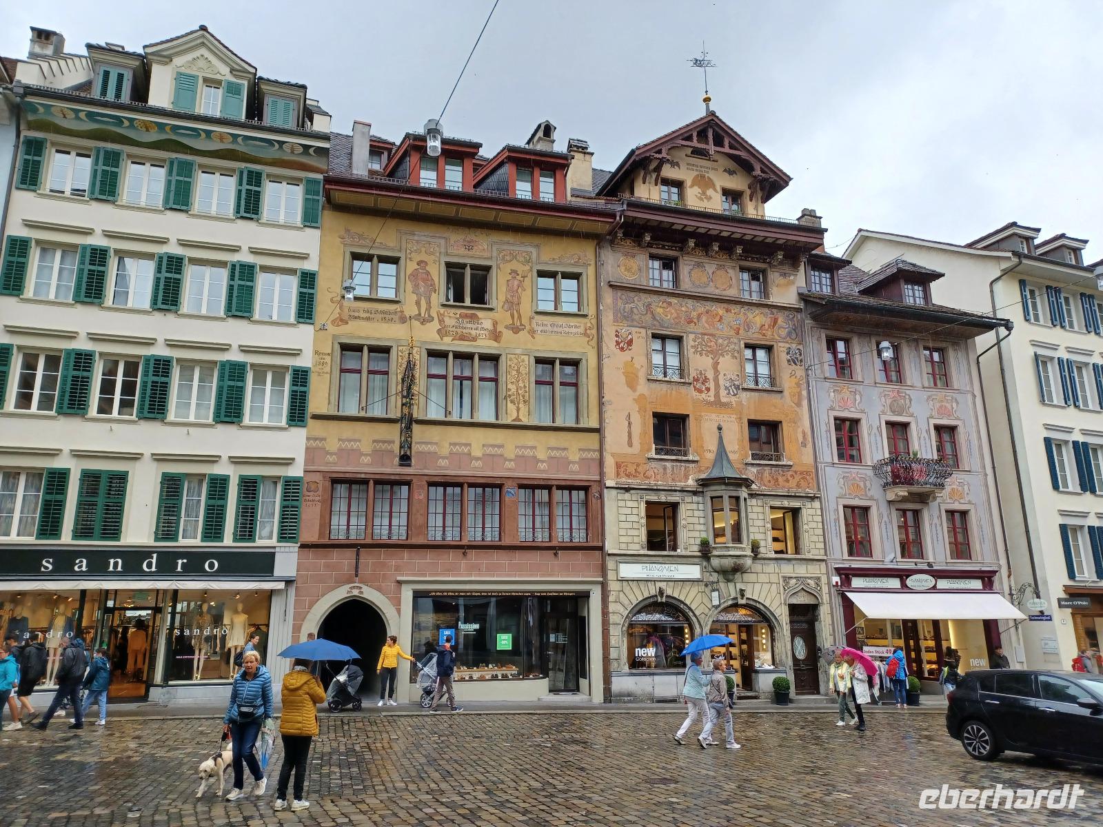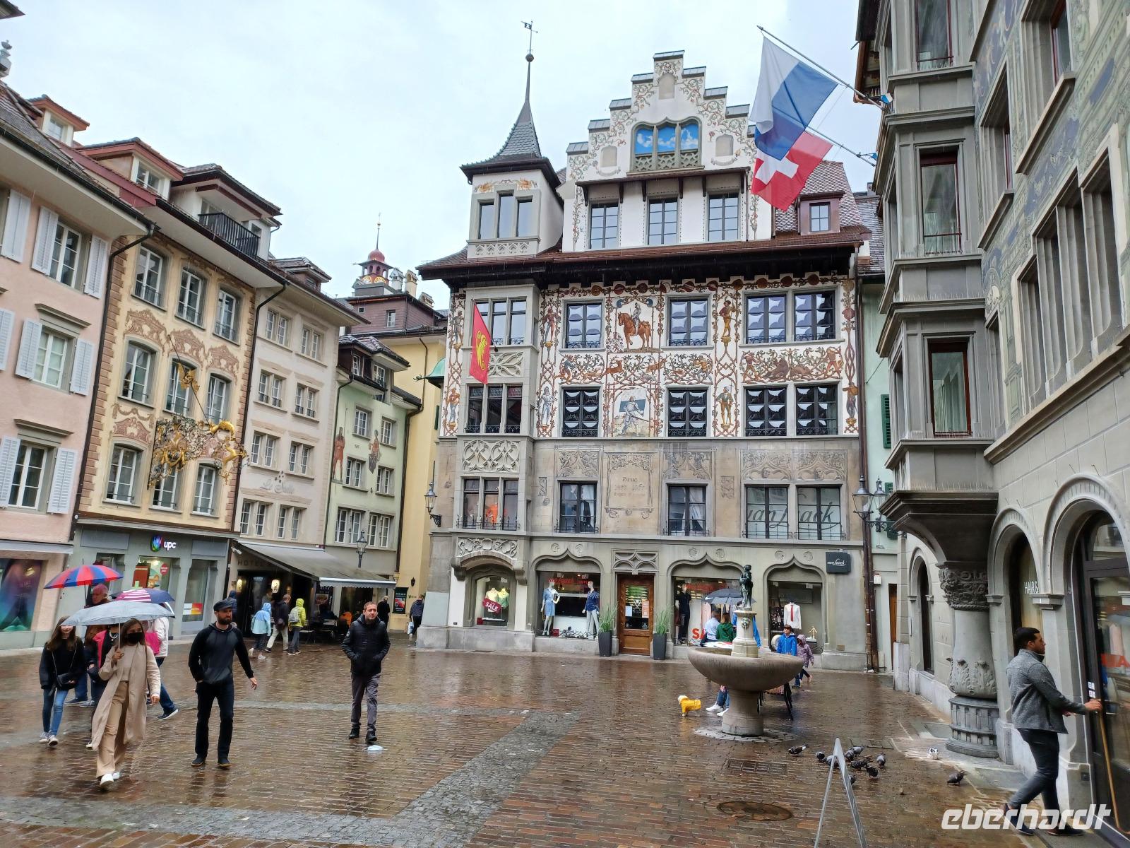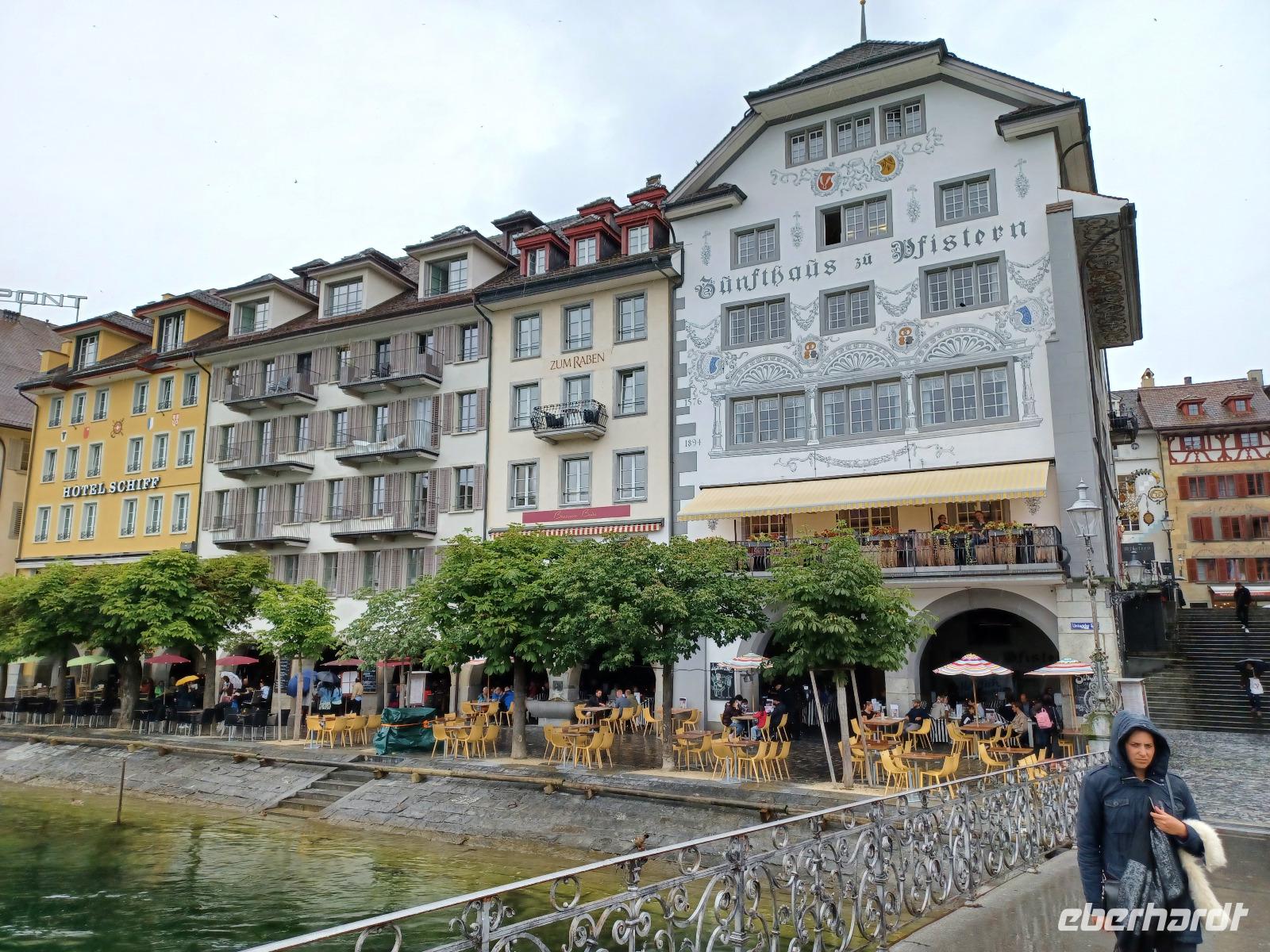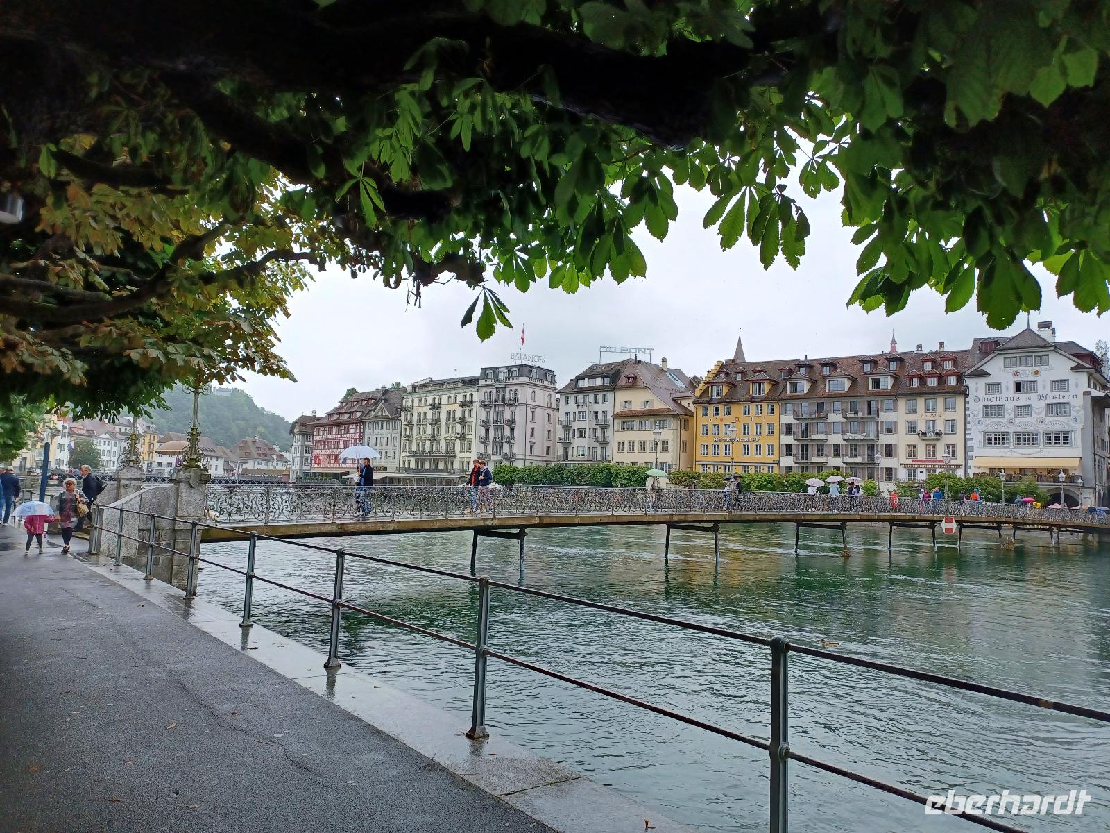 4.8.2021. Leider gibt es für den heutigen Tag wieder keine gute Wetterprognose. Kurz vor neun geht unser Pendelzug nach Täsch, auf dem Weg zum Bahnhof zeigt sich Petrus allerdings noch einmal von seiner angenehmeren Seite, das Matterhorn hat er aber wieder in Wolken gehüllt. Dann gelangen wir mit dem Pendelzug hinunter nach Täsch; Jan startet den Bus und ab geht es, hinunter ins Rhonetal. Dabei werden die Wolken immer dicker; es dauert auch nicht lange und die Schleusen des Himmels öffnen sich, wenn auch nur gering. Noch einmal, am Grimselpass, geht es über die 2 000 Meter hinaus, dann gelangen wir in das Berner Oberland, begleitet vom grünen Wasser der Aare. Unser Weg führt uns nun in die Zentralschweiz, vom Tal grüßen uns mehrere Seen und am größten, dem Vierwaldstätter See, legen wir für die nächsten gut eineinhalb Stunden eine Pause ein. Aber nicht irgendwo; es ist im Ort Luzern, einem der schönsten und Geschichtsträchtigsten der Schweiz. Blumengeschmückt zeigt sich uns die Kapellbrücke, einstiger Teil der Stadtbefestigung und quer über die Reuss führend, zeigt sie uns in ihrem Dachstuhl Bilder aus der Stadtgeschichte. Ein Blick hinein in die Altstadt lässt uns gleich um Jahrhunderte in der Zeit zurückgehen, schon die Augen Goethes und Wagners weilten auf diesem schönen Stadtbild.
