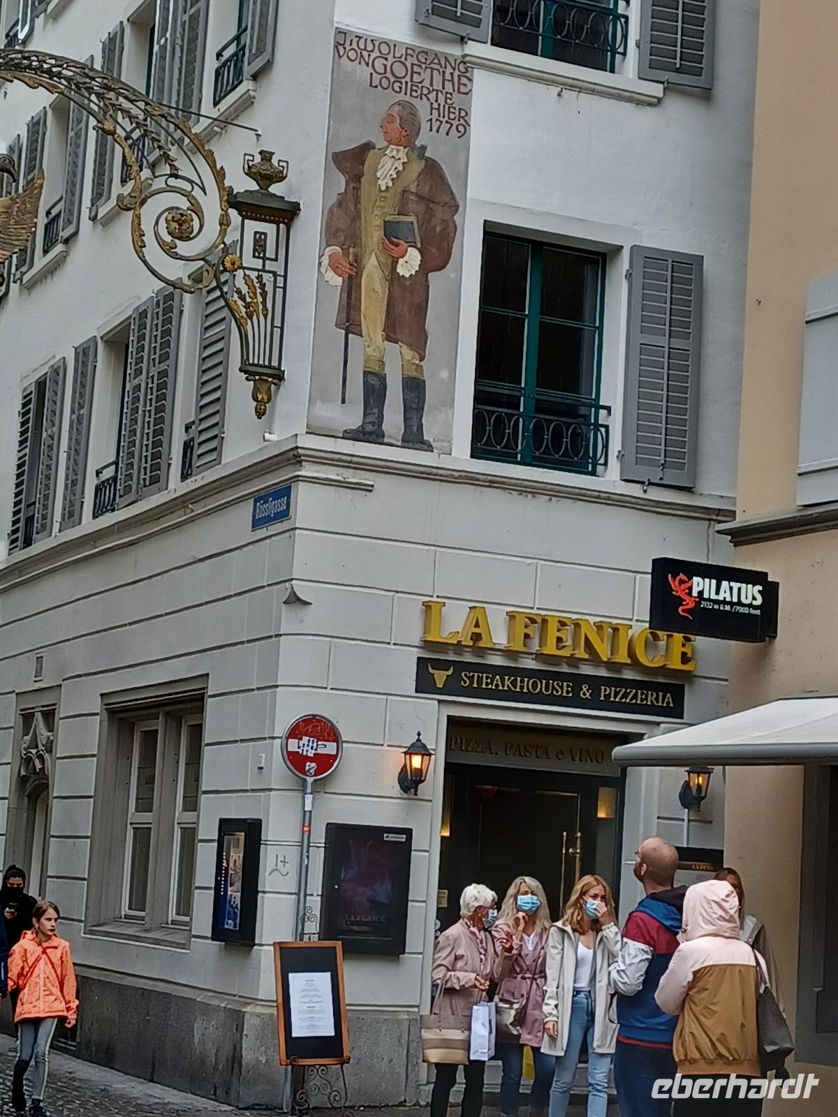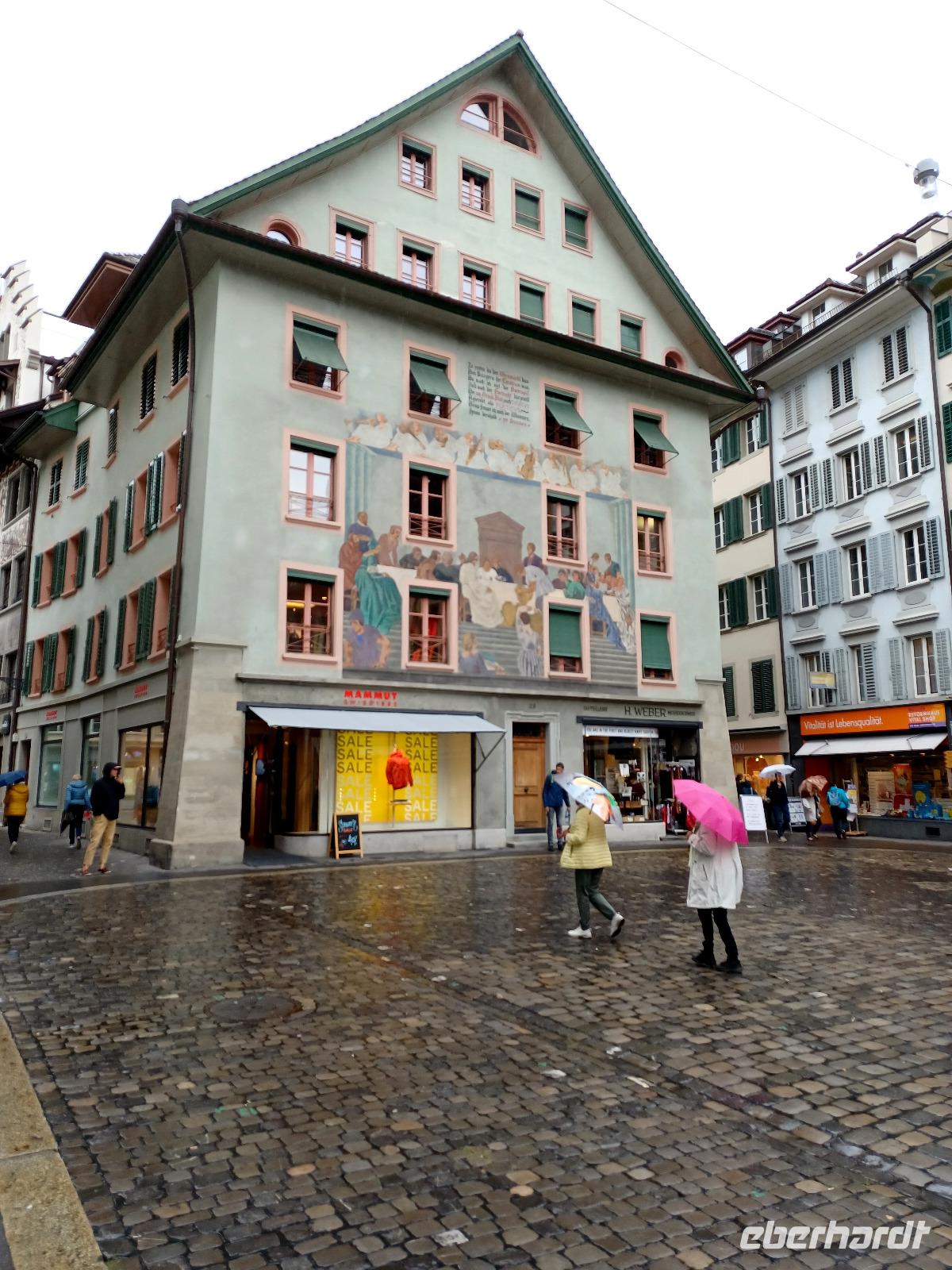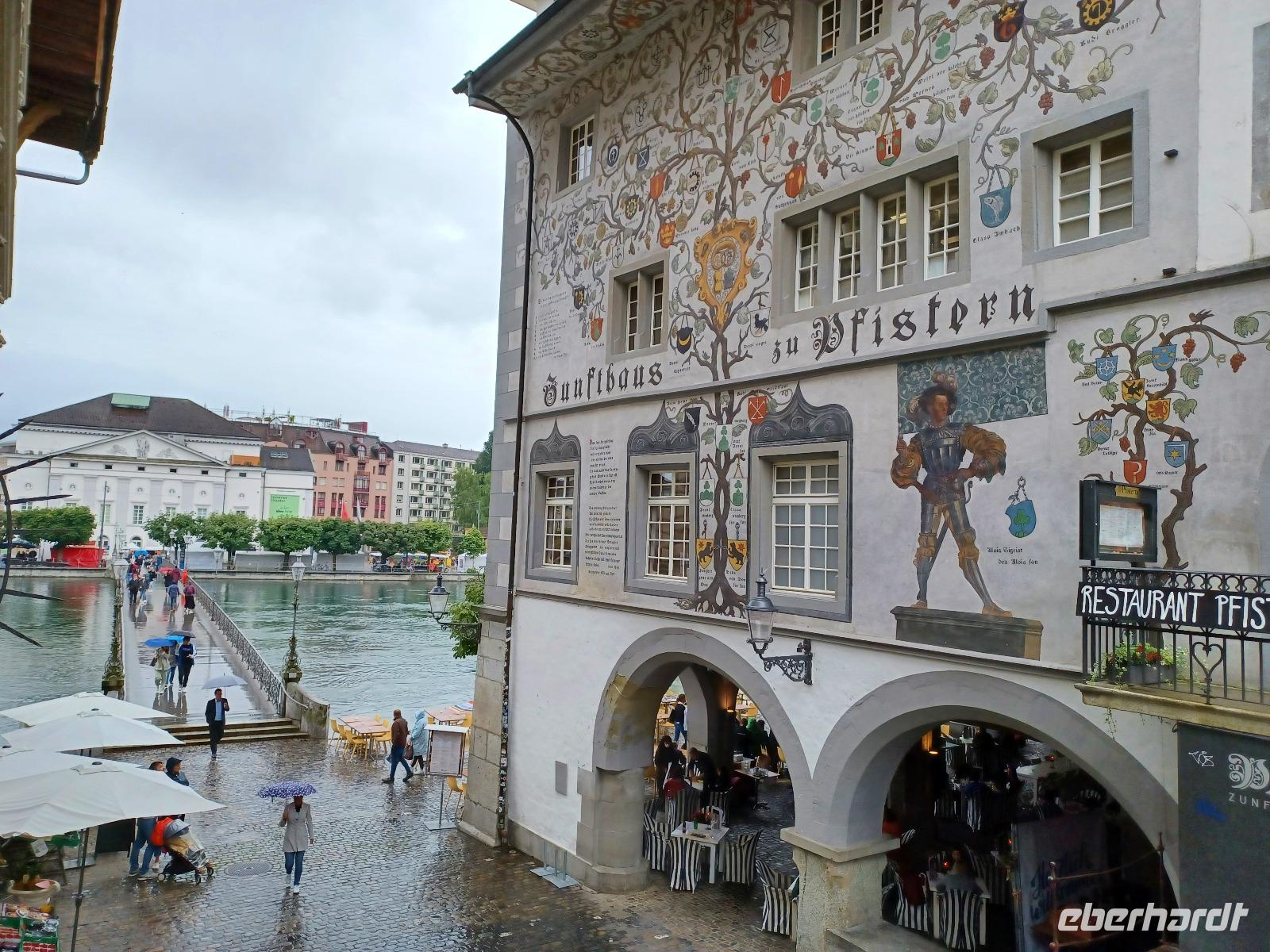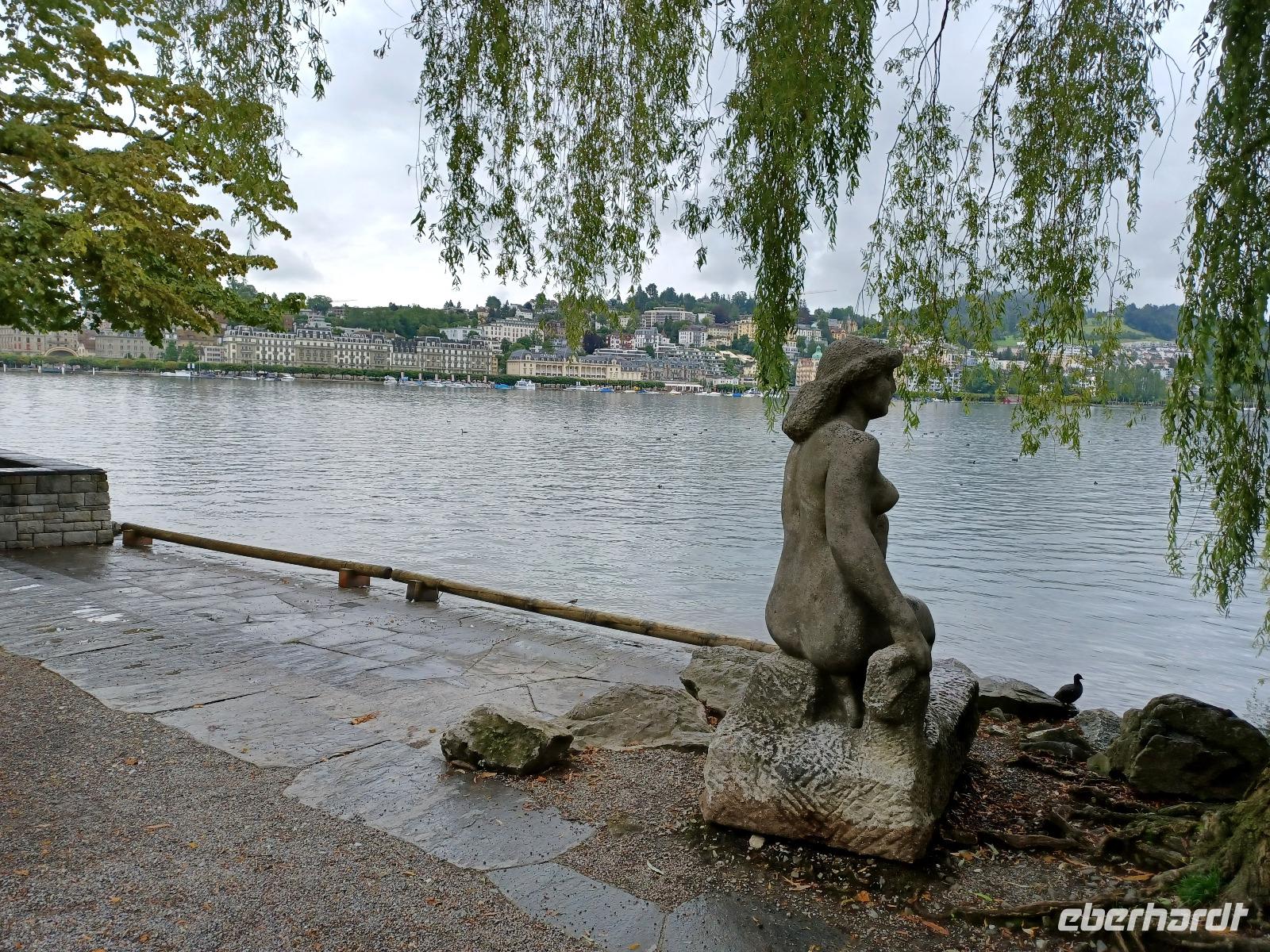 4.8.2021. Leider gibt es für den heutigen Tag wieder keine gute Wetterprognose. Kurz vor neun geht unser Pendelzug nach Täsch, auf dem Weg zum Bahnhof zeigt sich Petrus allerdings noch einmal von seiner angenehmeren Seite, das Matterhorn hat er aber wieder in Wolken gehüllt. Dann gelangen wir mit dem Pendelzug hinunter nach Täsch; Jan startet den Bus und ab geht es, hinunter ins Rhonetal. Dabei werden die Wolken immer dicker; es dauert auch nicht lange und die Schleusen des Himmels öffnen sich, wenn auch nur gering. Noch einmal, am Grimselpass, geht es über die 2 000 Meter hinaus, dann gelangen wir in das Berner Oberland, begleitet vom grünen Wasser der Aare. Unser Weg führt uns nun in die Zentralschweiz, vom Tal grüßen uns mehrere Seen und am größten, dem Vierwaldstätter See, legen wir für die nächsten gut eineinhalb Stunden eine Pause ein. Aber nicht irgendwo; es ist im Ort Luzern, einem der schönsten und Geschichtsträchtigsten der Schweiz. Blumengeschmückt zeigt sich uns die Kapellbrücke, einstiger Teil der Stadtbefestigung und quer über die Reuss führend, zeigt sie uns in ihrem Dachstuhl Bilder aus der Stadtgeschichte. Ein Blick hinein in die Altstadt lässt uns gleich um Jahrhunderte in der Zeit zurückgehen, schon die Augen Goethes und Wagners weilten auf diesem schönen Stadtbild.