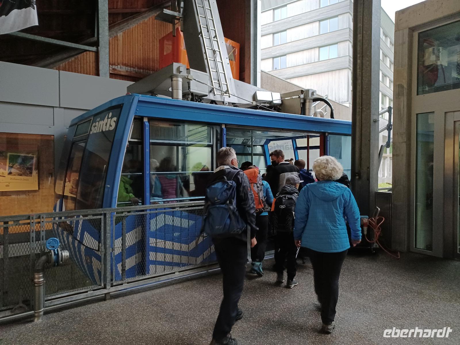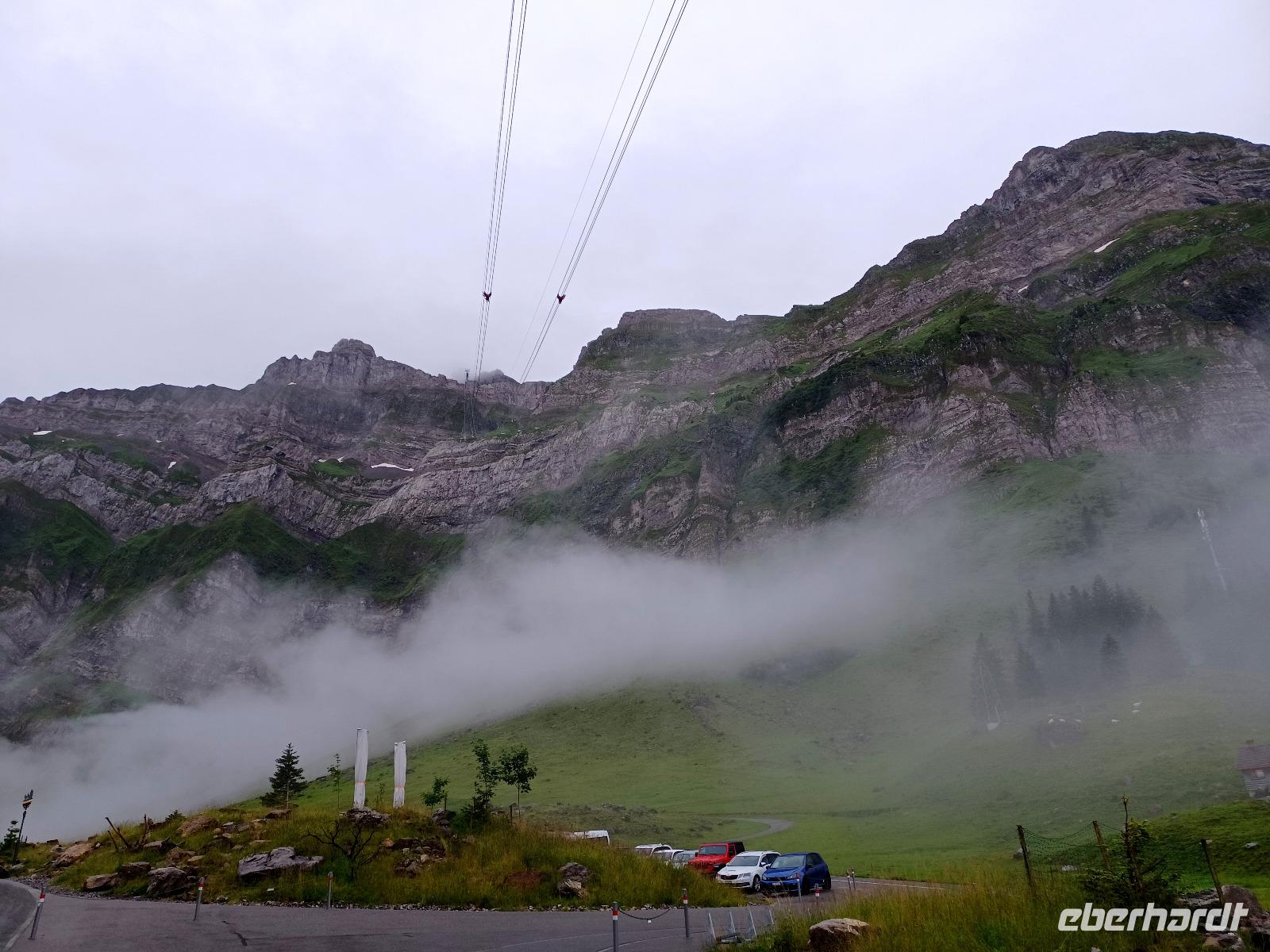 5.8.2021. Die Säntisspitze hat sich in einen dicken Nebel gehüllt, die Seile der Bergbahn verlaufen scheinbar ins Nichts. Dennoch haben wir uns an diesem frühen Morgen aufgemacht um genau auf diesem Berg im Nirgendwo unser letztes Frühstück dieser Reise zu genießen. Auch wenn im Panoramarestaurant der Rundblick nach wenigen Metern aufhört, das Buffet entschädigt uns auf kulinarische Art und Weise und, solcherart gut versorgt, treten wir kurz vor zehn unseren Heimweg an.