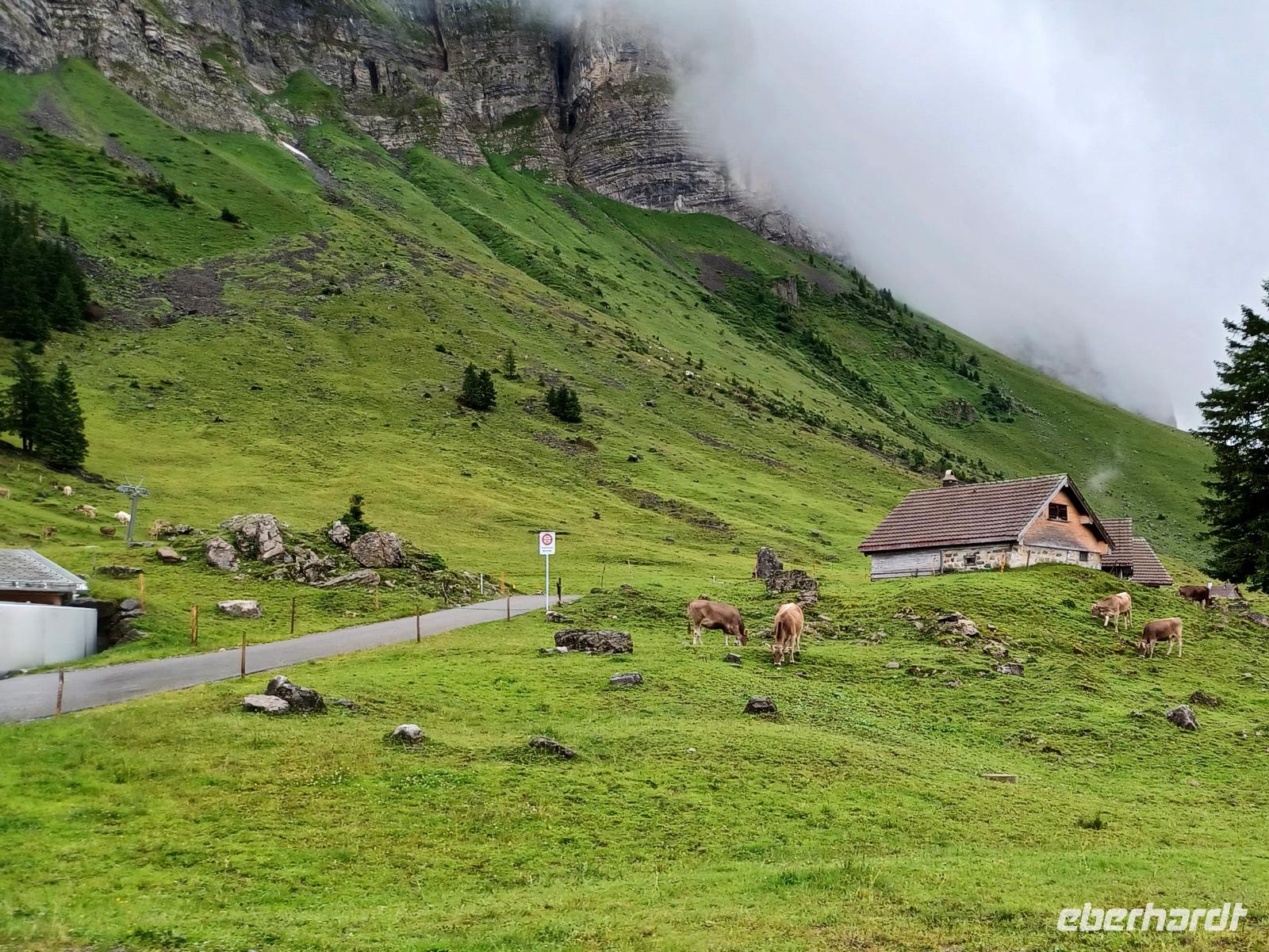 Bald verlassen wir die Zentralschweiz um am Zürichsee entlang und durch das Toggenburg hindurch an den Fuß des Säntisgebirges zu gelangen. Leider ist, als wir hier ankommen, von der markanten Bergkette nichts zu sehen; dicke Wolken haben sich festgehangen die sich aber nach dem Abendessen doch einmal kurz lichten. Dabei hat der Regen fast aufgehört und bei einem kleiner Bummel in sauberer Gebirgsluft, begleitet vom Geräusch der Kuhglocken, lassen wir diesen Tag langsam ausklingen.