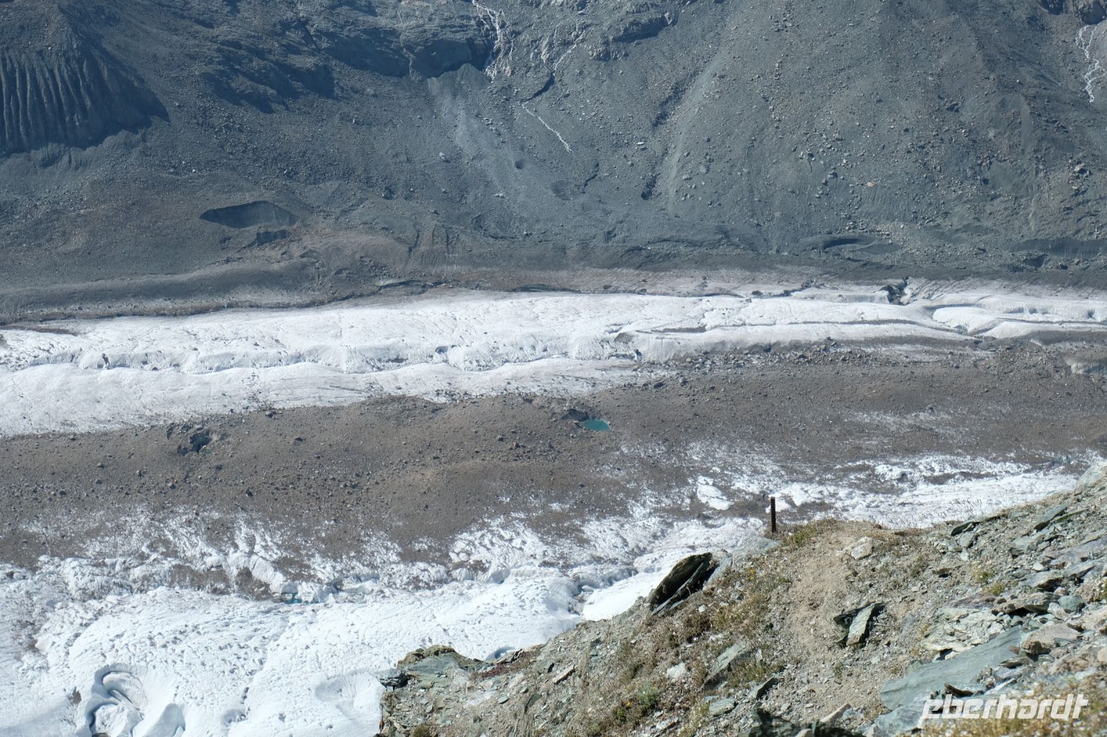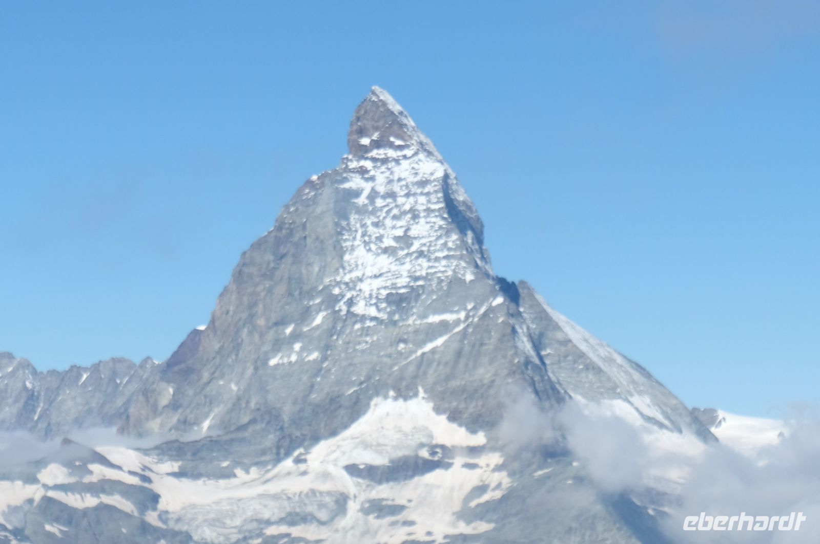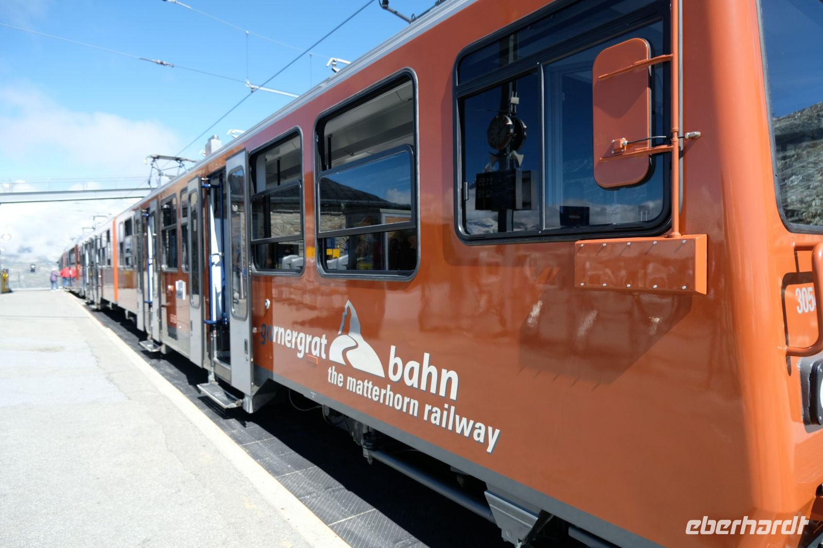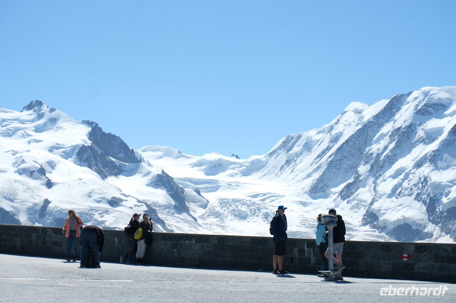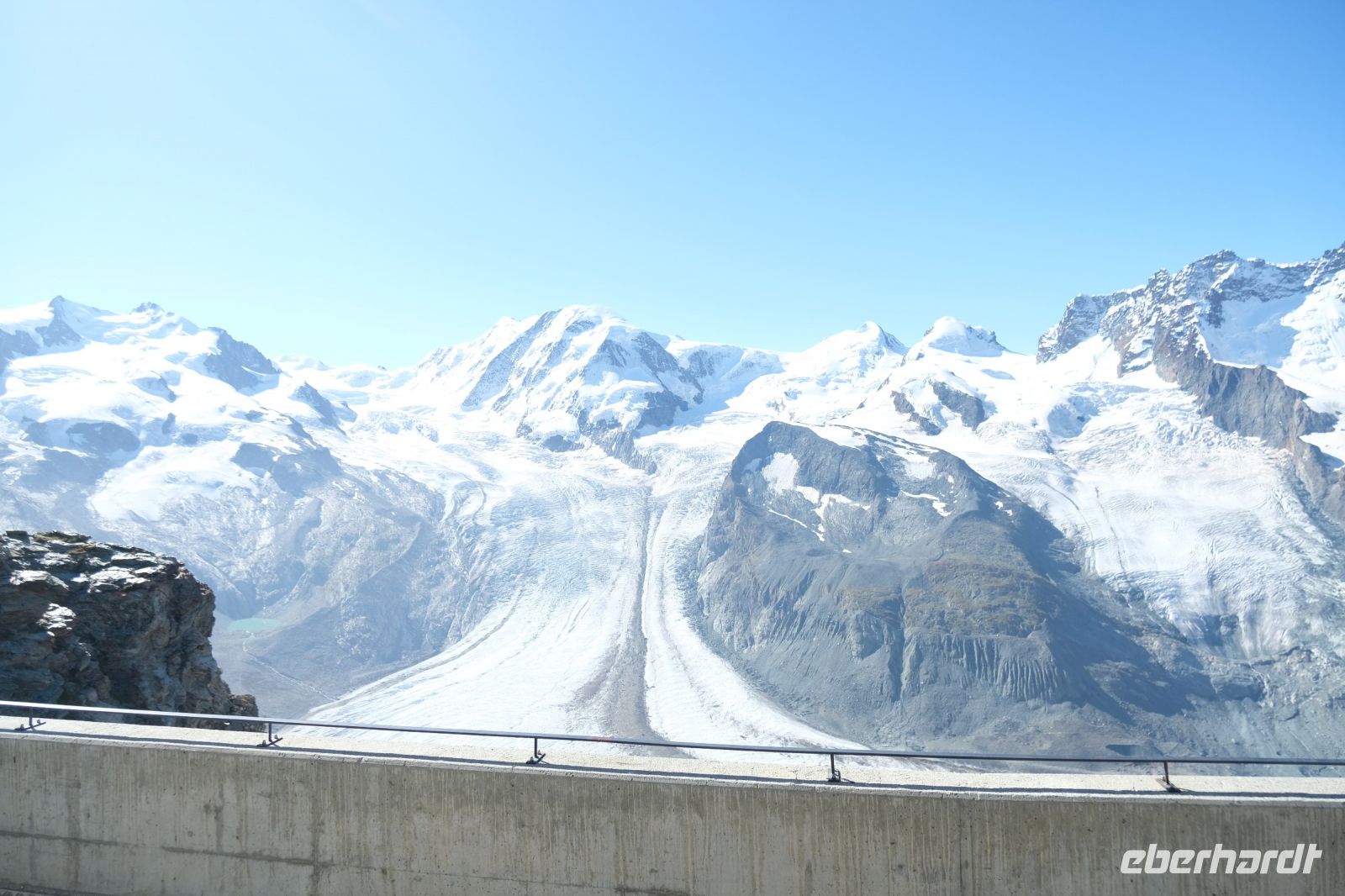 18 Personen hatten sich am Vorabend gemeldet, um mit mir auf den Gornergrat zu fahren. So fuhren wir 9.10 Uhr mit der höchsten, frei im Gelände angelegten Zahnradbahn Europas auf den 3089 m hohen Berg. Oben angekommen hatten wir bei strahlendem Sonnenschein einen fantastischen Blick auf einige Viertausender und natürlich auch auf das Matterhorn und die leider immer kleiner werdenden Gletscher. Das weitere Programm war dann ganz individuell angepasst, und jeder konnte seinen Abstieg selbst bestimmen.