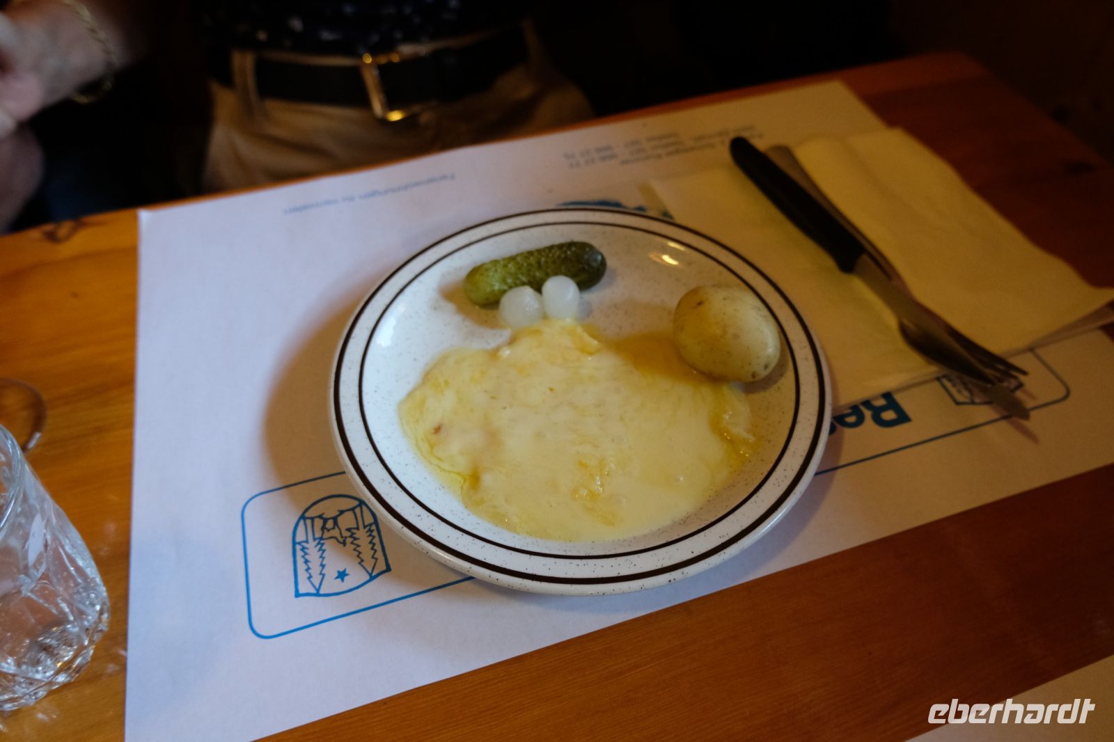 Im Restaurant gab es dann einen Vorspeisenteller, und als Höhepunkt „Raclette“ –geschmolzener Käse mit frischen kleinen Kartoffeln, Perlzwiebeln und Gurke – alles sehr lecker. Zum Abschluss Obstsalat.