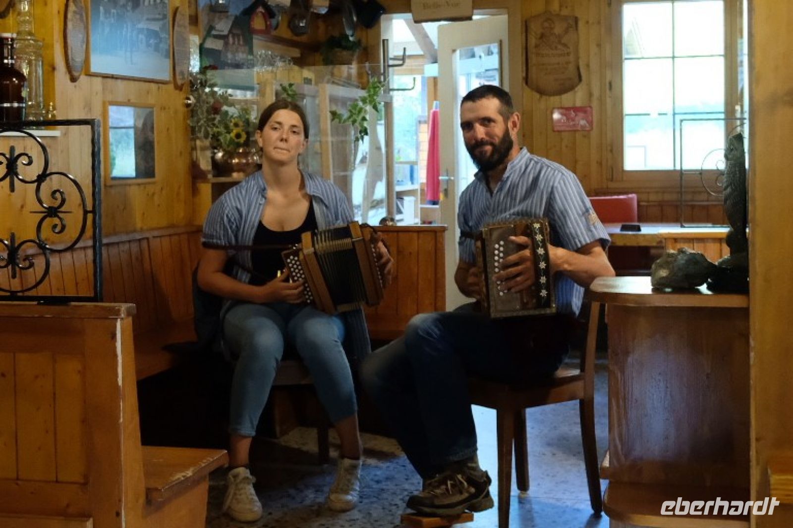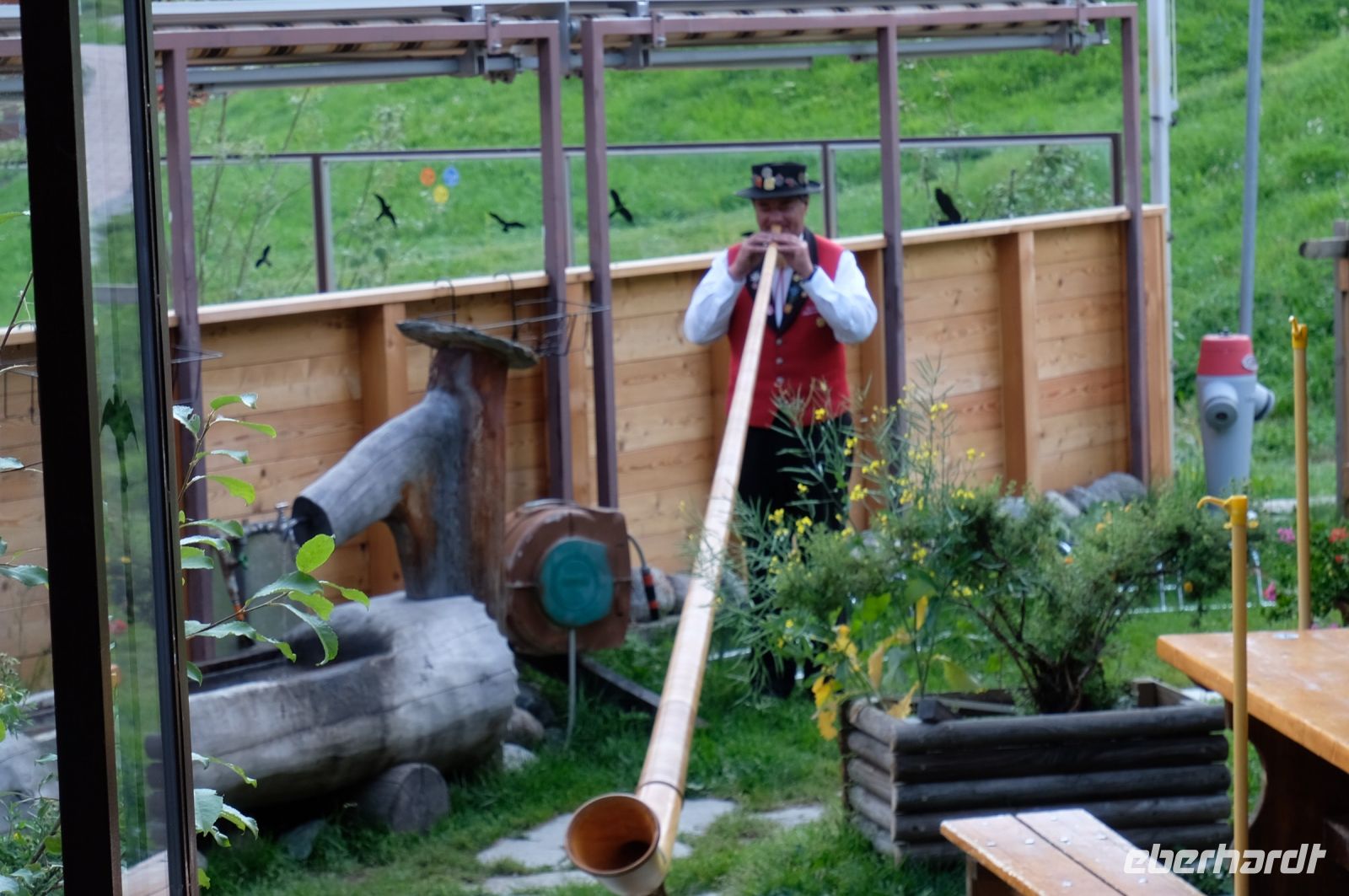 Das Abendessen wurde an diesem Abend nicht im Hotel gereicht, sondern wir fuhren mit der Kabinenbahn auf den Furi. In 1867 m Höhe wurden wir von den Wirtsleuten mit einem Aperitif begrüßt. Dazu spielte ein Alphornbläser auf der Terrasse, für alle Gäste ein schönes Erlebnis.
