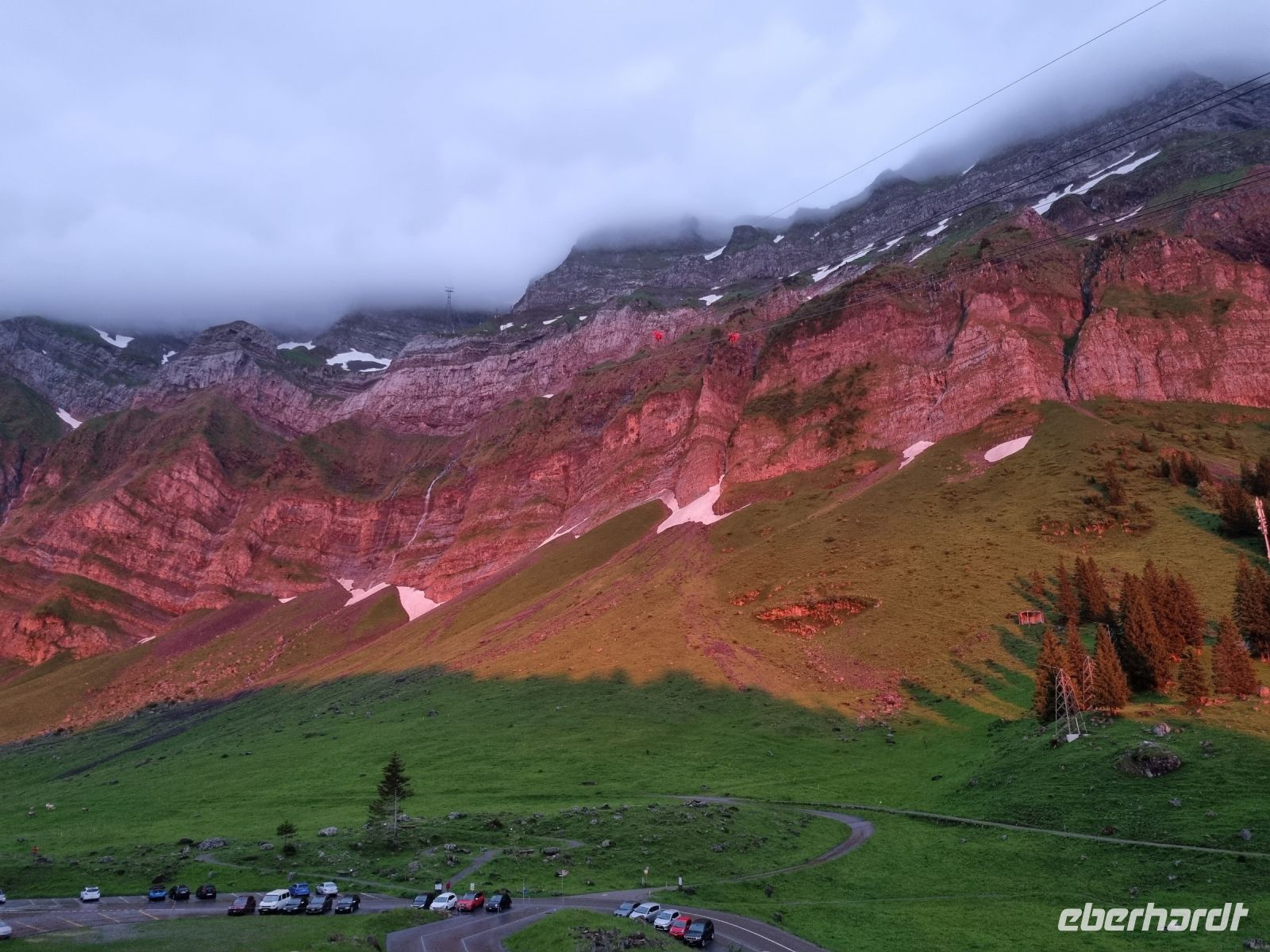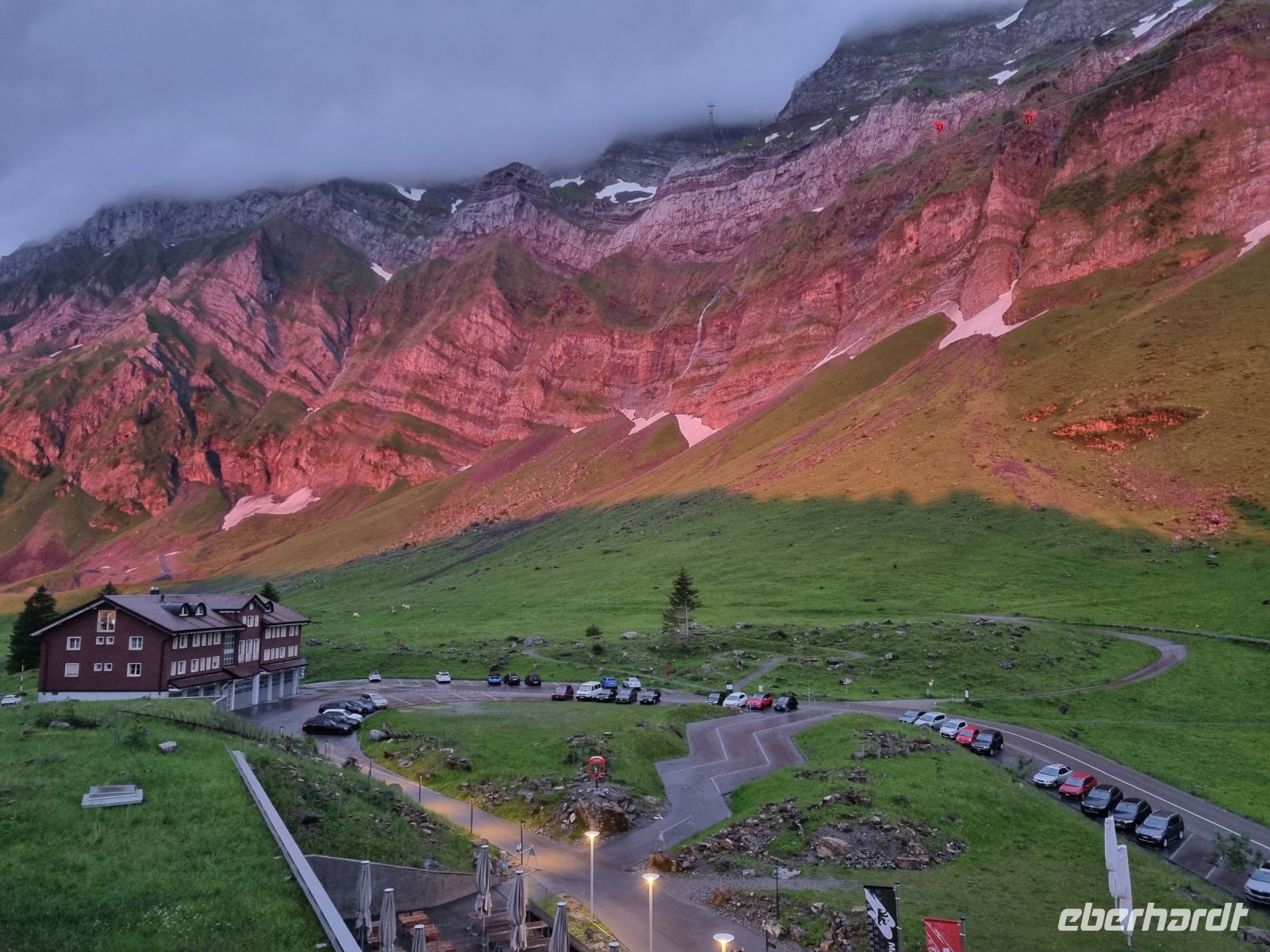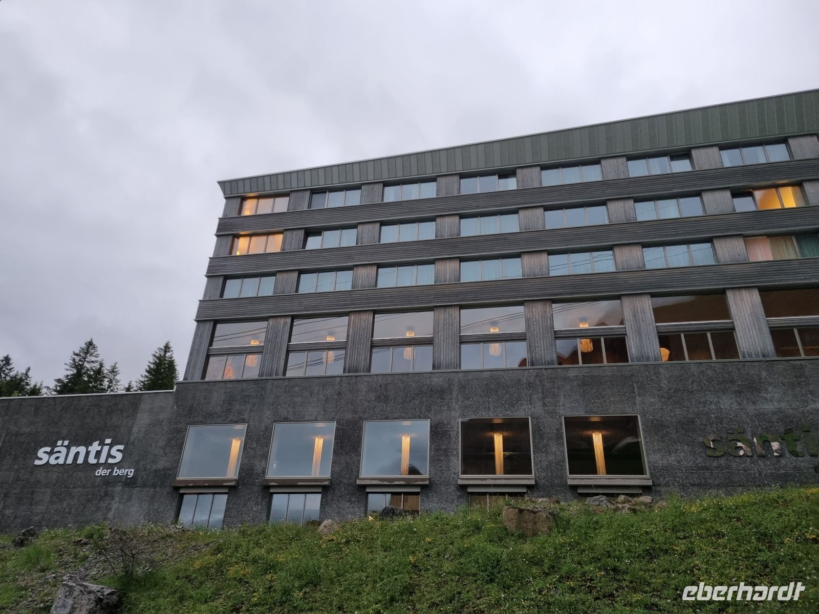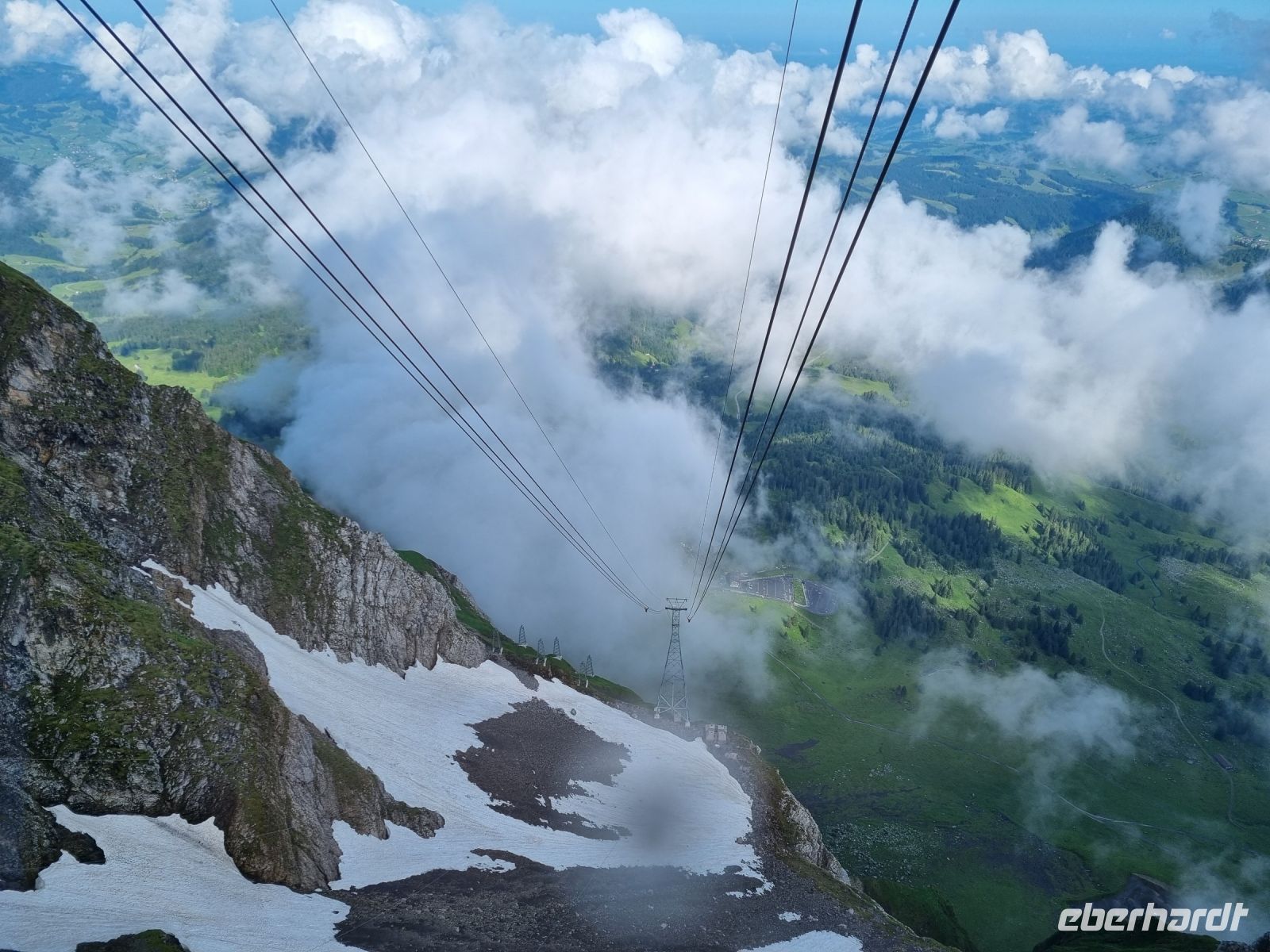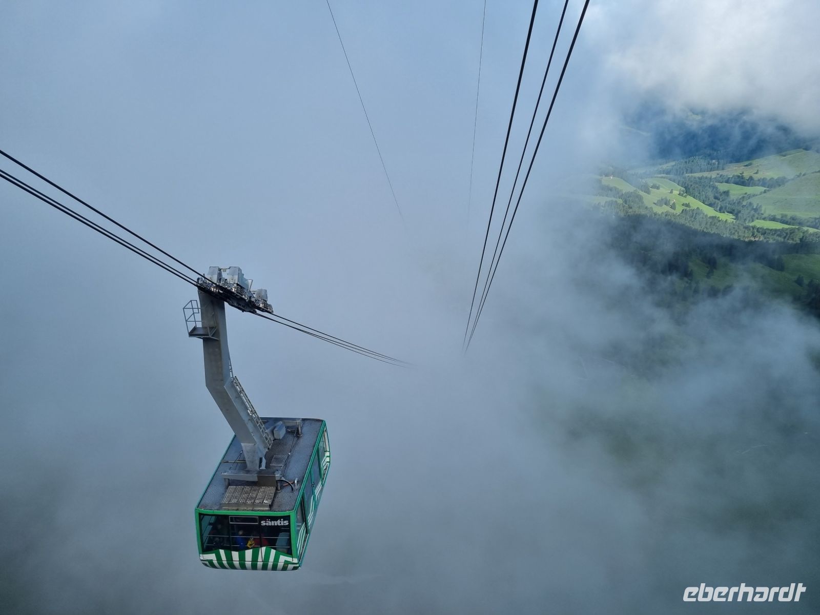Am Abreisetag ging es gleich früh mit der Säntis-Schwebebahn hinauf zum etwa 2.502 Meter hohen Säntis. Dort nahmen wir unser letztes Frühstück ein - sozusagen ein "Panorama-Frühstück", das heute nur ab und an mit Panorama-Blicken überraschte! Es war wie ein Vorhang, der ab und an kurz aufgezogen wurde, aber letztendlich auch ganz schnell wieder zugezogen wurde. Schade, dass uns danach nicht mehr sehr viel Zeit verblieb, um auf ein besseres Wetter zu warten - wir hatten schließlich noch eine lange Heimreise vor uns. Glücklicherweise gibt es allerdings bei Eberhardt TRAVEL noch andere Reisen in die Schweiz, wo längere Aufenthalte auf der Schwägalp beziehungsweise auf dem Säntis vorgesehen sind.