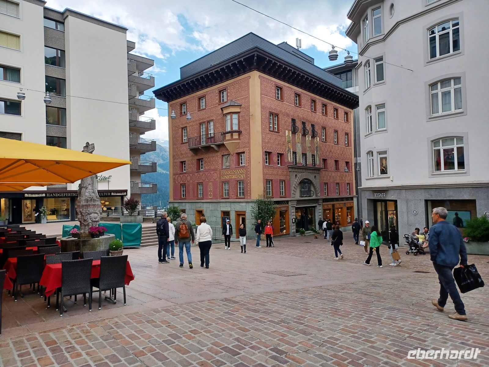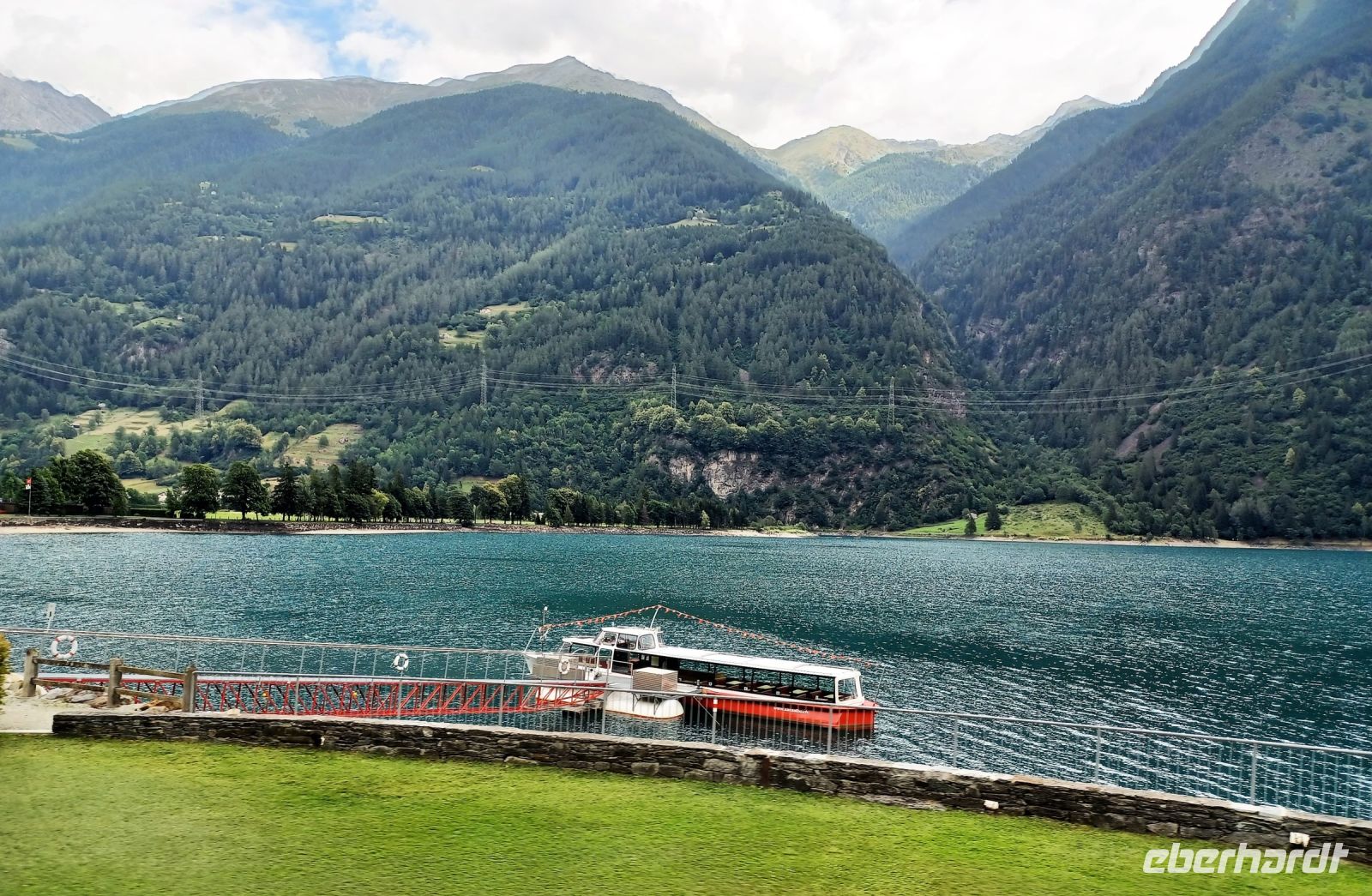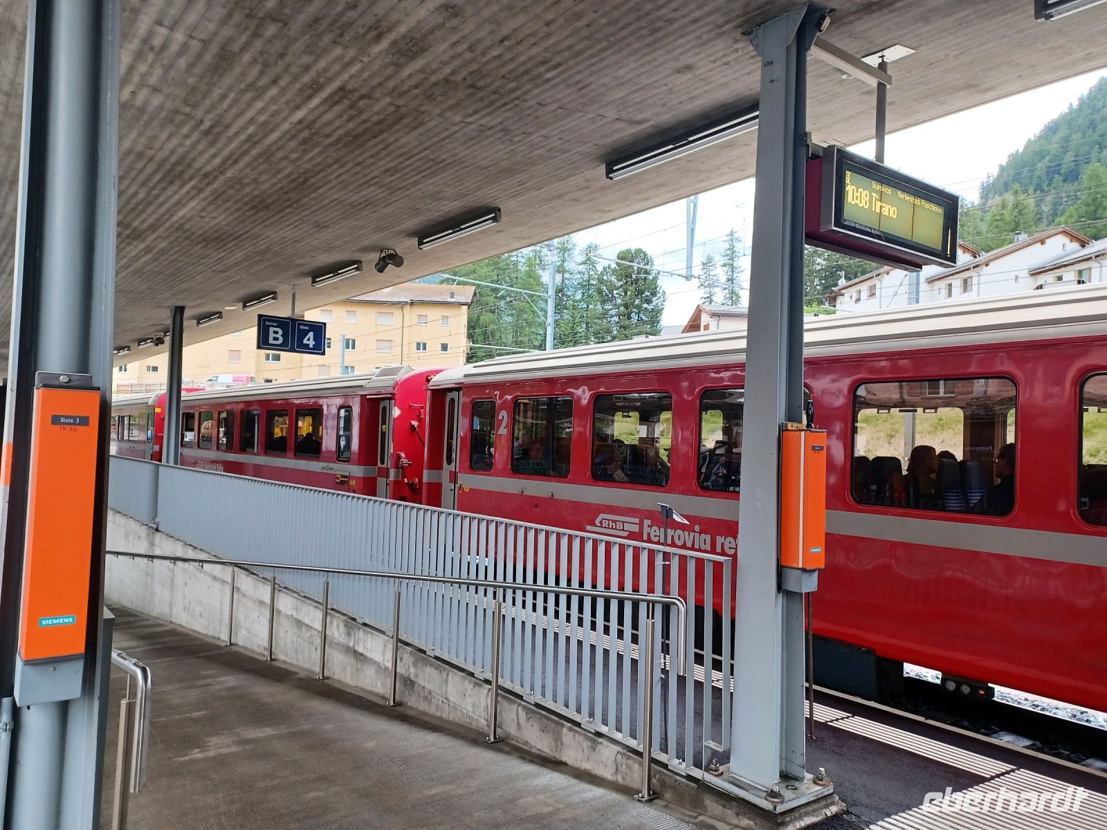 Als wir in Pontresina anlangen hat sich der Himmel etwas bezogen, aber der Blick zu den Bergen bleibt frei. Das ist auch wichtig, denn nun beginnt für uns eine besondere Zugreise: Die Fahrt mit dem Bernina-Express. Leider hat etwas mit der Reservierung nicht geklappt, trotzdem finden wir freie Plätze und können nun diese wunderbare Zugreise voll genießen. Rechts zeigt sich uns bald der mächtige Morteratsch-Gletscher, dann passieren wir den Bernina-Pass und bald bringt uns die Bahn wieder zu Tal. Ganz unten, klein wie ein Spielzeugdorf, zeigt sich uns Poschiavo. Im Tal angelangt fahren wir am gleichnamigen See entlang; hier zeigt sich uns nun eine mediterrane Vegetation. Das Ziel ist bald erreicht; im italienischen Tirano gönnen wir uns ein gutes Mittagessen beim Italiener und am zeitigen Nachmittag geht es nun mit dem Reisebus wieder zurück in das Engadin um hier unsere Rundfahrt mit dem Bus fortzusetzen. Ein wichtiger Ort ist St. Moritz, ihm statten wir an diesem Nachmittag einen Besuch ab und bekommen einen Eindruck des luxuriösen Lebens dieses Nobelortes.