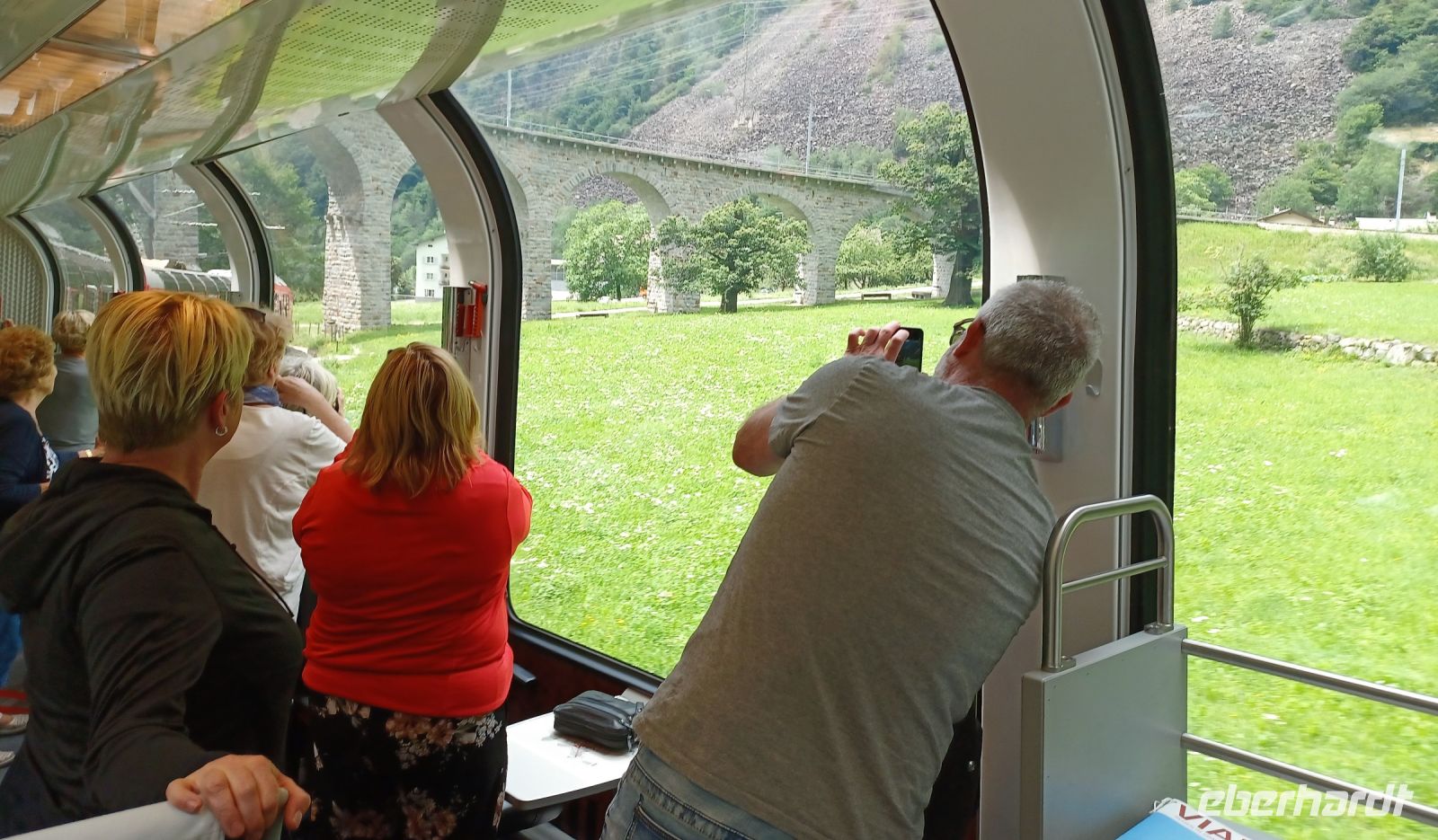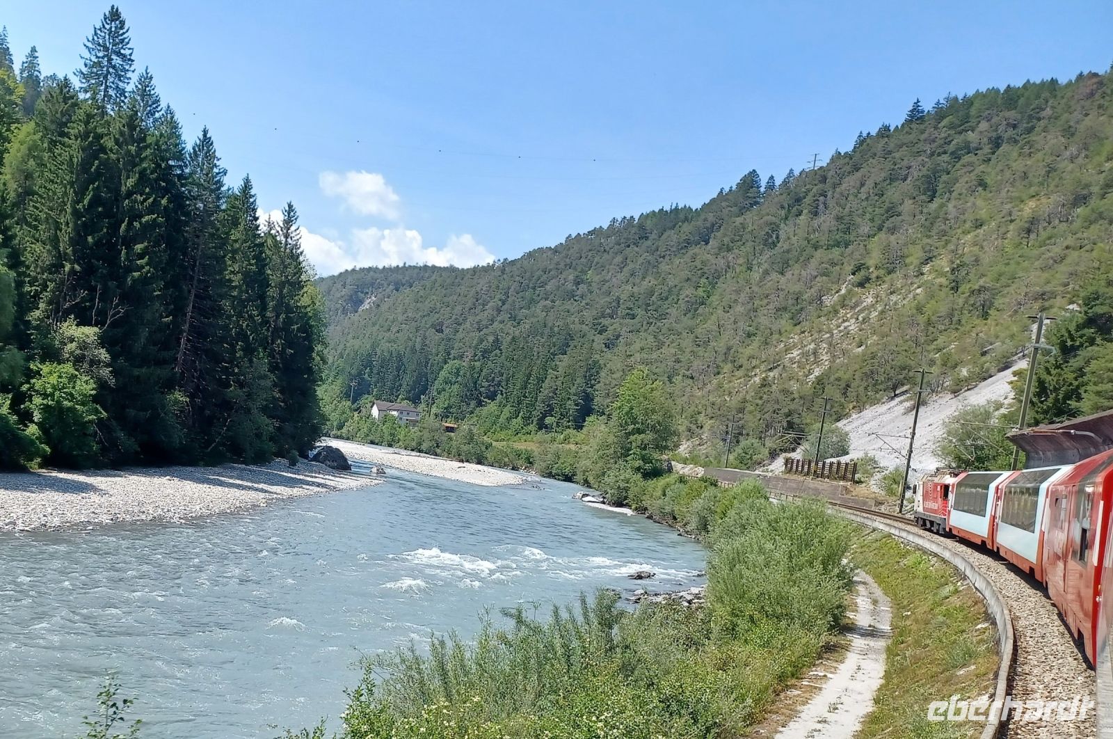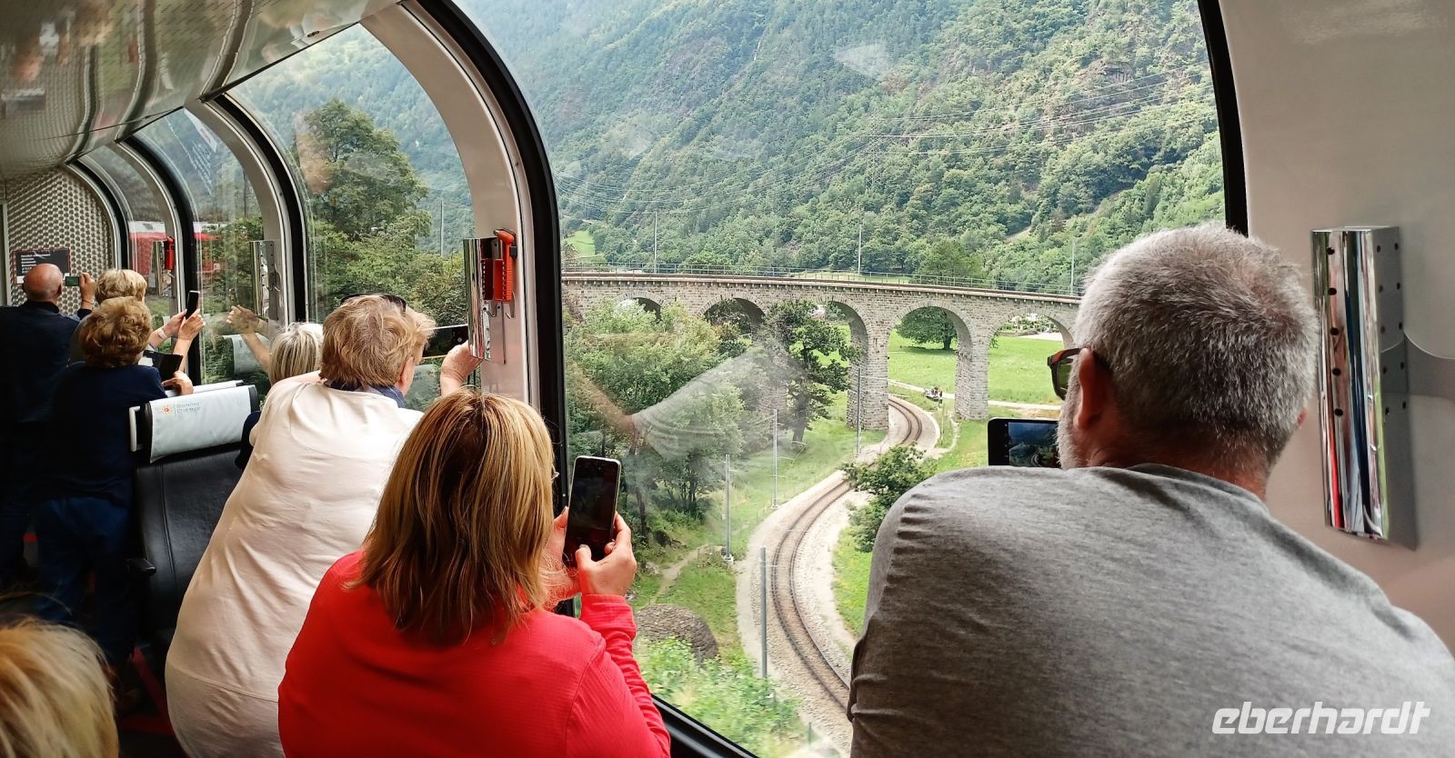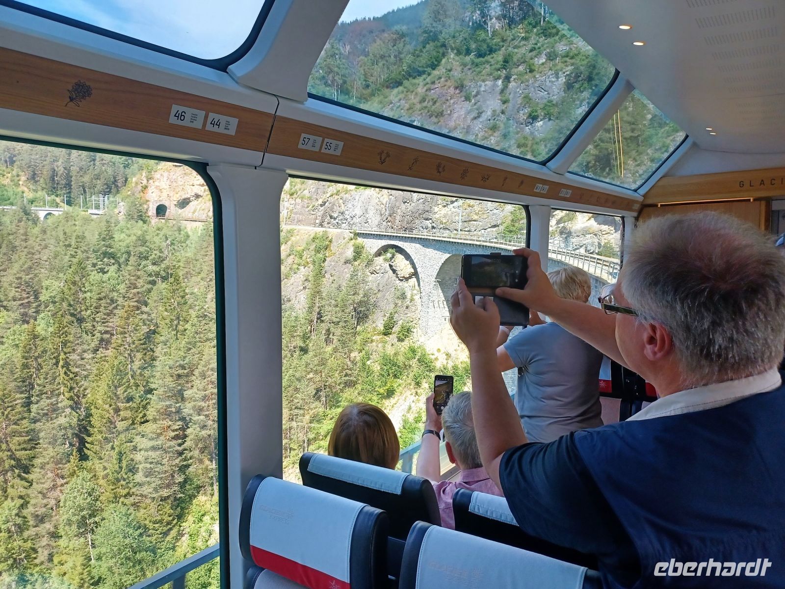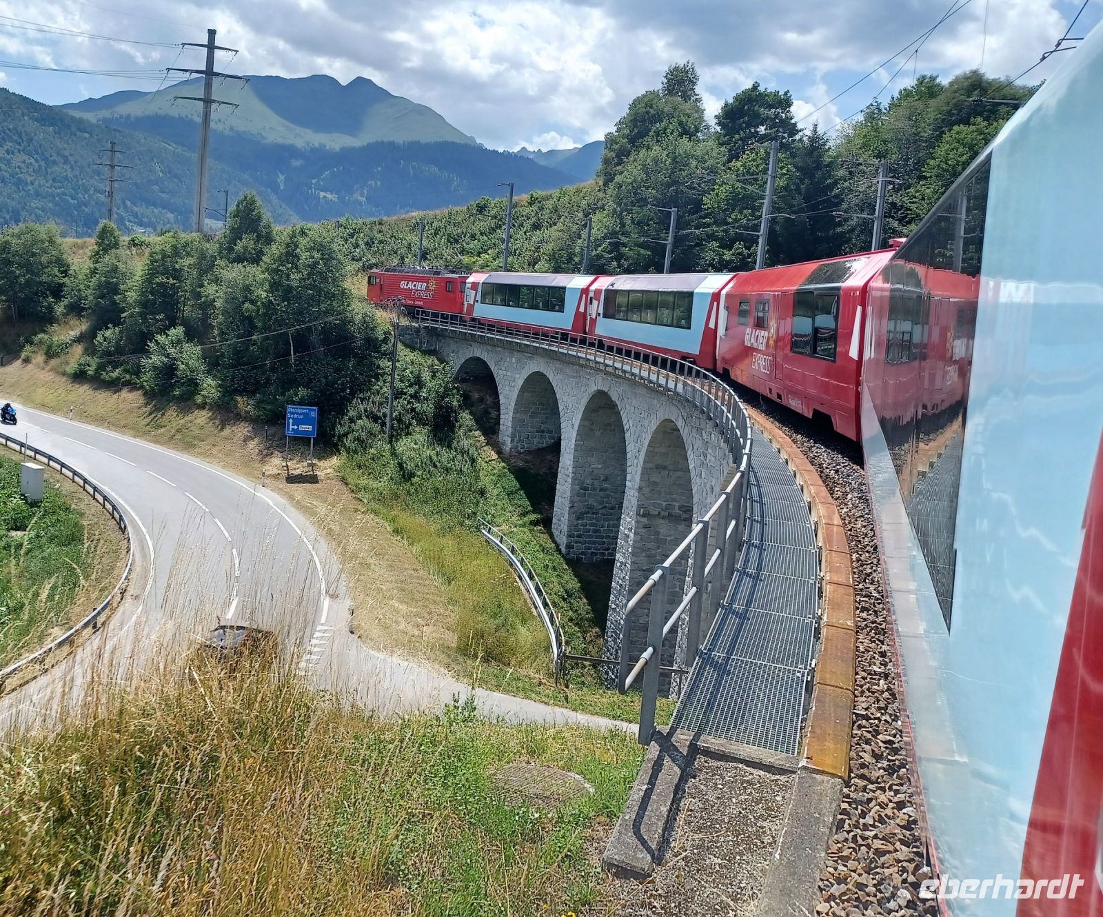 An diesem Vormittag zeigt sich uns wiederholt sonniges Wetter als wir uns gegen neun mit dem Bus aufmachen um zum Bahnhof zu gelangen. Wir haben eine kurze Fahrt mit der Regiobahn bis nach Filisur um hier nun in den berühmten Glacier-Express einzusteigen. Nach einer kleinen Wartezeit sehen wir den Zug oben am Berg und wenig später in den Bahnhof einfahren. Schnell sind wir eingestiegen und haben unsere Plätze gefunden. Die Fahrt verläuft zunächst noch durch Graubünden. Zahlreiche Höhepunkte erwarten uns hier: Die Überquerung des Flusses Landwasser auf dem spektakulären Viadukt, der Zusammenfluss des Rheines bei Reichenau und in der Kantonshauptstadt Chur ändern wir schließlich die Fahrtrichtung.