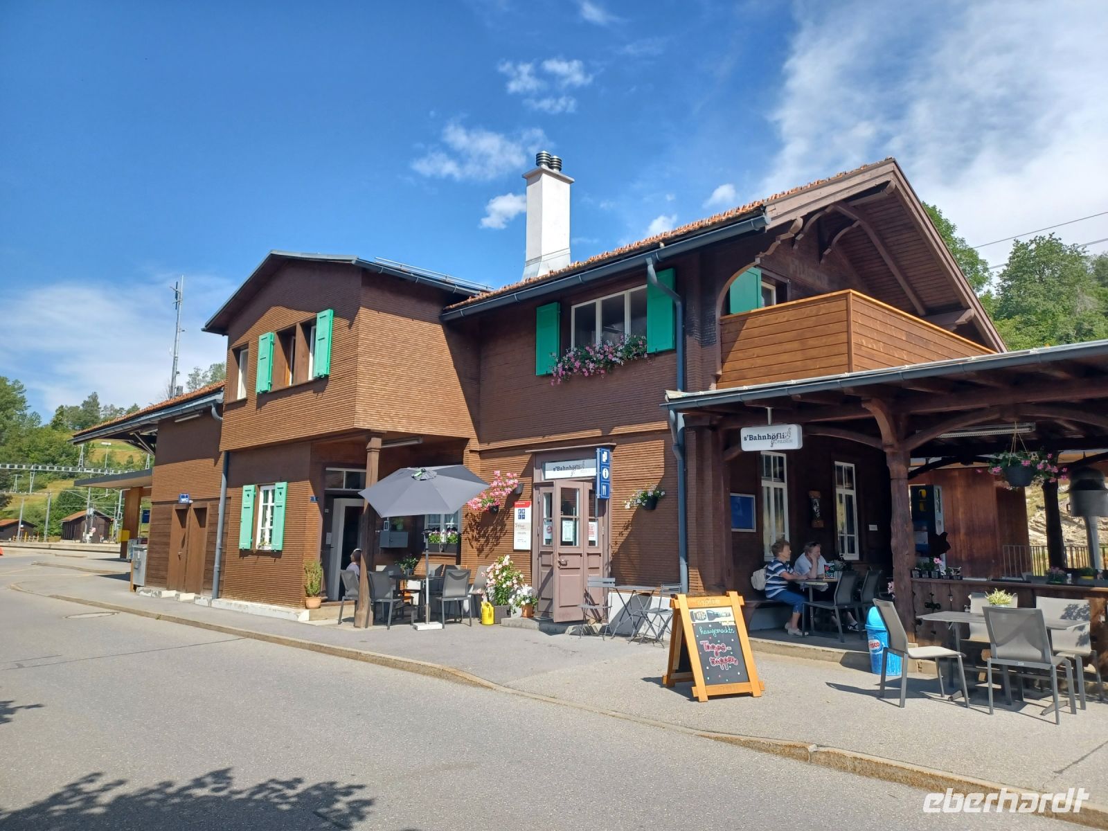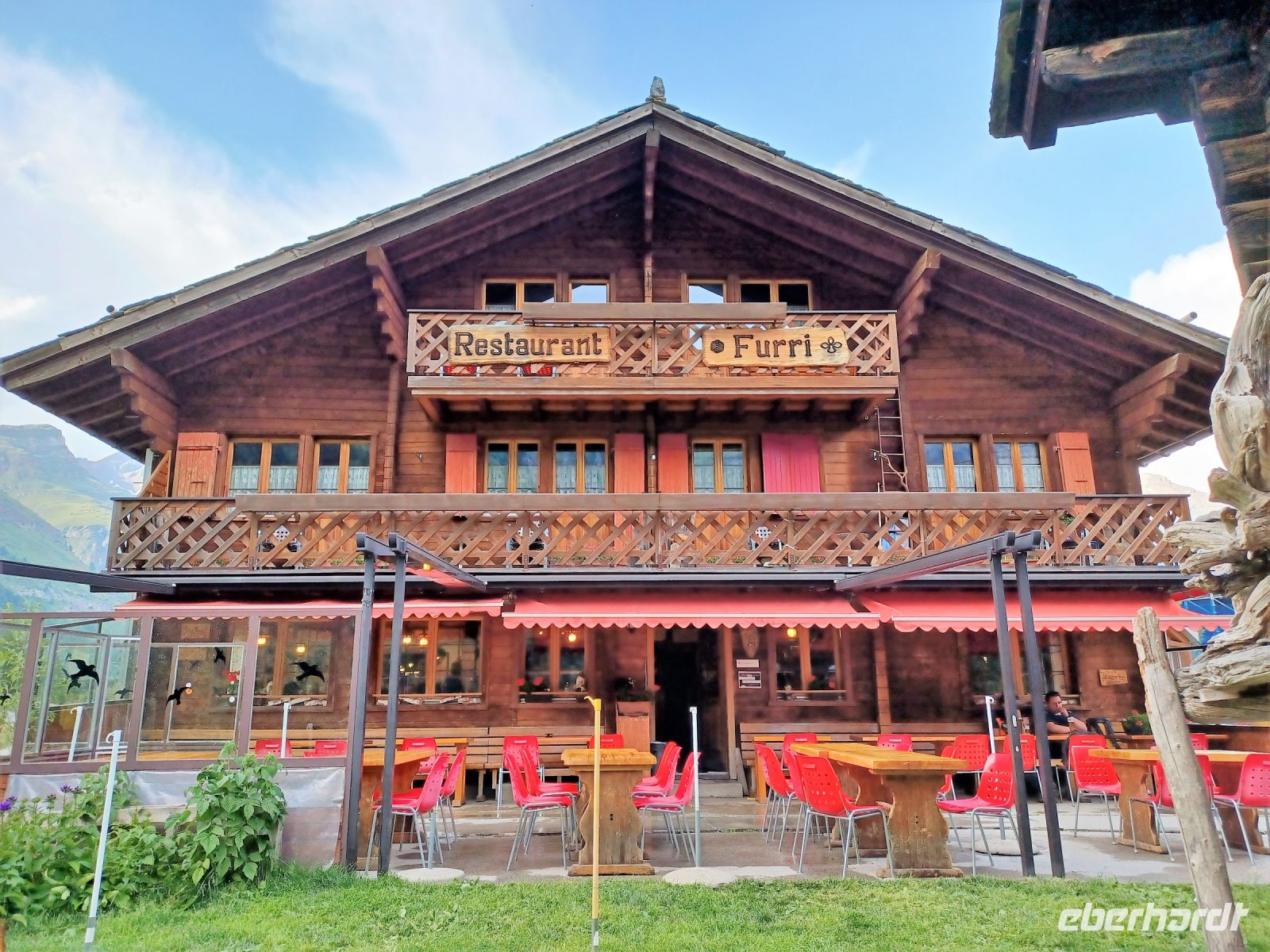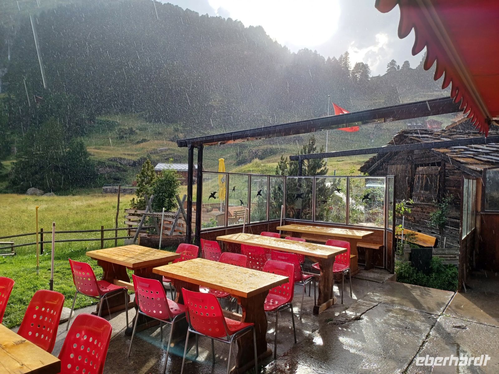 Zur mittäglichen Stärkung gibt es ein schönes Restaurant mit Terrasse und dem Blick zu den Bergen.