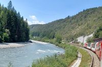 Nun treten die Berge ganz nahe an die Fahrstrecke heran; zwischen steilen Felsen schlängelt sich der an dieser Stelle sehr wilde Rhein durchs schmale Tal und wir folgen ihm aufwärts. Bald haben wir den Ort Disentis erreicht, ab hier geht es mithilfe der Zahnradtechnik hinauf zum Oberalppass; nun zeigt sich uns eine hochalpine Landschaft.