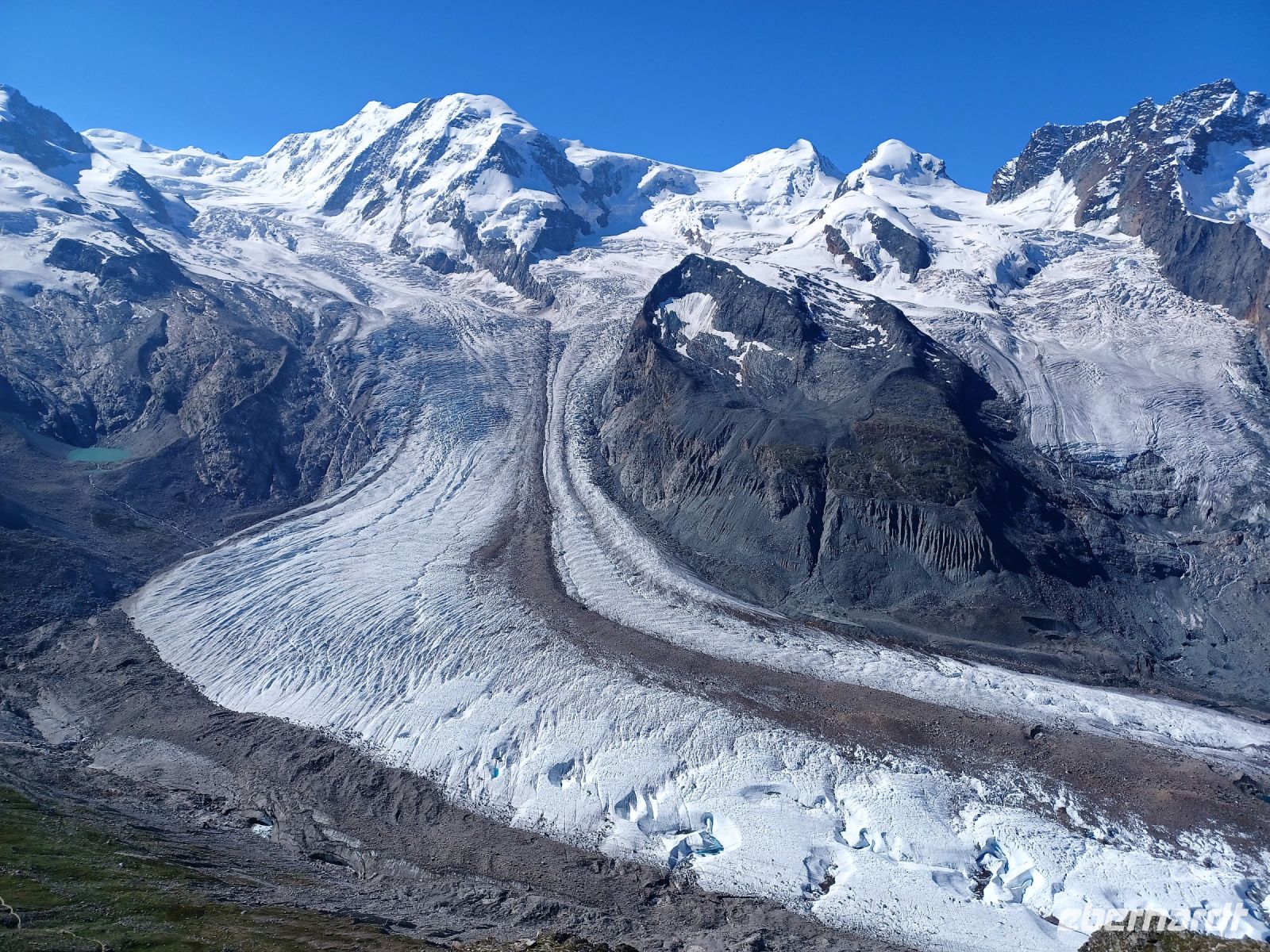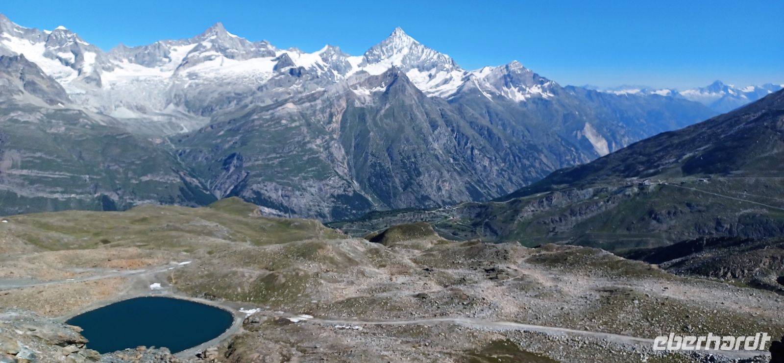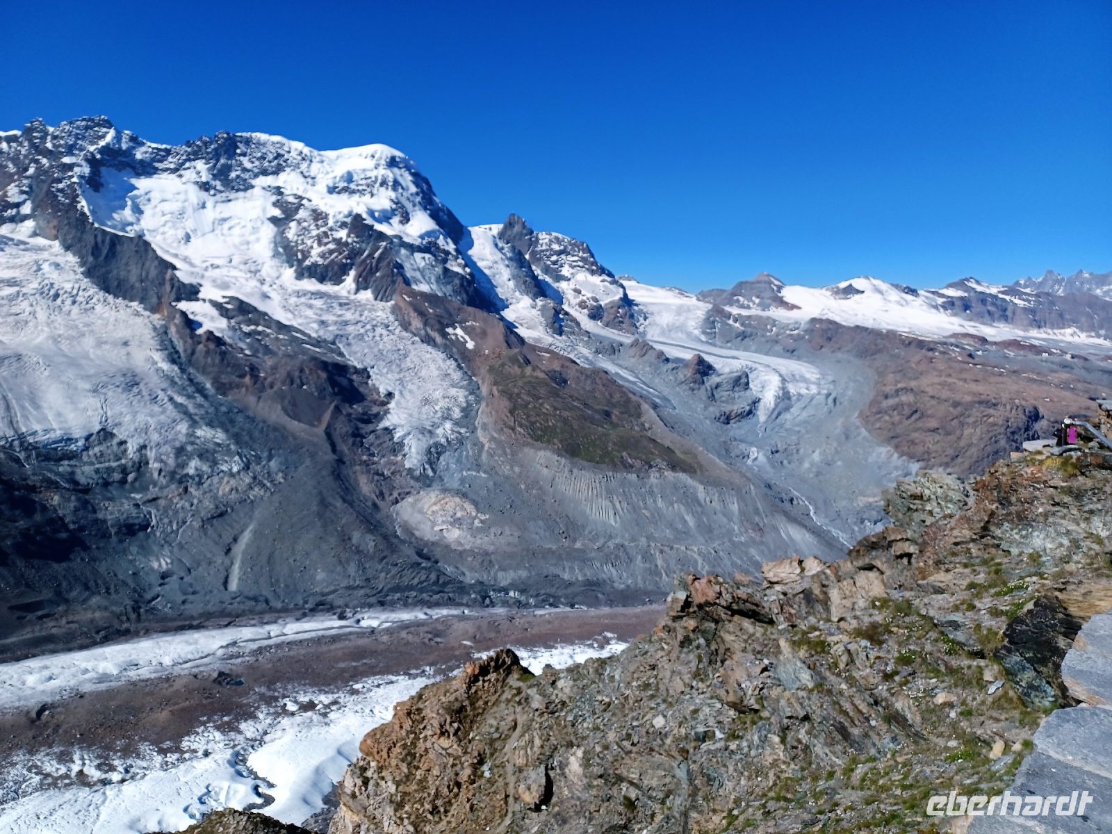 11.7.2023. Als wir uns an diesem Vormittag aufmachen um mithilfe der Zahnradbahn den Gornergrat zu erklimmen, haben sich auch die letzten Wolken verzogen. Der Himmel zeigt sich uns in diesem besonderen Blau welches es nur im Gebirge gibt und voller Erwartungen beginnen wir den Aufstieg. Immer wieder geht der Blick hinüber zum Matterhorn welches sich uns wie mit Puderzucker überstreut zeigt. Bald tauchen auch die anderen 4 000er auf; das strahlende Weiß des ewigen Schnees bildet zum blauen Himmel einen einmaligen Kontrast und auf den grün-bunten Gebirgswiesen tummeln sich die Murmeltiere. Bald langen wir auf gut 3 000 Meter an; auf dieser Höhe zeigt sich uns die ganze grandiose Bergkulisse die Zermatt umgibt, hier oben ist es unbeschreiblich schön! Wohin das Auge blickt: Schneebedeckte Gipfel, tief unten begibt sich der majestätische Gletscher langsam, von unseren Augen unbemerkt, auf seinen unaufhaltsamen Weg zu Tal – diese Wunder der Natur ziehen den Betrachter unwillkürlich in seinen Bann. Der Anblick dieser Berggiganten lässt uns klein und verletzlich erscheinen, uns Menschen, die wir immer meinen, die Herrschaft über die Natur zu haben…
