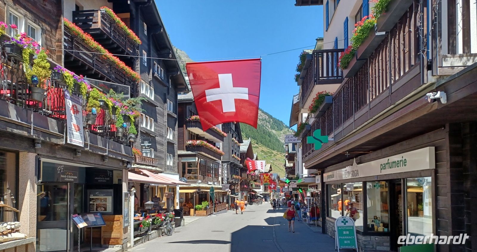 Am Nachmittag lohnt ein Bummel durch Zermatt; die Bahnhofstraße mit ihren schönen Geschäften lädt zum Shoppen ein und die zahlreichen Cafés bieten eine willkommene Einkehr zu Kaffee und Kuchen. Hier, zwischen Kirche, Murmeltierbrunnen und Bergsteigerfriedhof vergeht uns die Zeit wie im Flug.