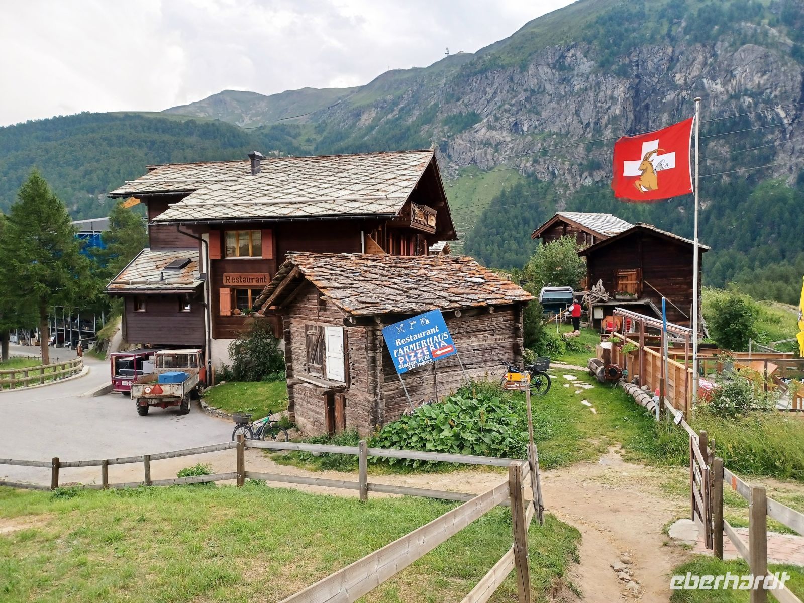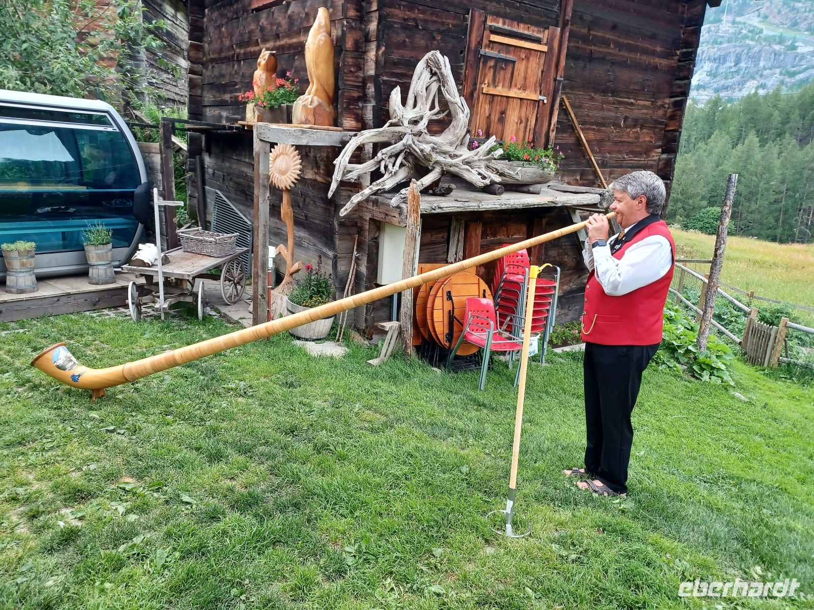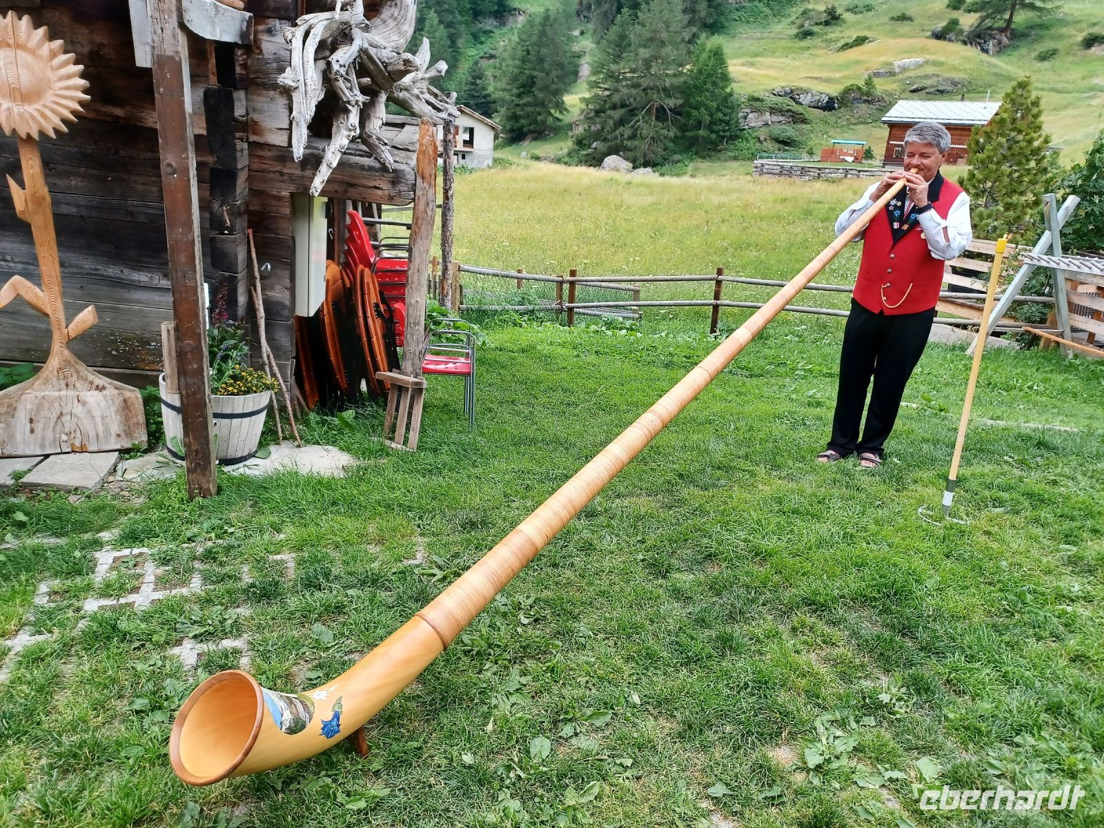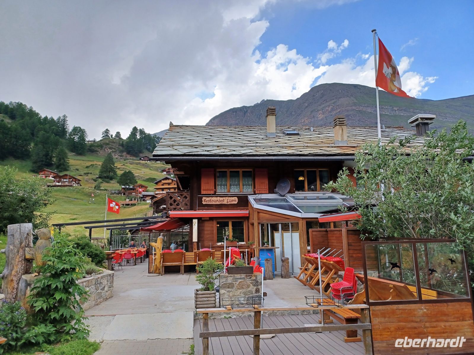 Als sich die Sonne langsam den Bergen zuneigt, hat sich unsere Reisegruppe wieder versammelt; wir spazieren entlang der rauschenden Vispa einem besonderen Erlebnis entgegen: einem Folkloreabend auf der Berghütte „Furri“. Auf unserem Weg dorthin kommen Wolken auf und scheinen das schöne Wetter beenden zu wollen. Dennoch: Voller Vorfreude steigen wir in die Gondeln der Bergbahn, sie bringen uns hinauf nach Furi. Nur wenige Schritte und wir sind am urigen Berggasthof angelangt. Hier oben herrscht jene Ruhe die für die Berge so typisch ist. Um den Genuss noch zu erhöhen, hat ein Alphornbläser Aufstellung genommen und ihm lauschen wir, während uns ein kleines Getränk von den Gastgebern serviert wird. Leider kommen nun aber weitere dunkle Wolken über die Berge gezogen, dicke Regentropfen fallen und wir müssen unsere andächtige Ruhe aufgeben und ins Trockene flüchten. Das stört wenig, denn hier unterhält uns fortan ein Akkordeonspieler mit den Melodien der Schweizer Berge; wenig später genießen wir eine der traditionellen Schweizer Speisen: Raclette. Schnell füllt der würzige Geruch geschmolzenen Käses den Gastraum – es ist am Ende dieses schönen Tages ein würdiger Abschluss!