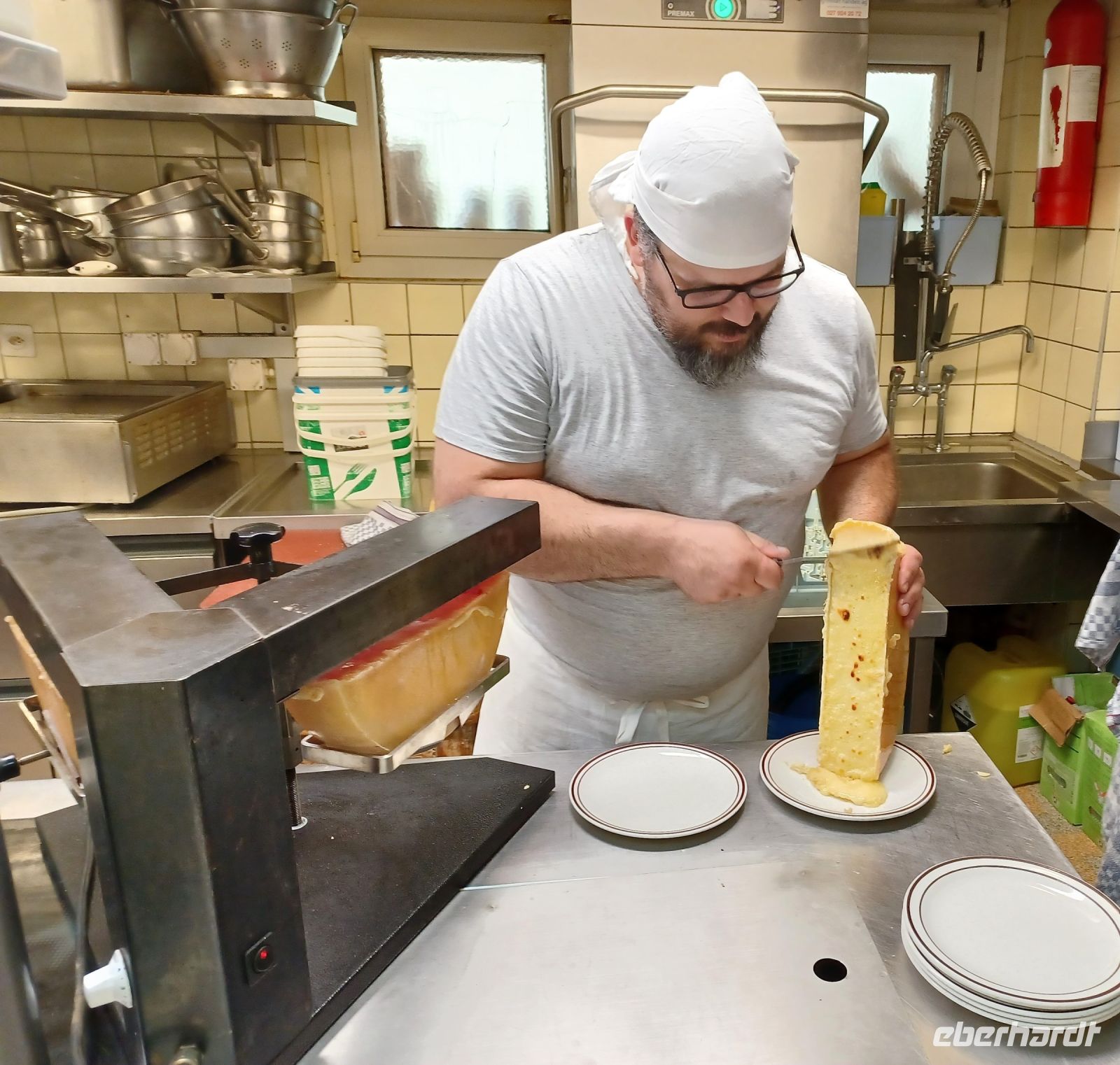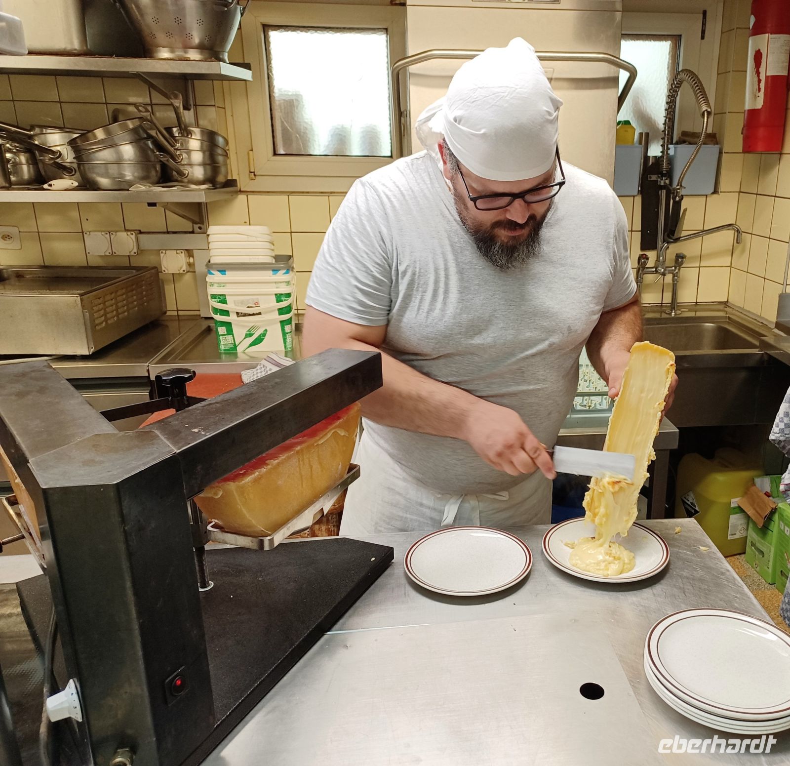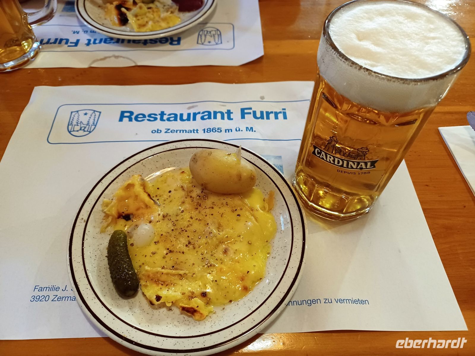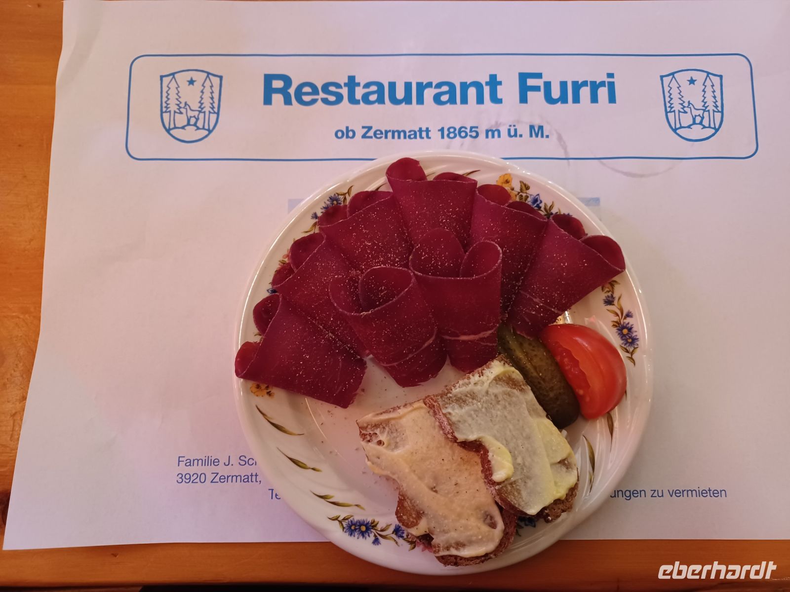 Als sich die Sonne langsam den Bergen zuneigt, hat sich unsere Reisegruppe wieder versammelt; wir spazieren entlang der rauschenden Vispa einem besonderen Erlebnis entgegen: einem Folkloreabend auf der Berghütte „Furri“. Auf unserem Weg dorthin kommen Wolken auf und scheinen das schöne Wetter beenden zu wollen. Dennoch: Voller Vorfreude steigen wir in die Gondeln der Bergbahn, sie bringen uns hinauf nach Furi. Nur wenige Schritte und wir sind am urigen Berggasthof angelangt. Hier oben herrscht jene Ruhe die für die Berge so typisch ist. Um den Genuss noch zu erhöhen, hat ein Alphornbläser Aufstellung genommen und ihm lauschen wir, während uns ein kleines Getränk von den Gastgebern serviert wird. Leider kommen nun aber weitere dunkle Wolken über die Berge gezogen, dicke Regentropfen fallen und wir müssen unsere andächtige Ruhe aufgeben und ins Trockene flüchten. Das stört wenig, denn hier unterhält uns fortan ein Akkordeonspieler mit den Melodien der Schweizer Berge; wenig später genießen wir eine der traditionellen Schweizer Speisen: Raclette. Schnell füllt der würzige Geruch geschmolzenen Käses den Gastraum – es ist am Ende dieses schönen Tages ein würdiger Abschluss!