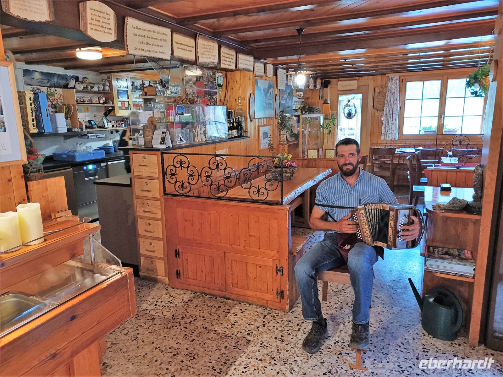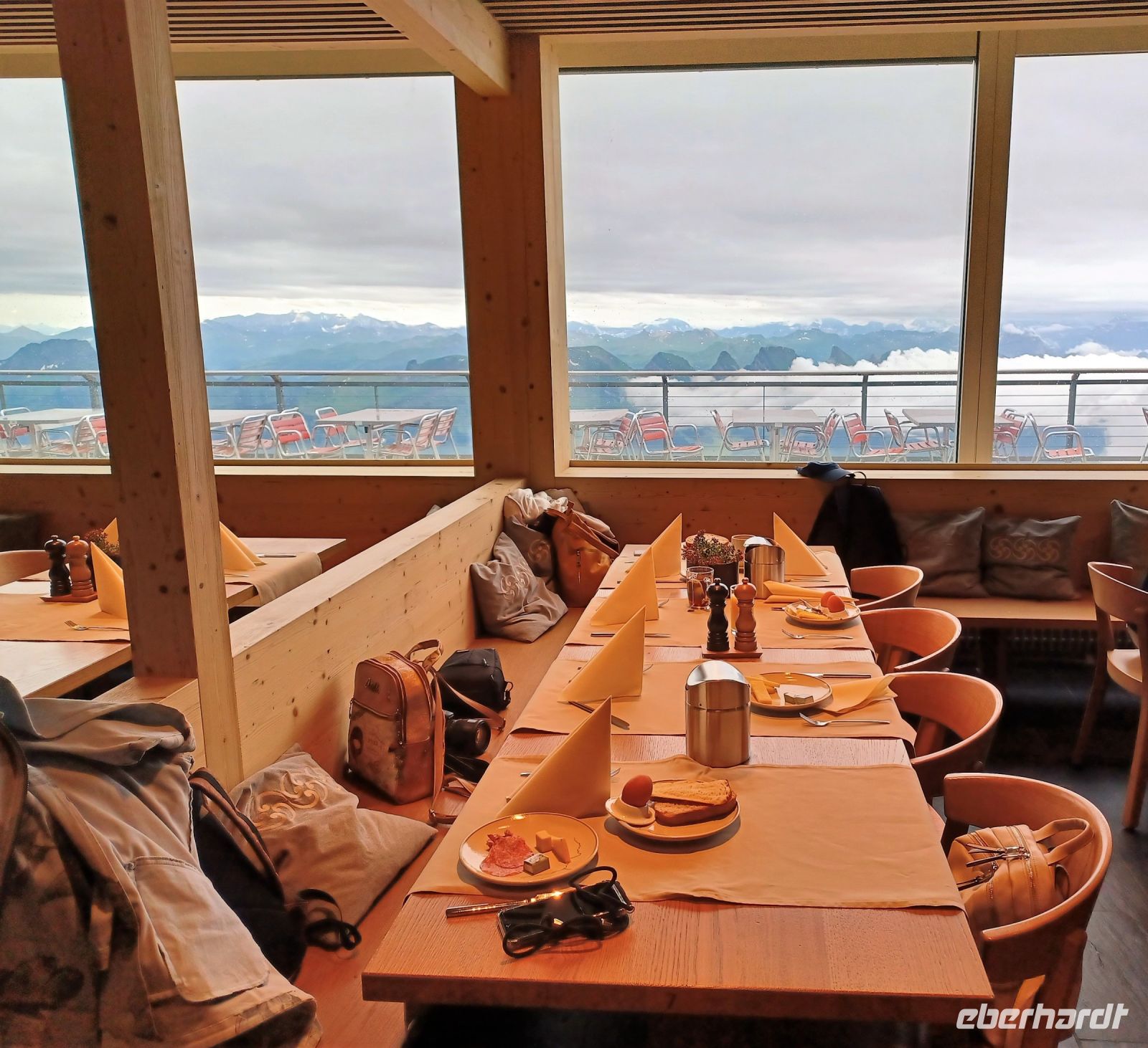 Im Restaurant ist für unsere Gruppe nun ein sehr reichhaltiges Buffet aufgebaut; während würziger Kaffeeduft den Raum durchdringt, lassen wir es uns gut schmecken. Der Blick schweift immer wieder hinaus zur Bergwelt. Im nächsten Augenblick ist gar nichts mehr zu sehen, eine Wolke zieht über uns hinweg und taucht alles in einen milchigen Nebel. Dieses Wechselspiel auf über 2 000 Metern ist schon irgendwie faszinierend!