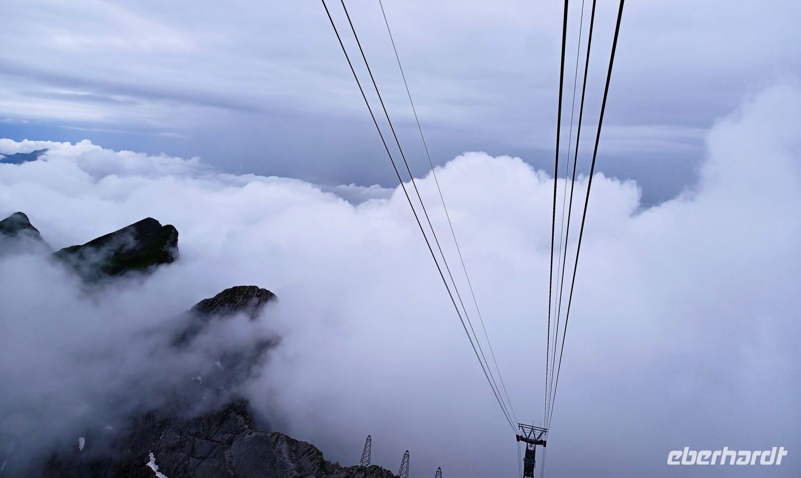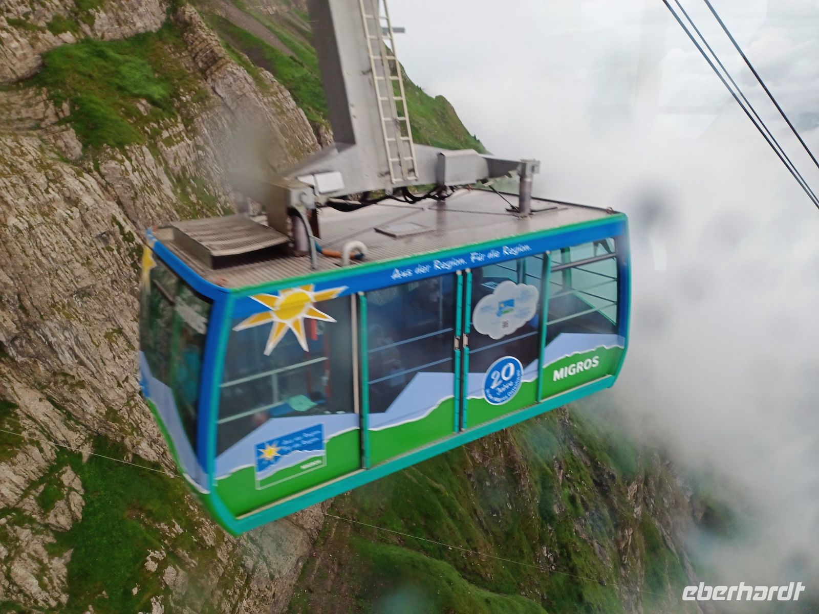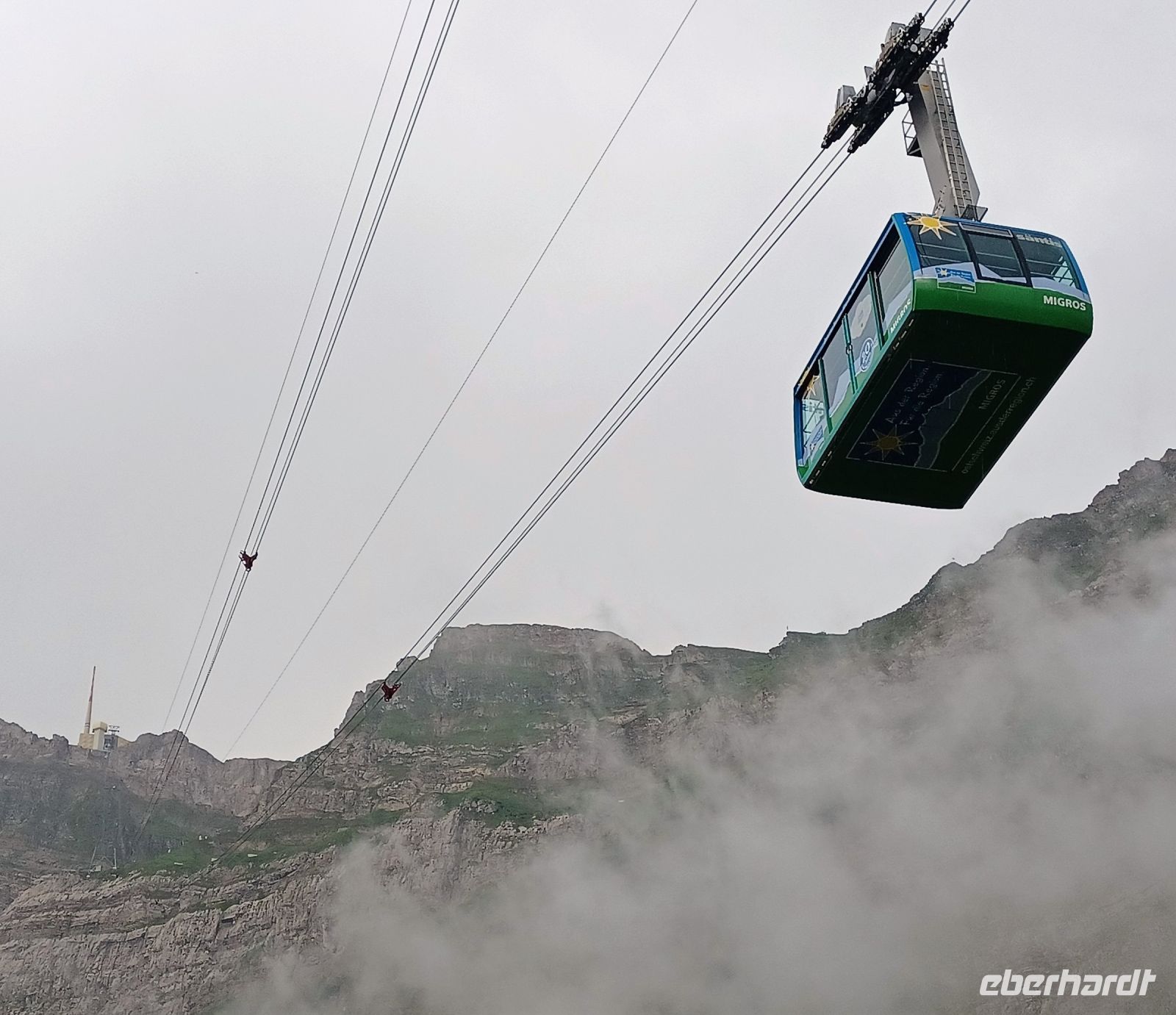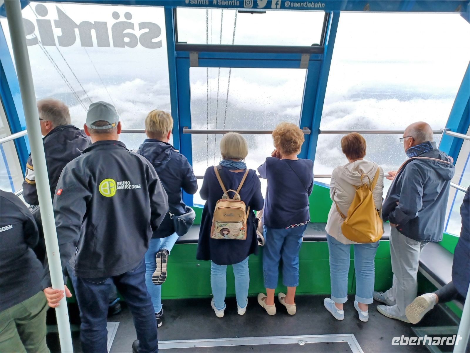 13.7.2023. Heute haben wir unser Frühstück an einem besonderen Ort. Hoch oben auf der Säntis-Spitze befindet sich das Bergrestaurant. Als wir die Koffer in den Bus laden, ist der Berg frei von Wolken, das lässt hoffen. Als wir aber mit der großen Gondel aufwärts fahren, umgibt uns das Gebräu einer mächtigen Wolke. Regentropfen klatschen an die Fenster der Bahn, aber kurz vor der Spitze durchdringen wir den Nebel und der Blick wird frei auf einen Teil der gigantischen Berge, darunter liegt die Wolkendecke – ein einmaliger Anblick.