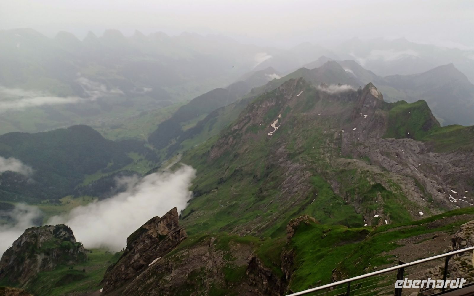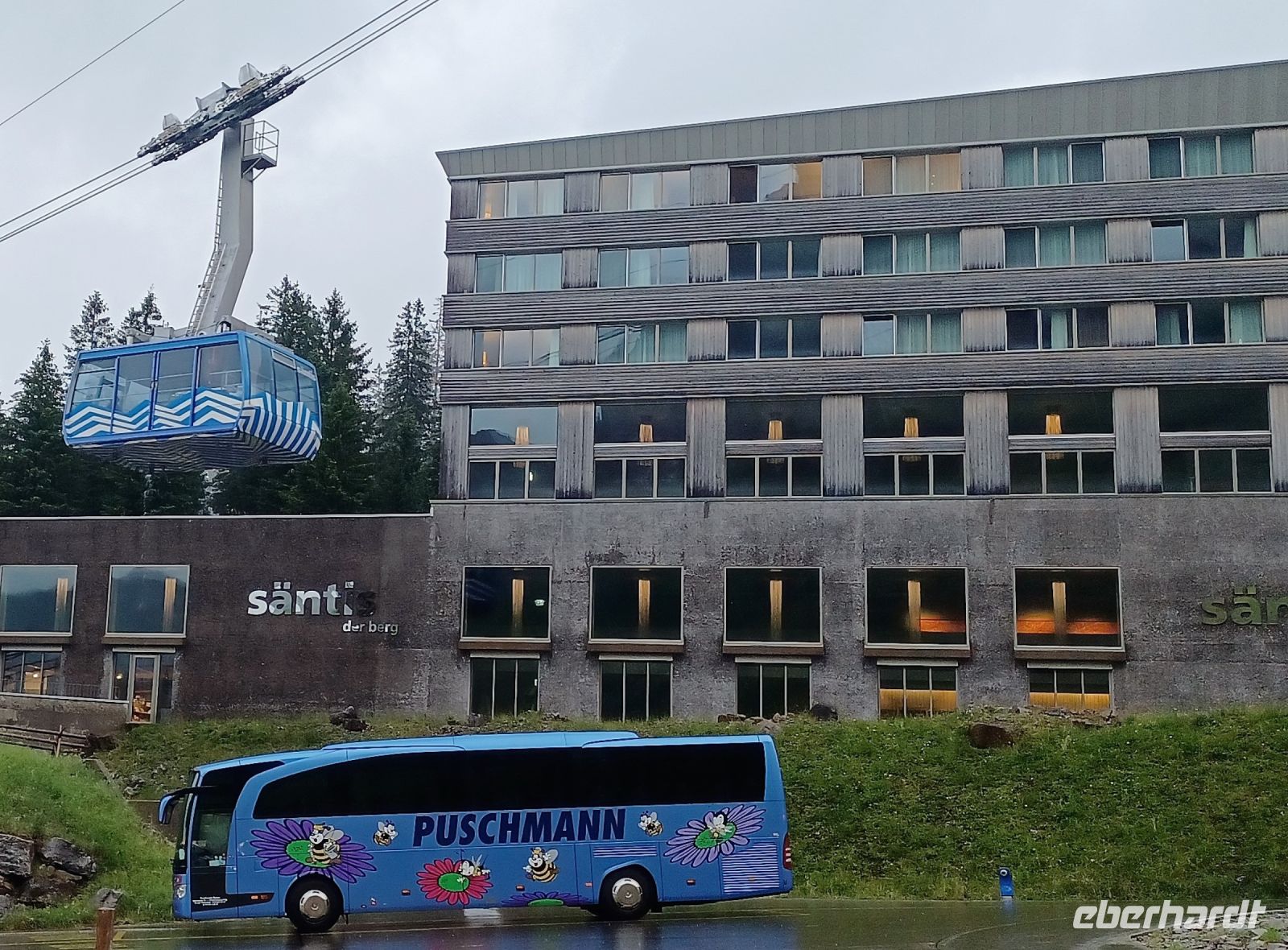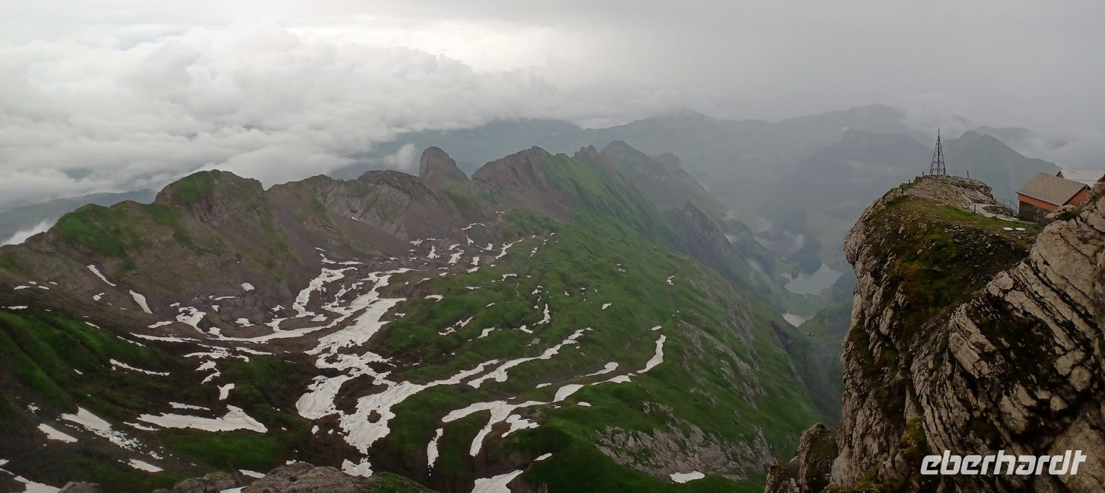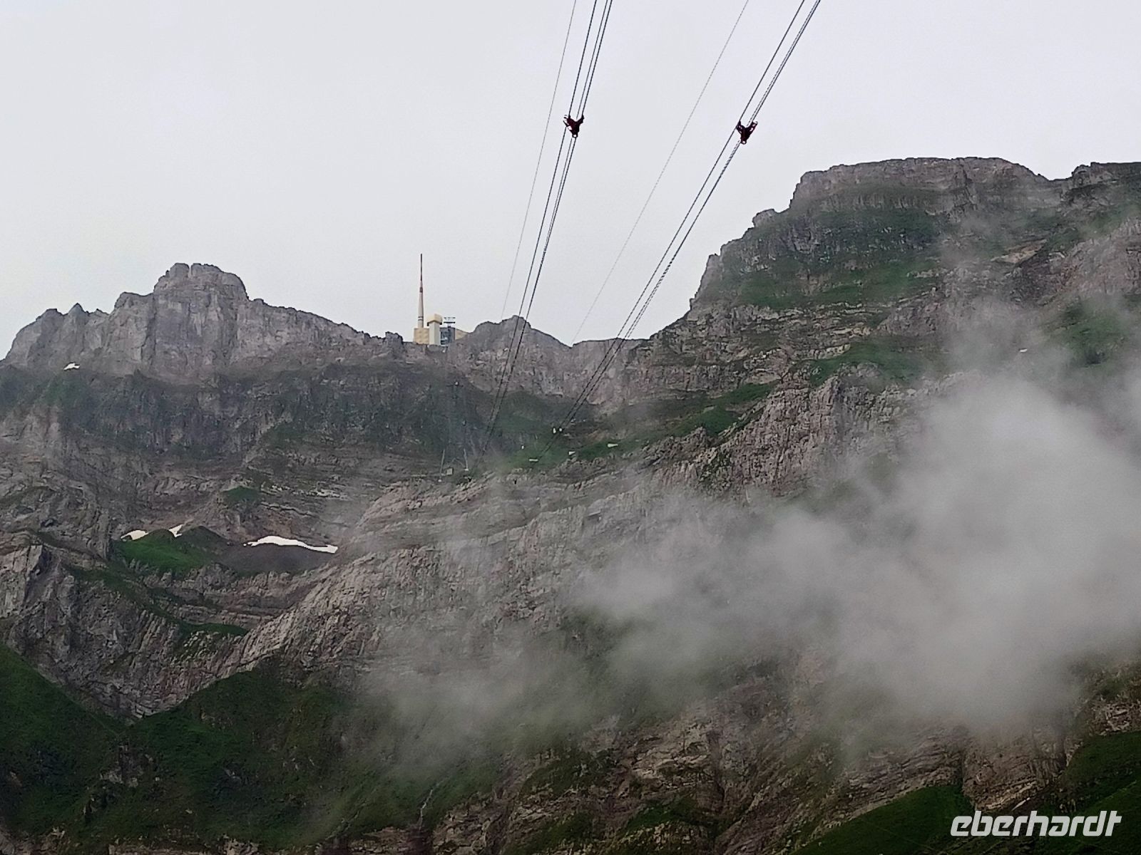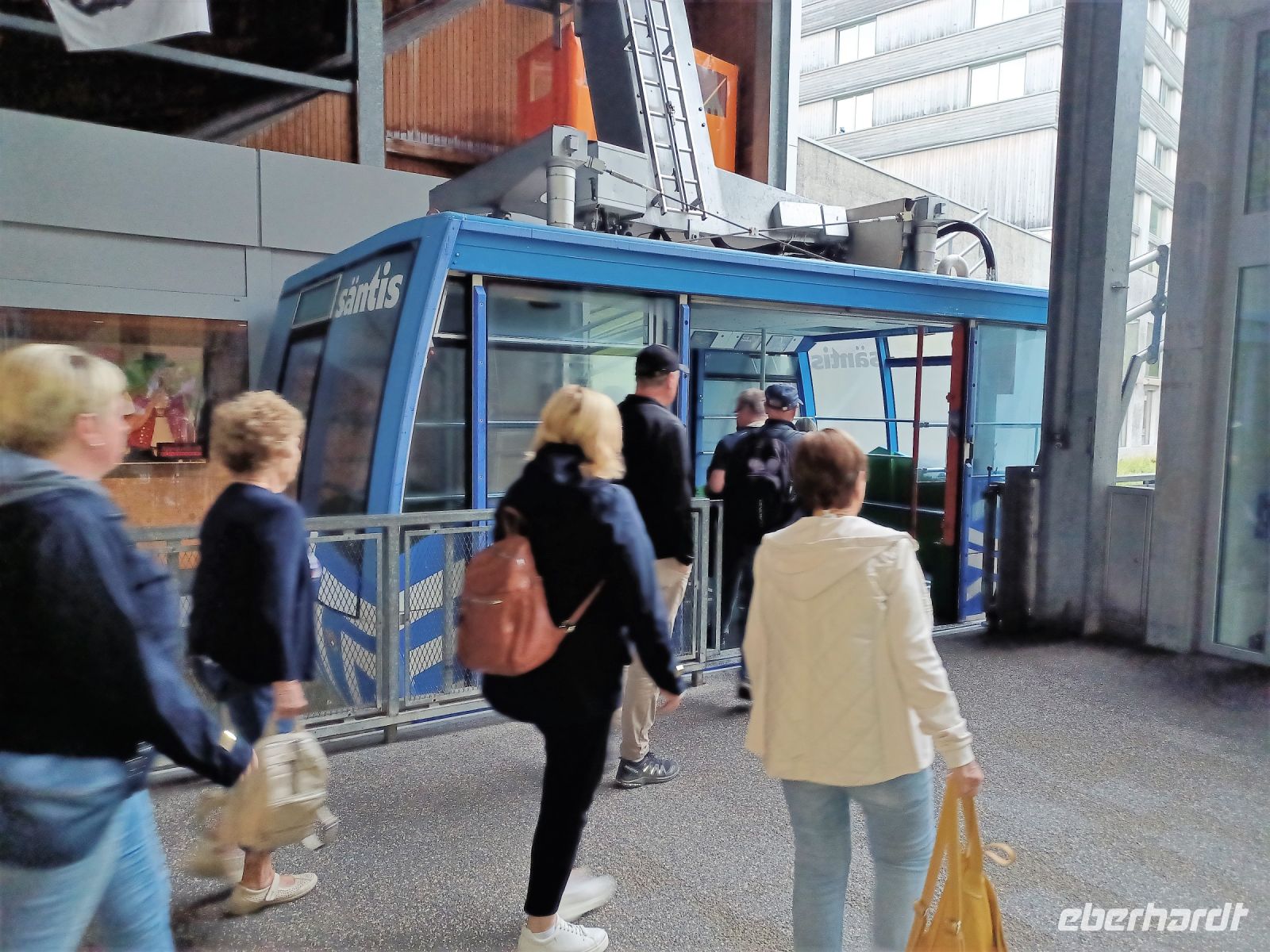 13.7.2023. Heute haben wir unser Frühstück an einem besonderen Ort. Hoch oben auf der Säntis-Spitze befindet sich das Bergrestaurant. Als wir die Koffer in den Bus laden, ist der Berg frei von Wolken, das lässt hoffen. Als wir aber mit der großen Gondel aufwärts fahren, umgibt uns das Gebräu einer mächtigen Wolke. Regentropfen klatschen an die Fenster der Bahn, aber kurz vor der Spitze durchdringen wir den Nebel und der Blick wird frei auf einen Teil der gigantischen Berge, darunter liegt die Wolkendecke – ein einmaliger Anblick.